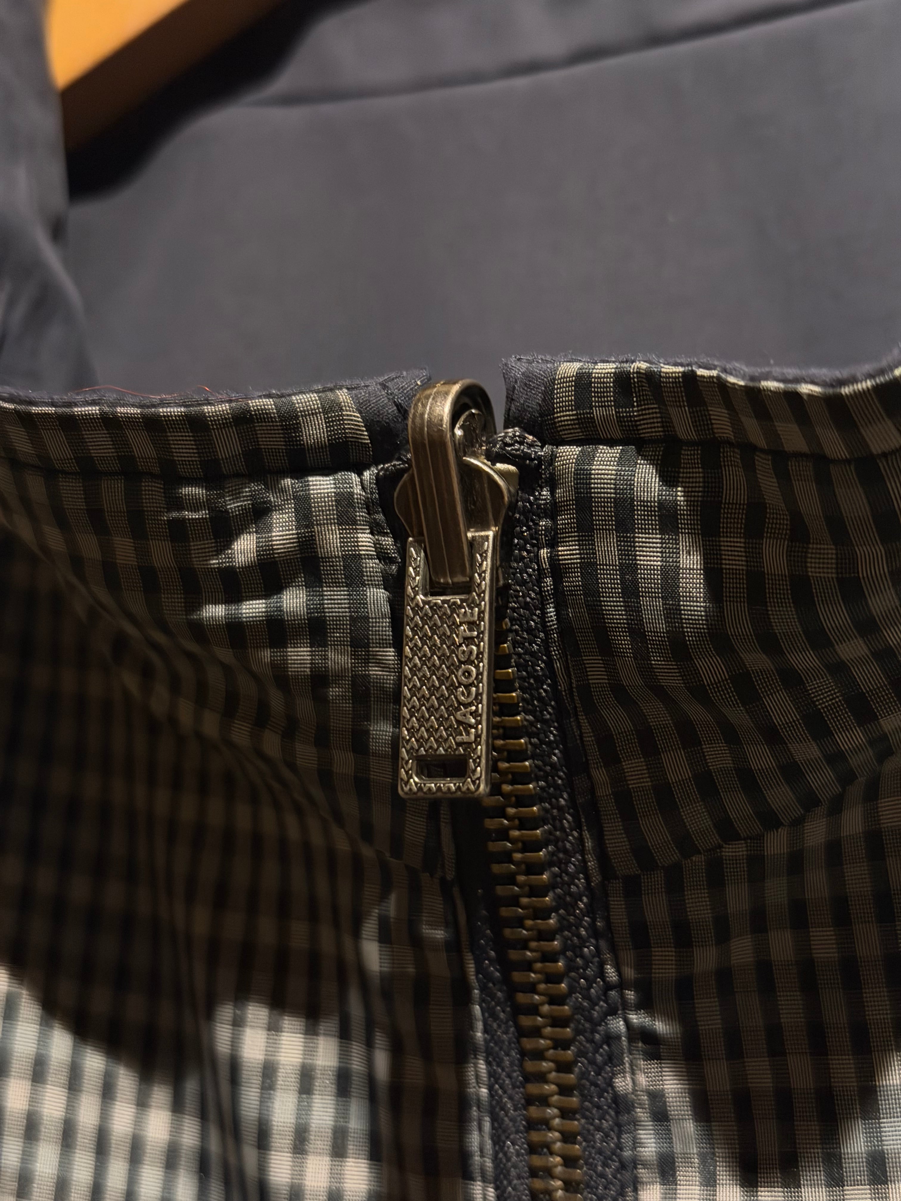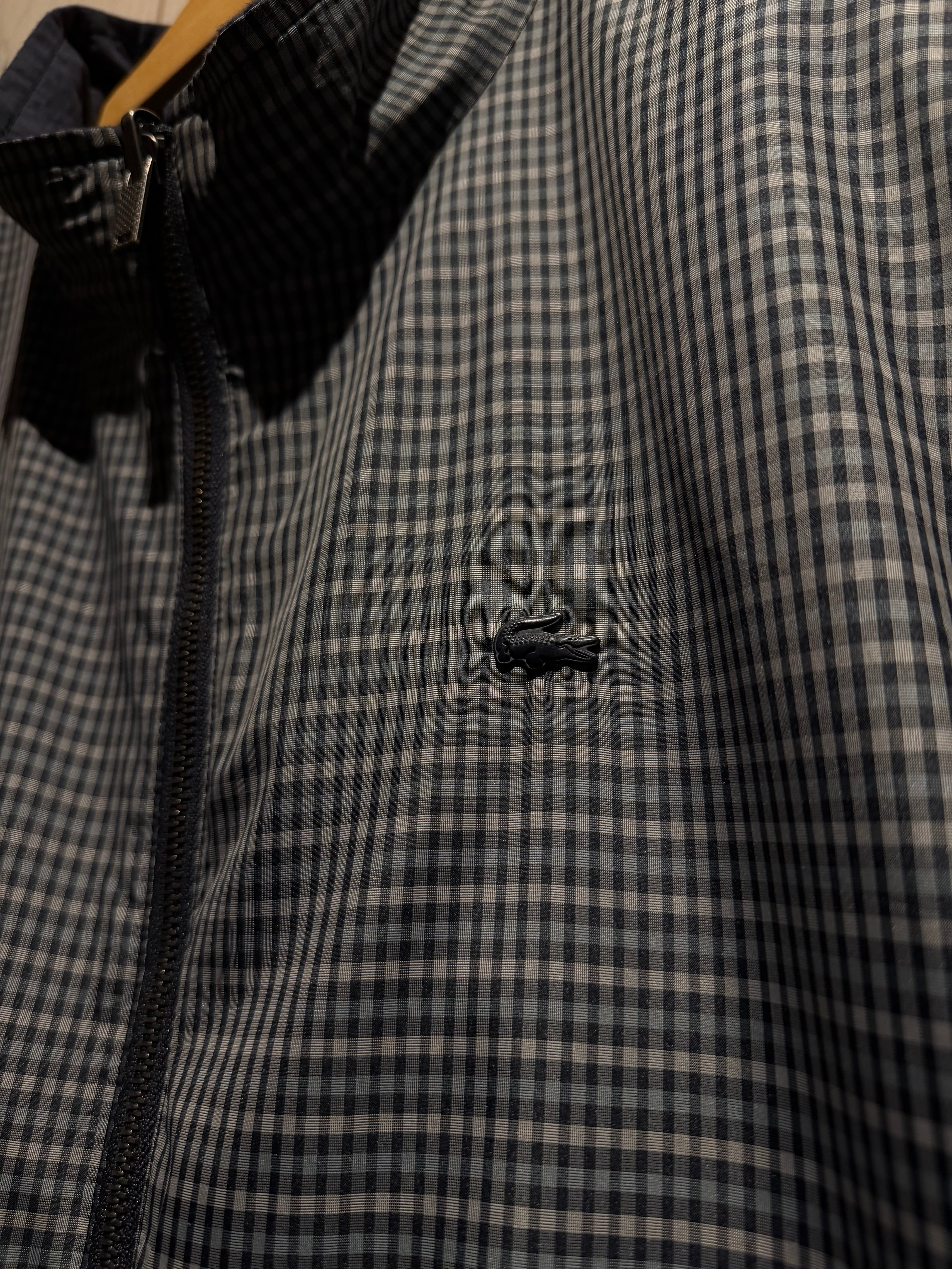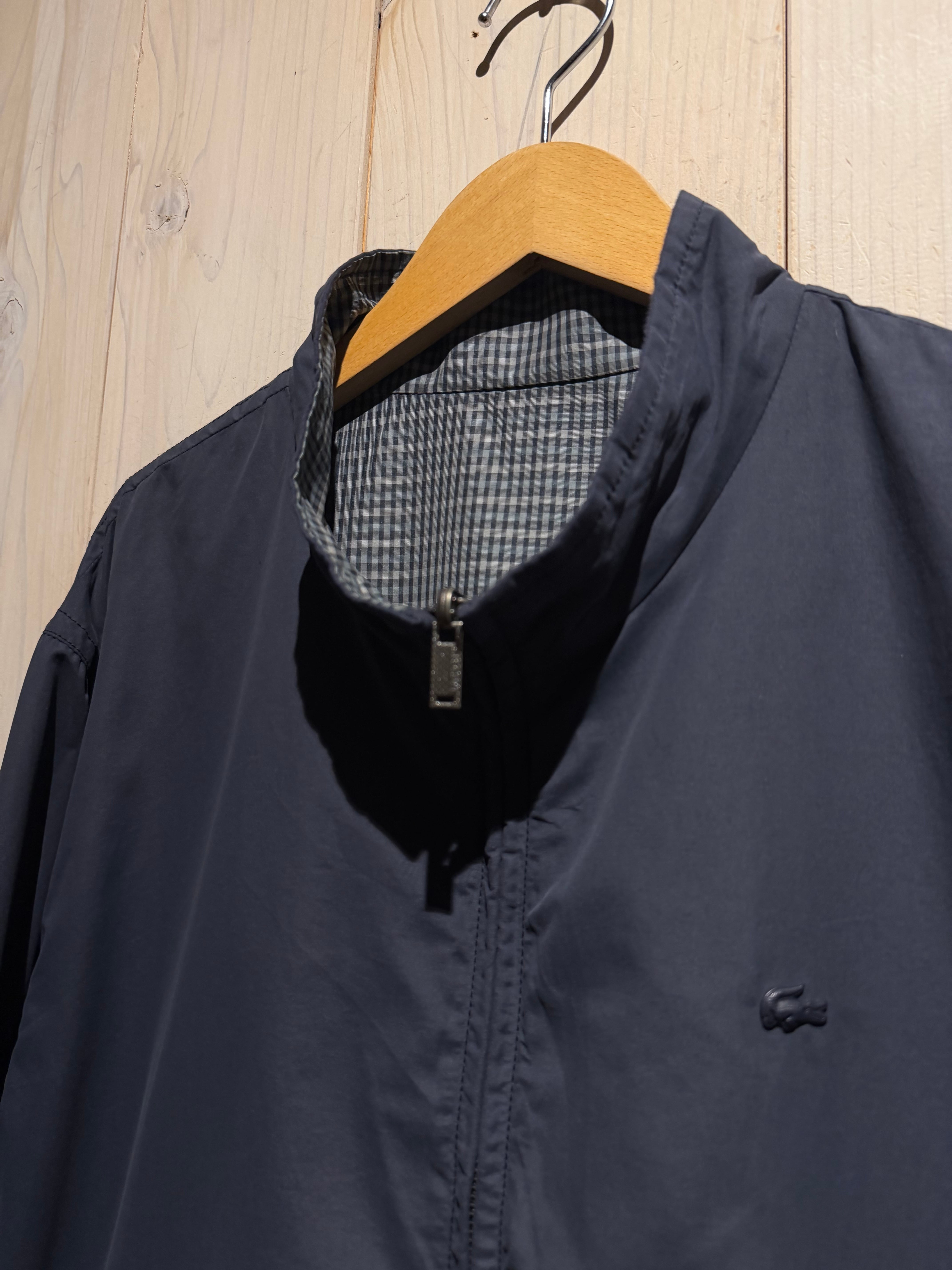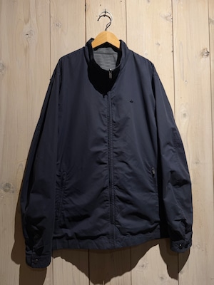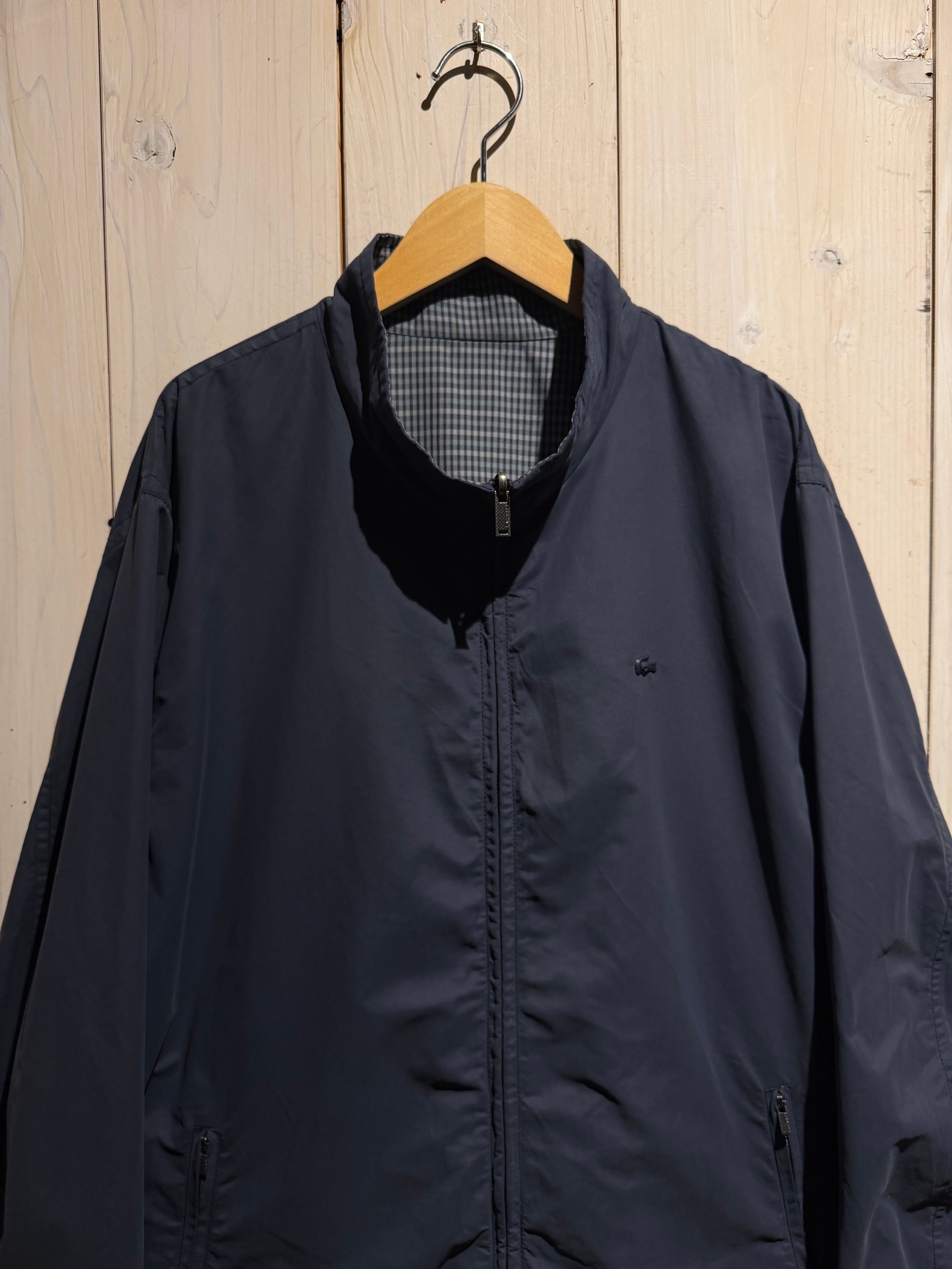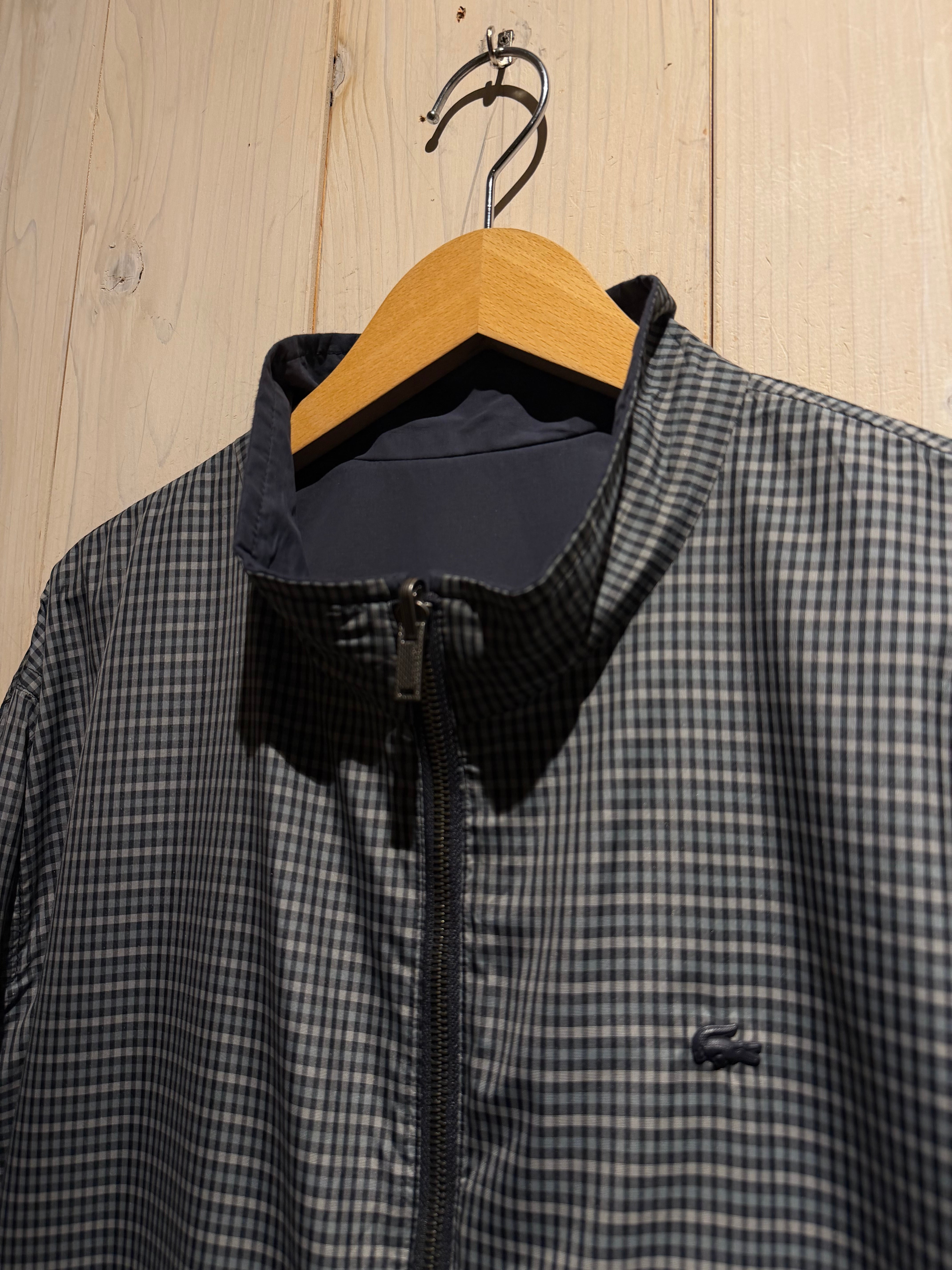 モノトーンのギンガムチェックを全面に載せたデザインと、裏返すことでネイビーのプレーンなルックスへと変化するリバーシブル仕様のナイロンスウィングトップジャケット。