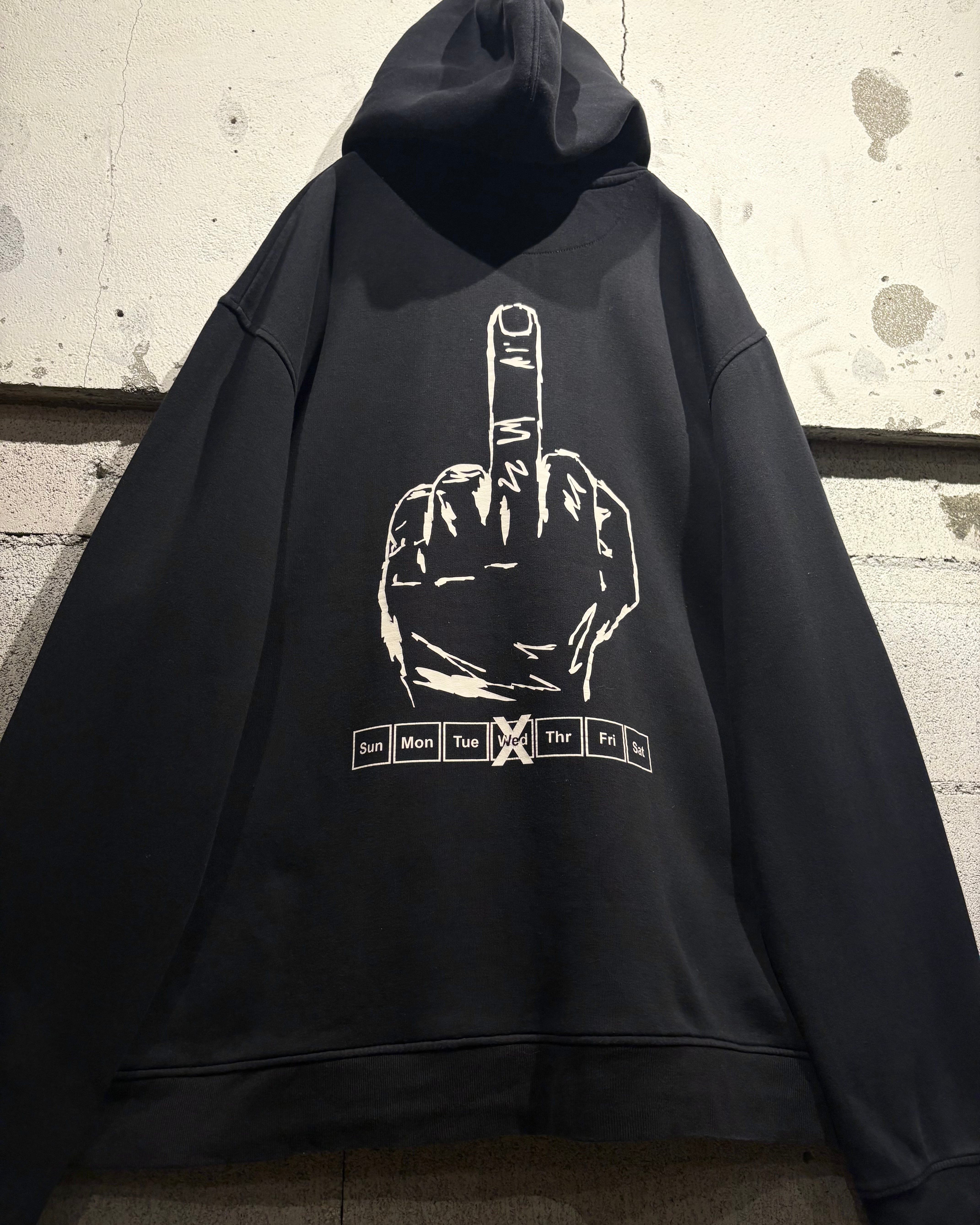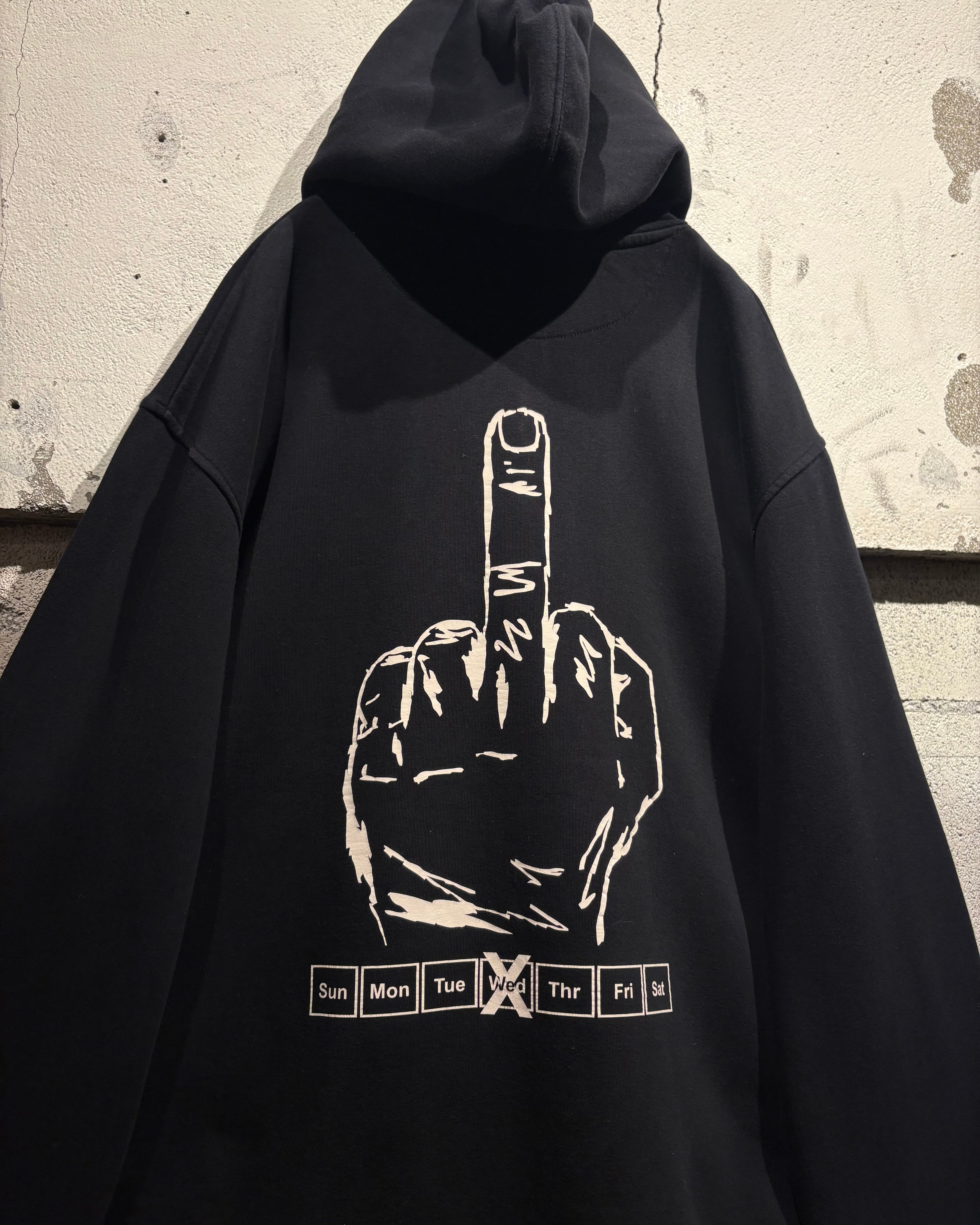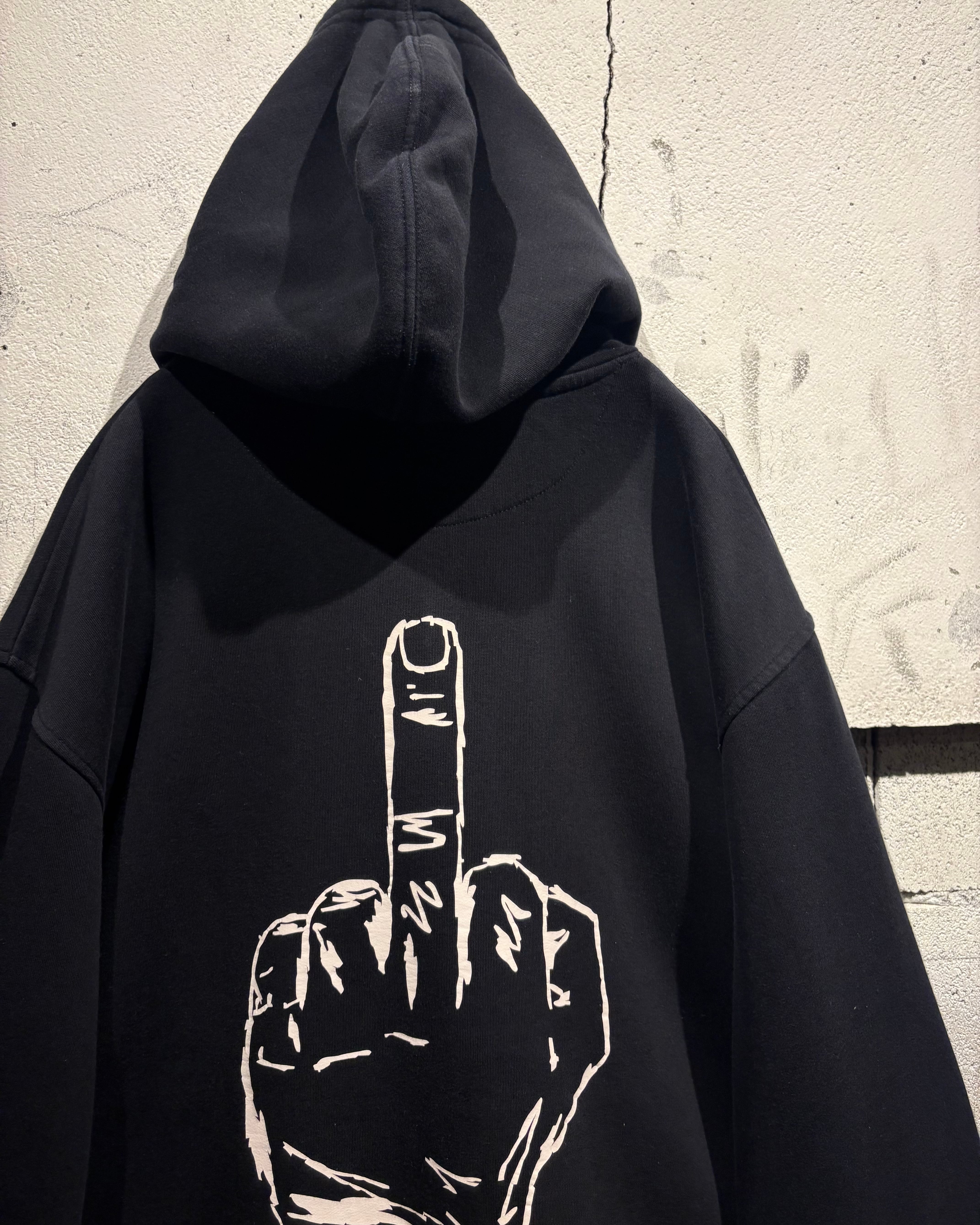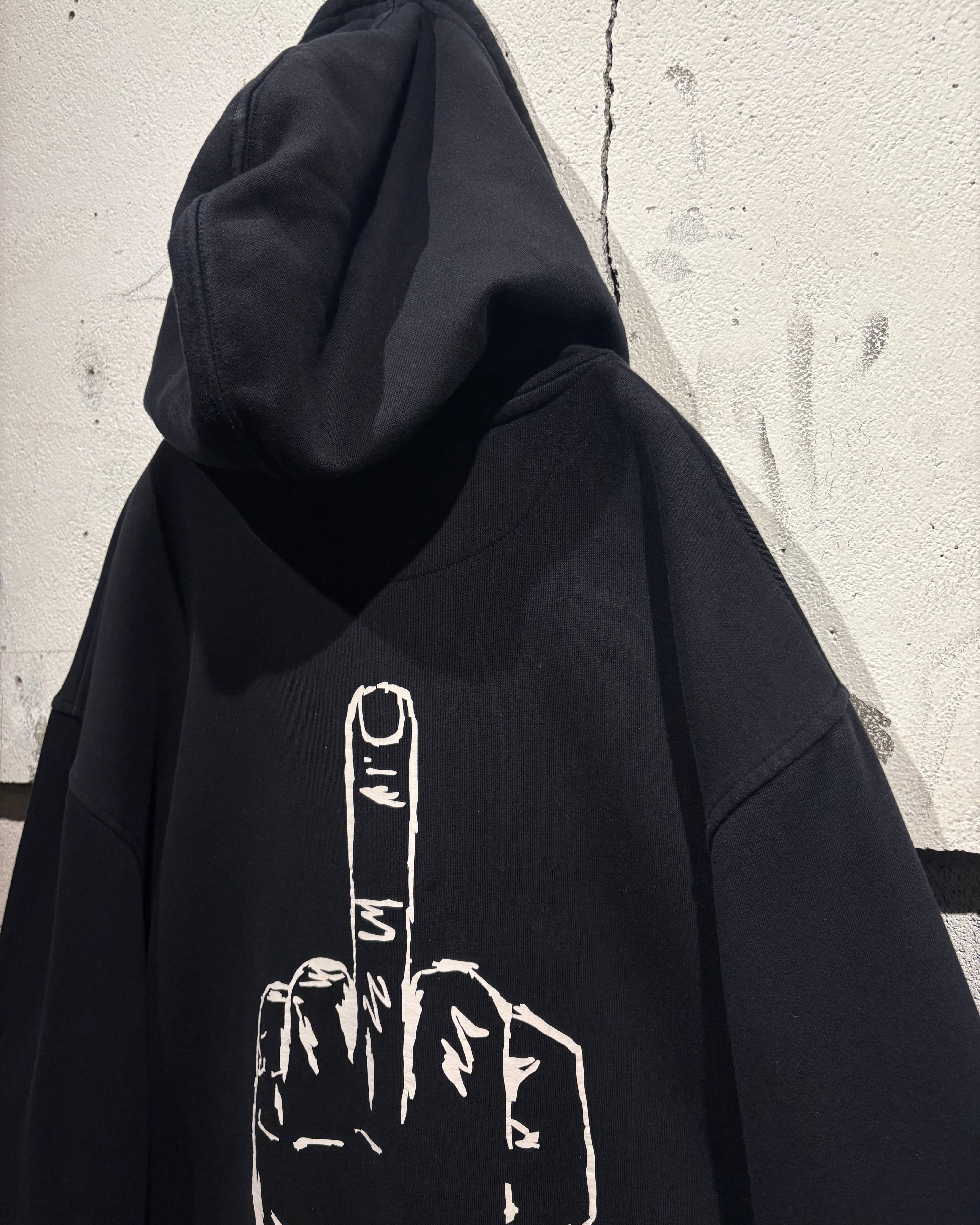 肉感のあるブラックボディをベースに、背面へ大胆に中指のハンドサインを落とし込んだ、ストリート色全開のフーディ。