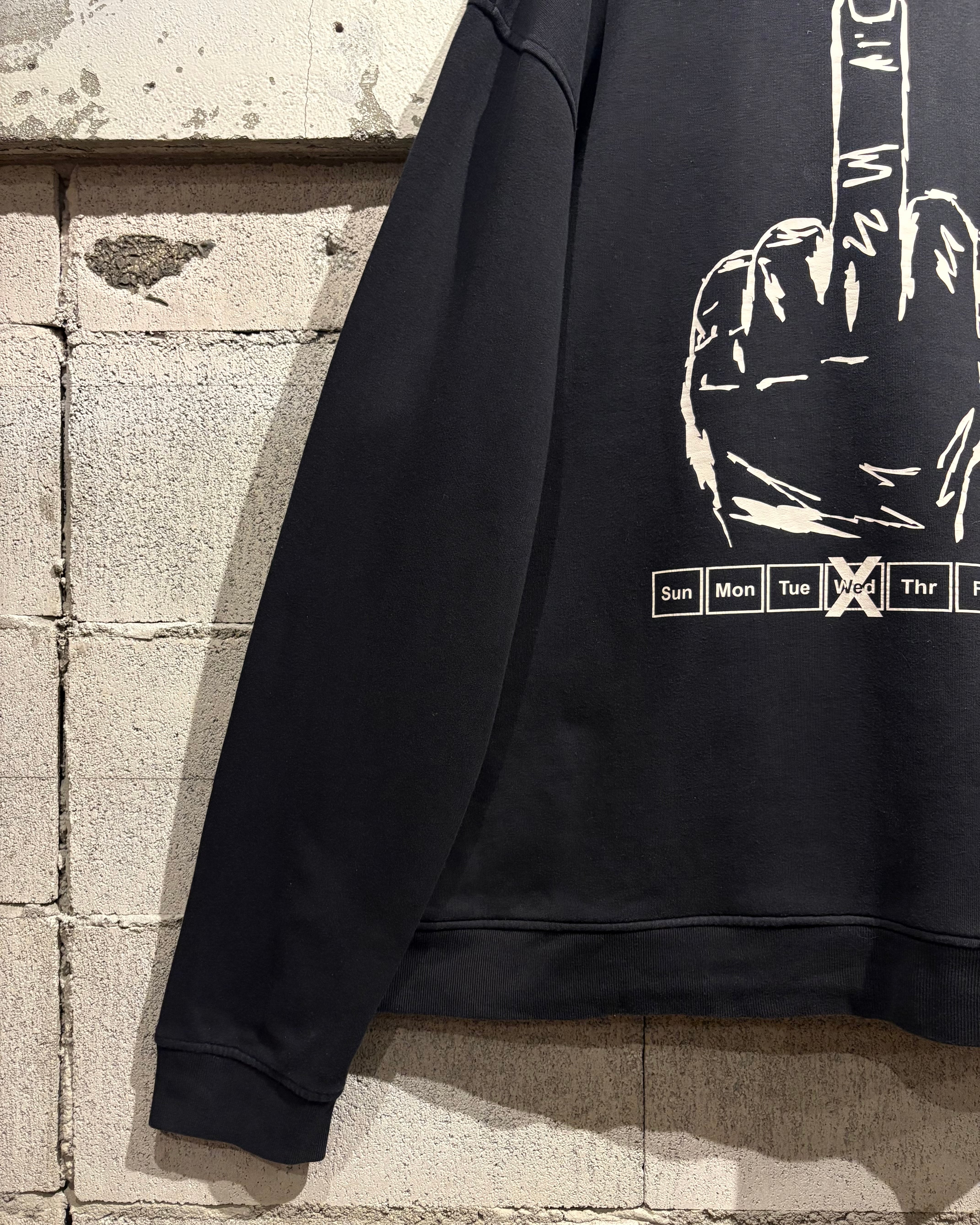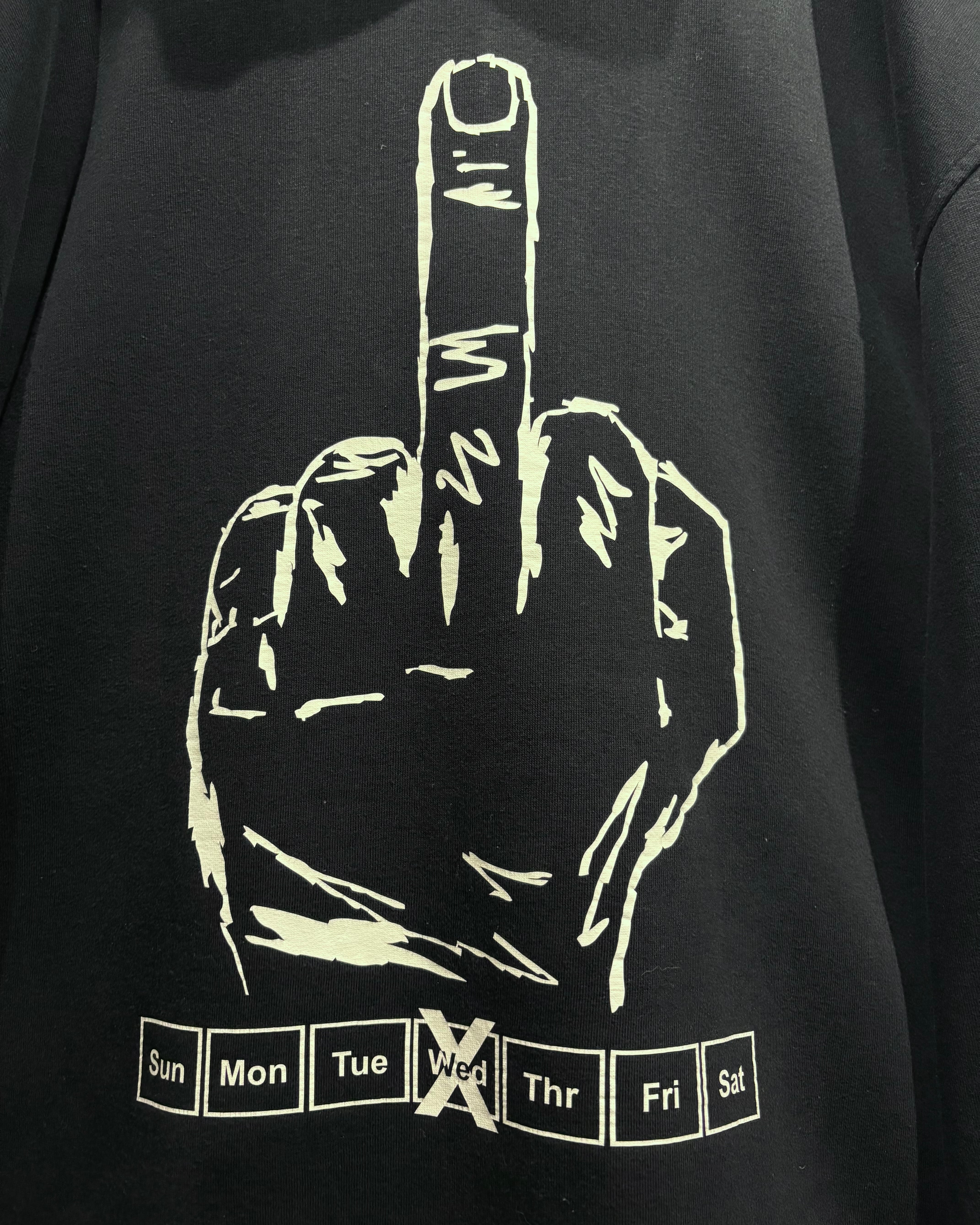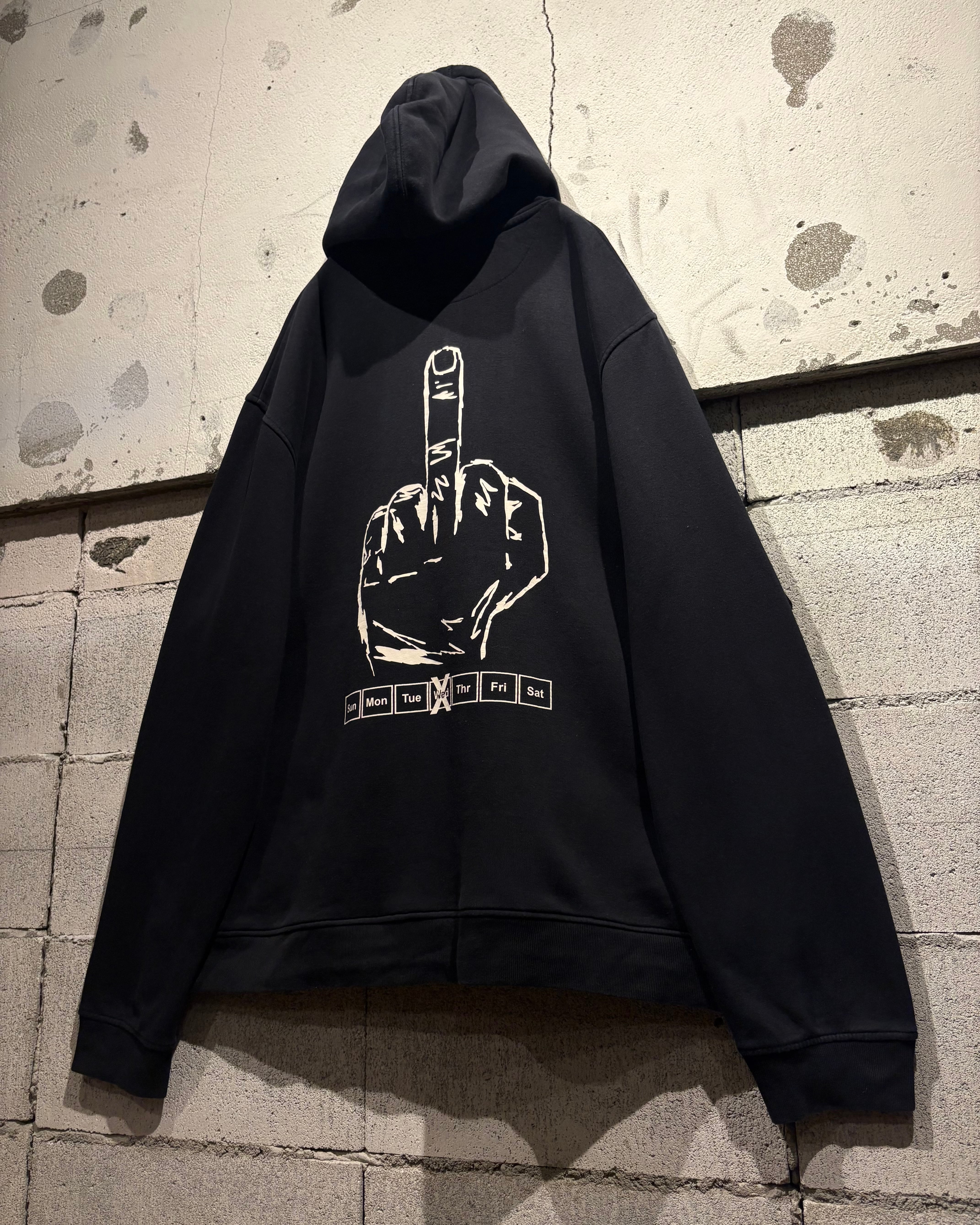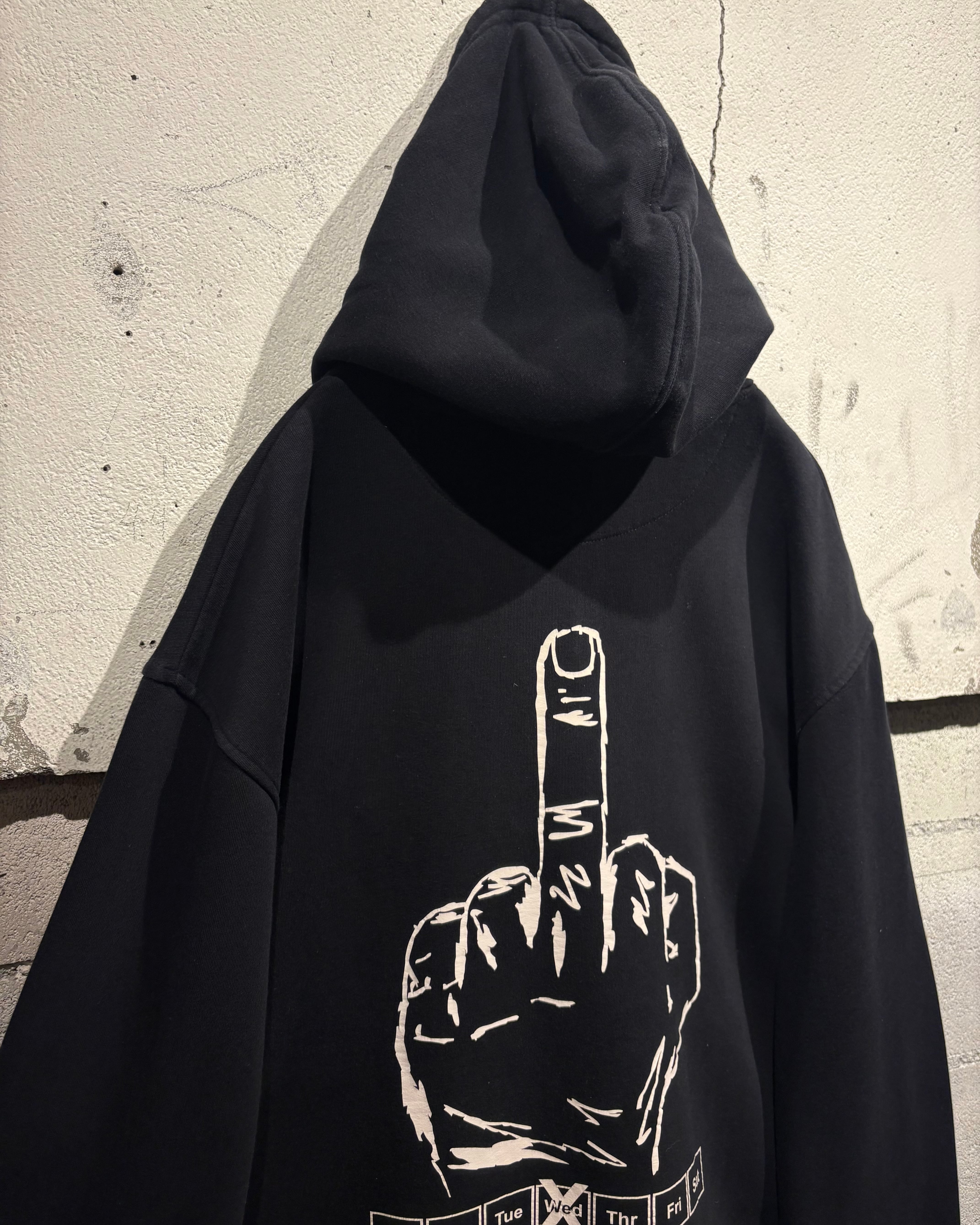 肉感のあるブラックボディをベースに、背面へ大胆に中指のハンドサインを落とし込んだ、ストリート色全開のフーディ。