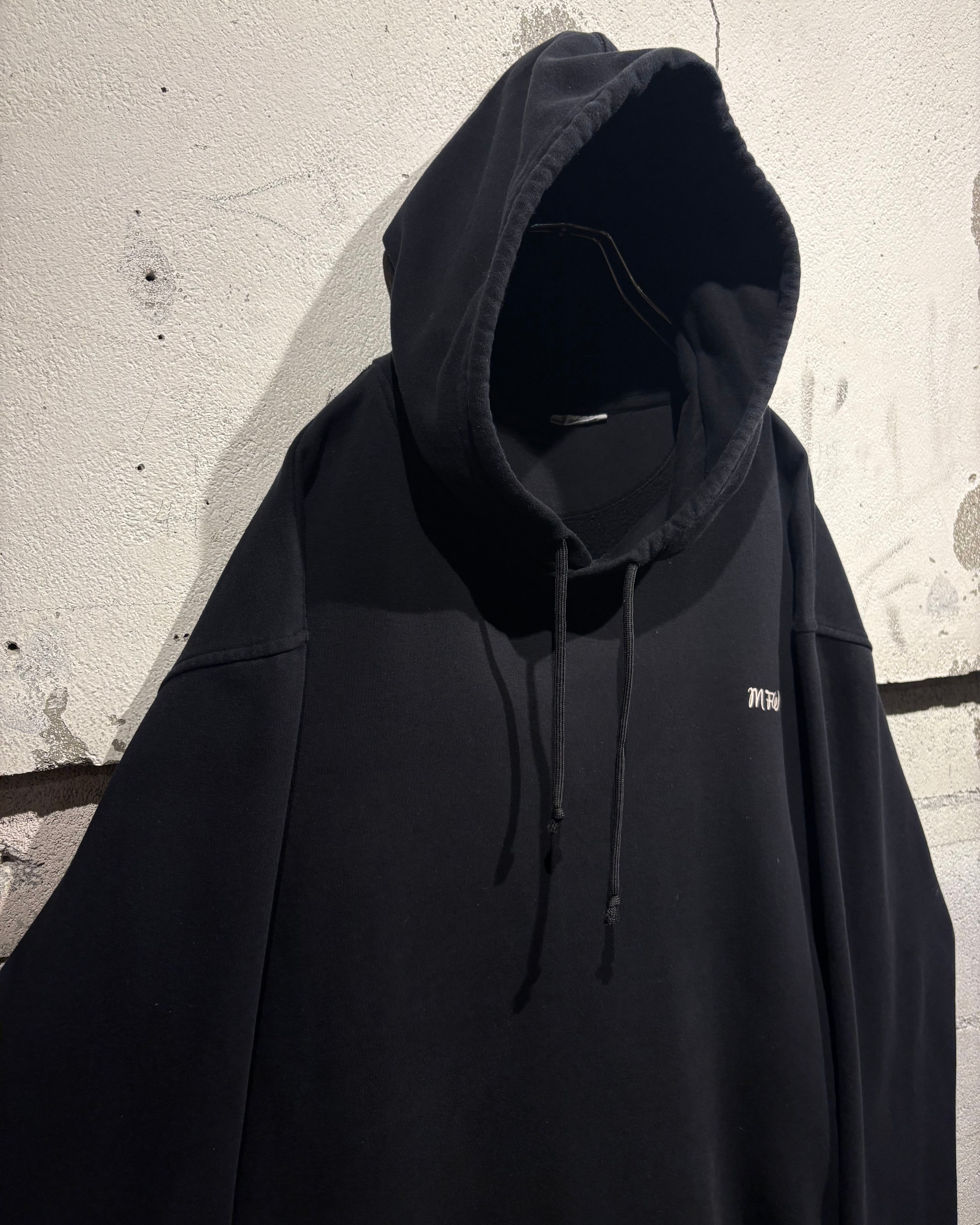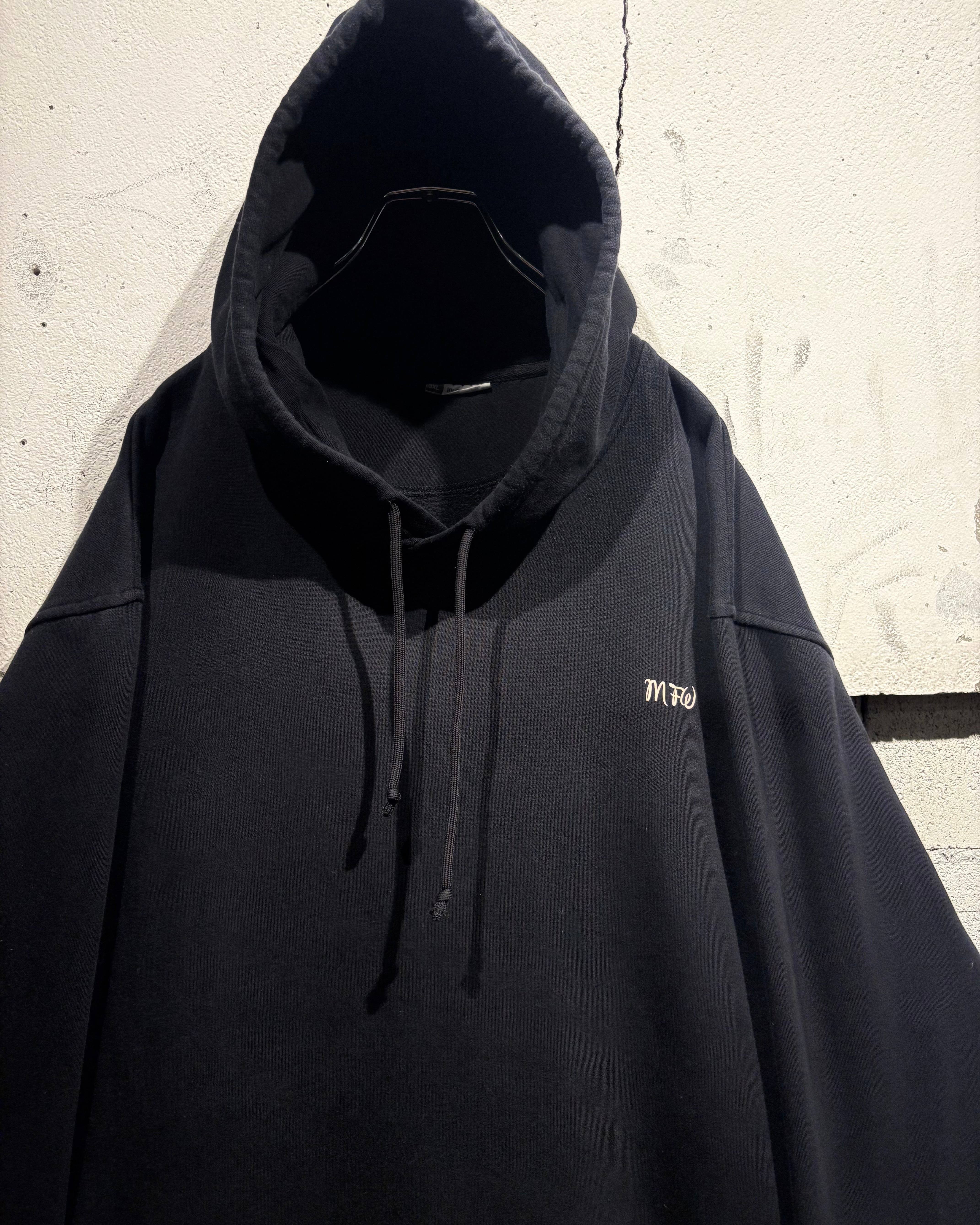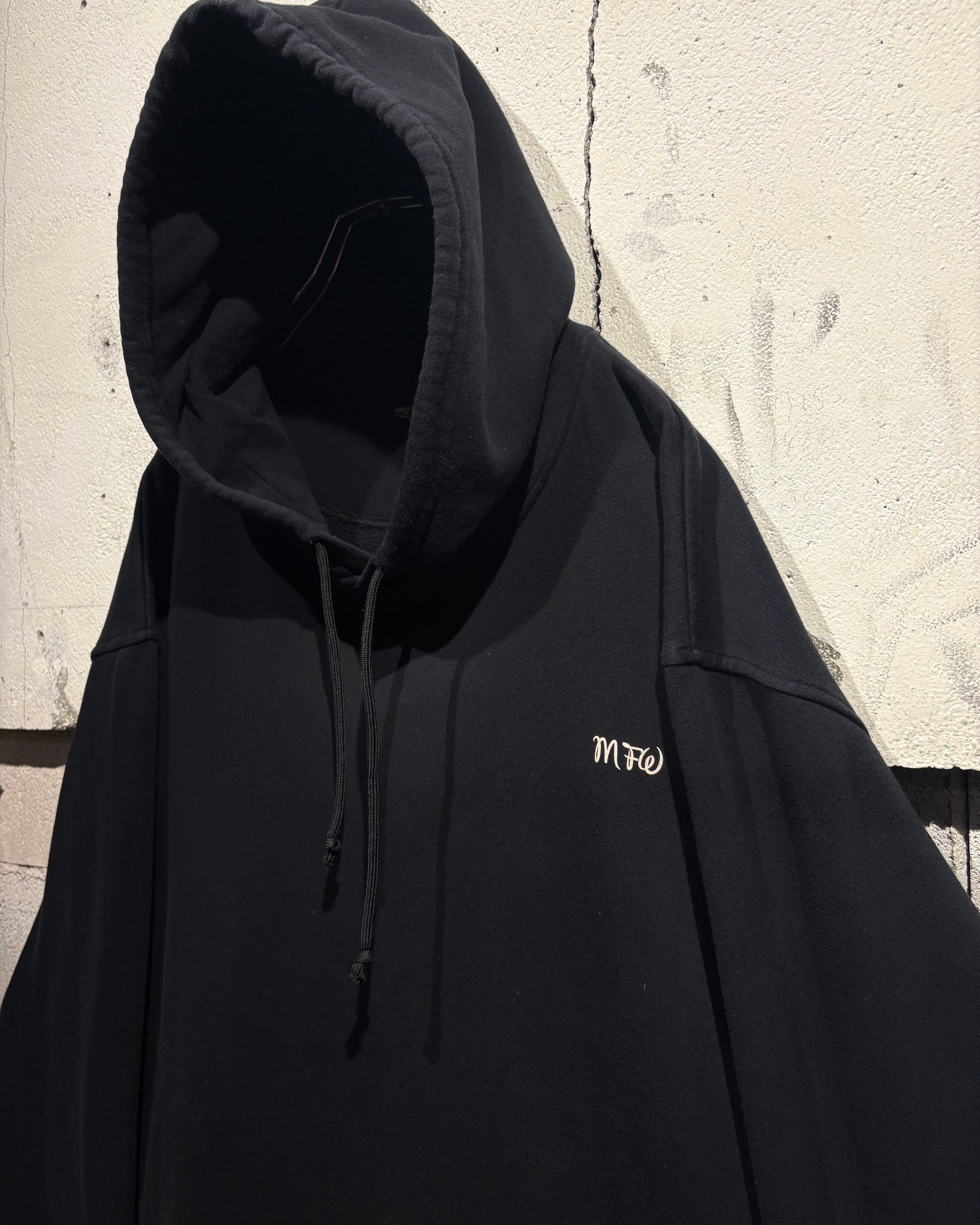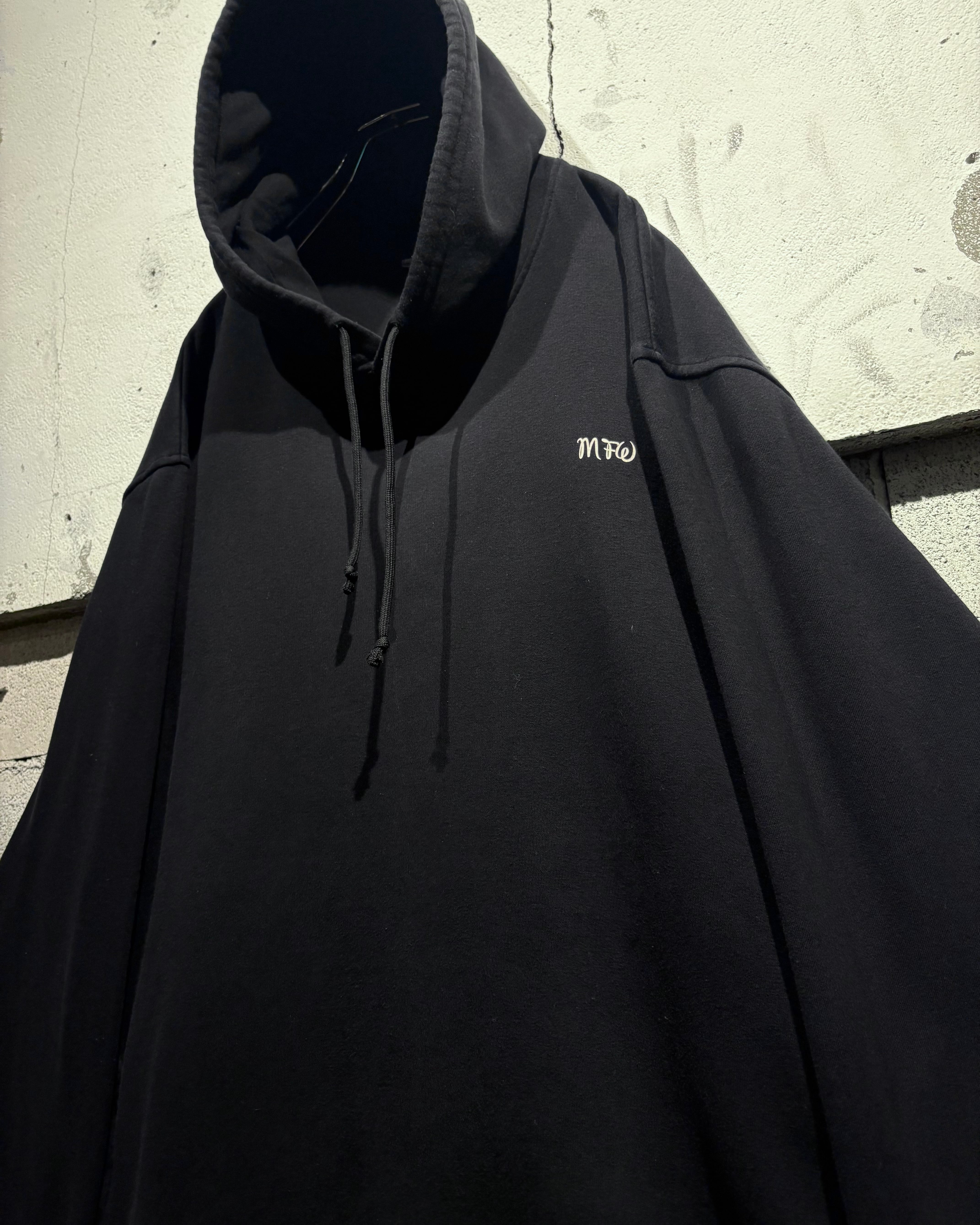 肉感のあるブラックボディをベースに、背面へ大胆に中指のハンドサインを落とし込んだ、ストリート色全開のフーディ。
