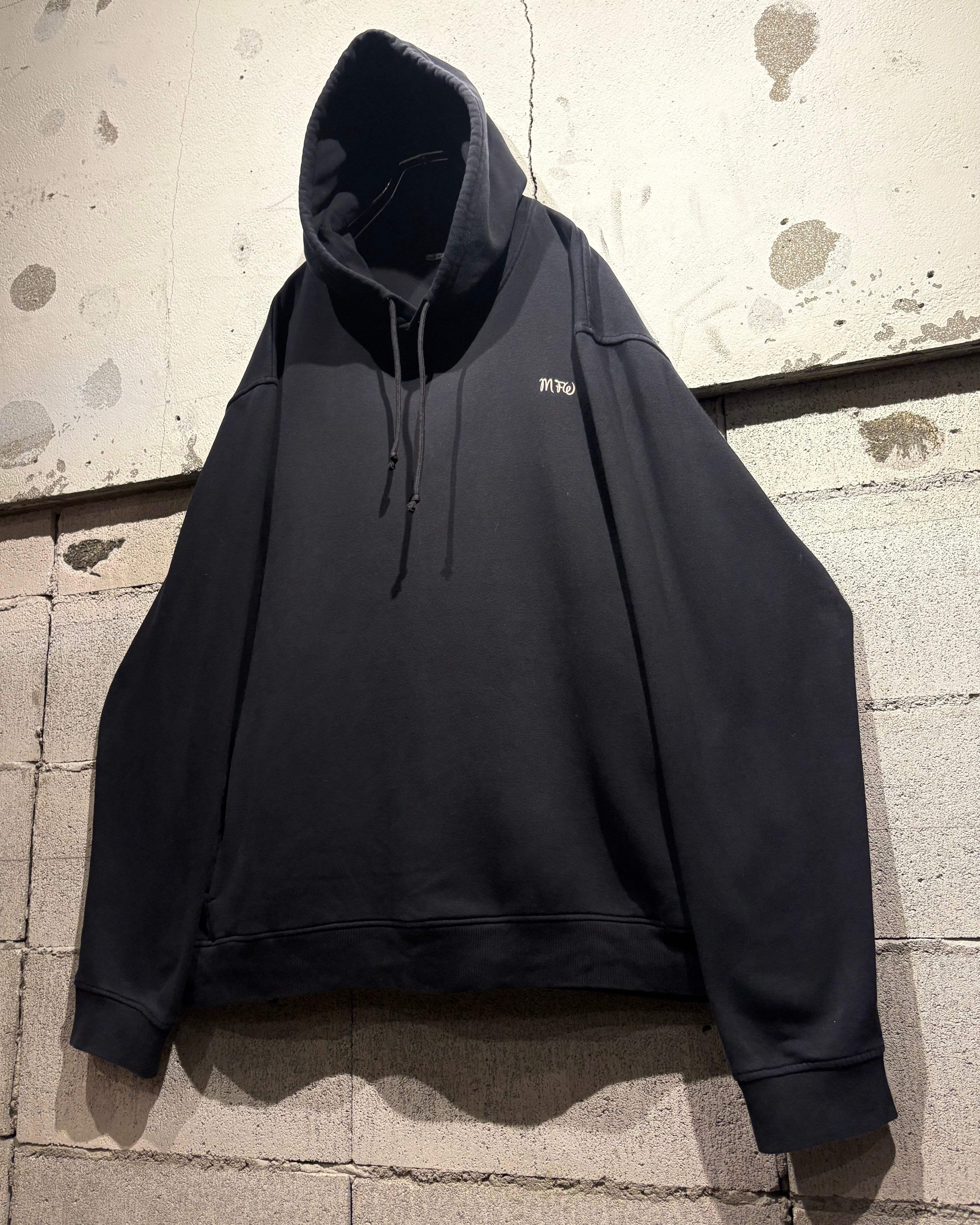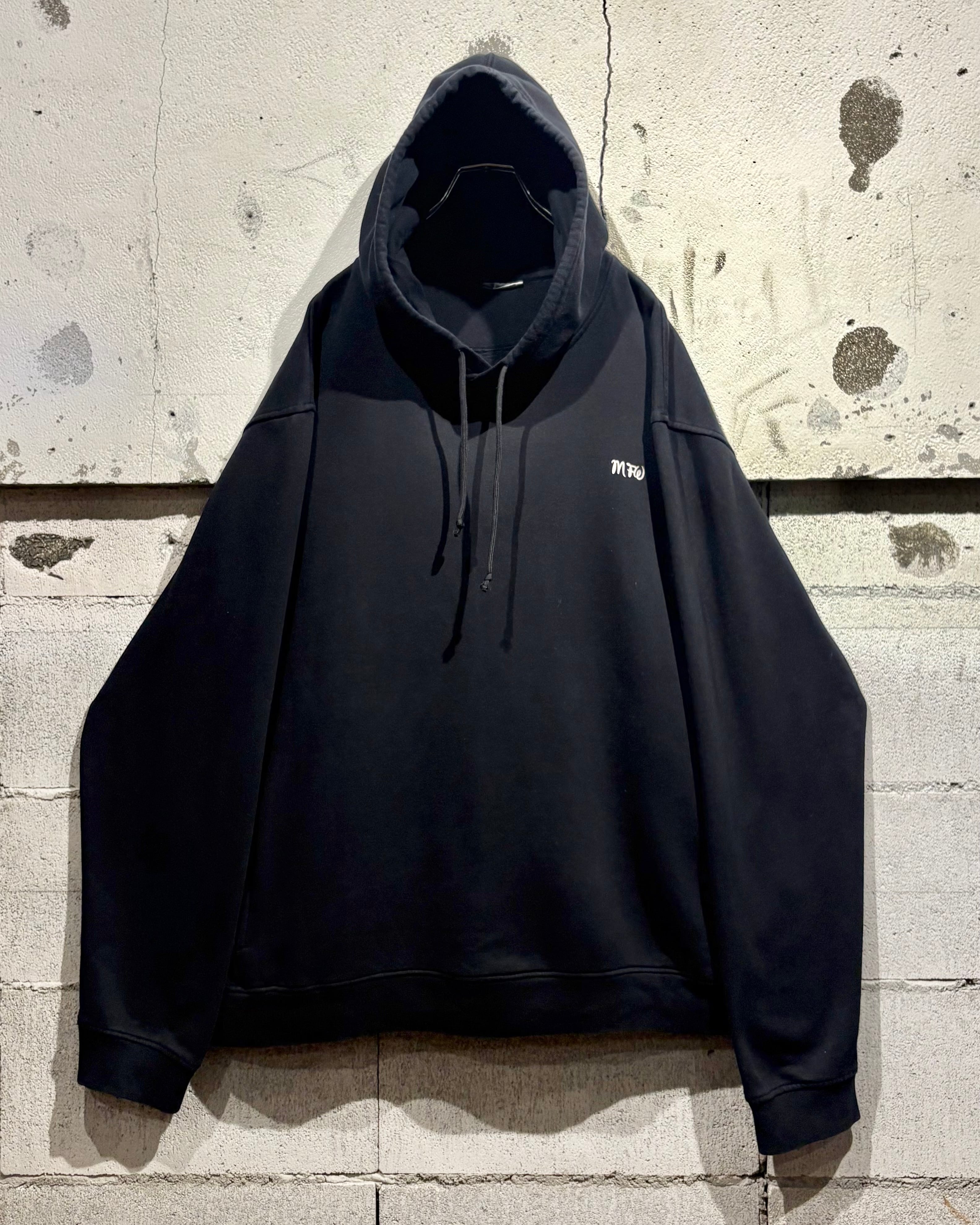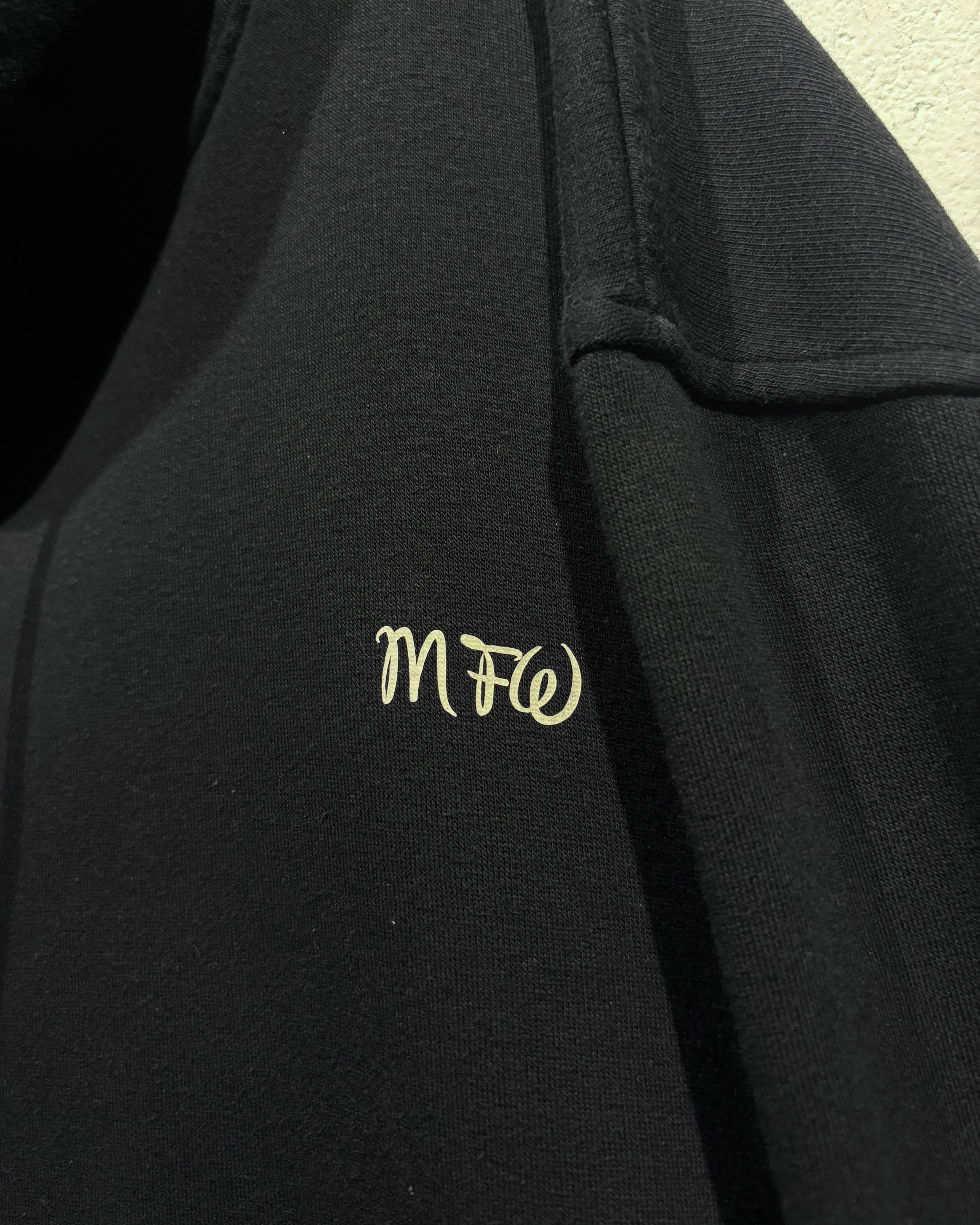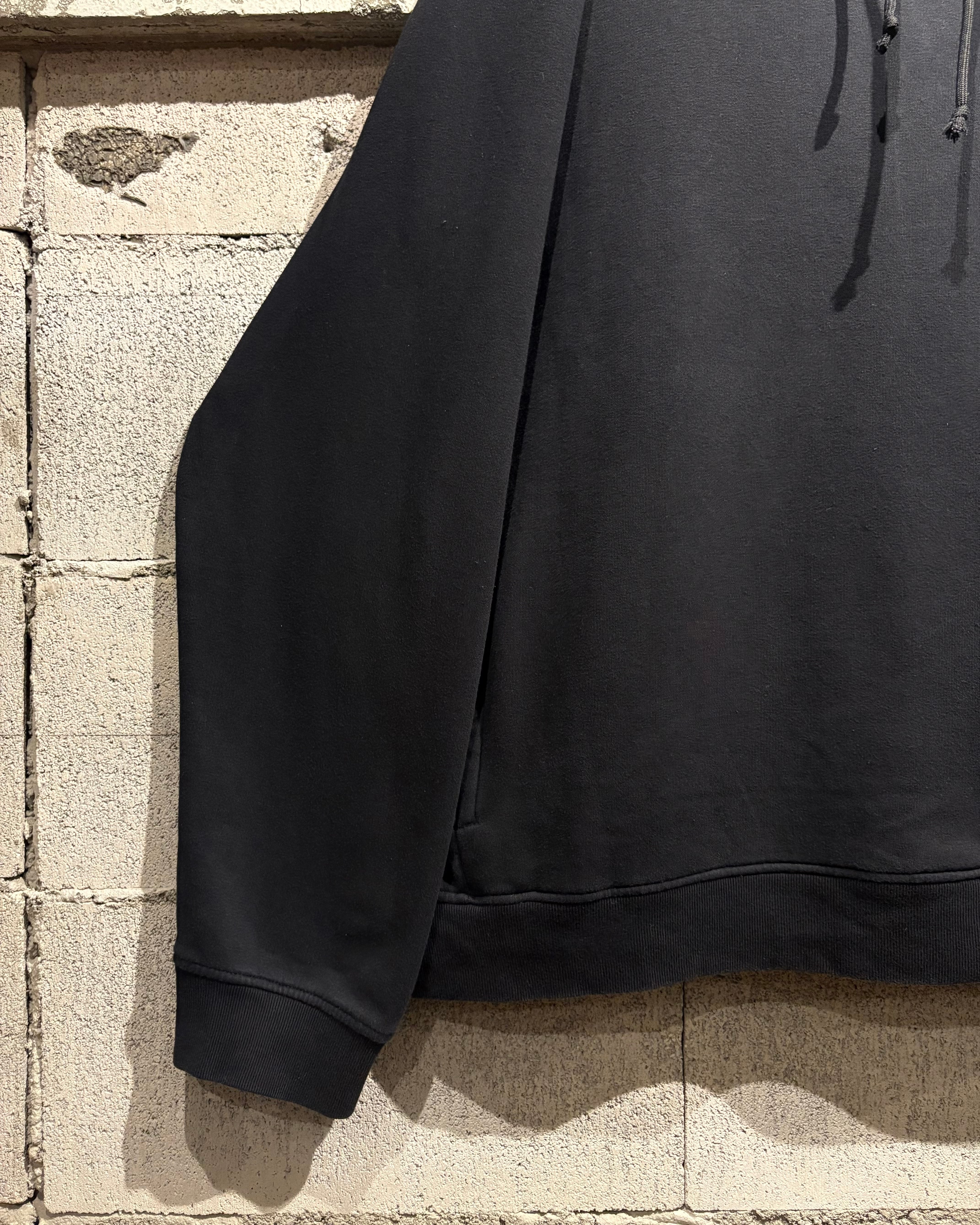 肉感のあるブラックボディをベースに、背面へ大胆に中指のハンドサインを落とし込んだ、ストリート色全開のフーディ。