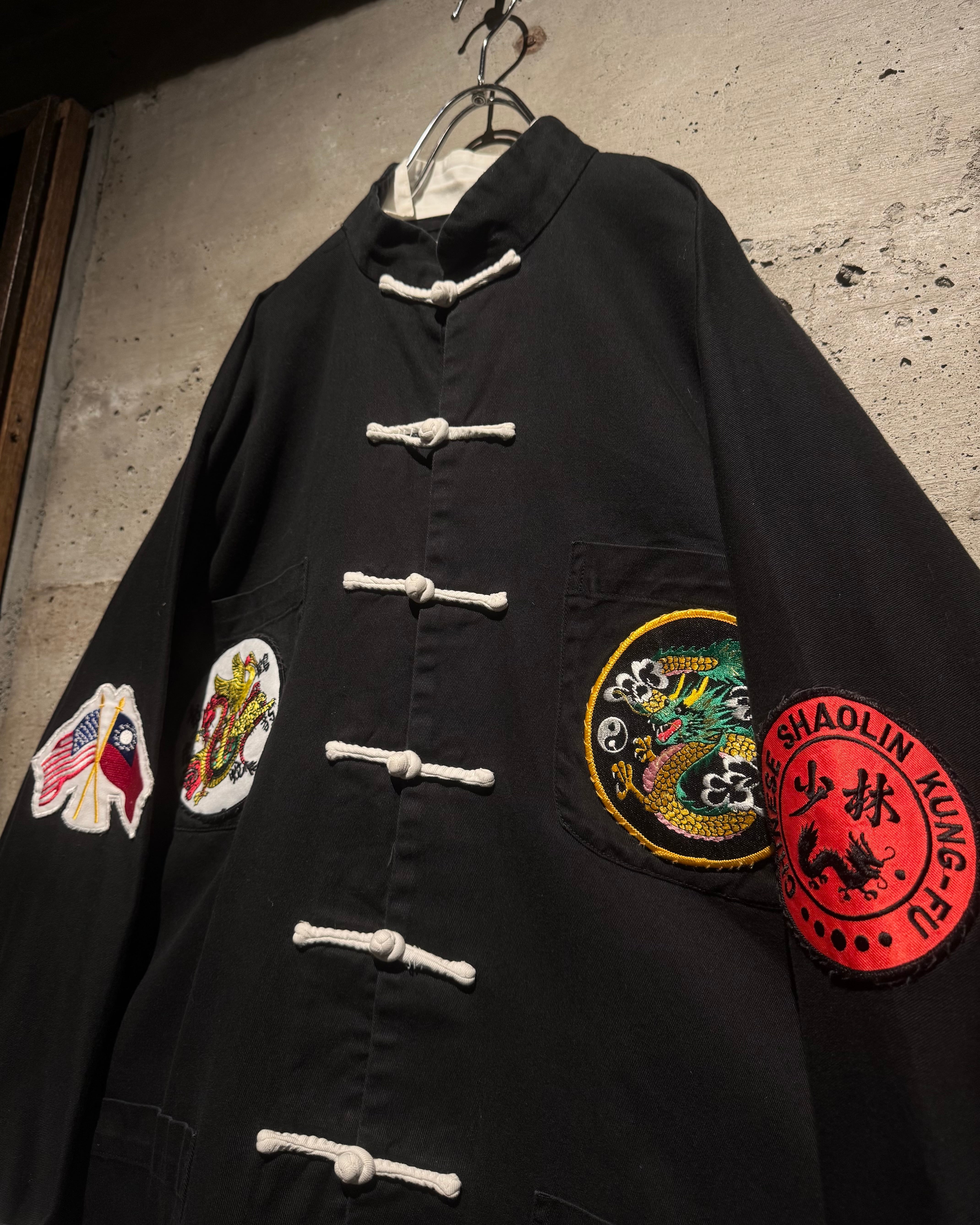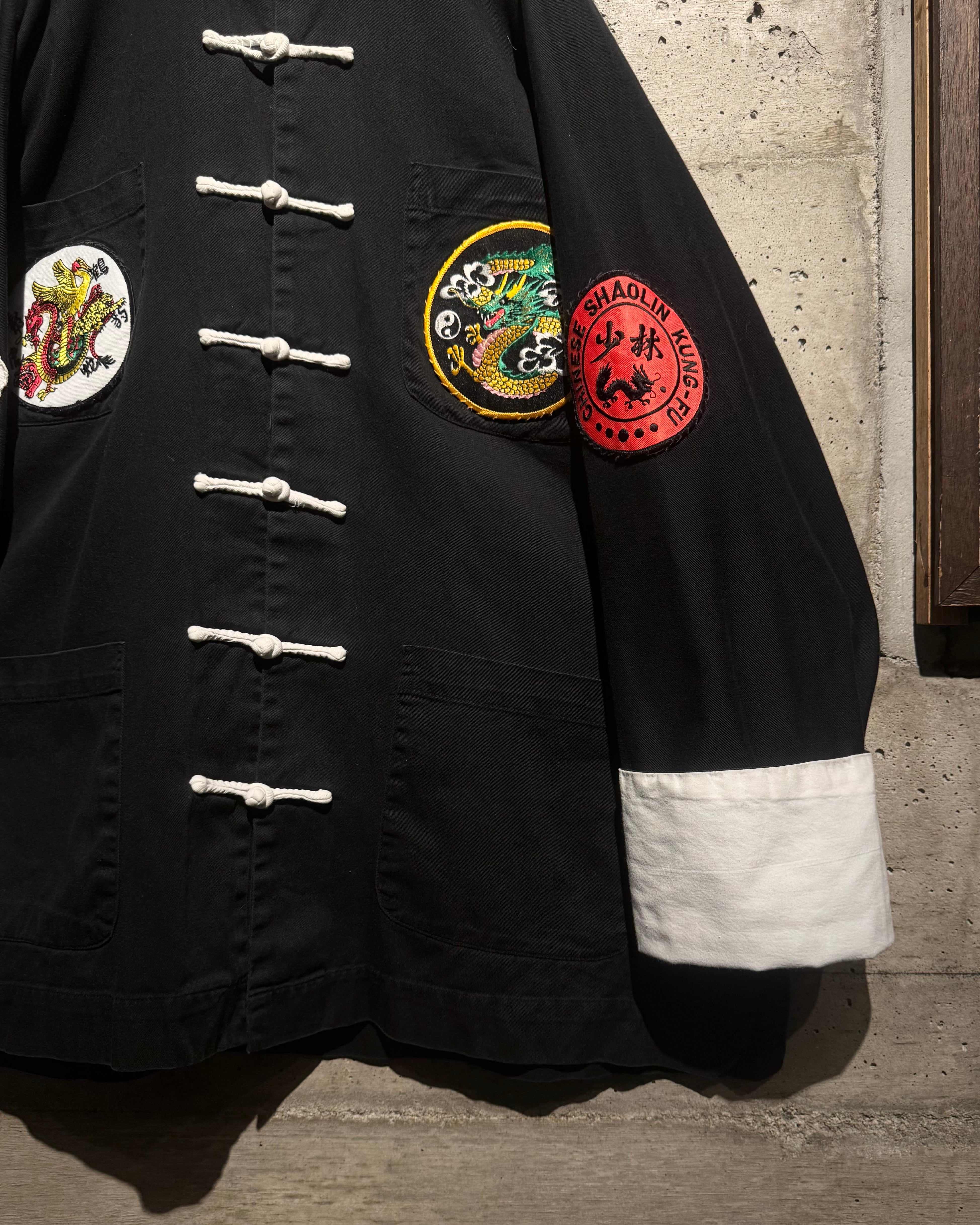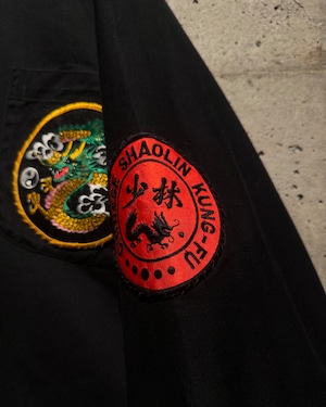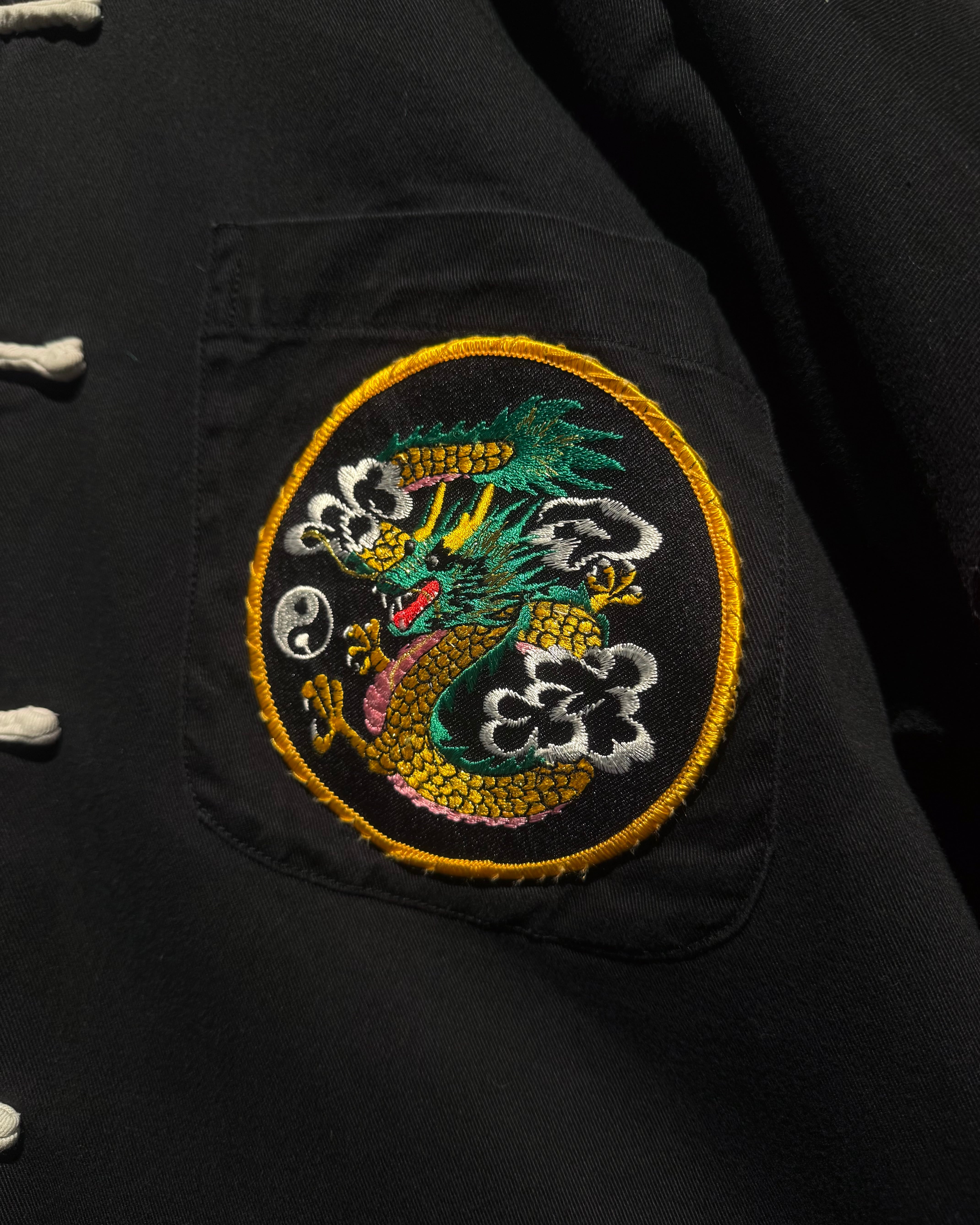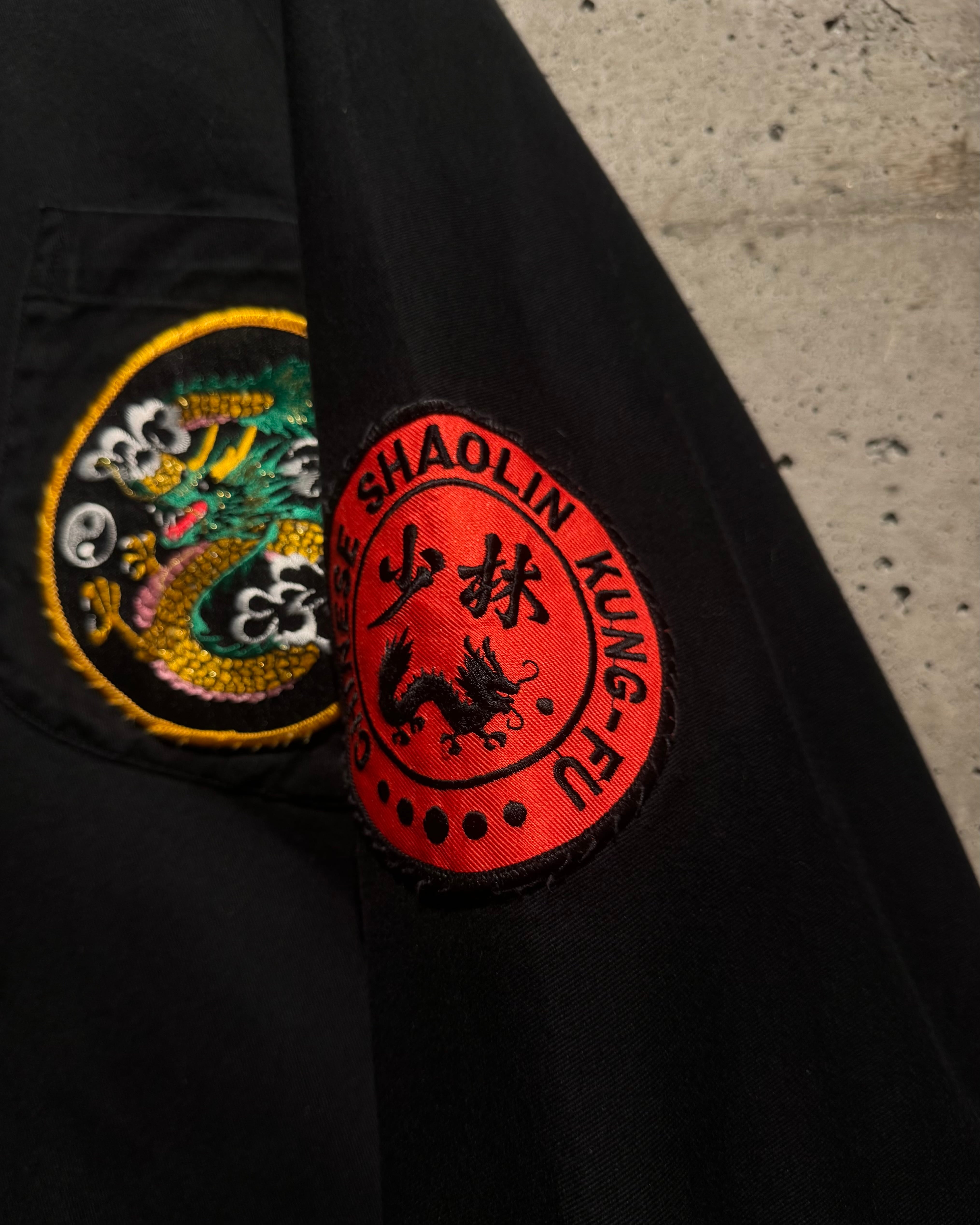ブラック×ホワイトを基調に、両胸に龍モチーフ、アームには国旗や“少林”のパッチを載せたカンフーシャツ。