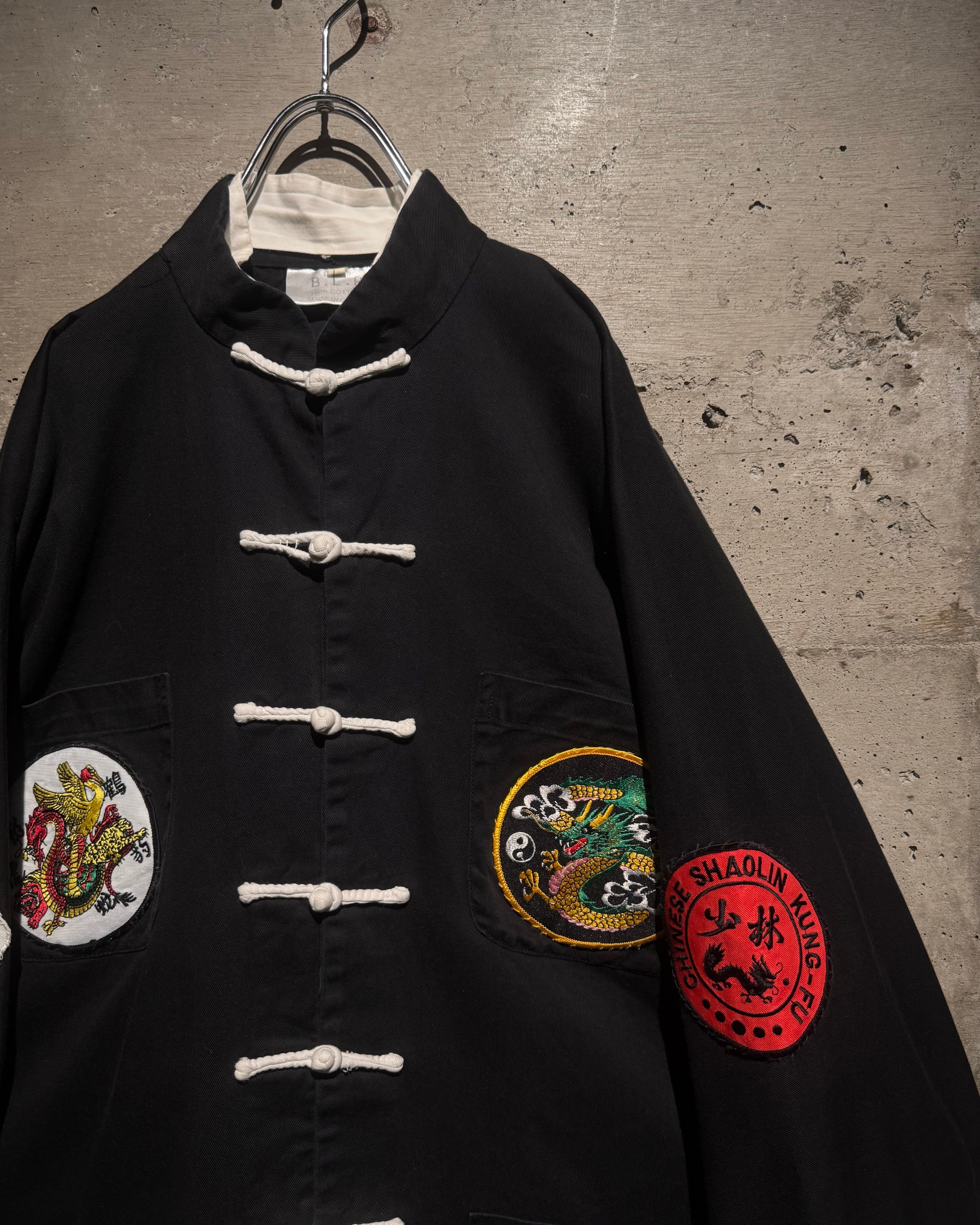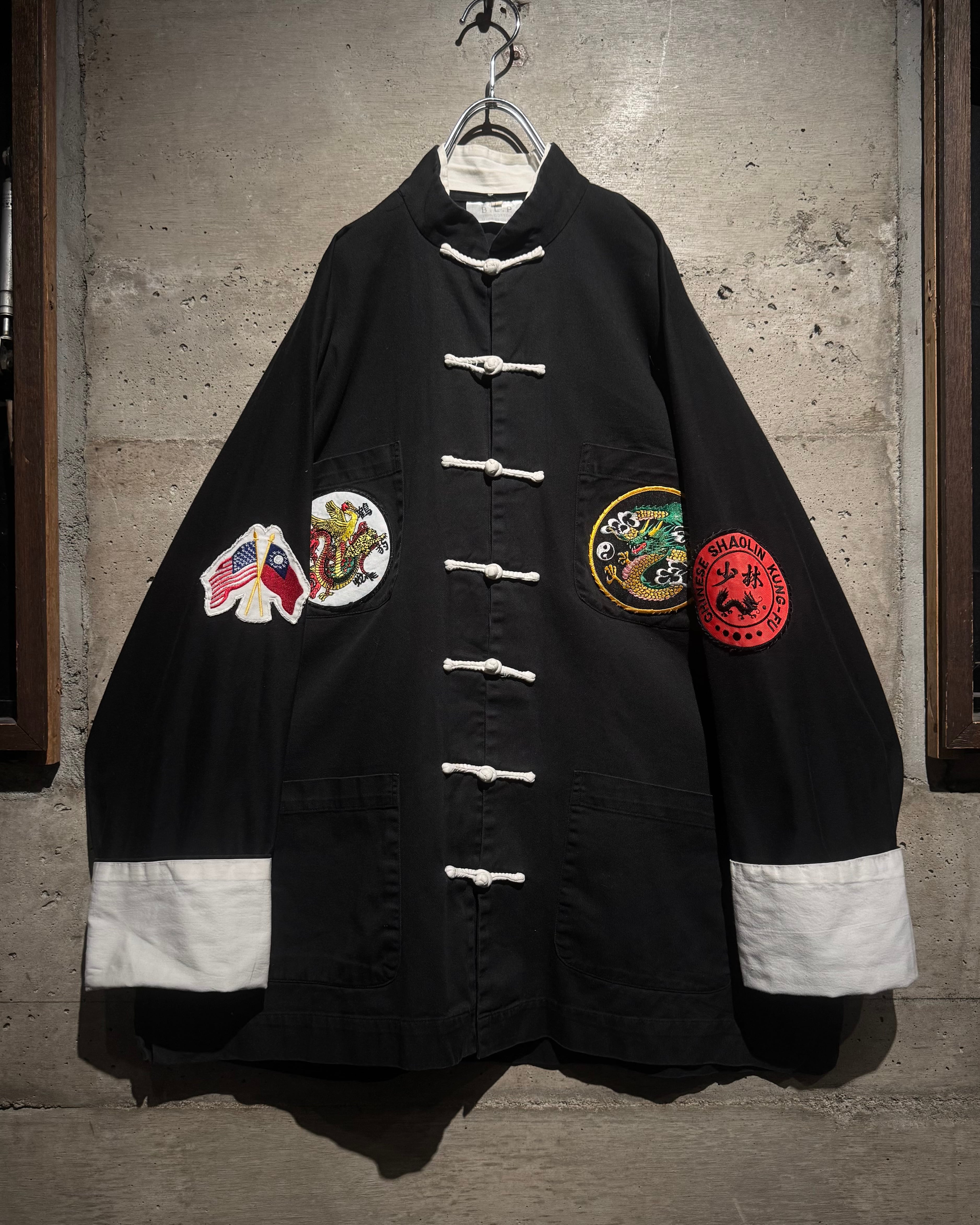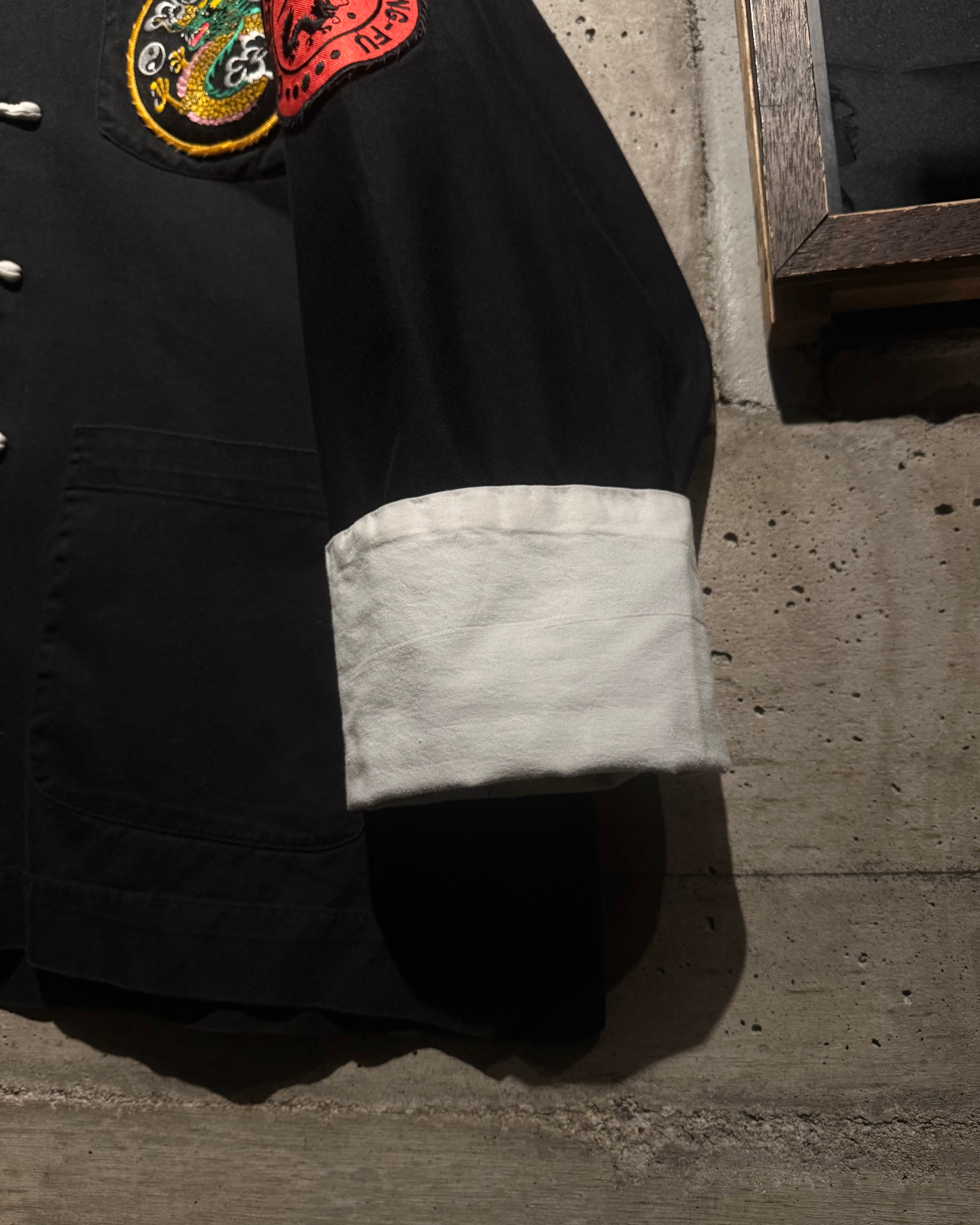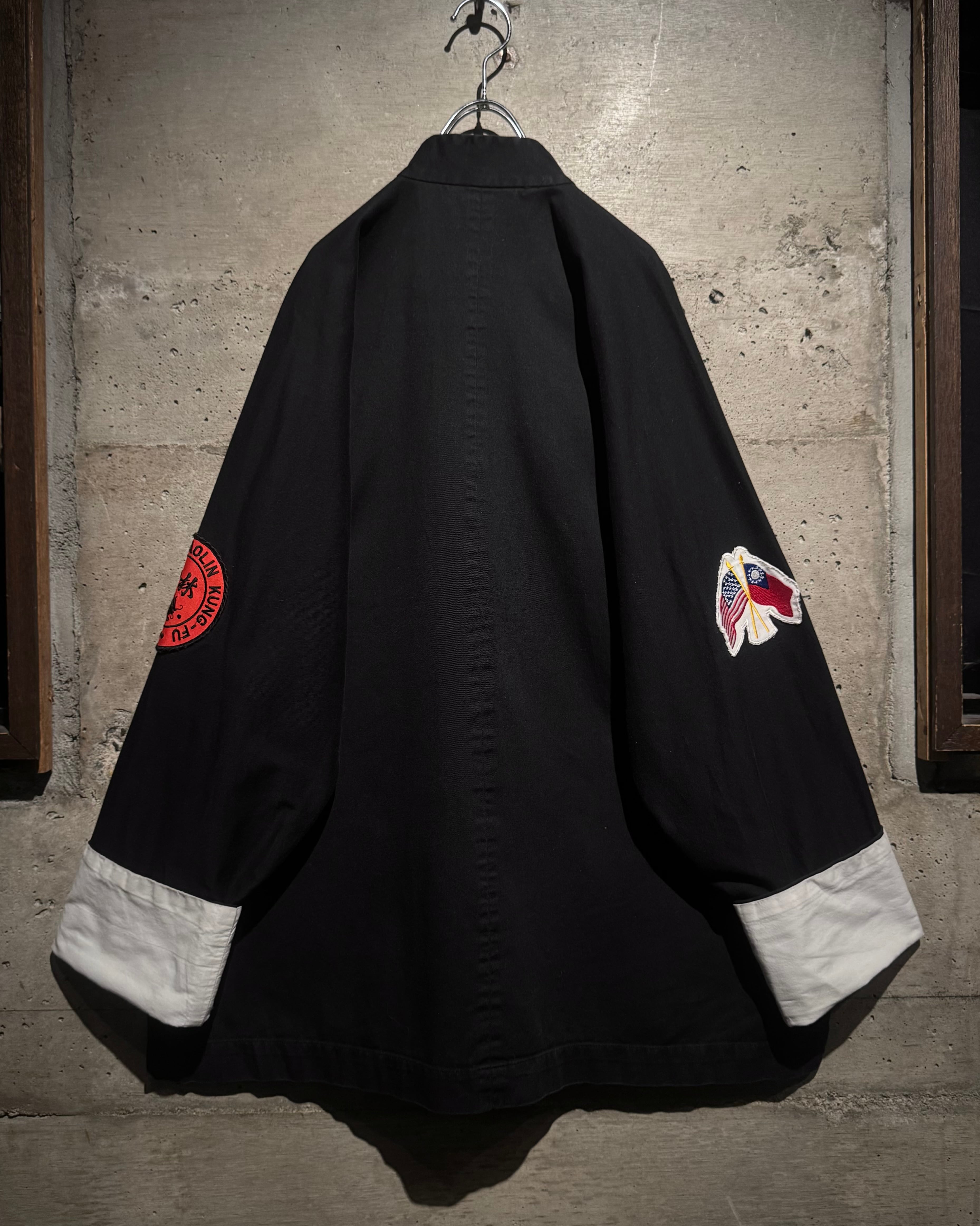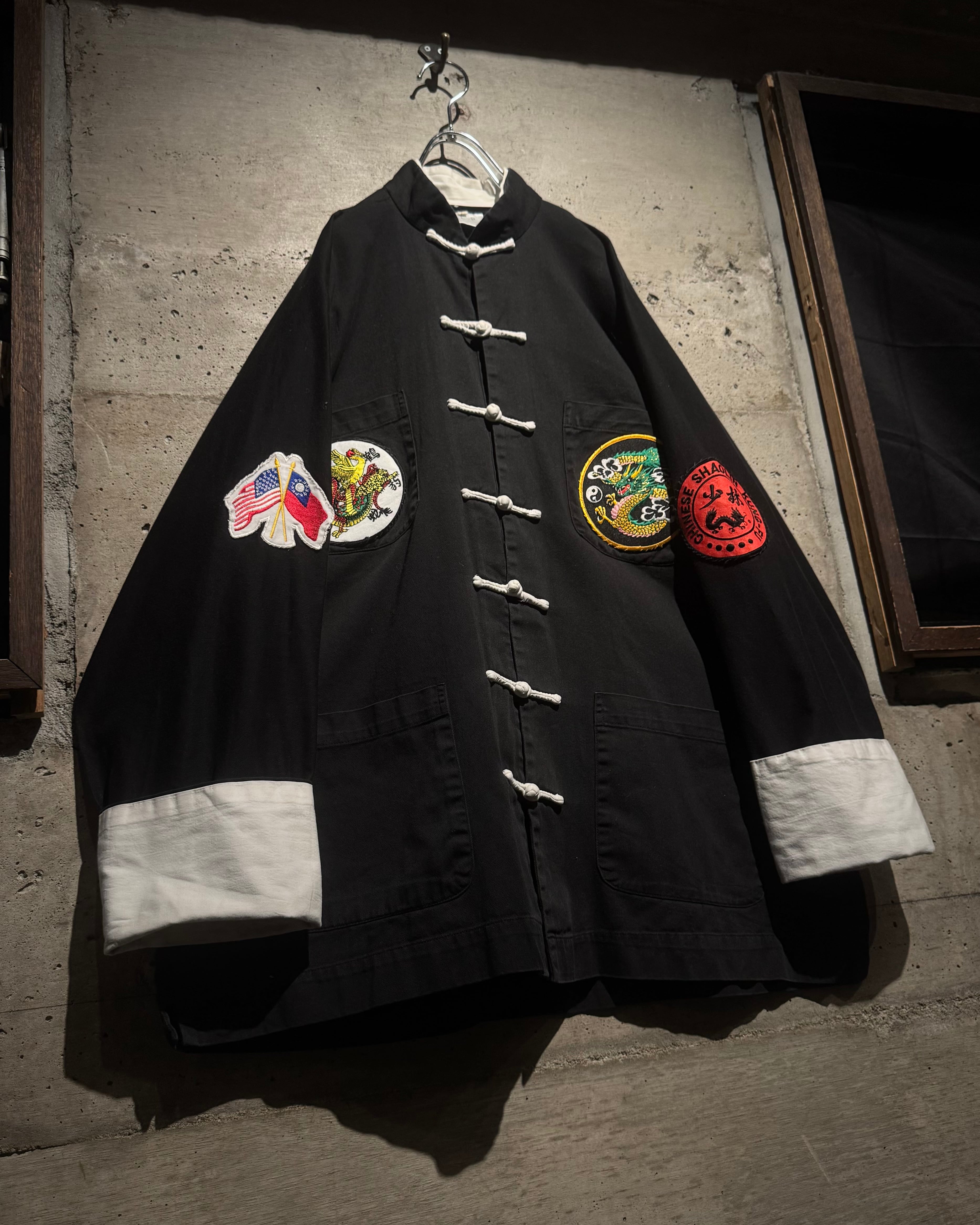 ブラック×ホワイトを基調に、両胸に龍モチーフ、アームには国旗や“少林”のパッチを載せたカンフーシャツ。