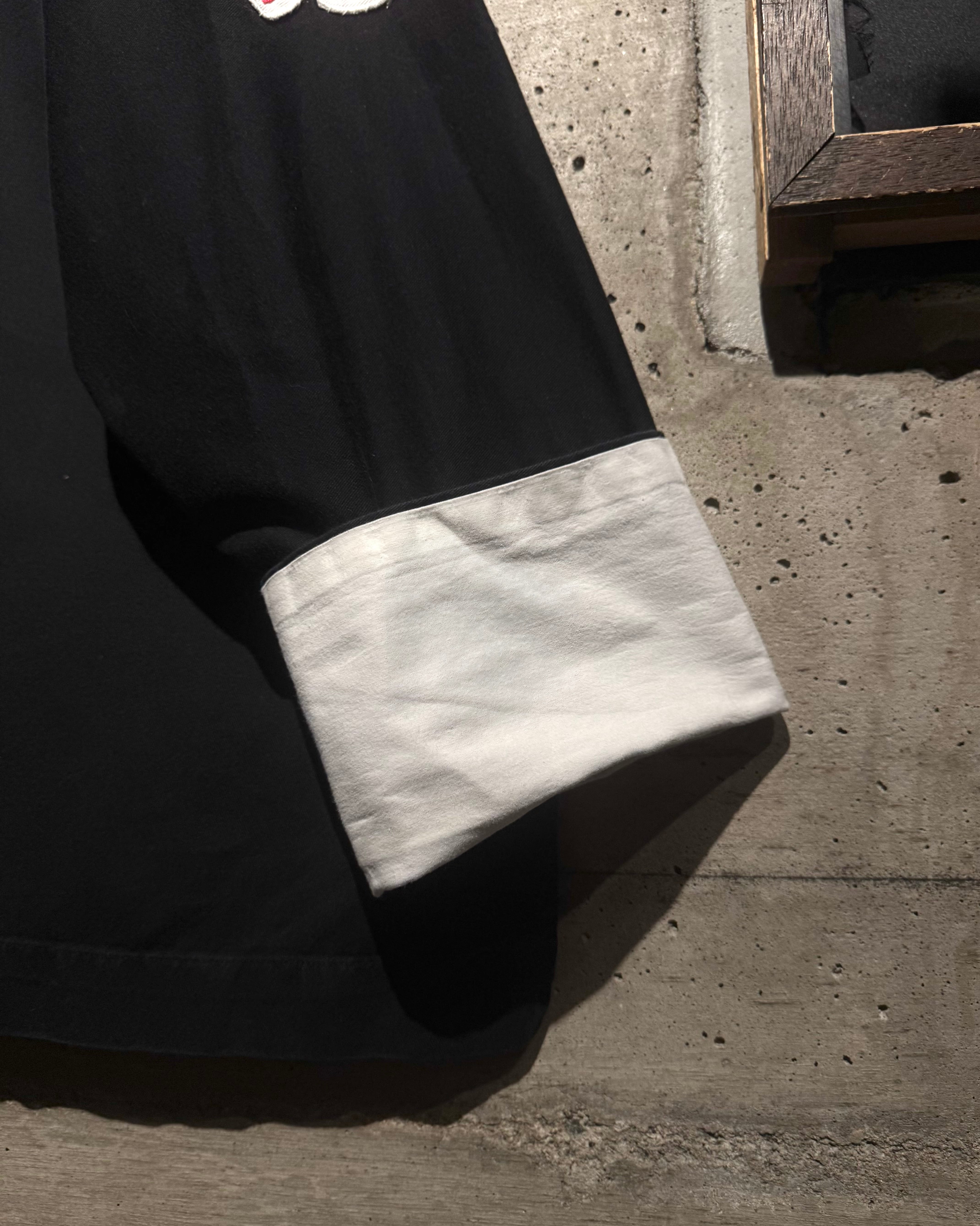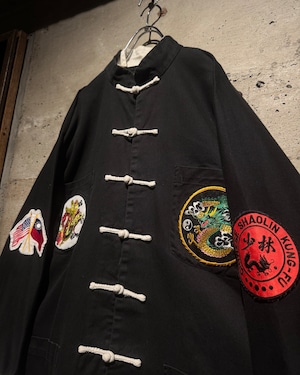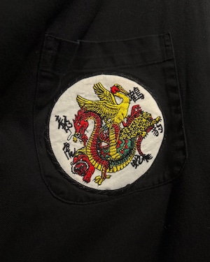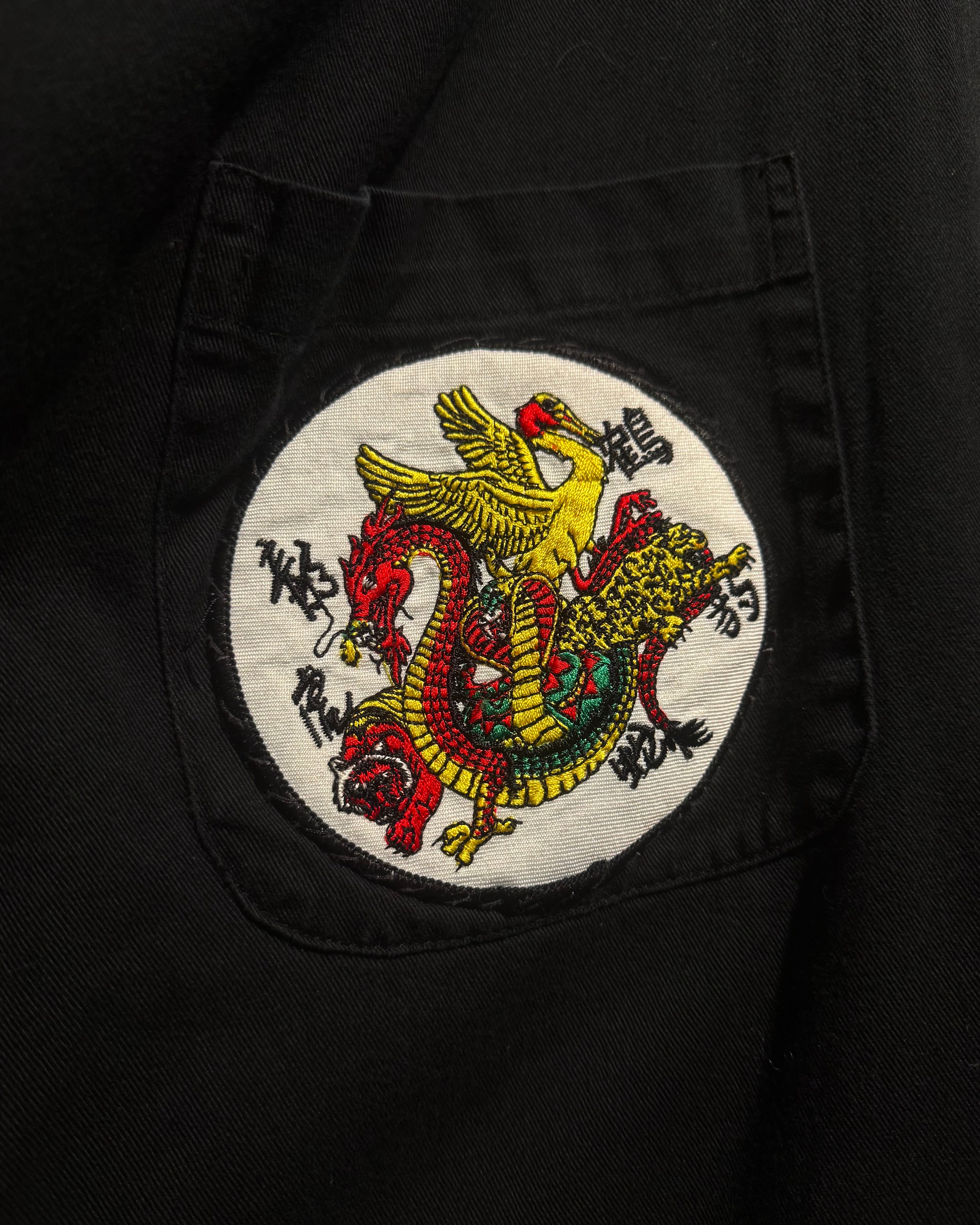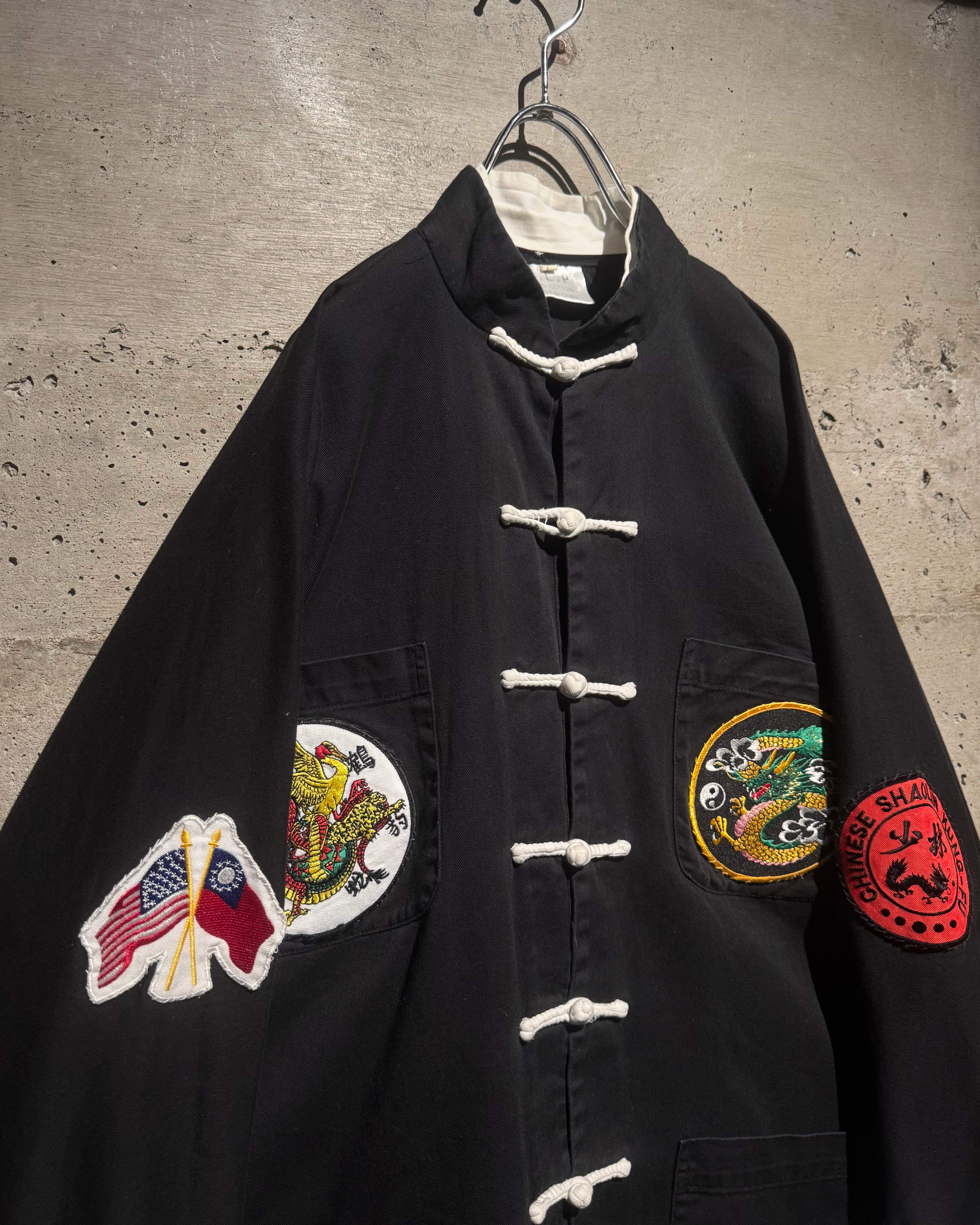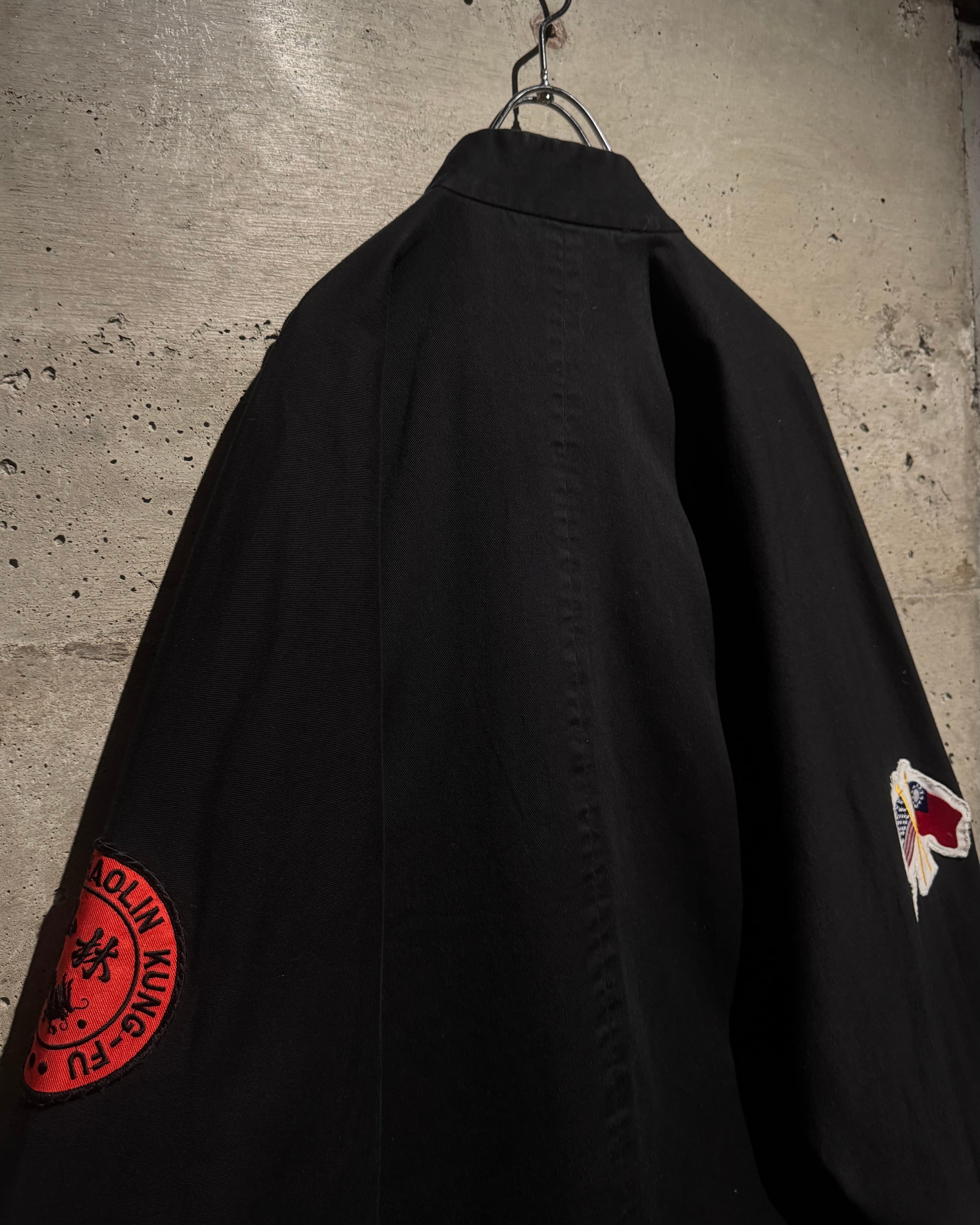 ブラック×ホワイトを基調に、両胸に龍モチーフ、アームには国旗や“少林”のパッチを載せたカンフーシャツ。