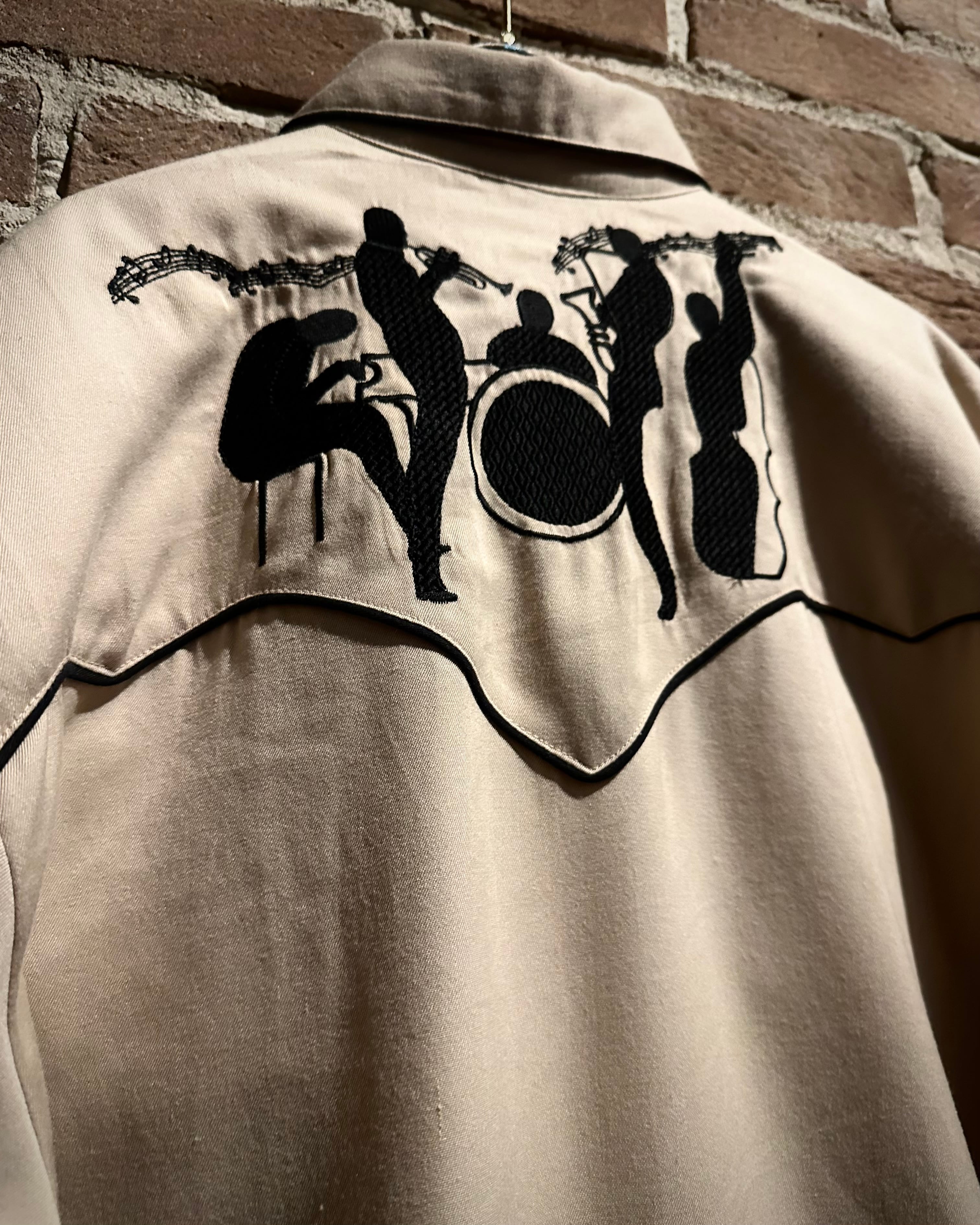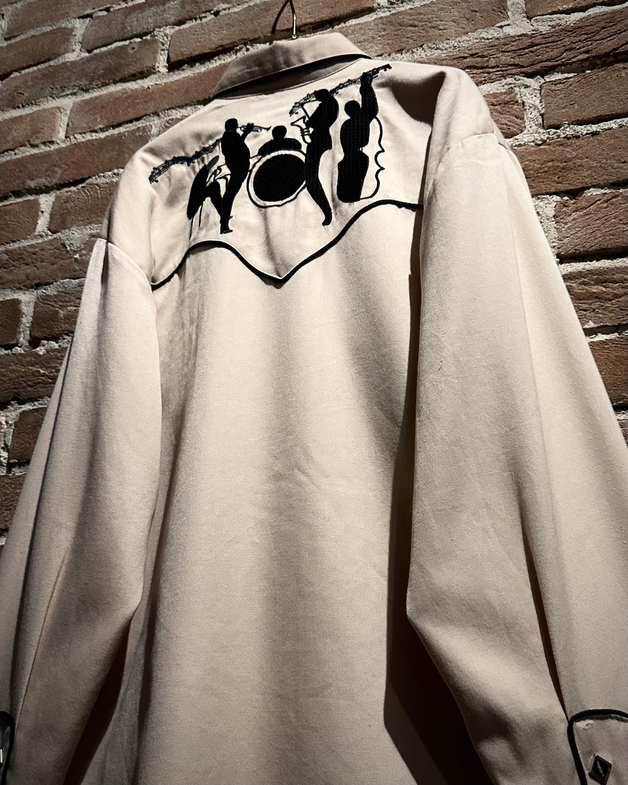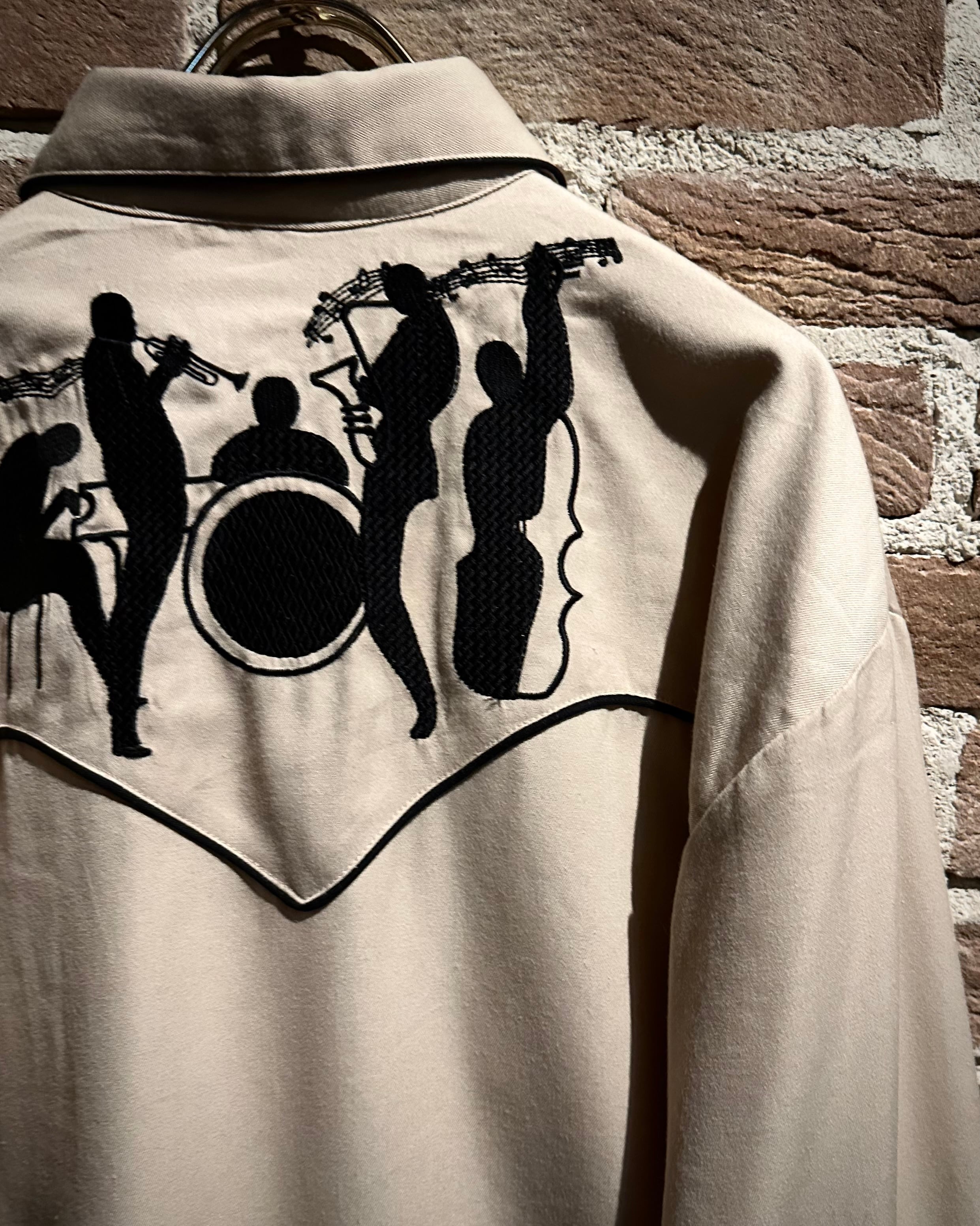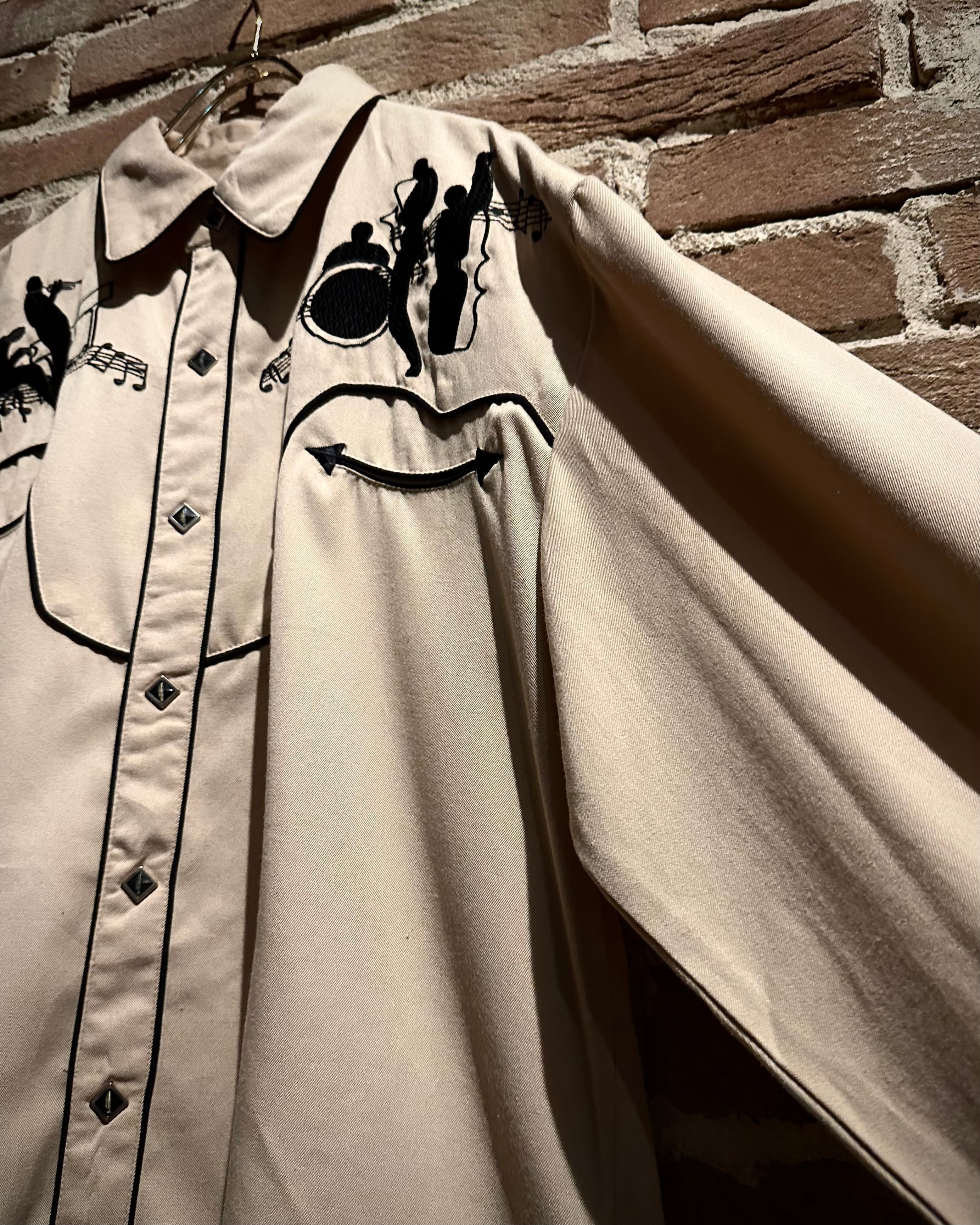ライトベージュのボディをベースに、フロントとバックヨークには音楽を奏でるミュージシャンの刺繍を施した一着。