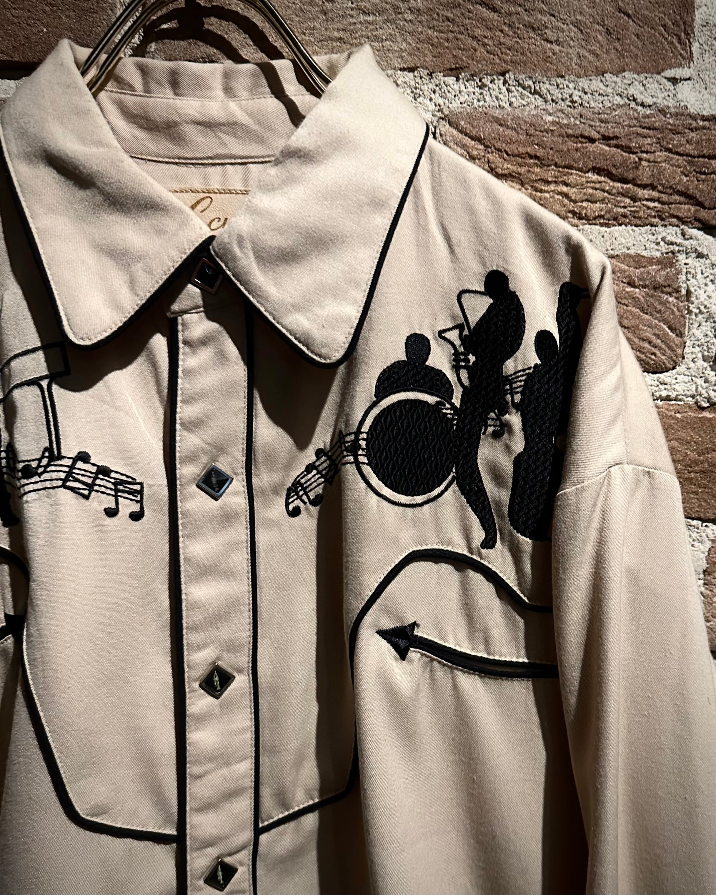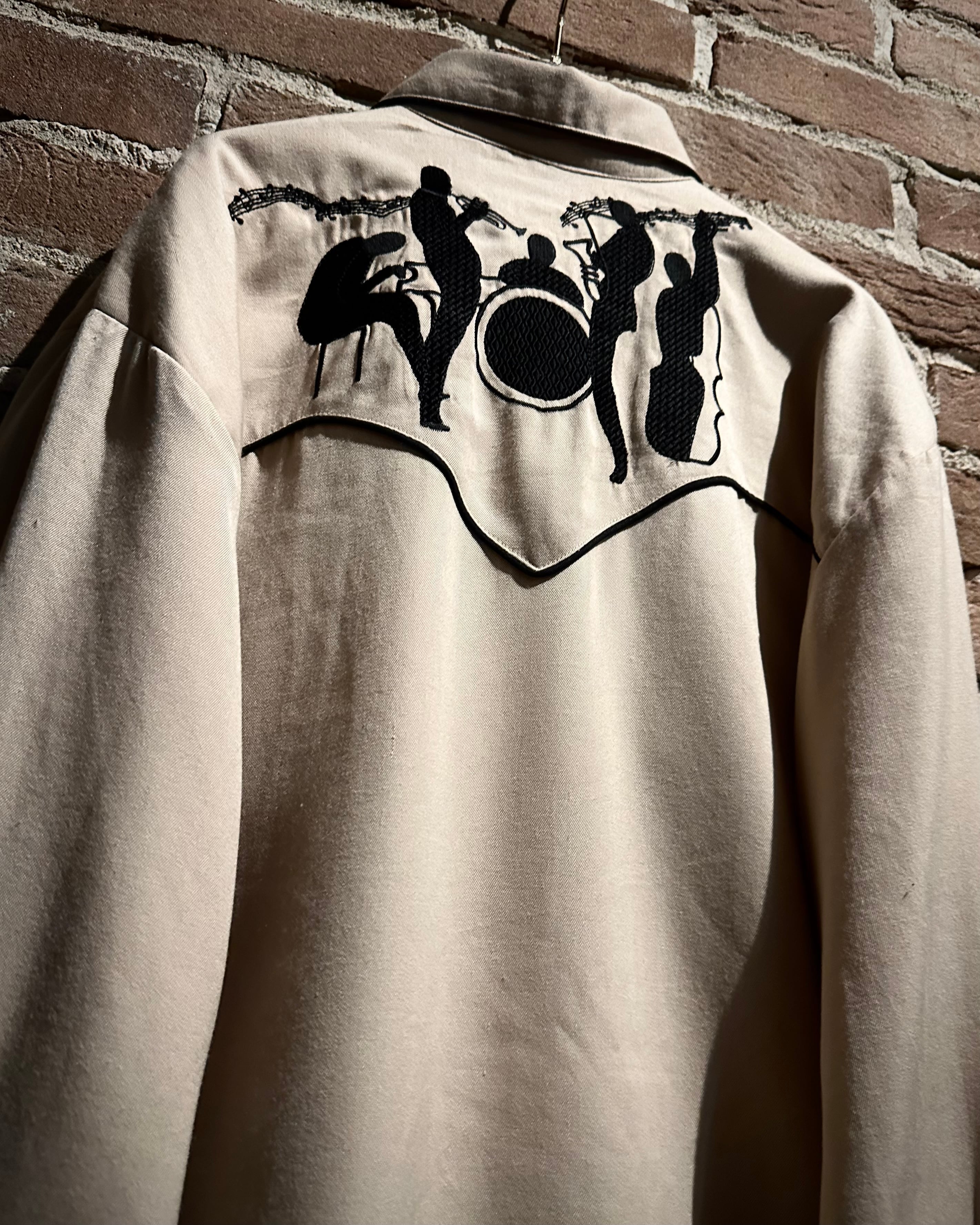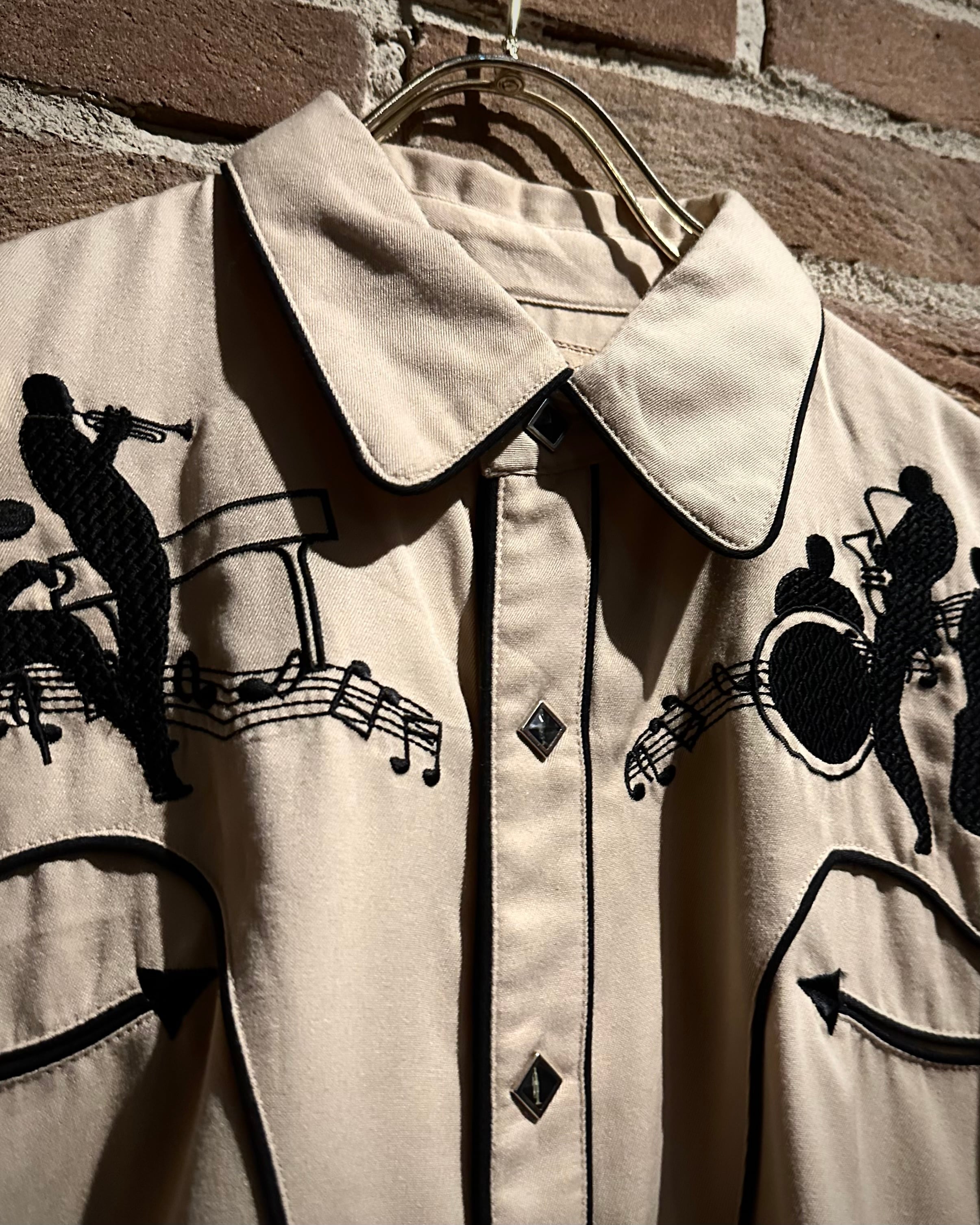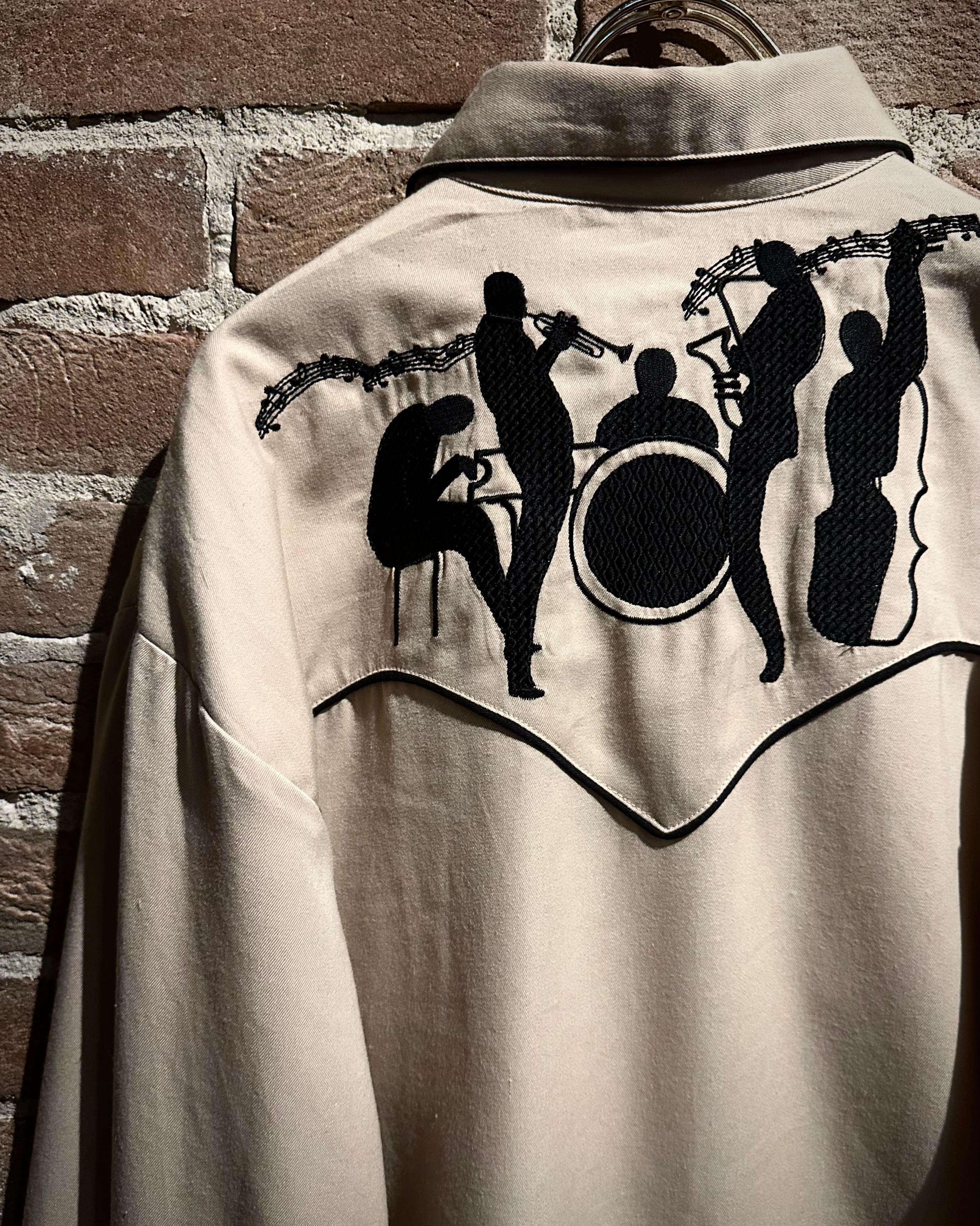 ライトベージュのボディをベースに、フロントとバックヨークには音楽を奏でるミュージシャンの刺繍を施した一着。