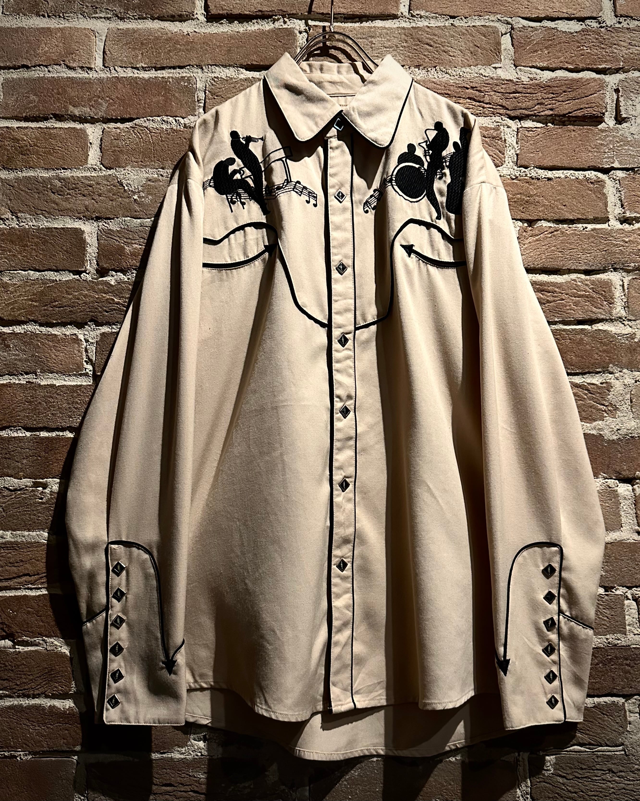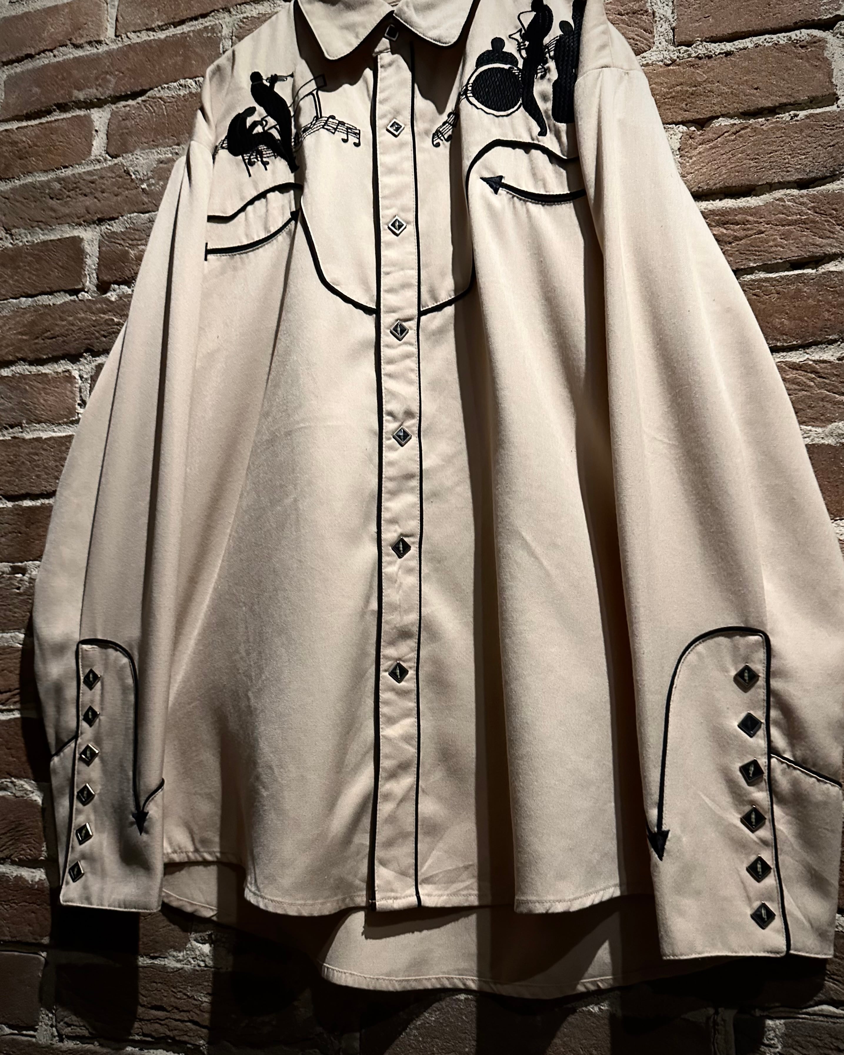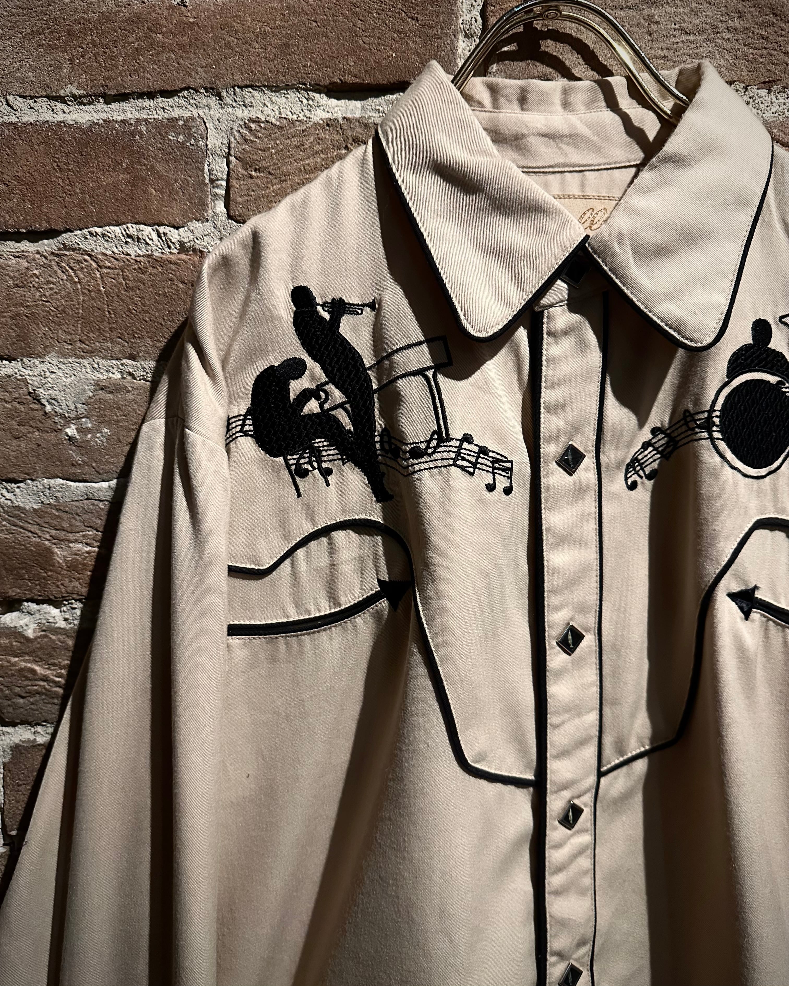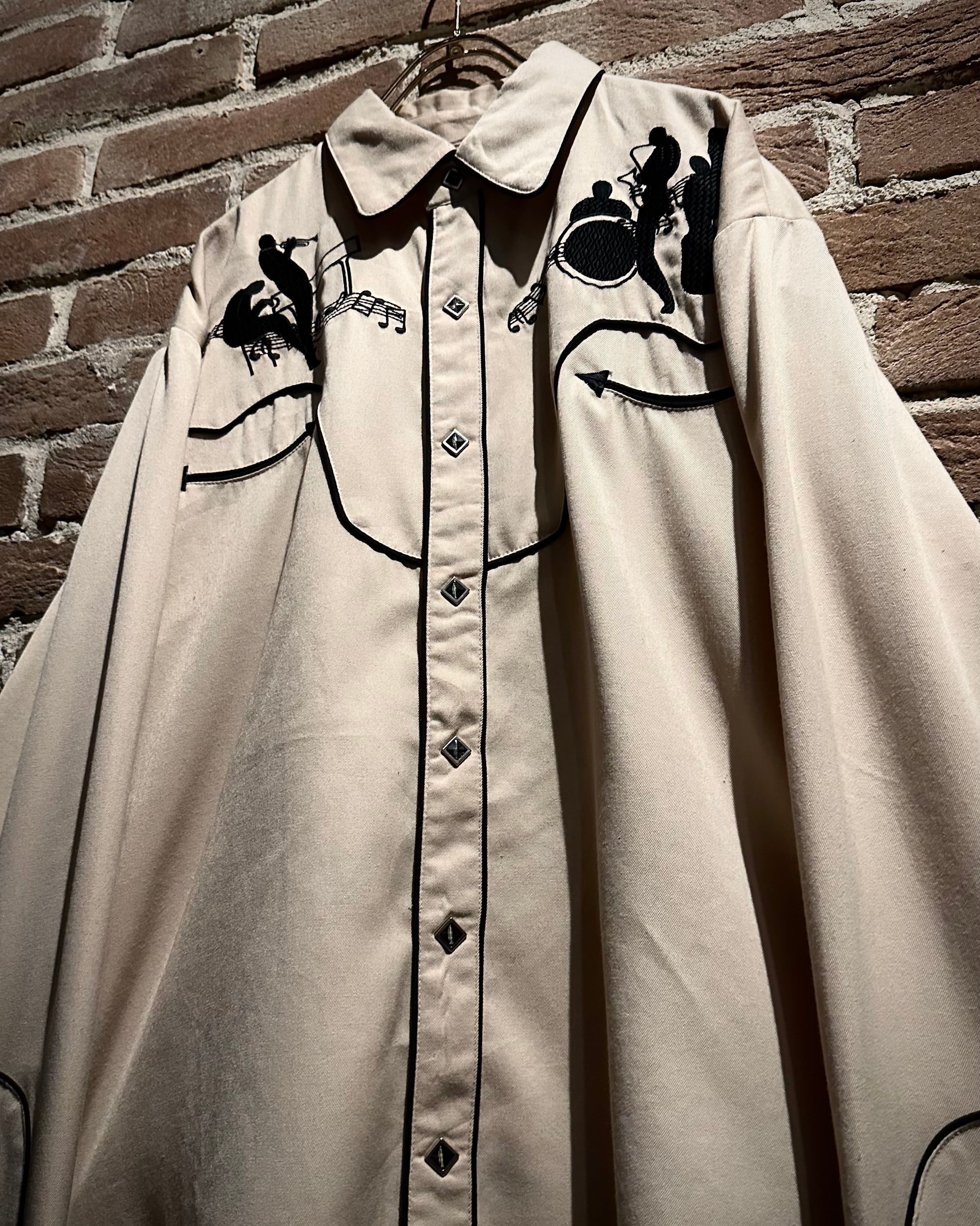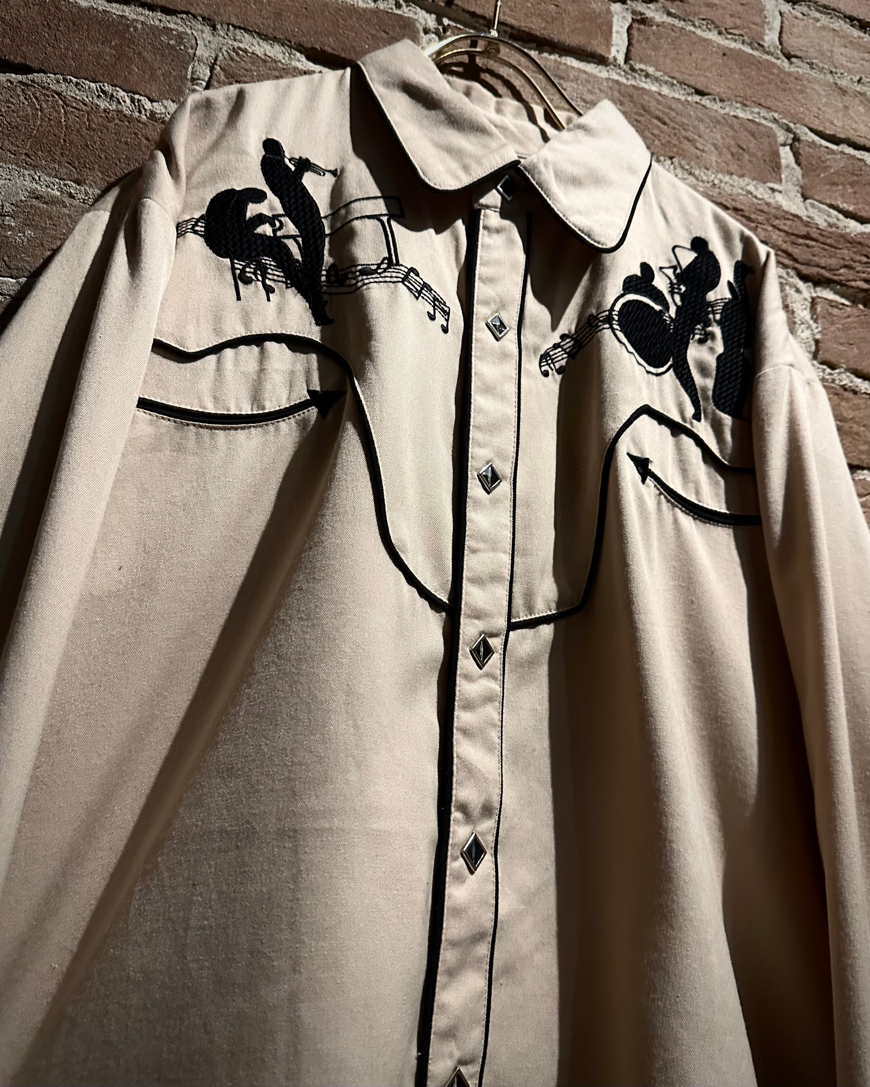 ライトベージュのボディをベースに、フロントとバックヨークには音楽を奏でるミュージシャンの刺繍を施した一着。