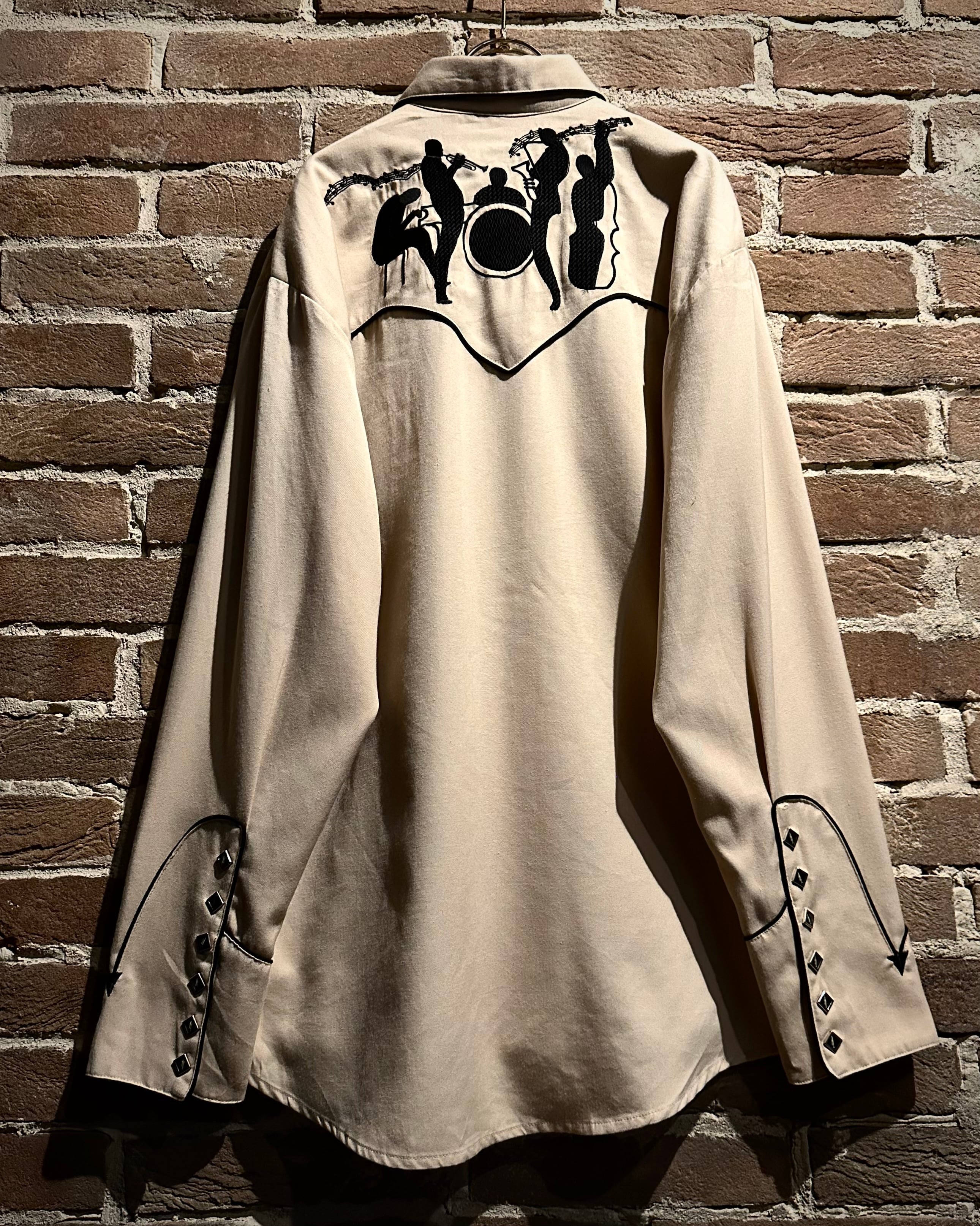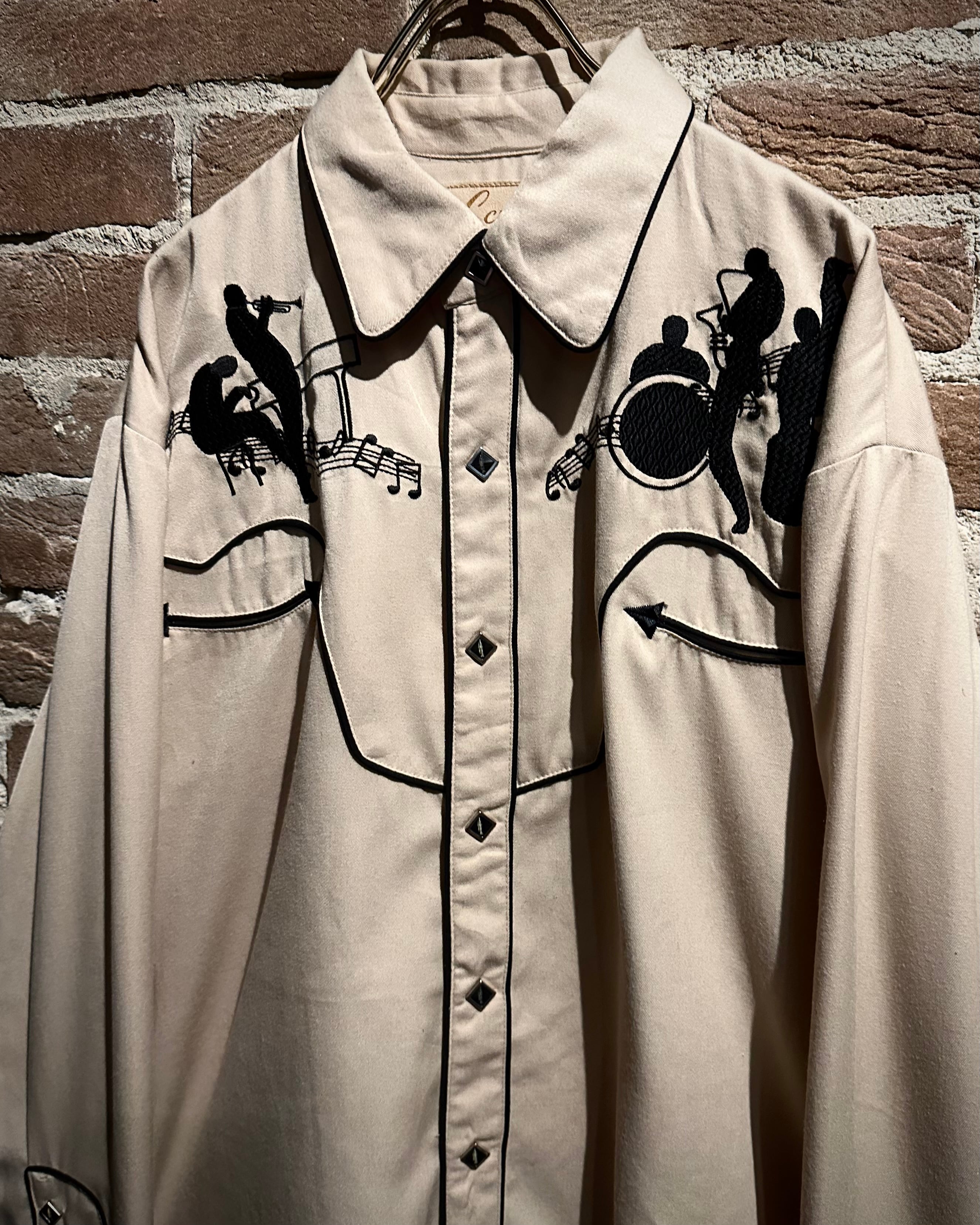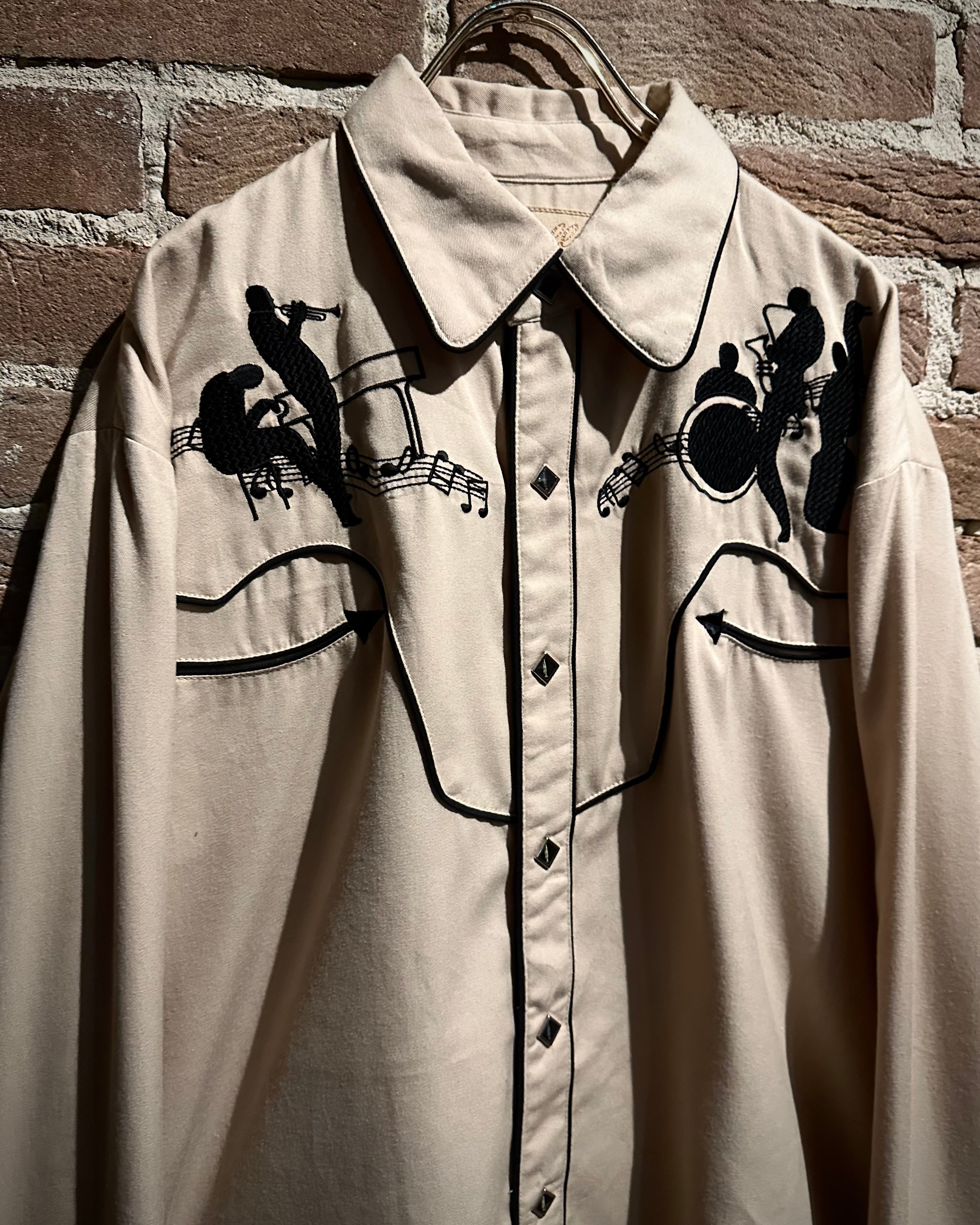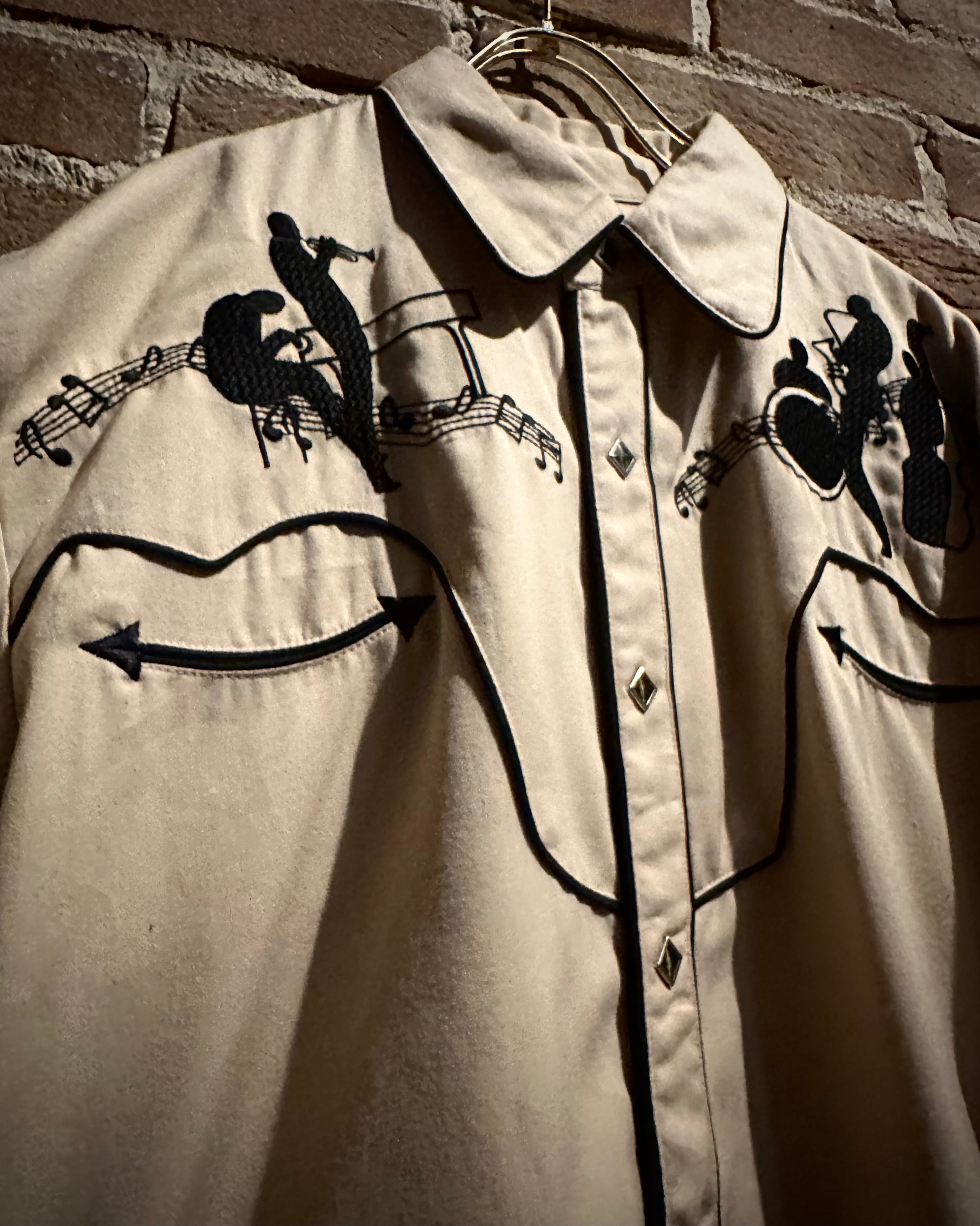 ライトベージュのボディをベースに、フロントとバックヨークには音楽を奏でるミュージシャンの刺繍を施した一着。