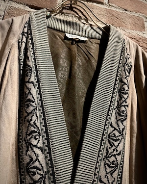 幾何学調の柄を落とし込んだニットをフロントと背面に切り替え、異素材のコントラストによって奥行きのある立体的な表情を演出。精巧に作り込まれた、イタリアメイドらしいクオリティの高さが随所に感じられます。