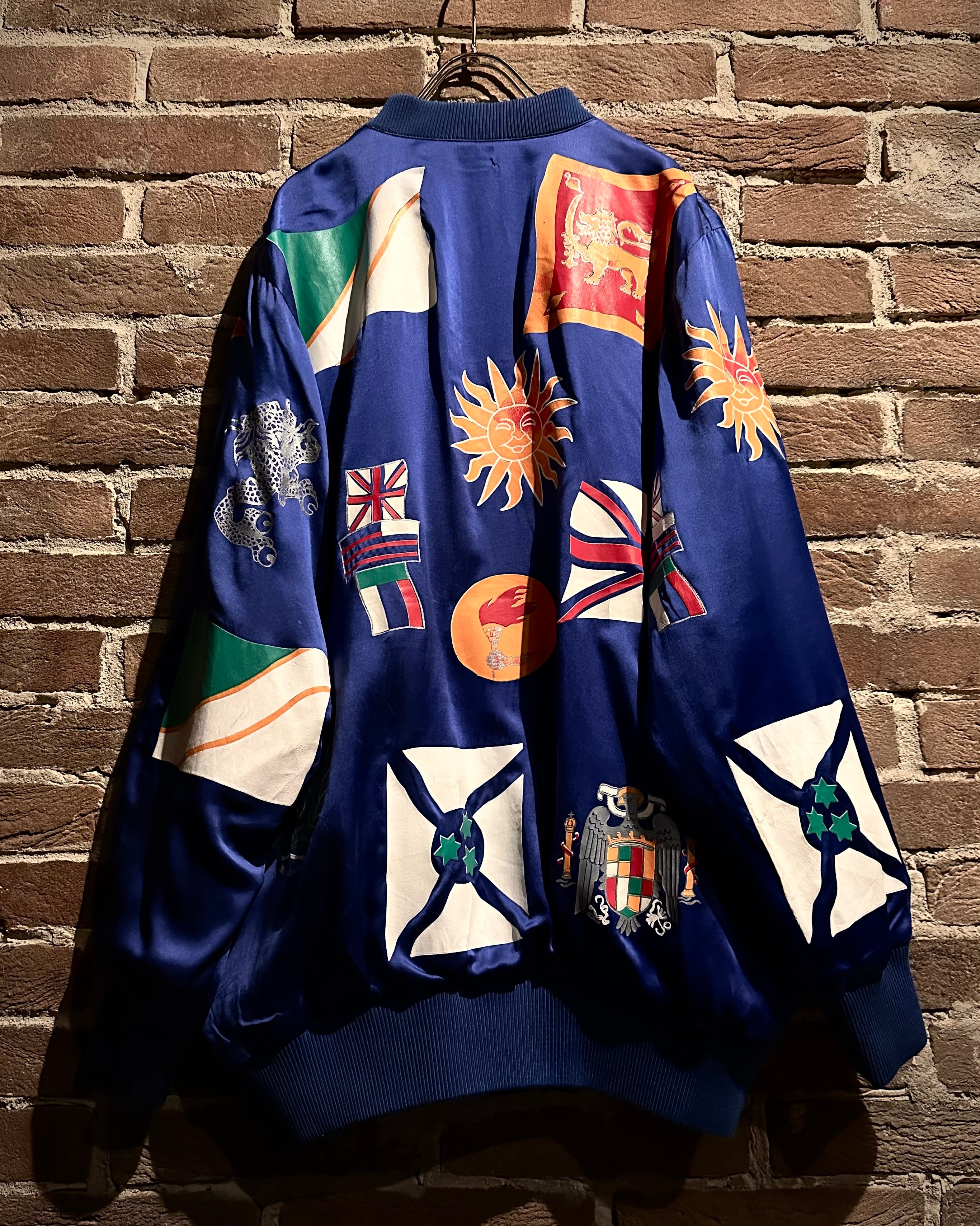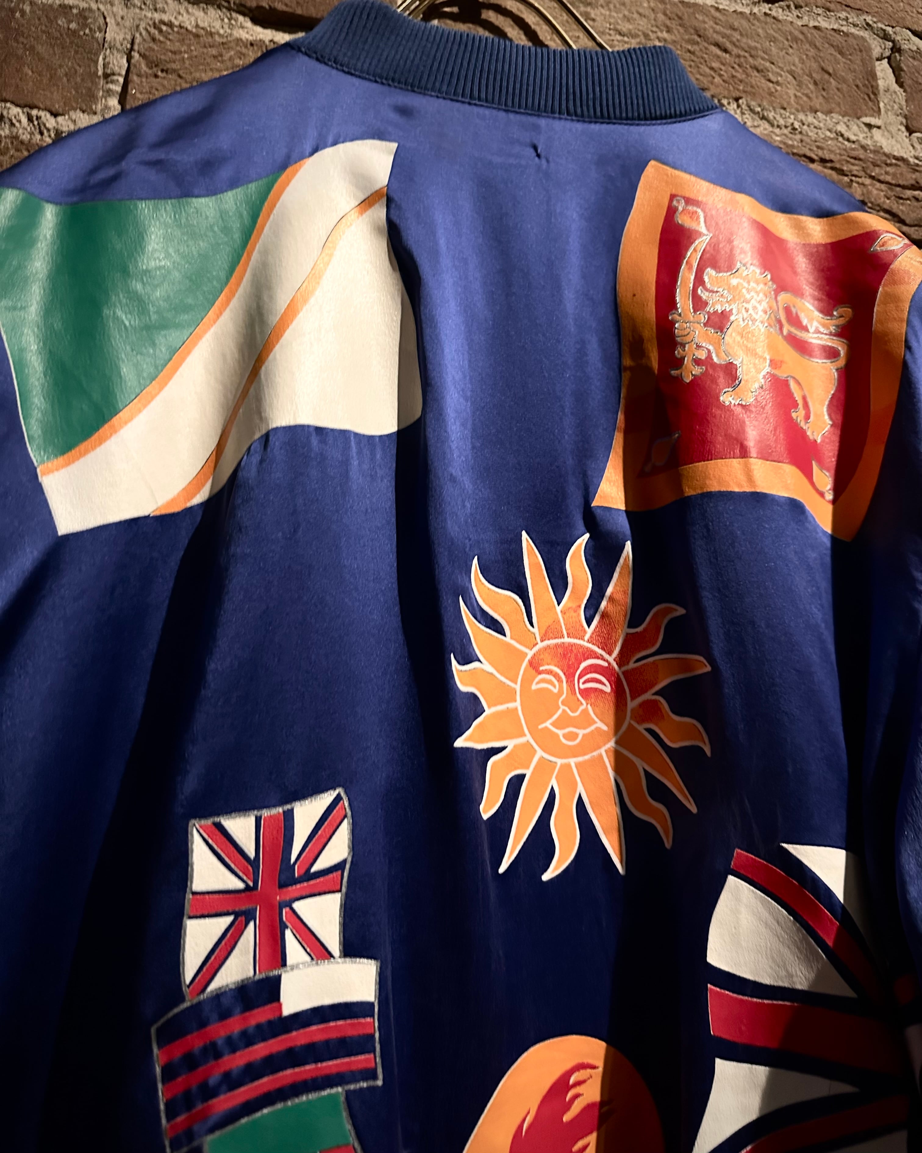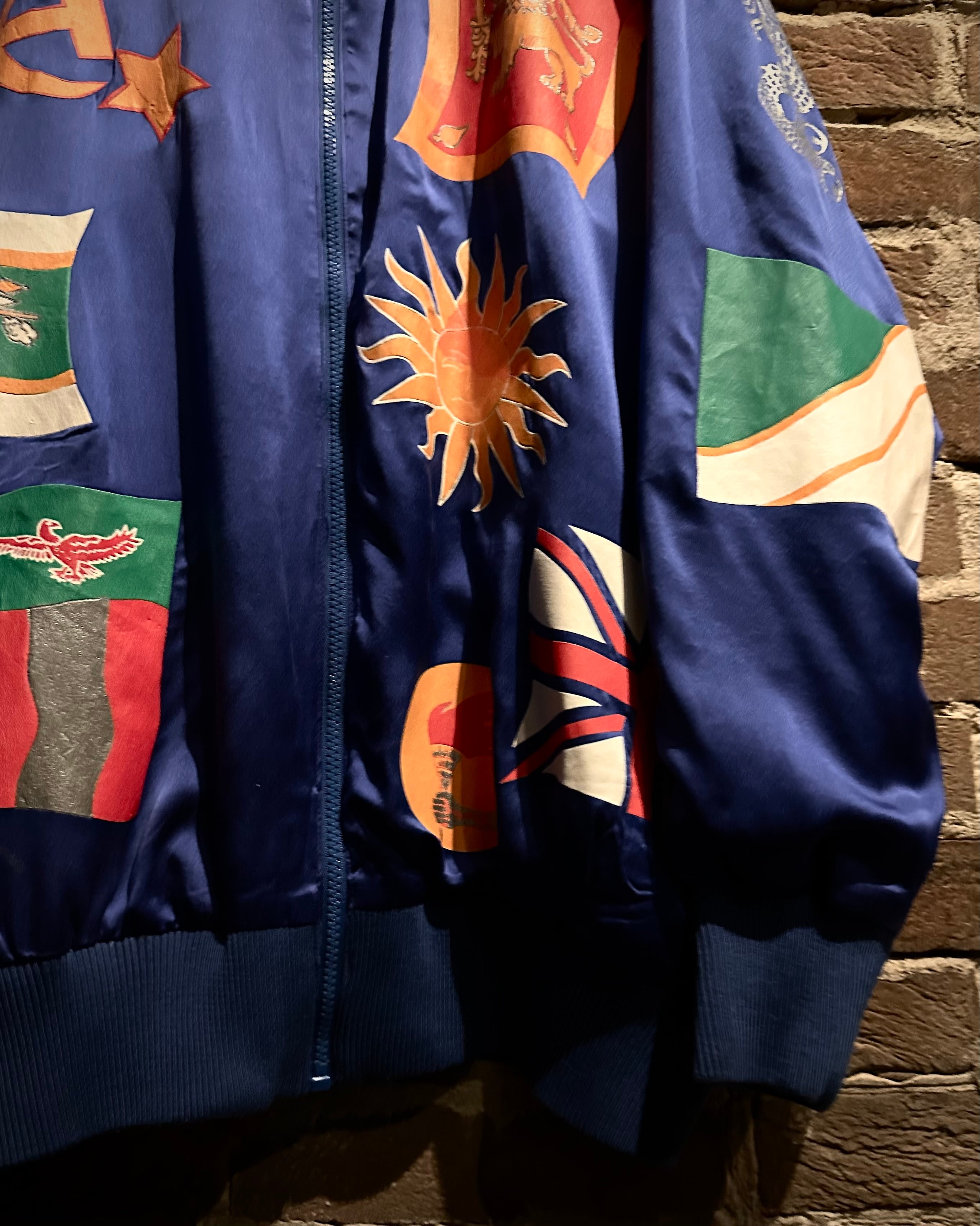 しっとりとした肌触りととろみのある極上のシルク生地を採用し、表面には国旗やエンブレム調のモチーフを全面に配したインパクトのあるデザイン。一方で裏面はソリッドなブルーでまとめられており、対照的な表情を楽しめる二面性が魅力です。