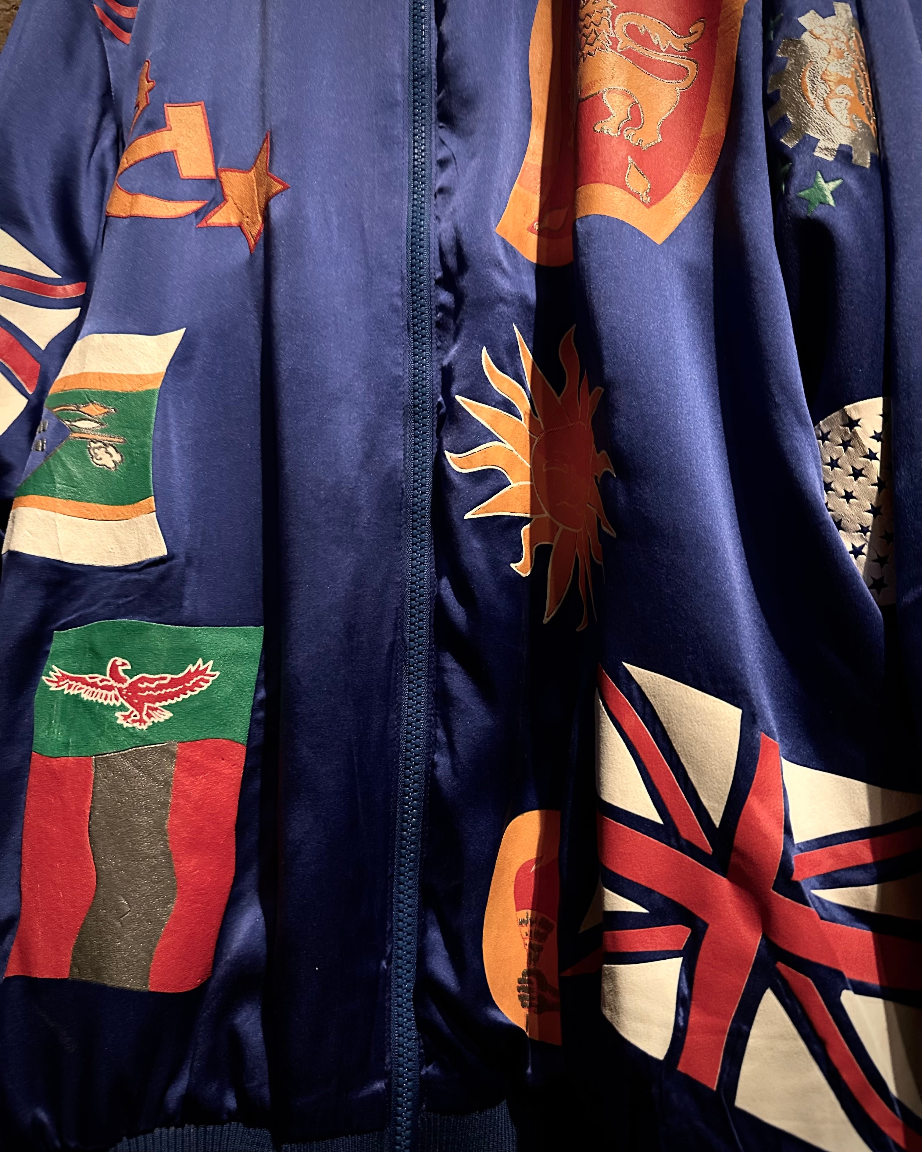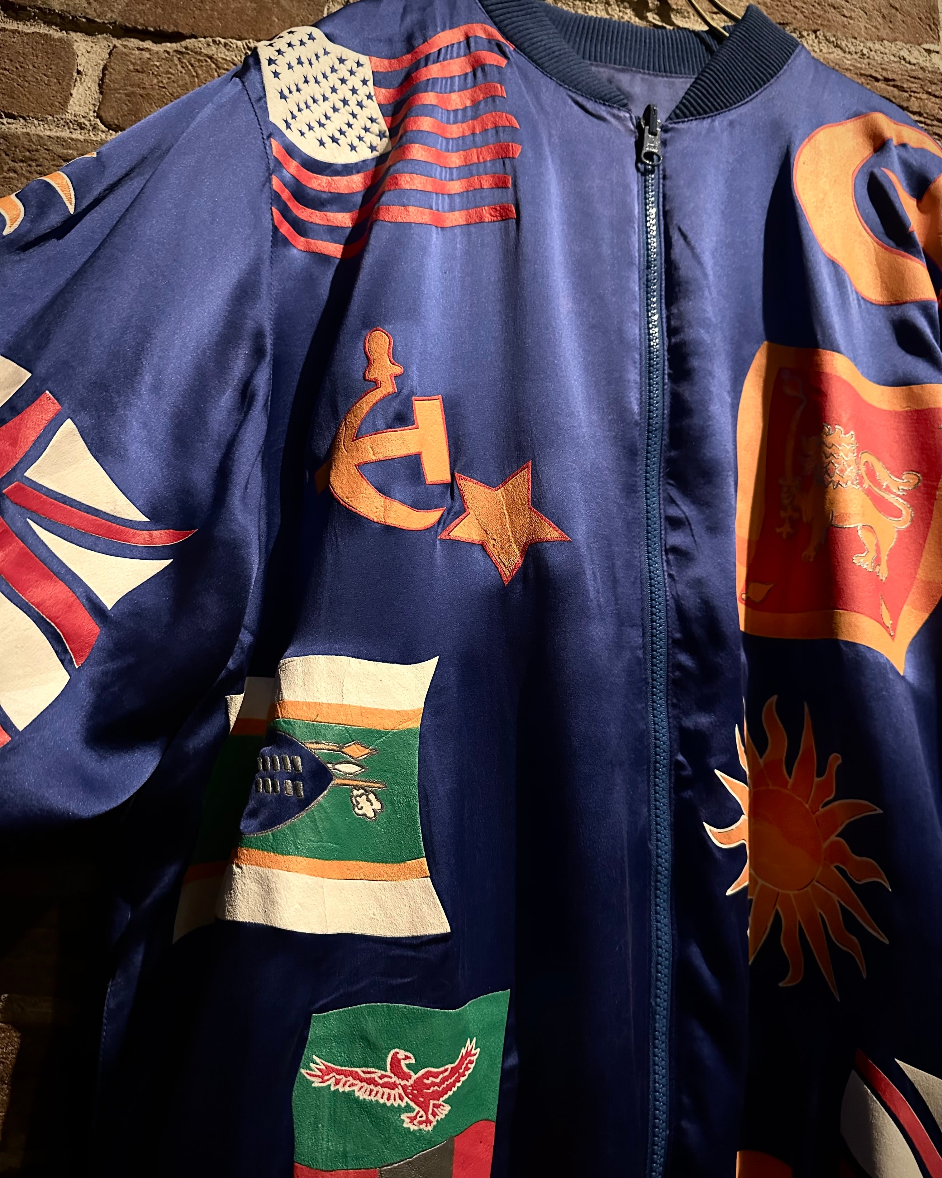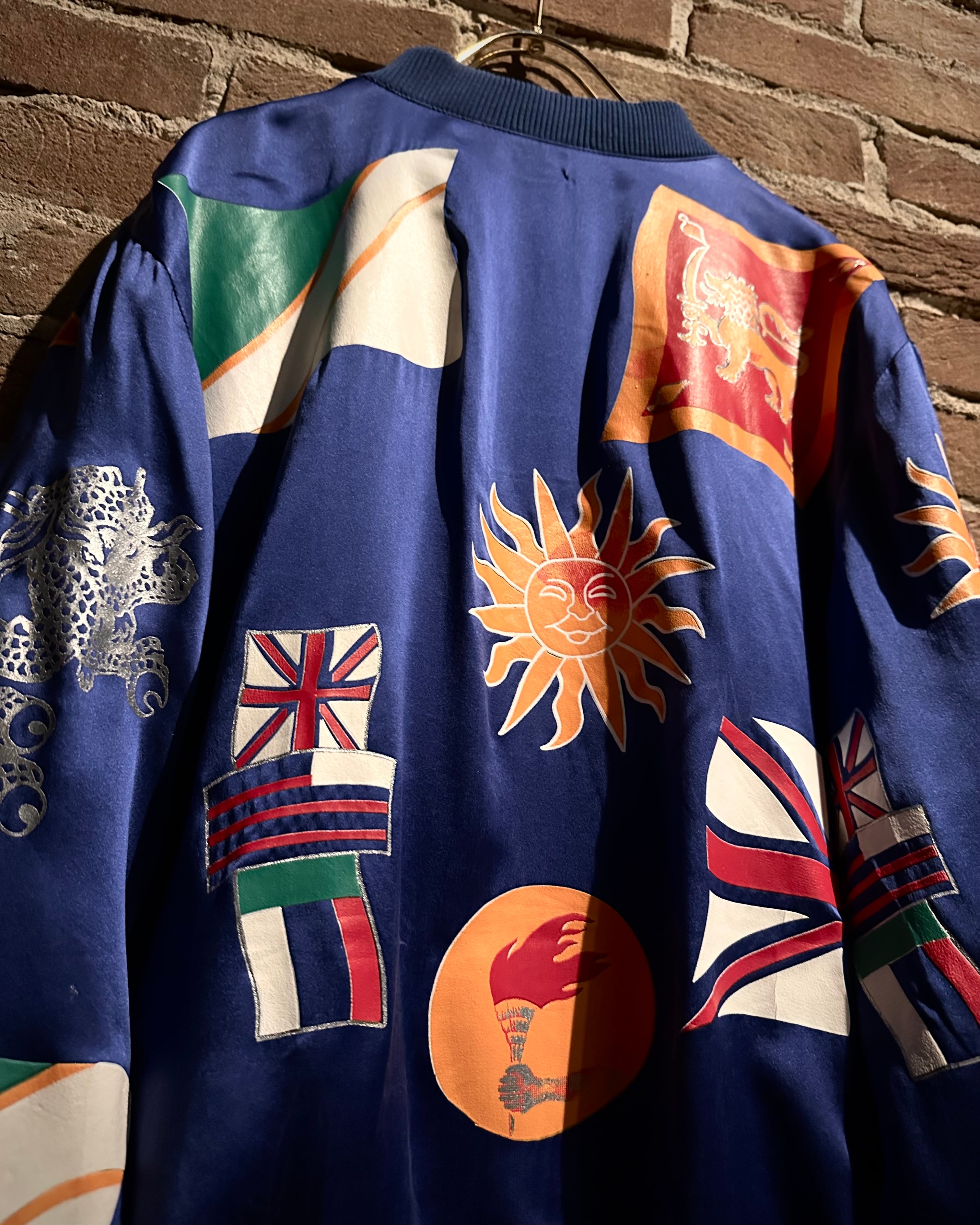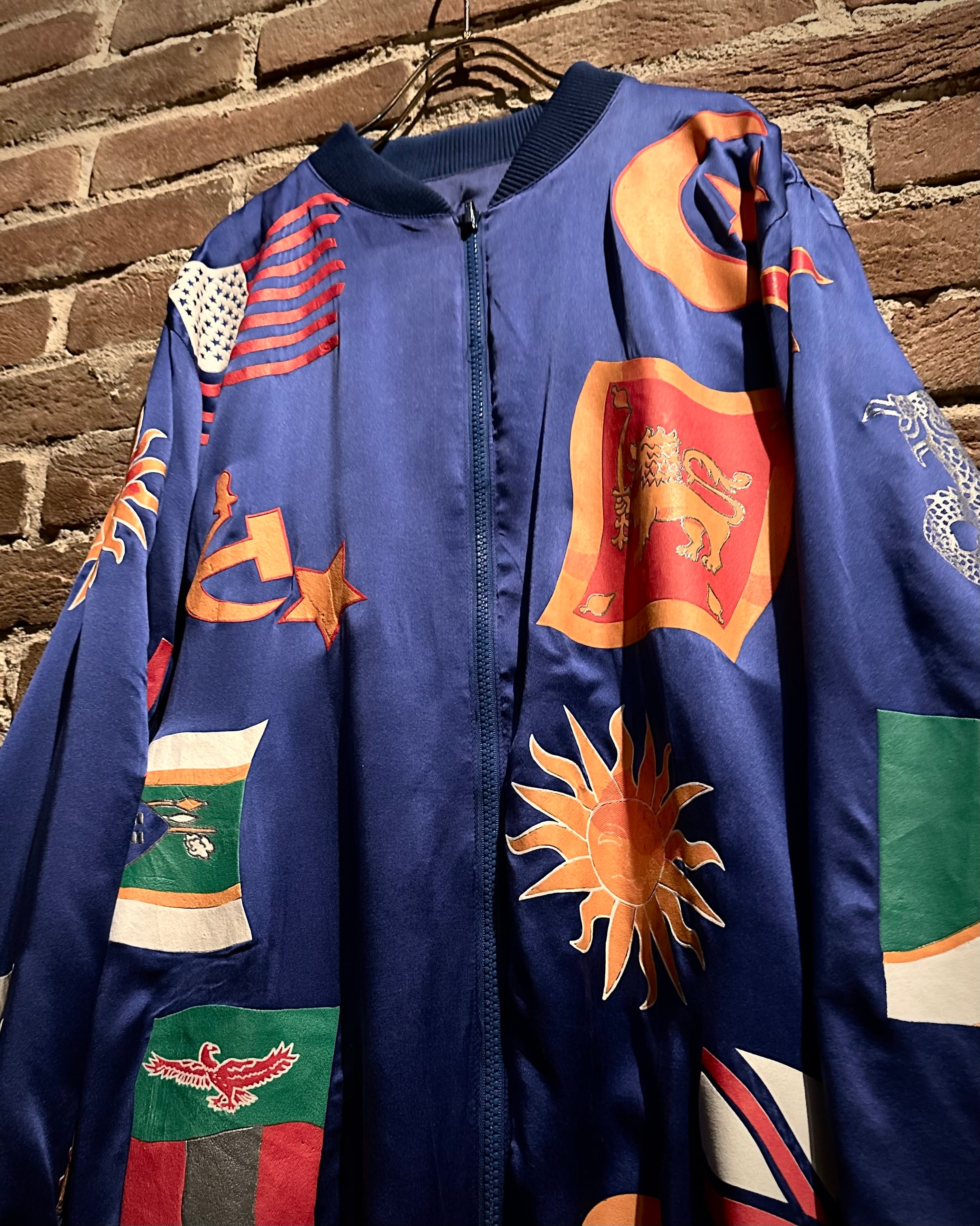しっとりとした肌触りととろみのある極上のシルク生地を採用し、表面には国旗やエンブレム調のモチーフを全面に配したインパクトのあるデザイン。一方で裏面はソリッドなブルーでまとめられており、対照的な表情を楽しめる二面性が魅力です。