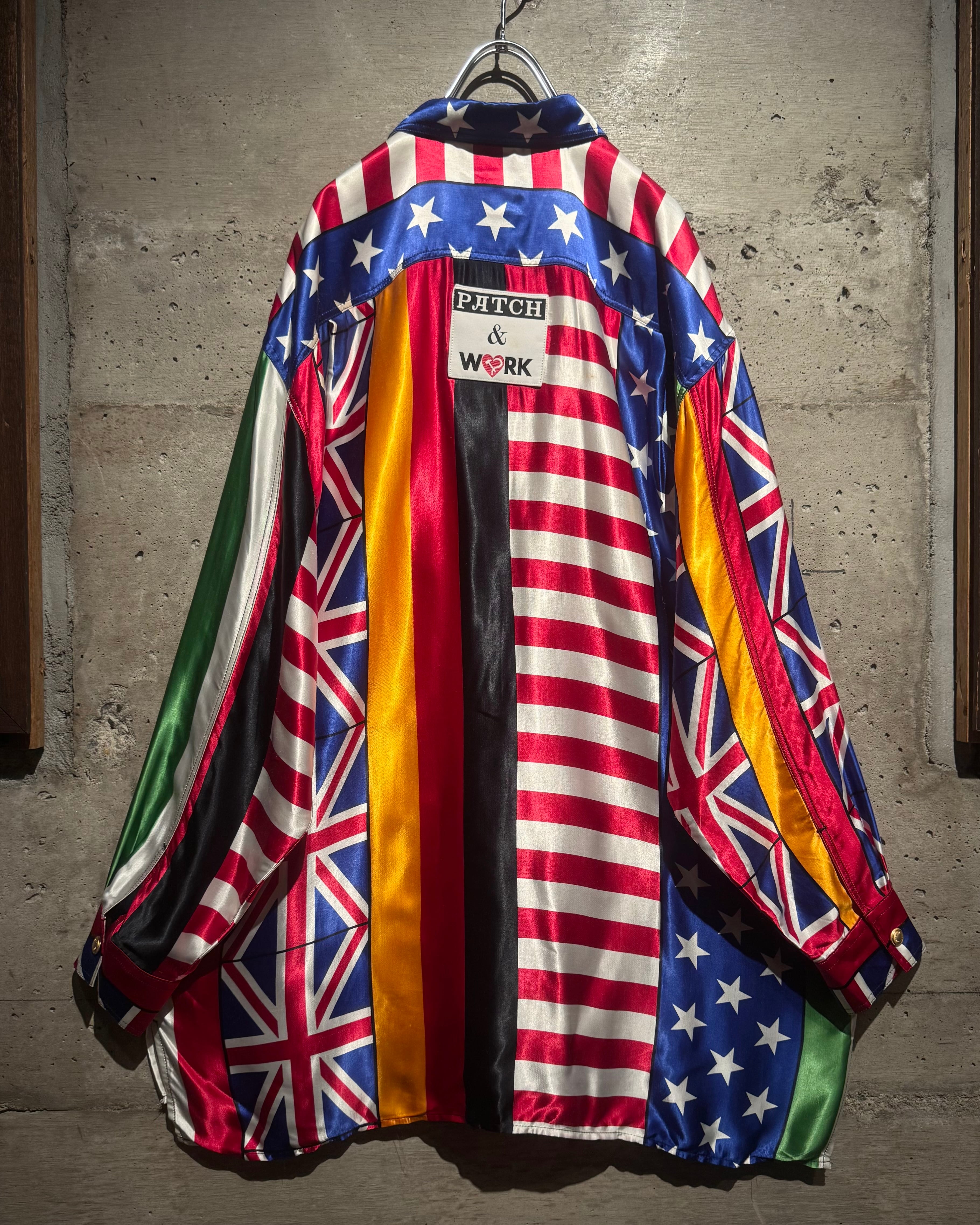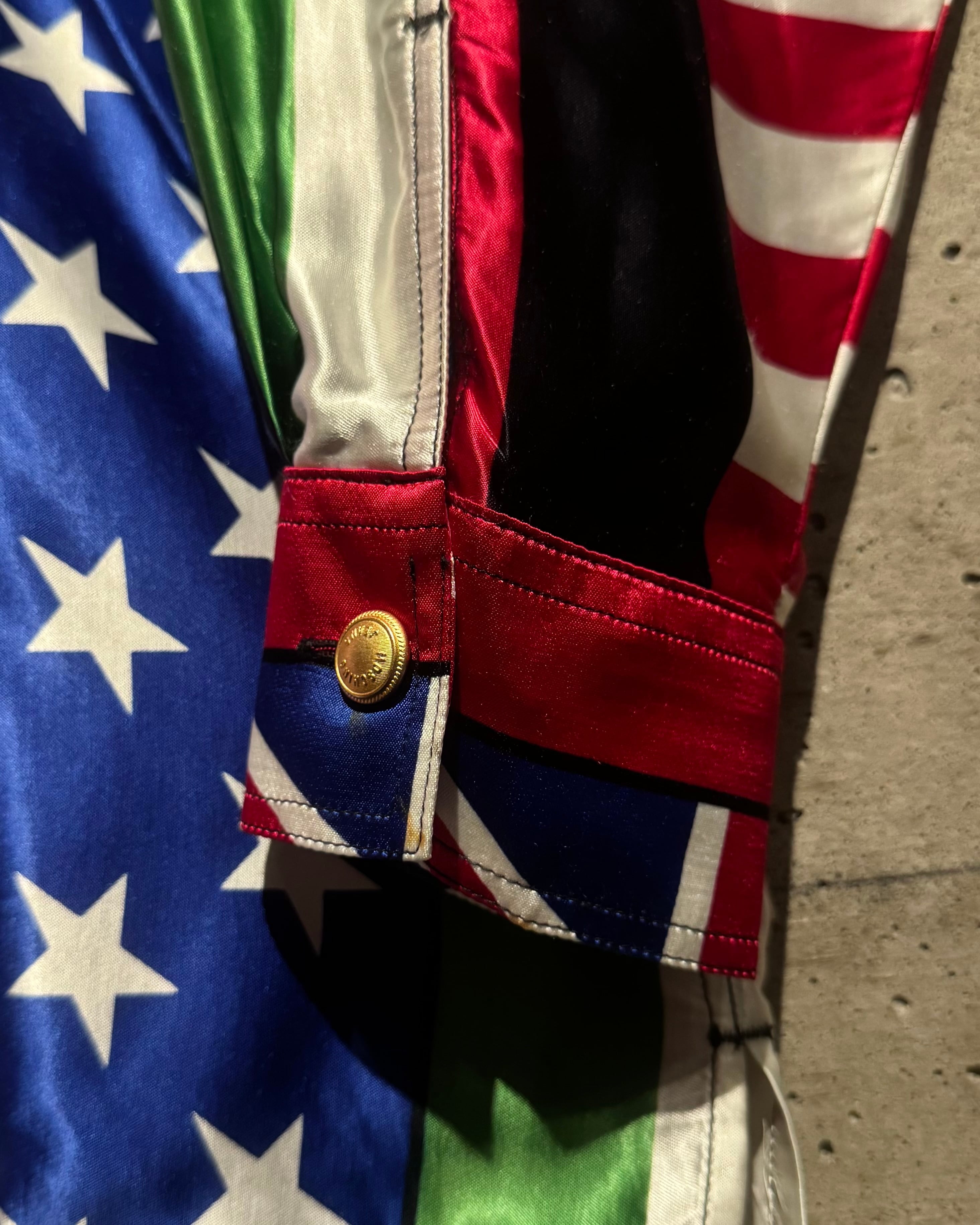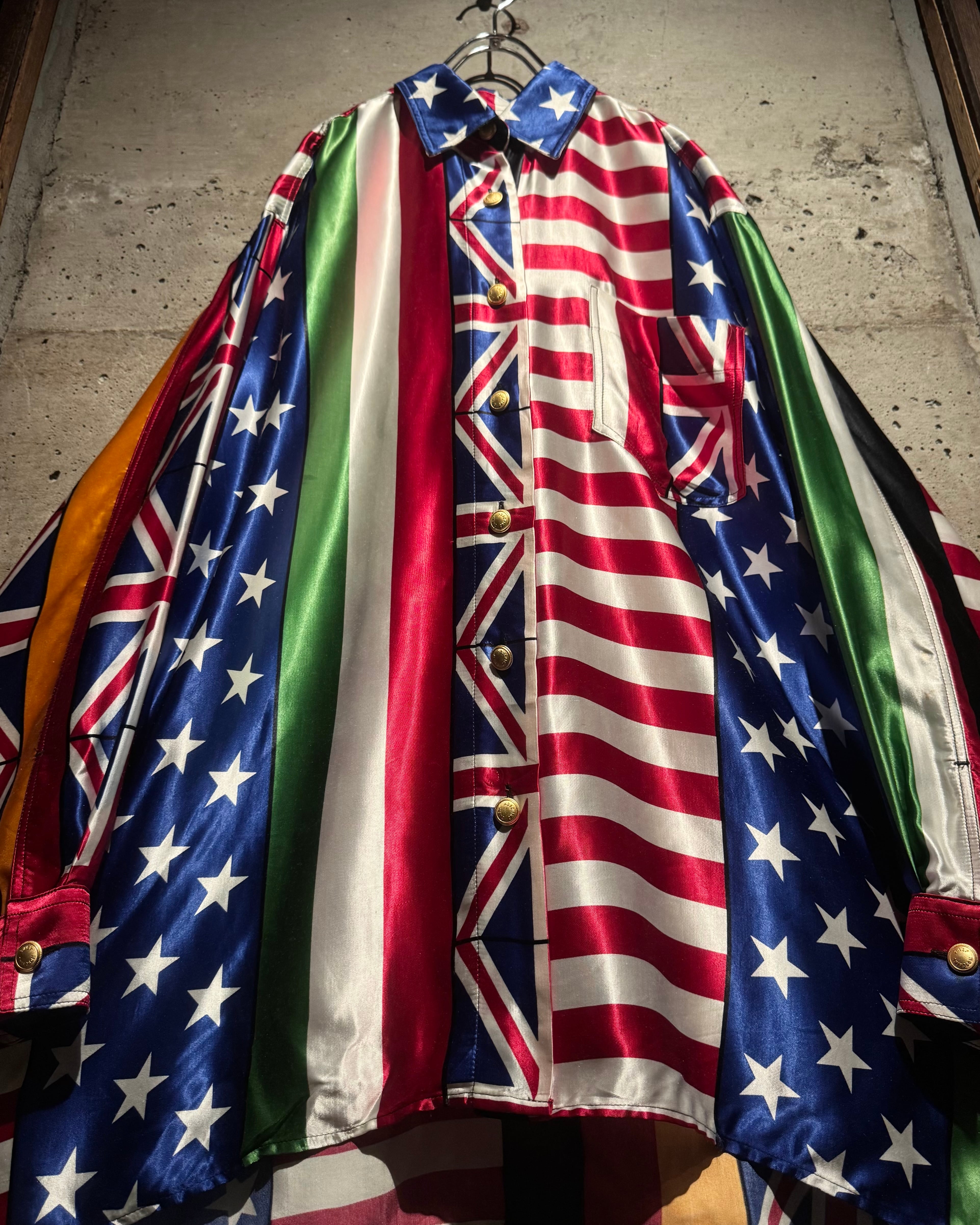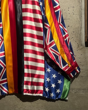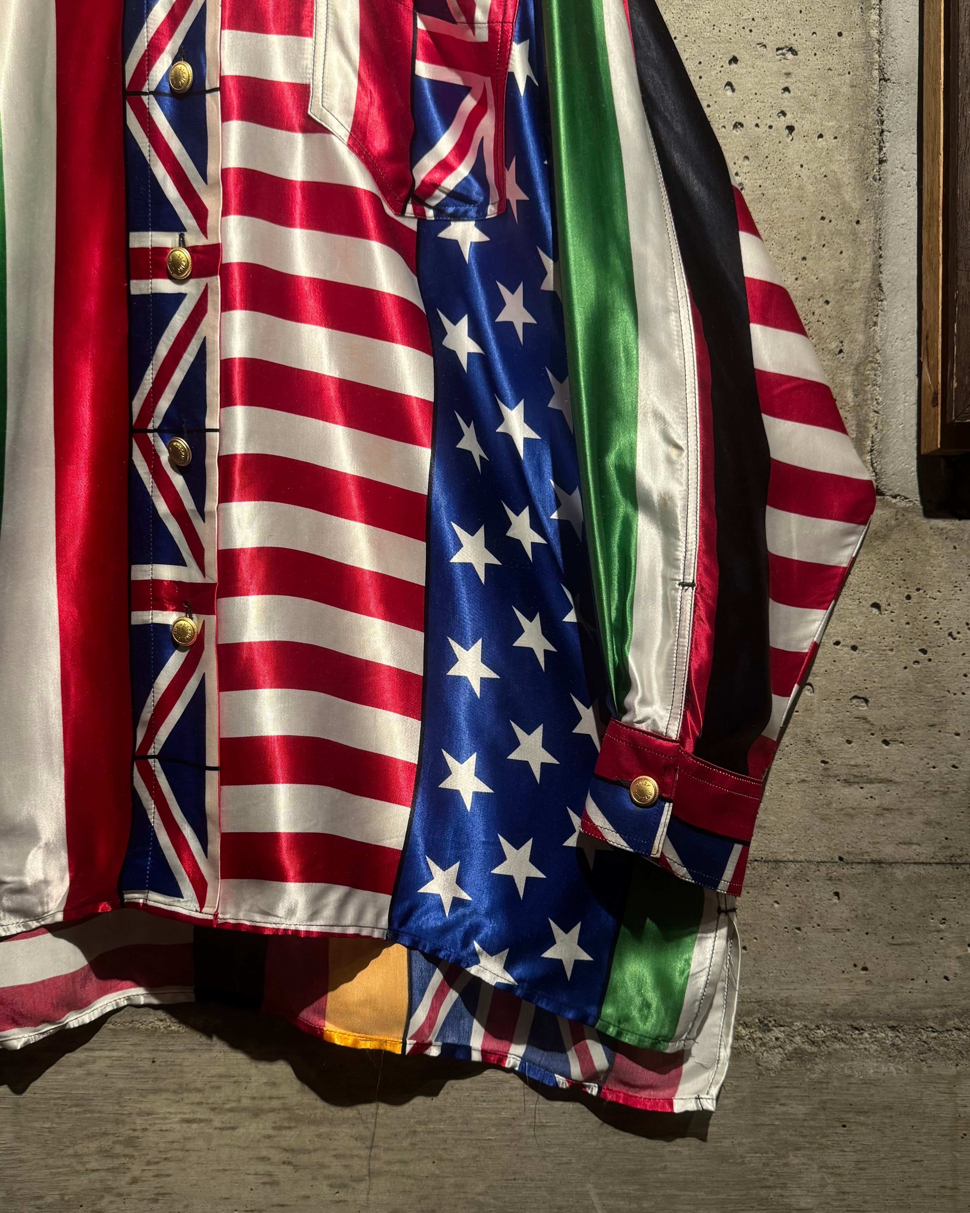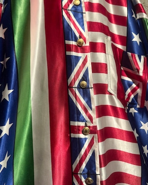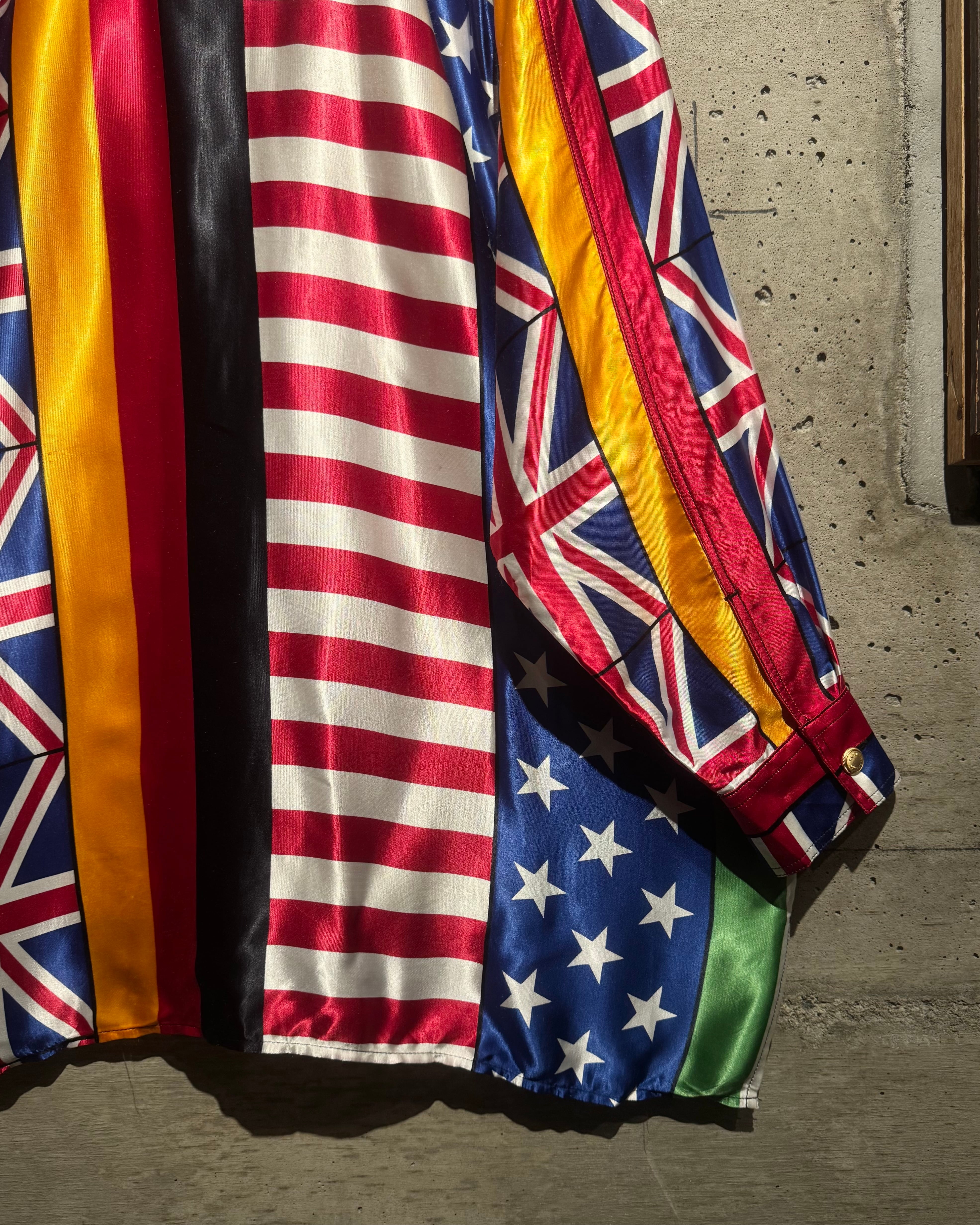 アメリカ、イギリス、ドイツ、イタリアなどの国々の国旗をストライプ状に落とし込んだサテンシャツ。