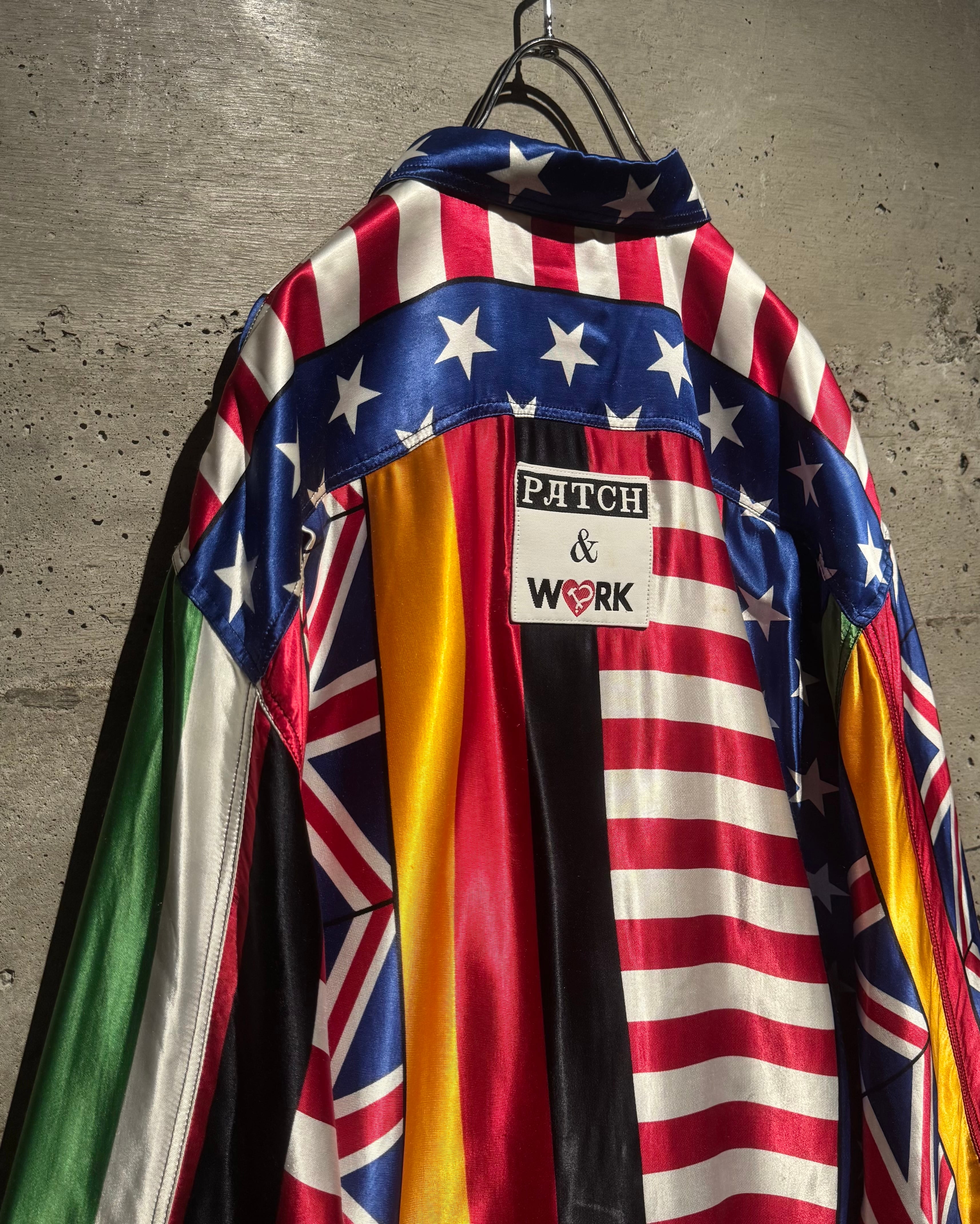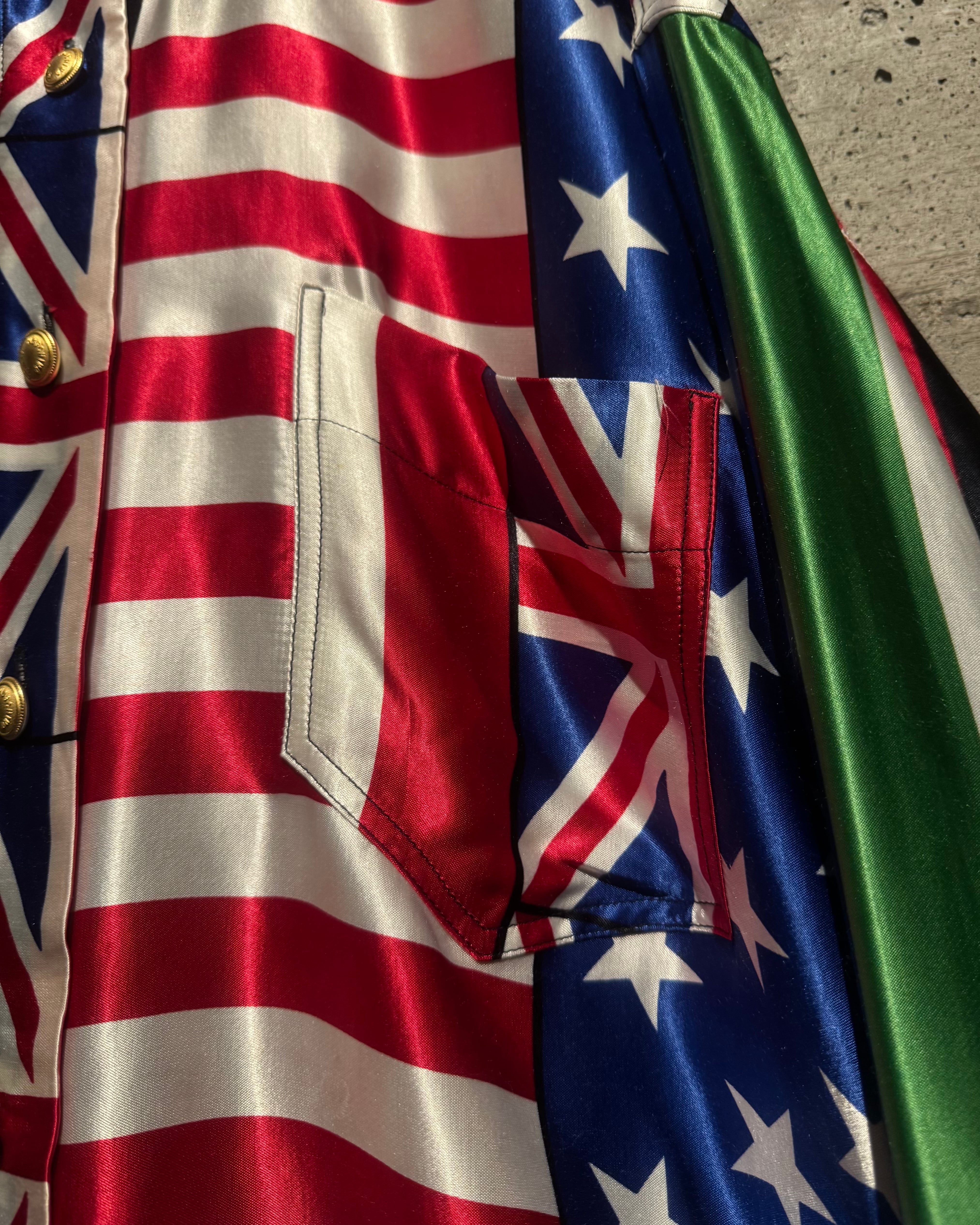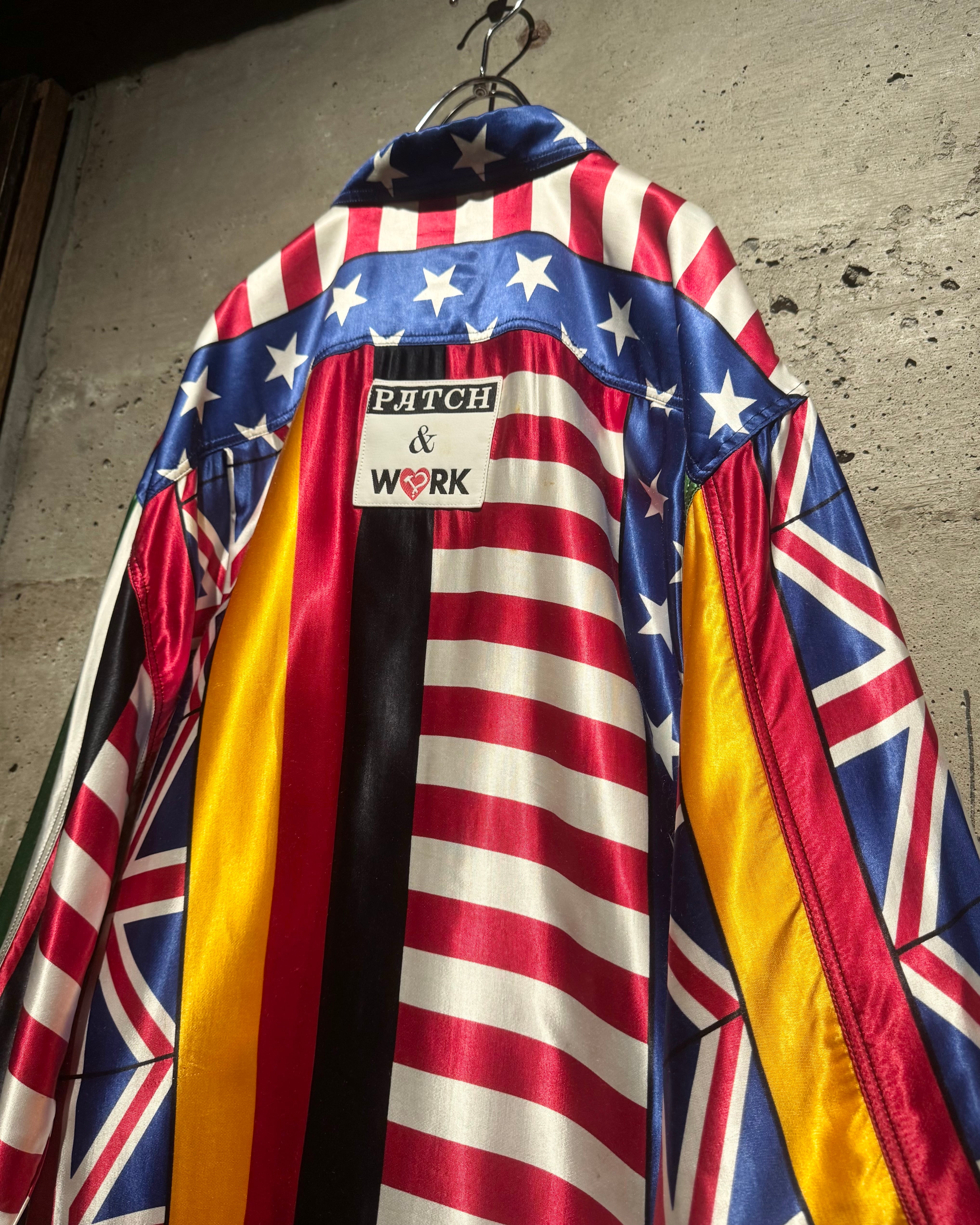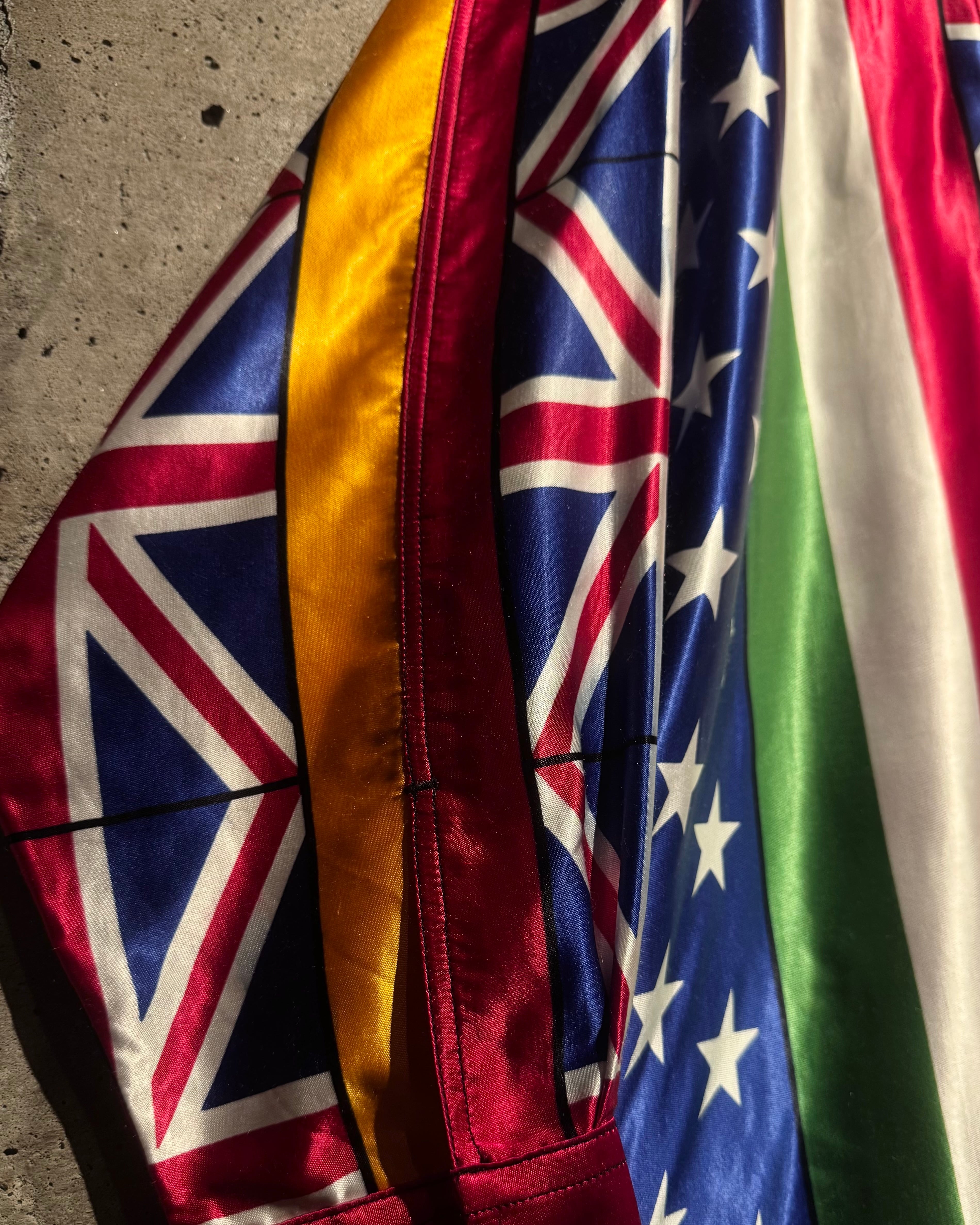 アメリカ、イギリス、ドイツ、イタリアなどの国々の国旗をストライプ状に落とし込んだサテンシャツ。