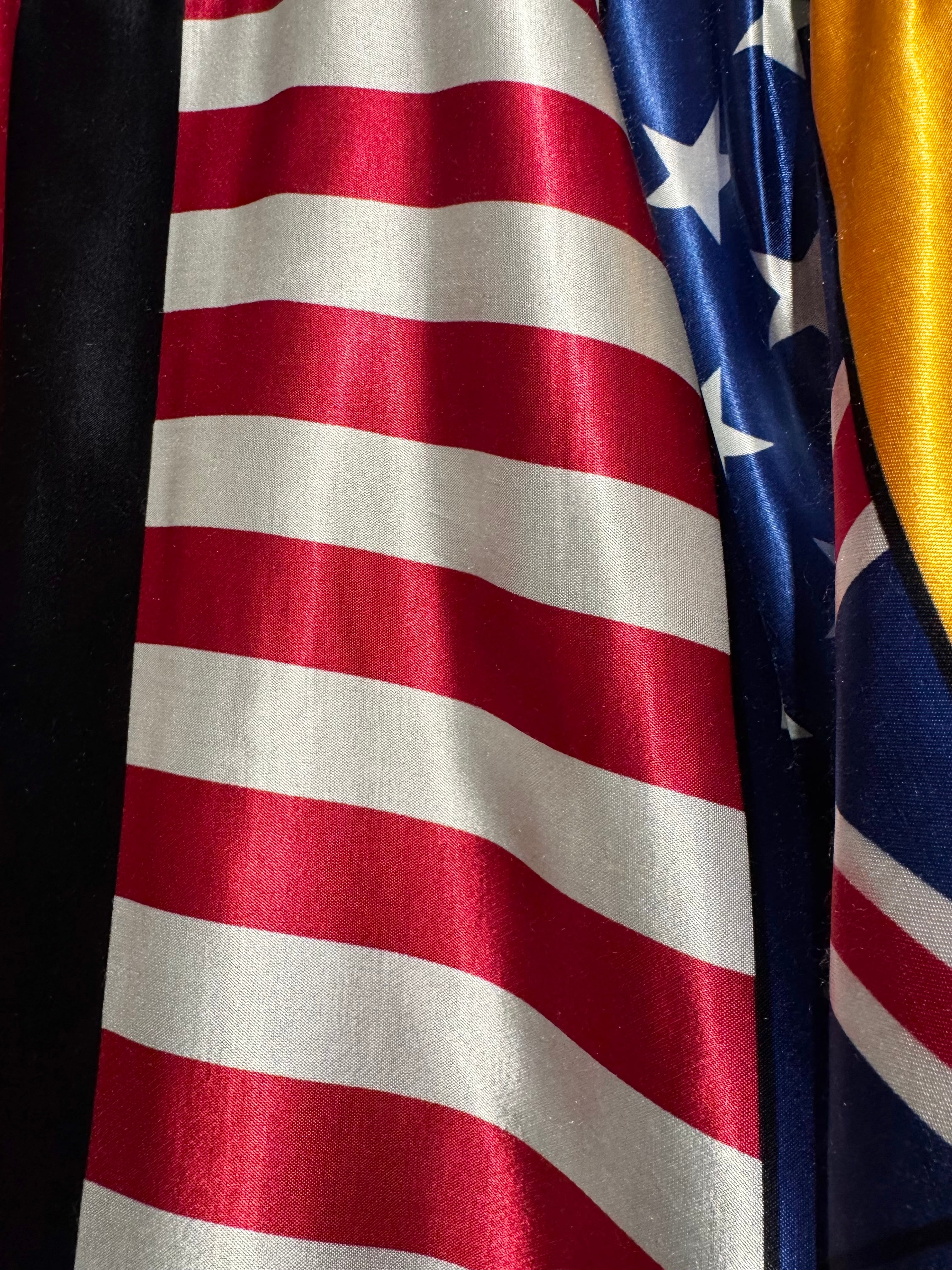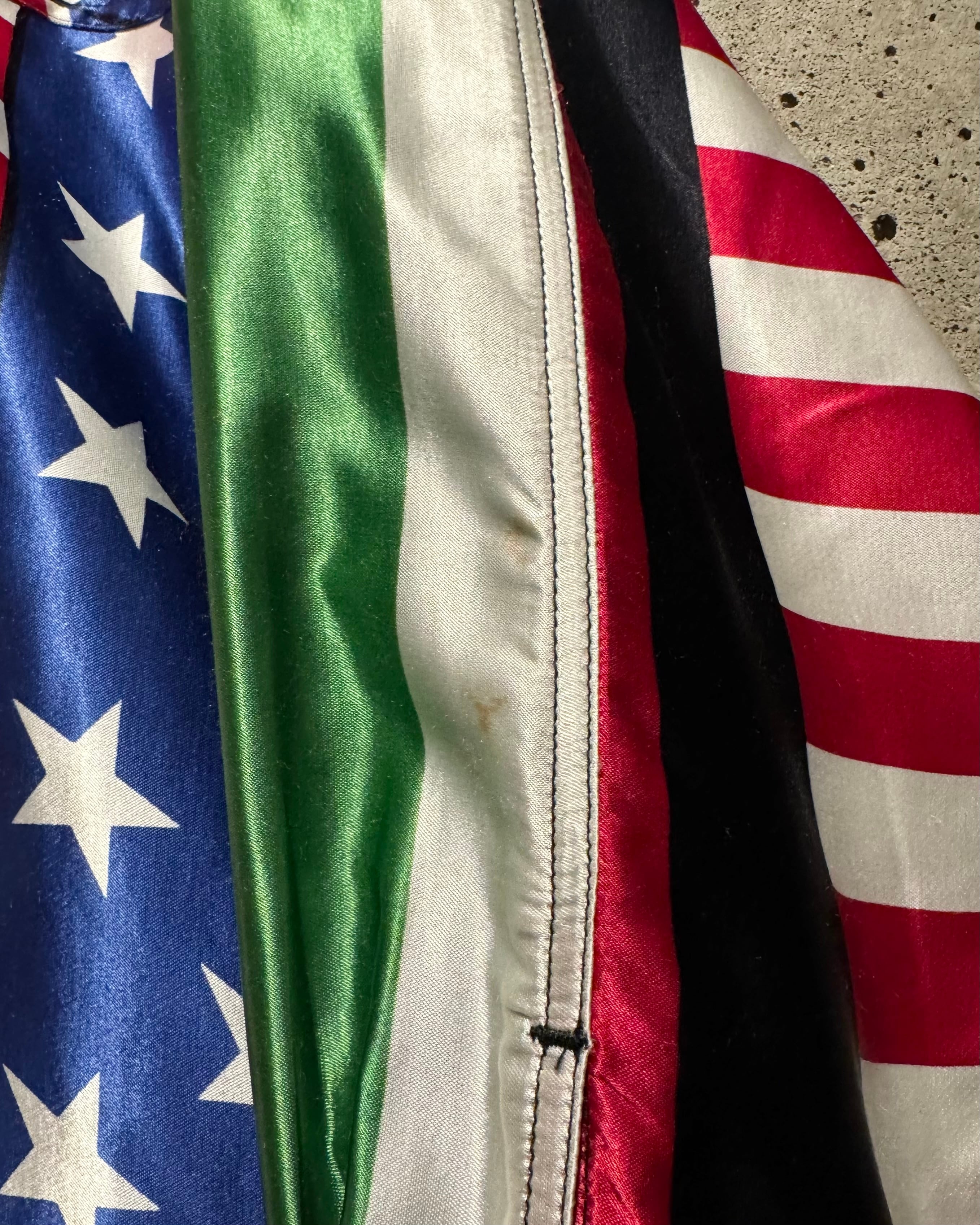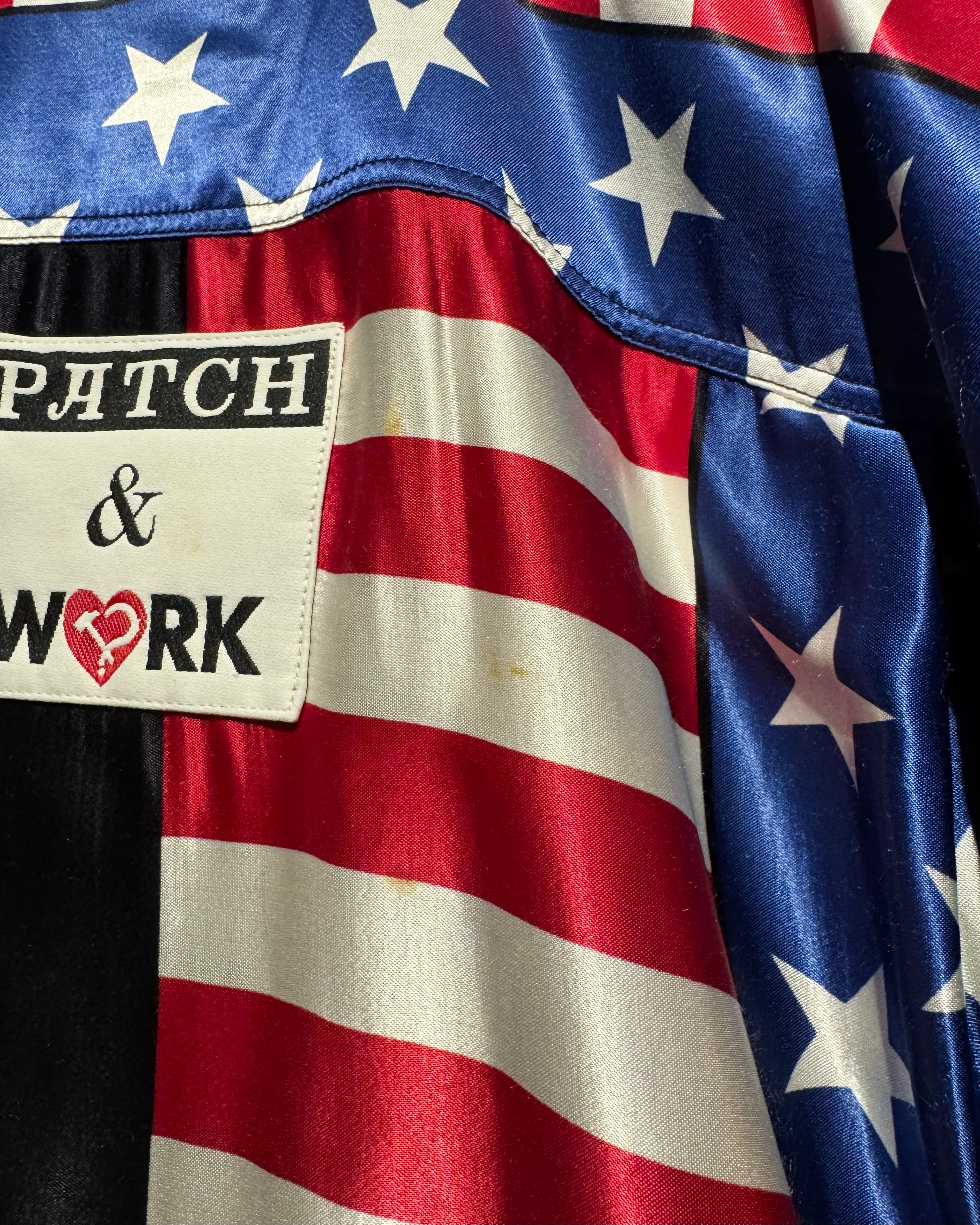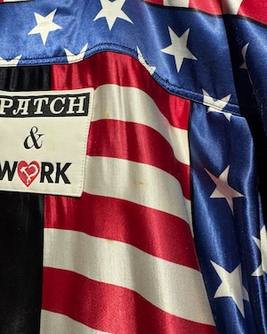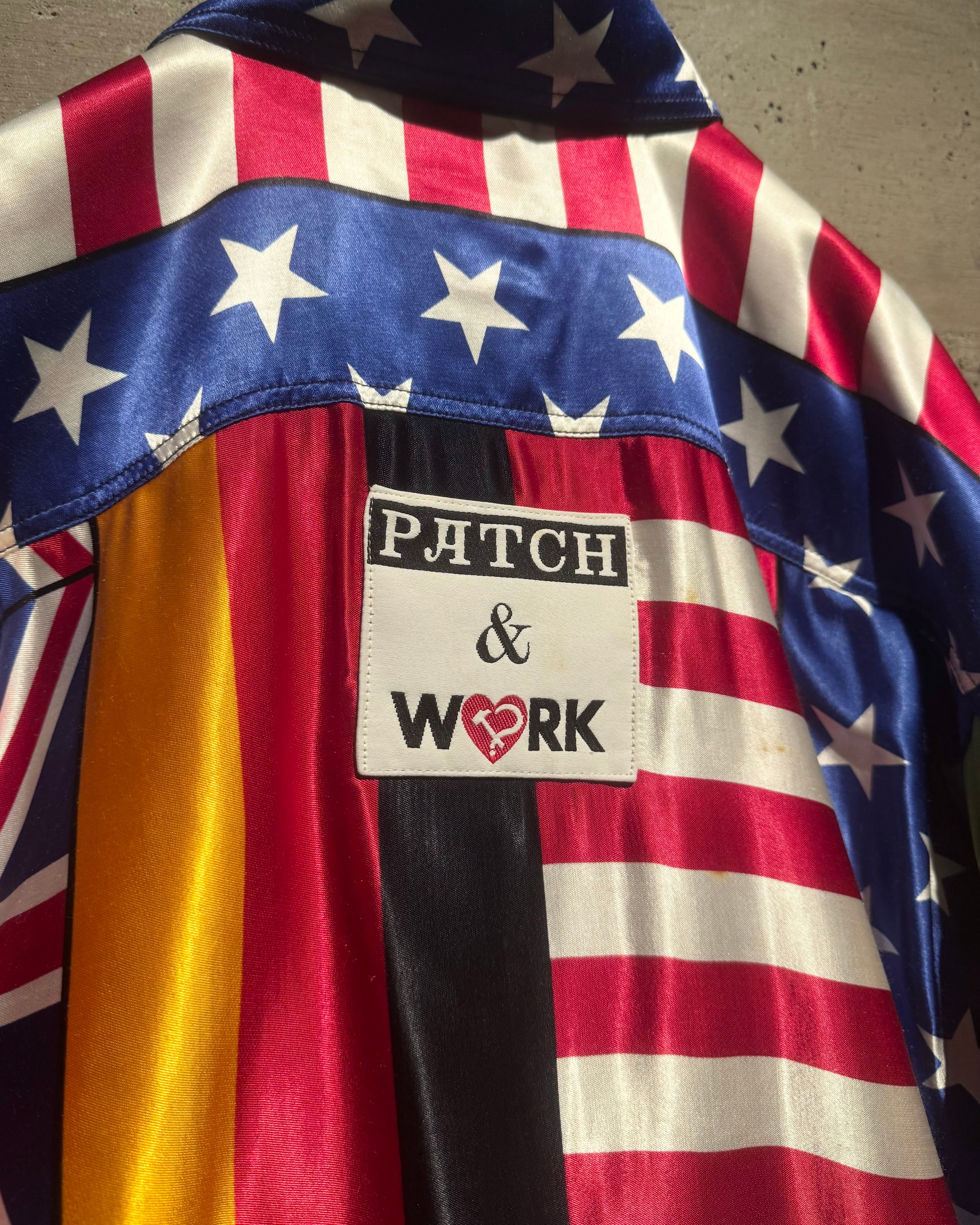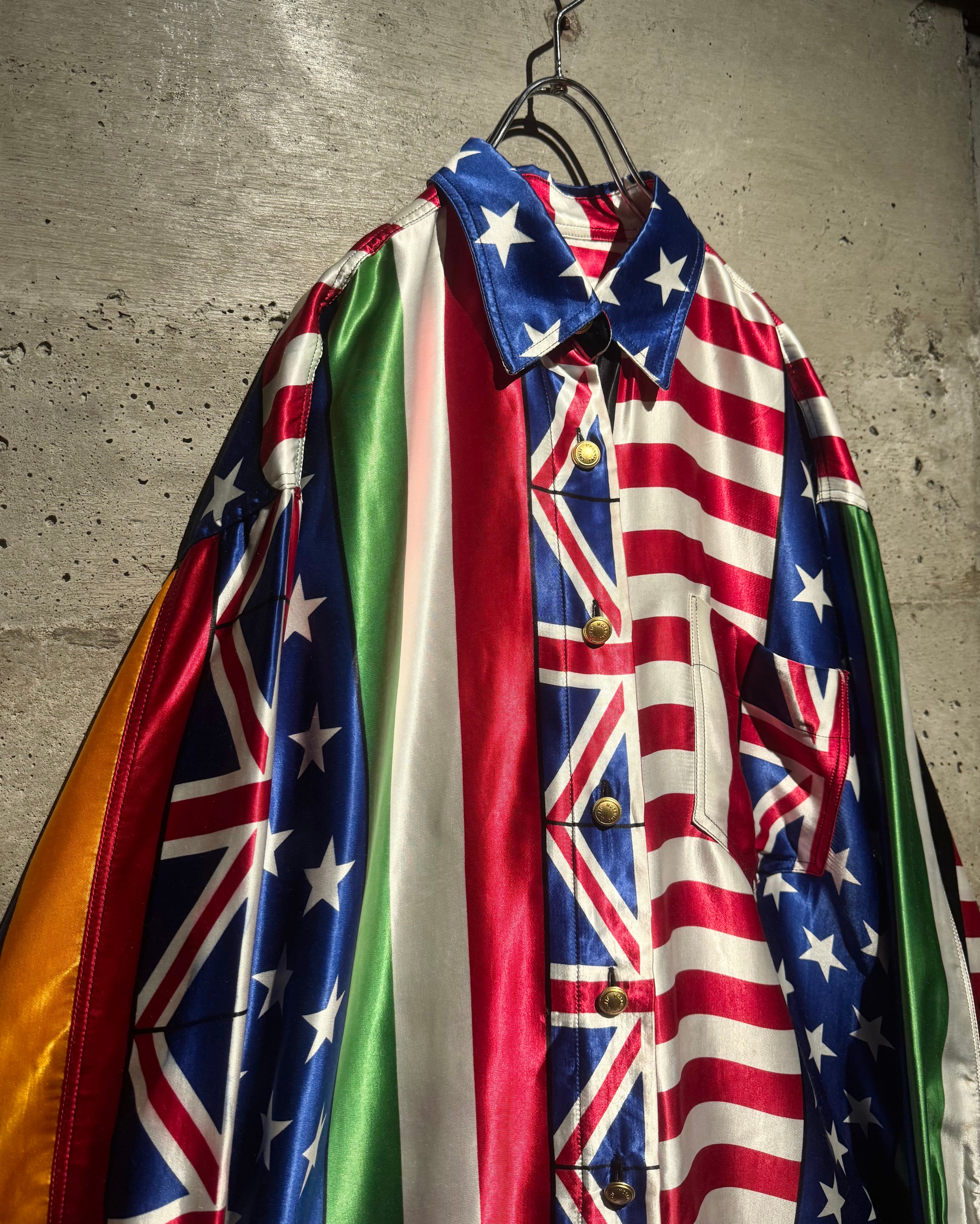 アメリカ、イギリス、ドイツ、イタリアなどの国々の国旗をストライプ状に落とし込んだサテンシャツ。