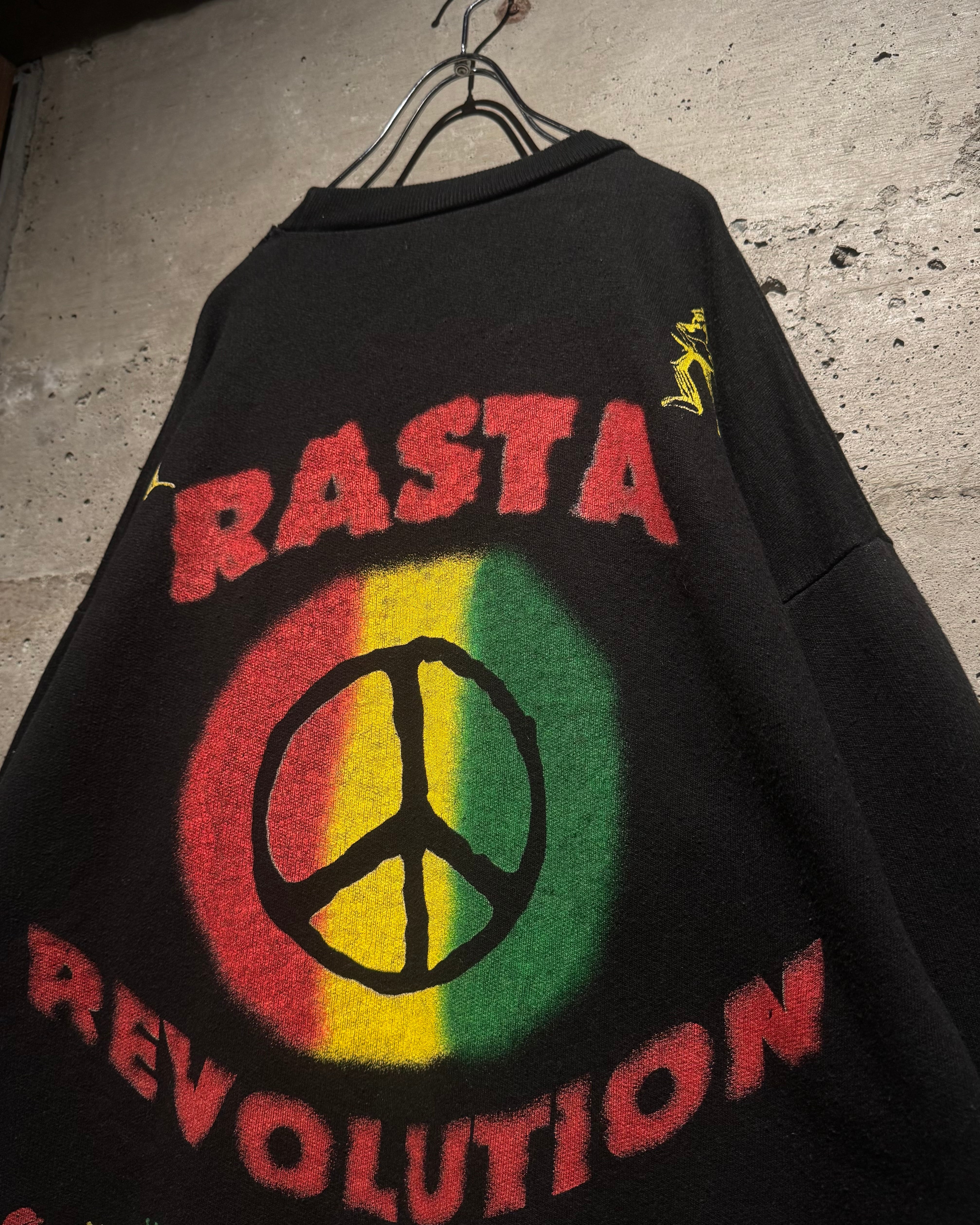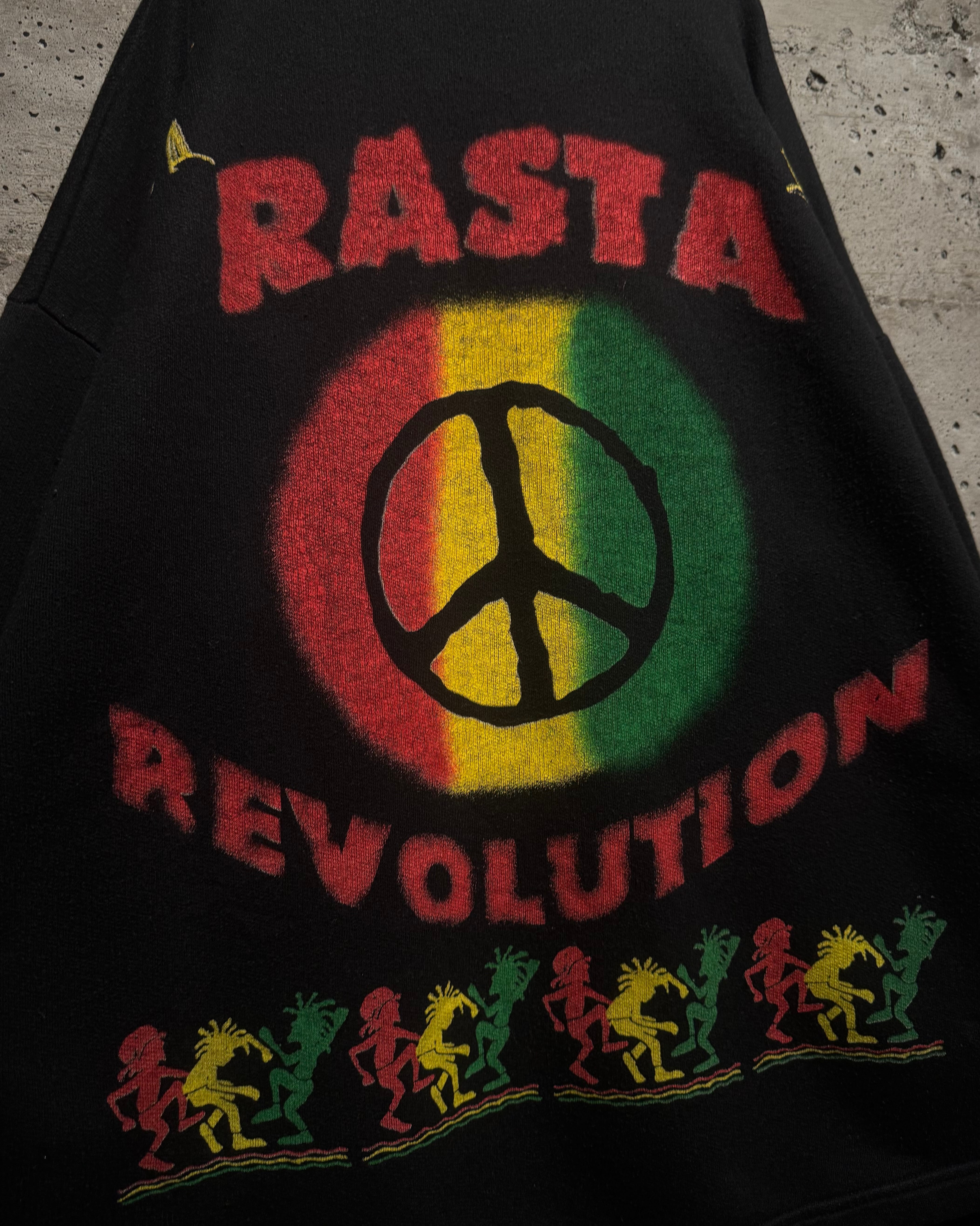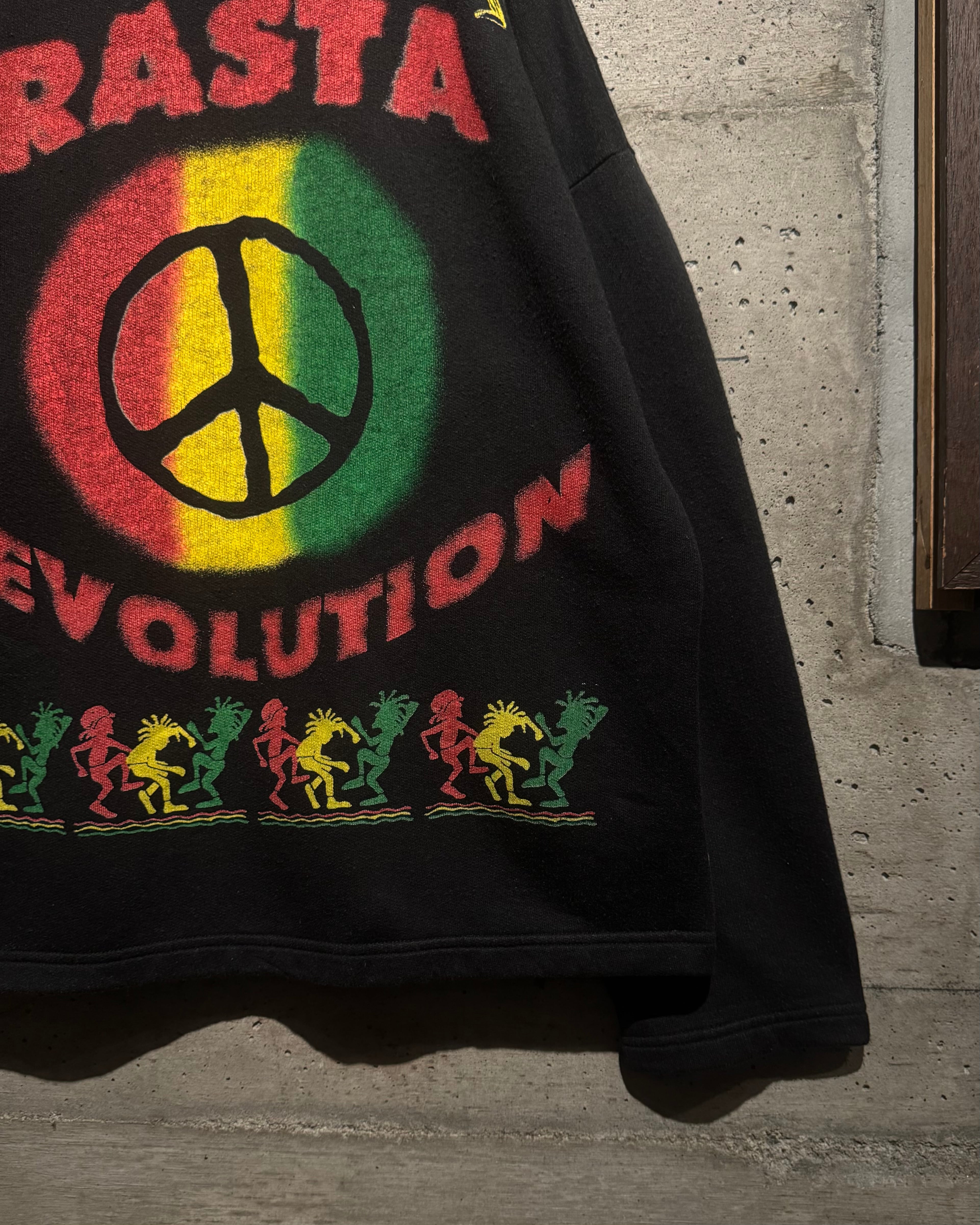 背面にはピースマークを中心に据え、フロント同様“RASTA REVOLUTION”のレタリングをオン。下部にはダンスするシルエットが並び、音楽・思想・カルチャーが一体となった世界観をしっかりと表現。前後でしっかりとストーリーが繋がる、完成度の高いグラフィックワークが光ります。