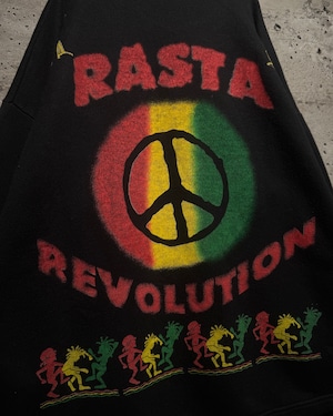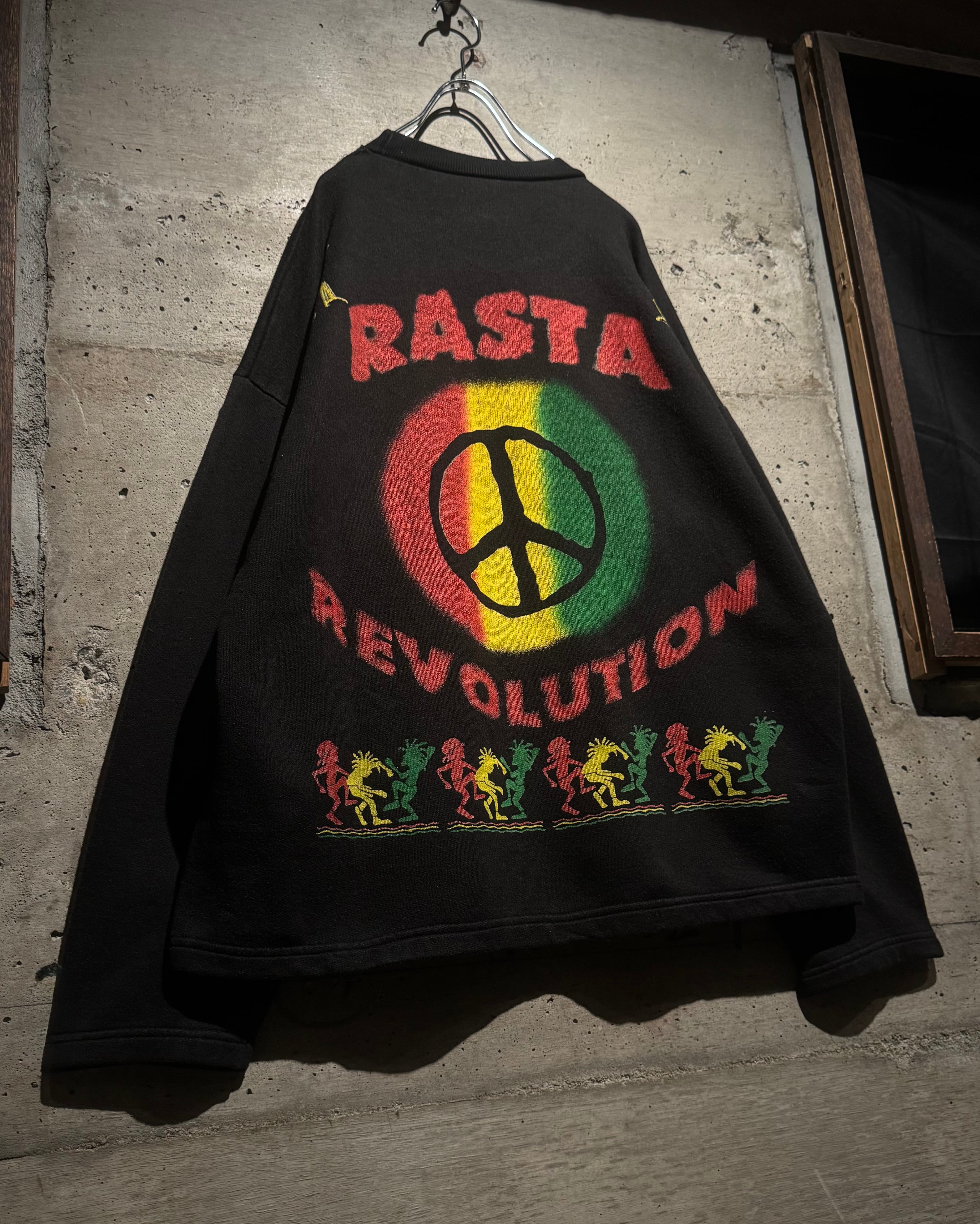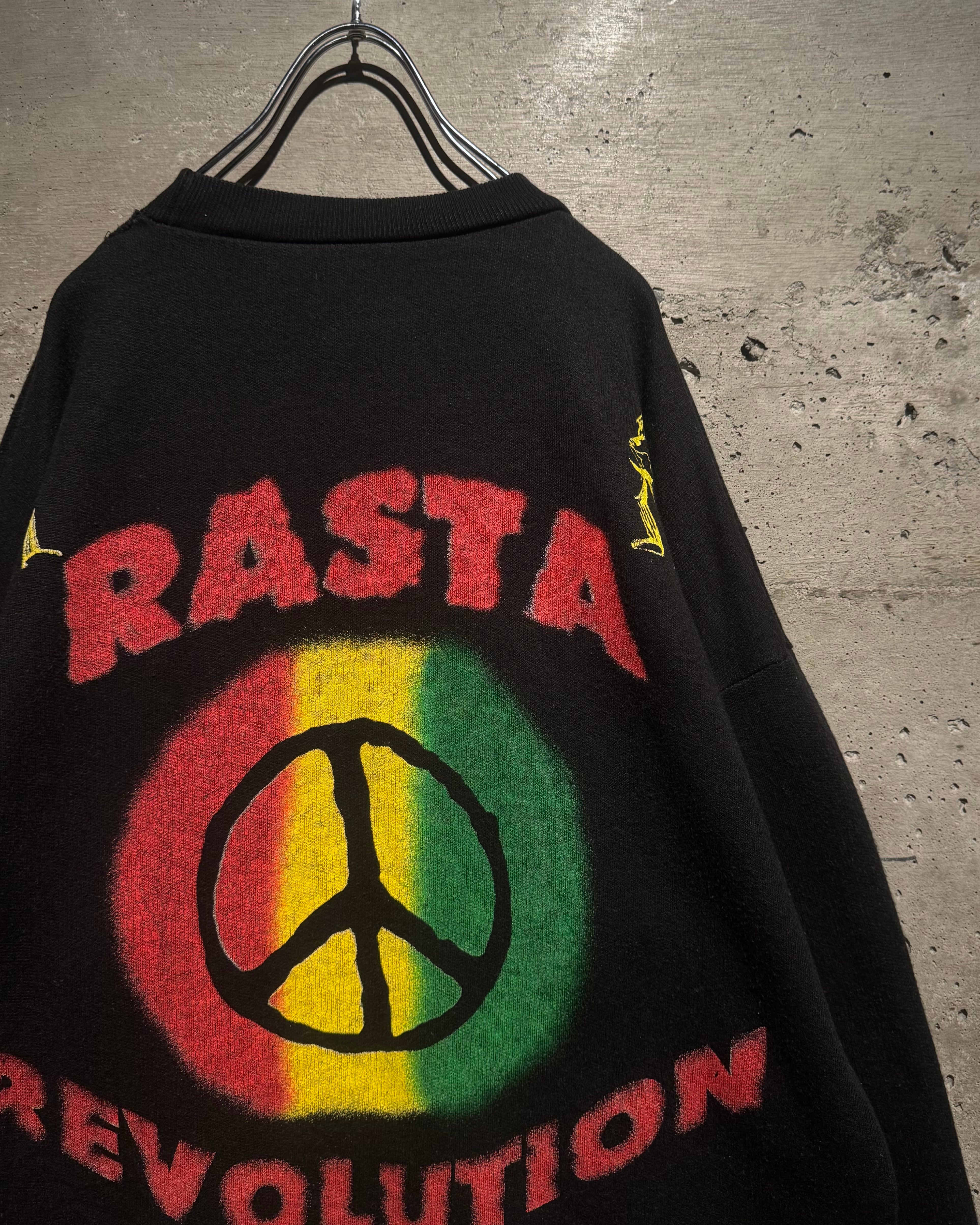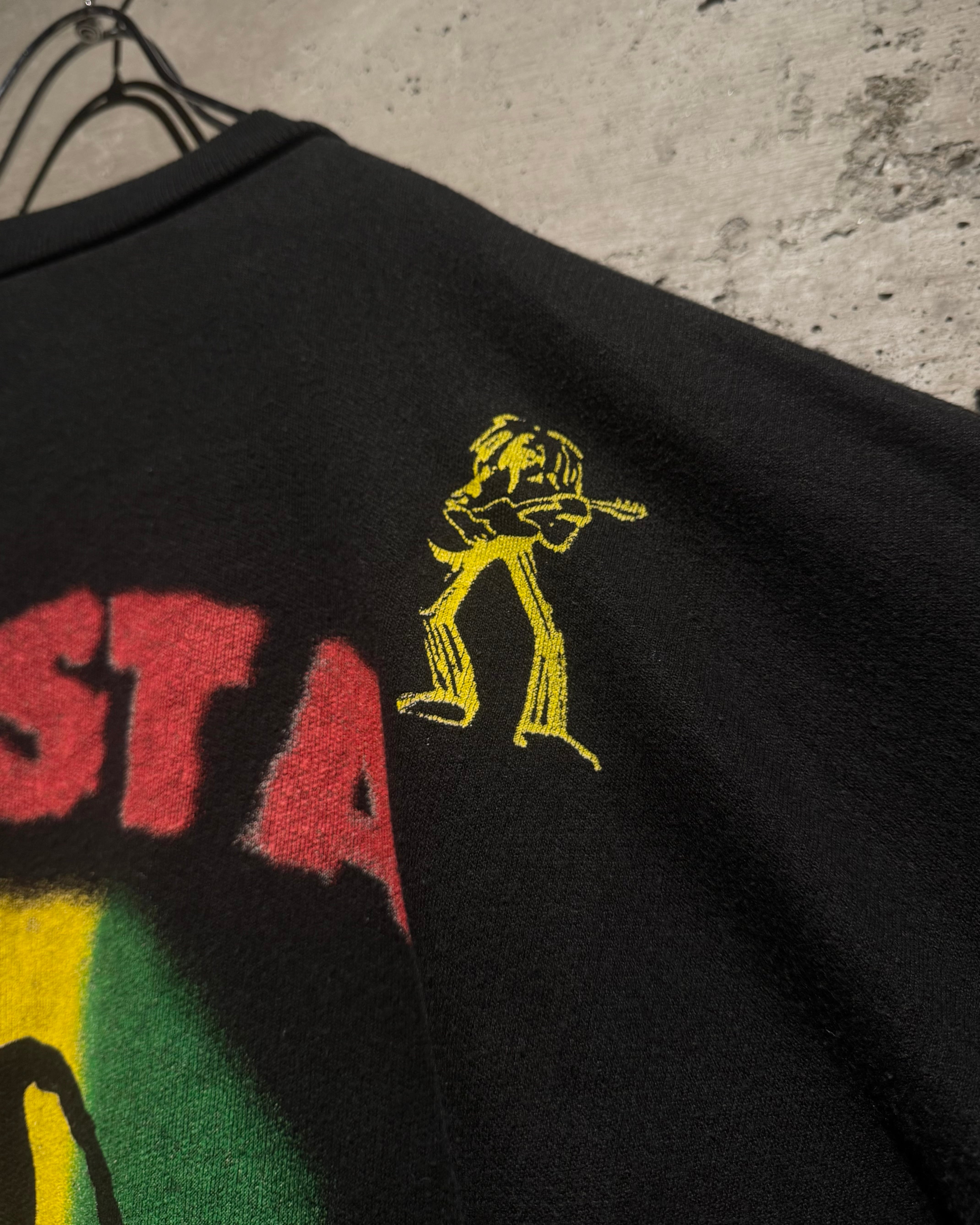 背面にはピースマークを中心に据え、フロント同様“RASTA REVOLUTION”のレタリングをオン。下部にはダンスするシルエットが並び、音楽・思想・カルチャーが一体となった世界観をしっかりと表現。前後でしっかりとストーリーが繋がる、完成度の高いグラフィックワークが光ります。