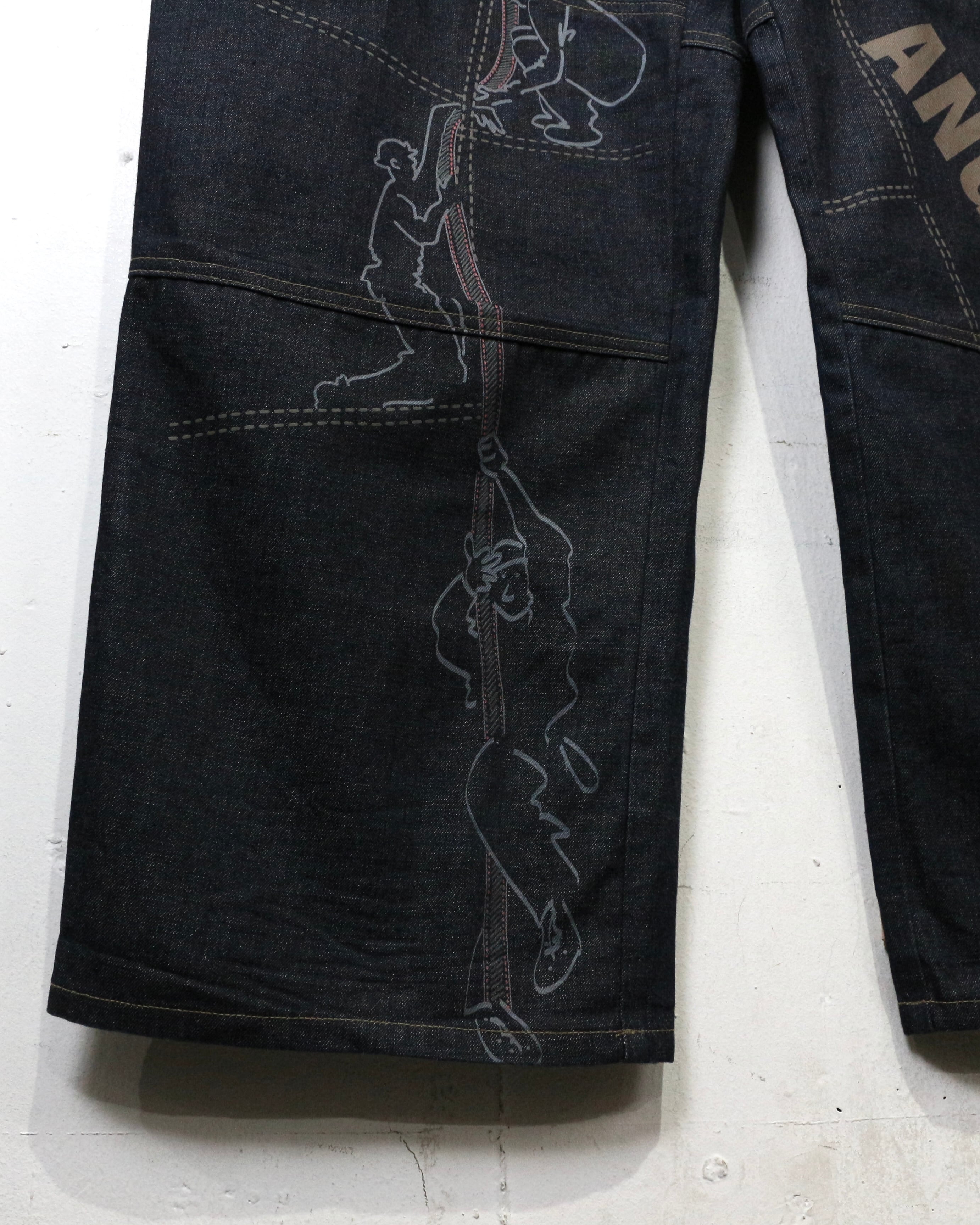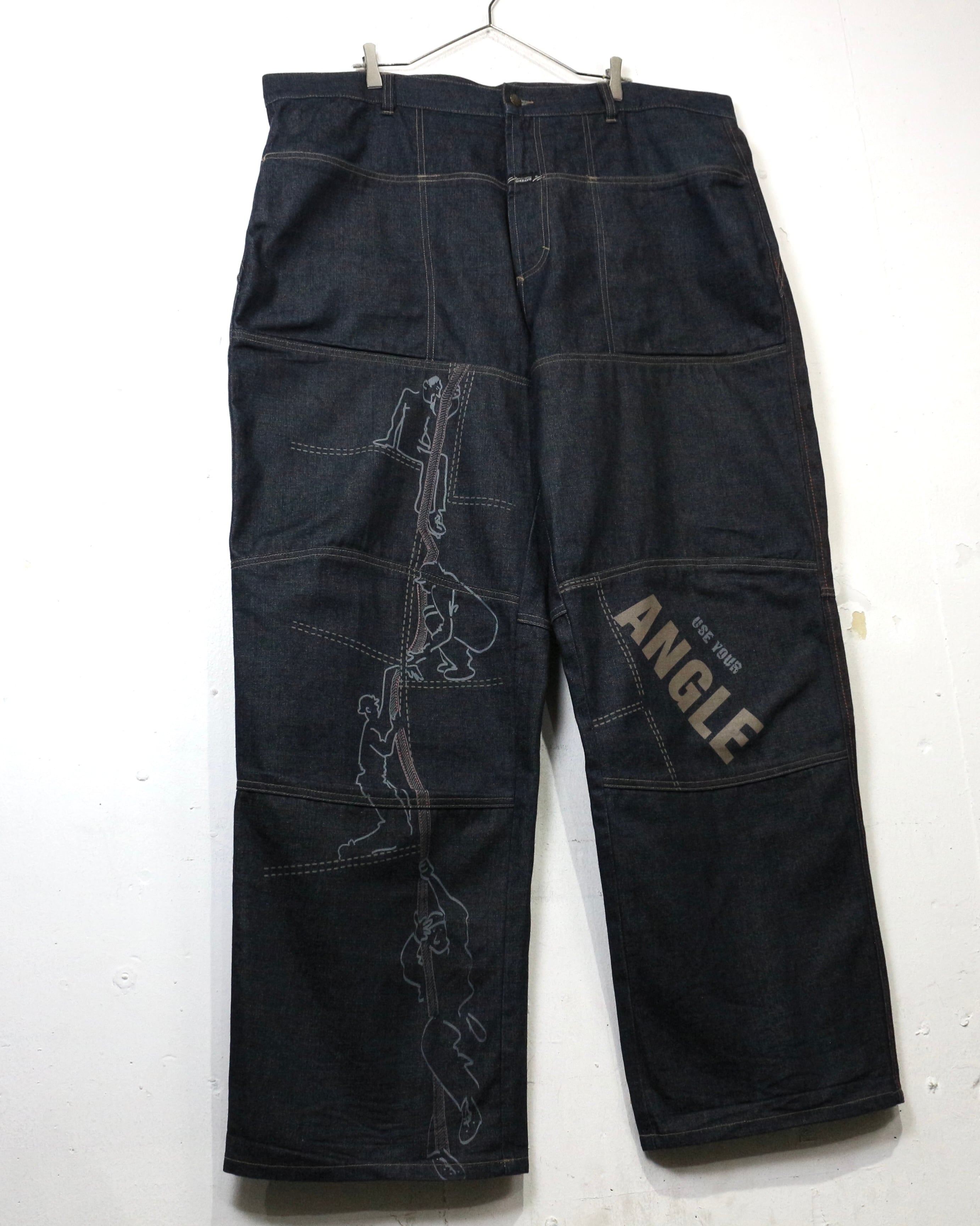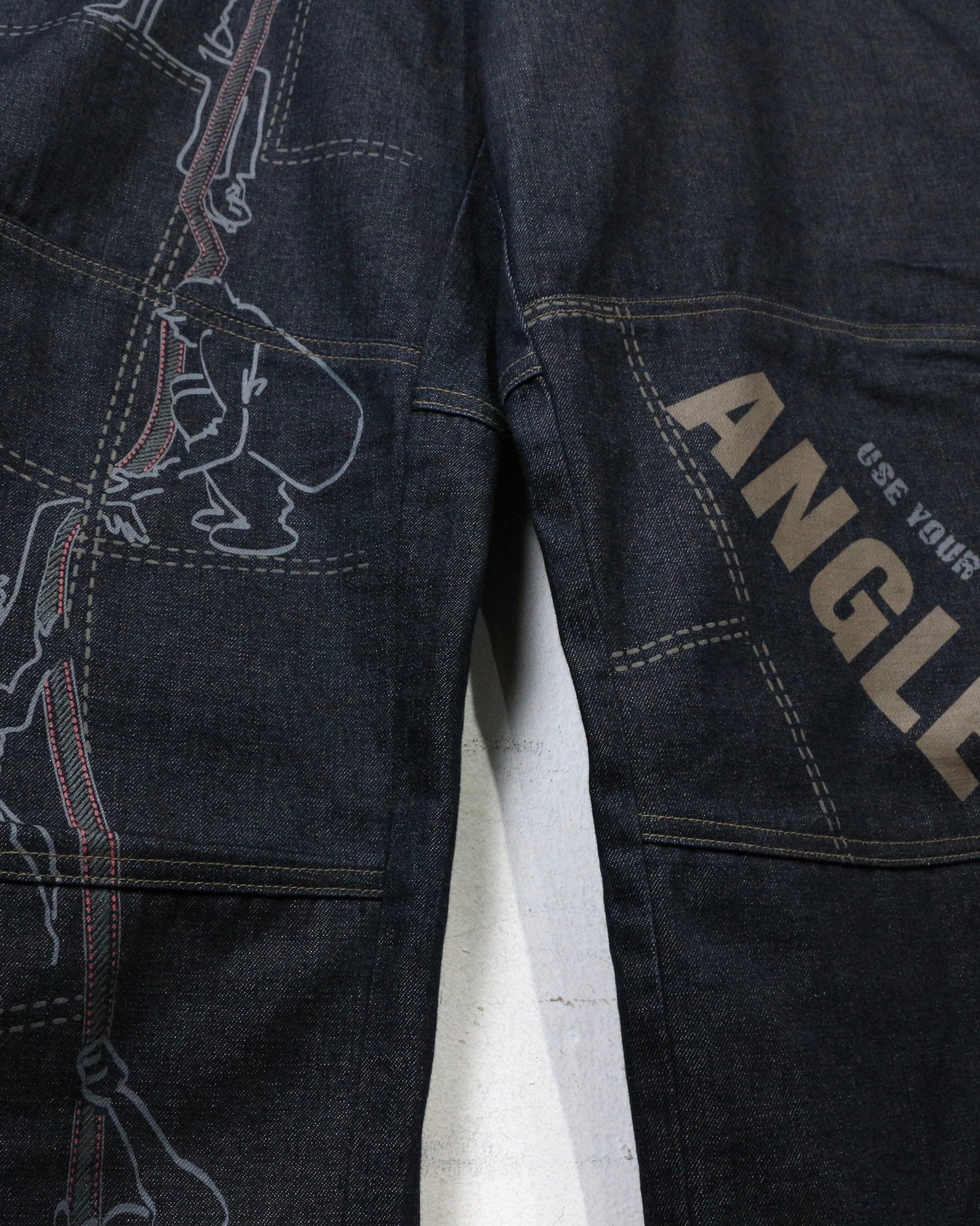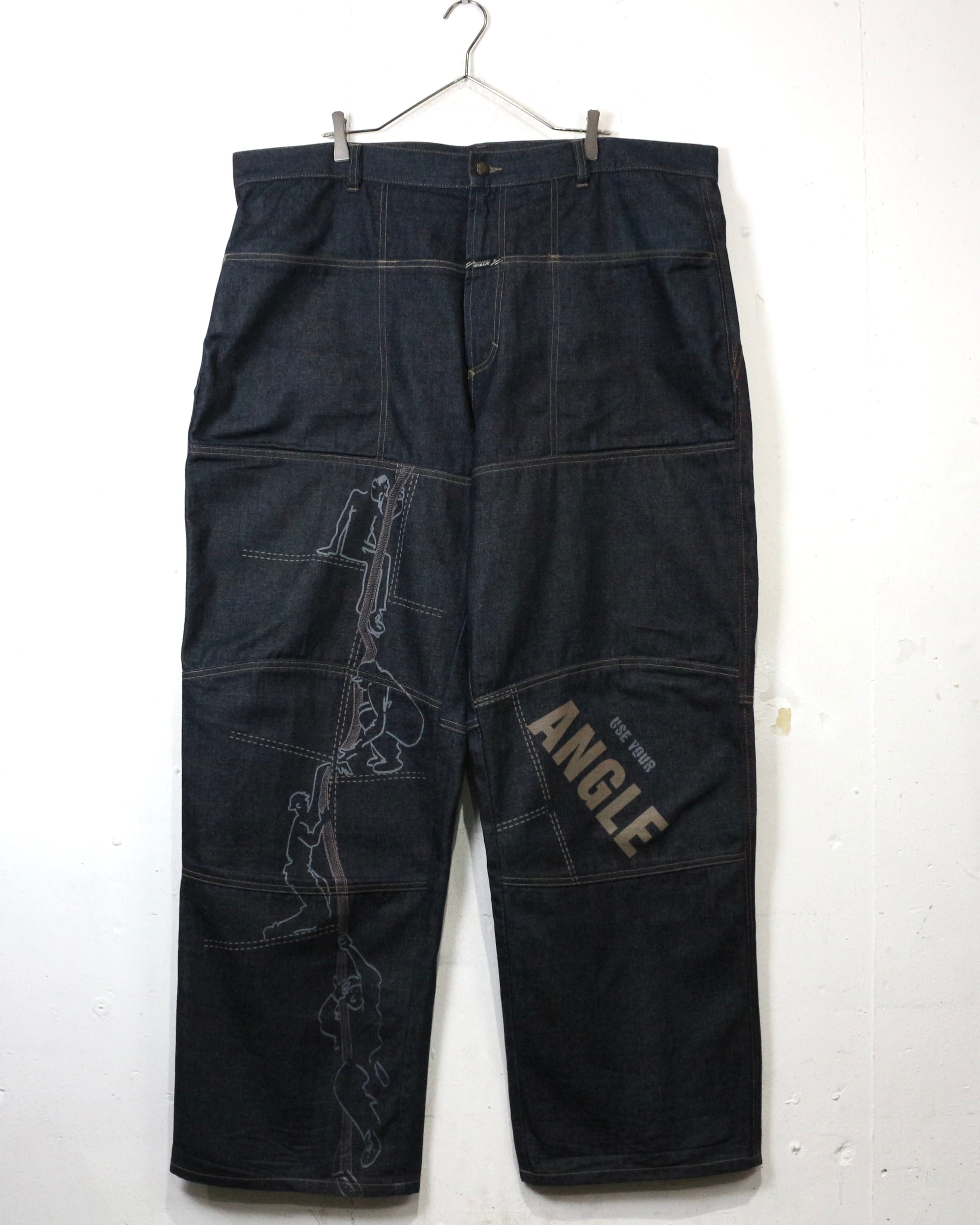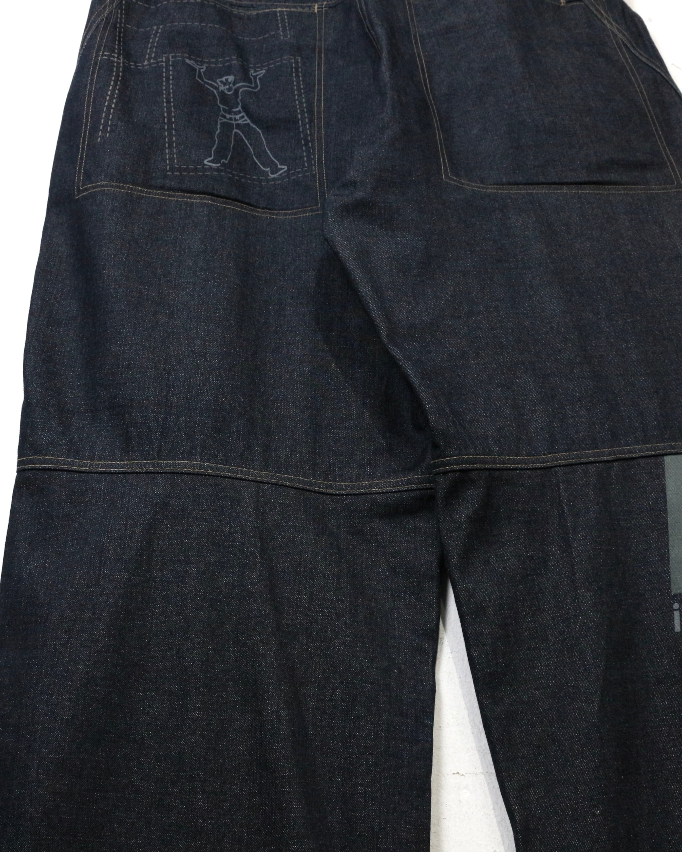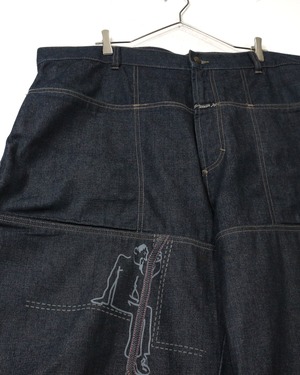 しっかりとしたオンスのデニムをベースに、パネル状に切り替えられた独特の構造美が際立つ一本。計算された切り替えによって立体的なシルエットを生み出しています。