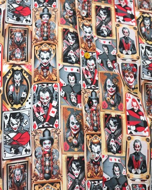 トランプカードを彷彿とさせるデザインの中に、「ダークナイト」や「ジョーカー」を想起させる複数のビジュアルをコラージュ。作品ごとに異なるジョーカーの表情やスタイルが一枚の中で合わさり、ストリートで抜群の雰囲気を放ってくれます。