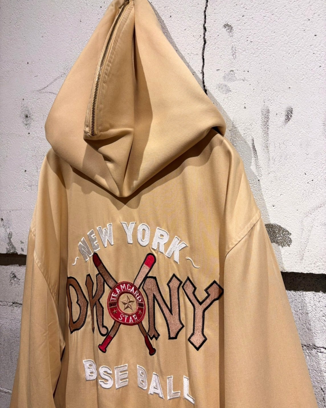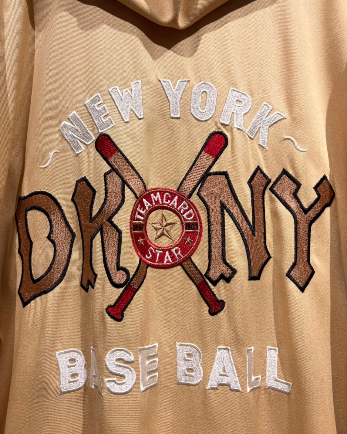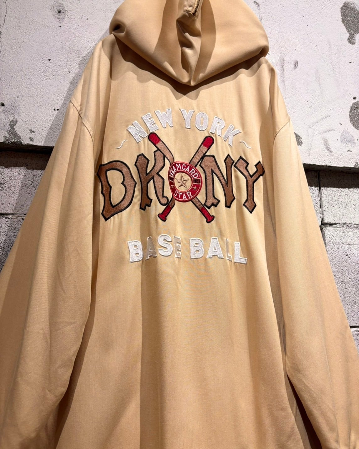 しなやかなボディに、背面にDKNYの名を組み込んだベースボールのチーム風のデザインを刺繍で刻んだジャケット。