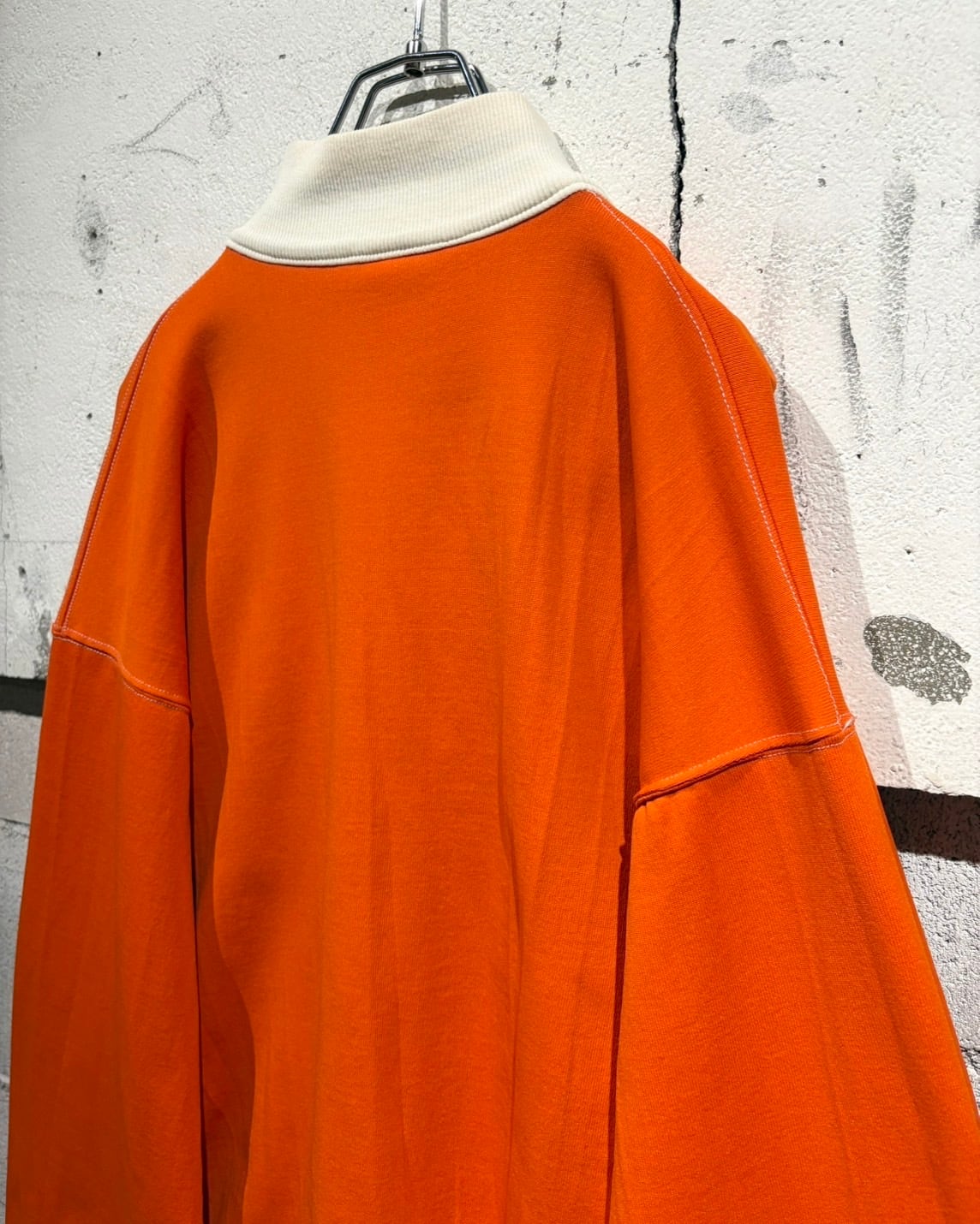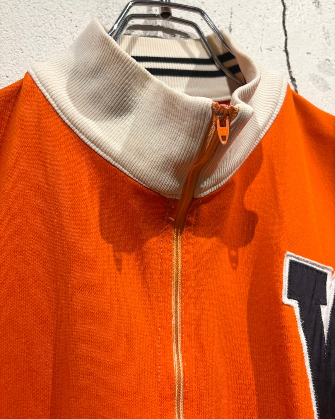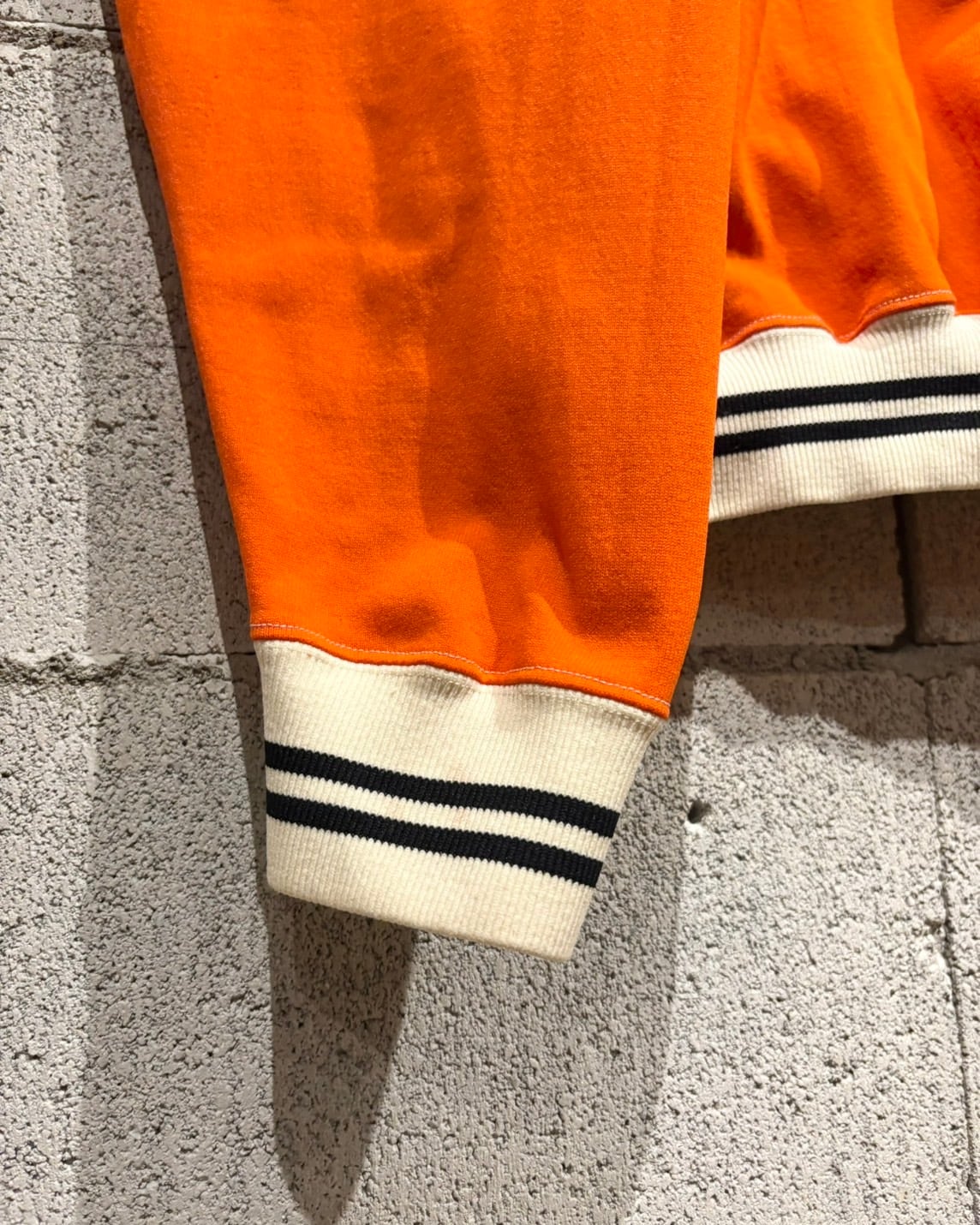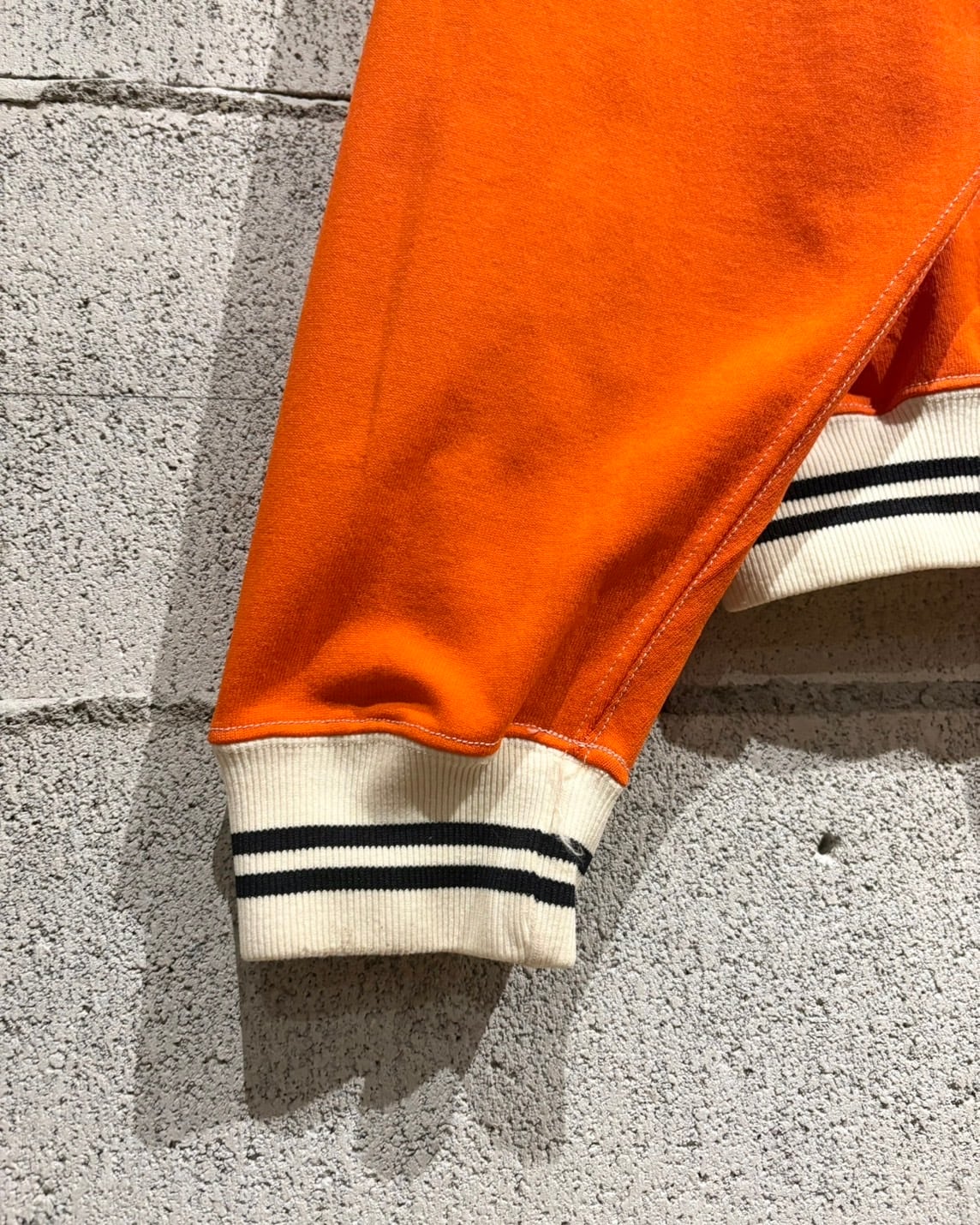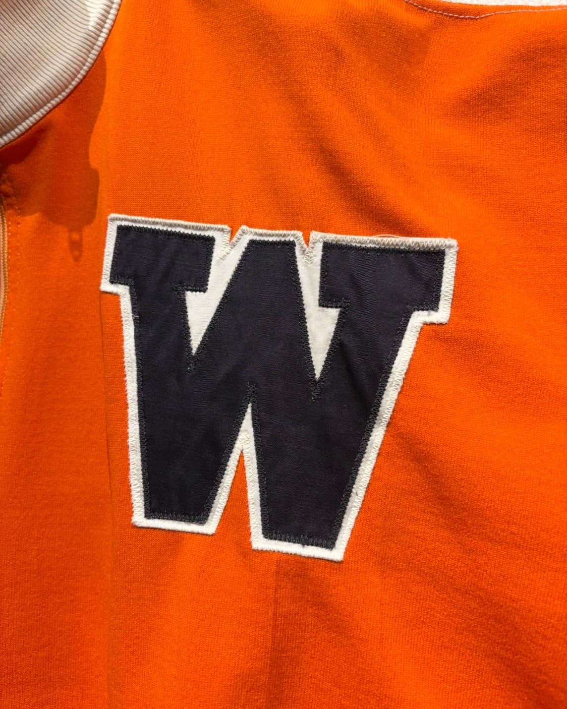 パキッとしたオレンジボディに、胸元には大胆に配された「W」のワッペン刺繍。シンプルながらも印象に残るアイコニックなデザインで、カレッジモノならではの雰囲気をしっかりと感じられます。
