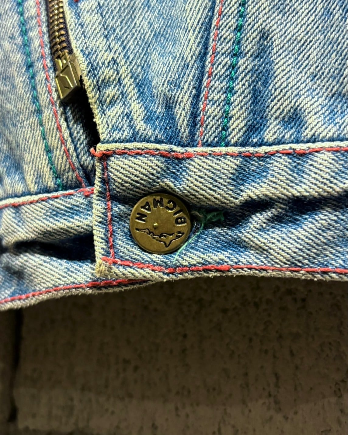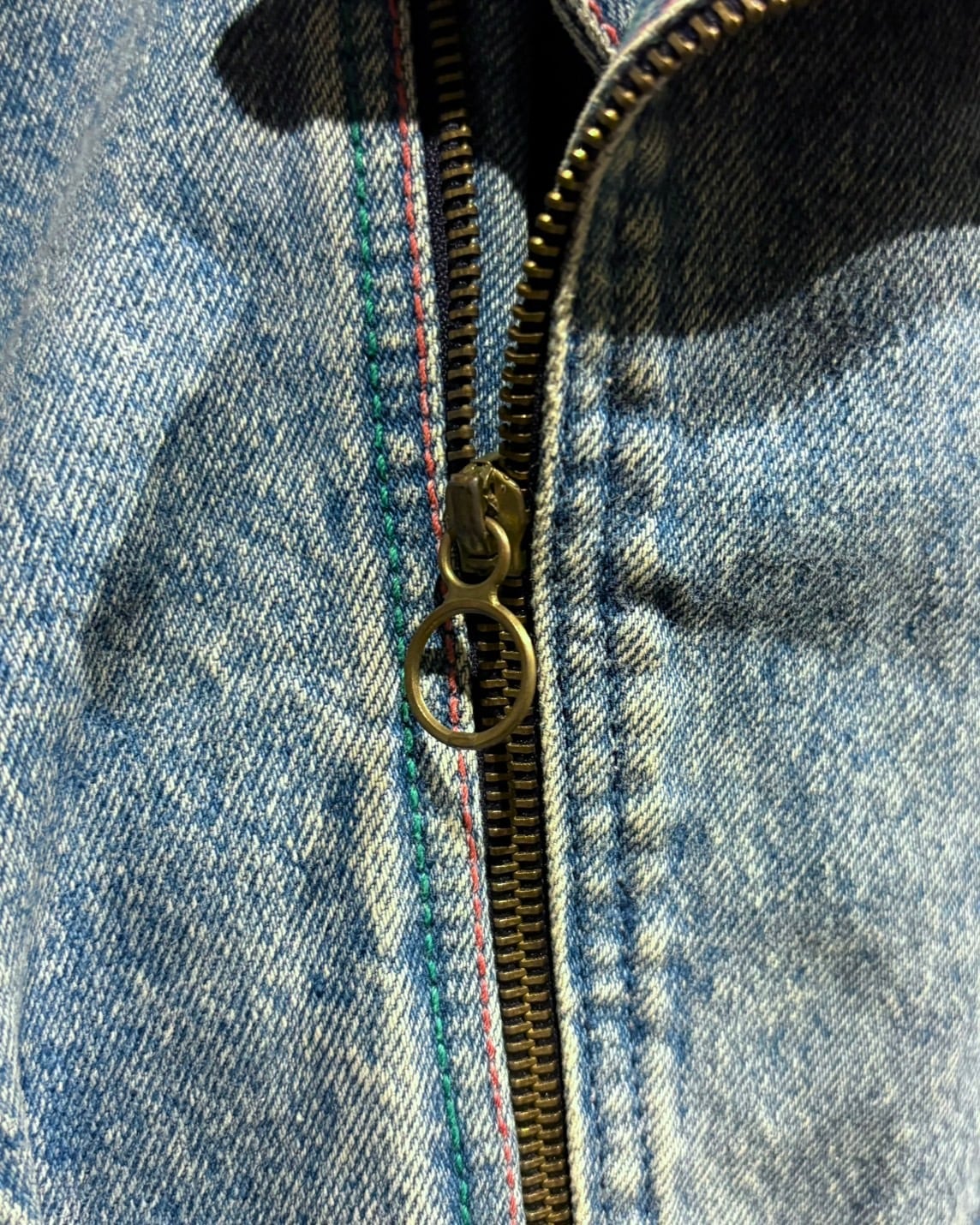 斜めに走るフロントジップやジップポケット、袖口のジップ、随所のピンクのステッチワークが無骨さを演出しつつ、デニム特有の柔らかさと相まってどこか軽やかな印象に。