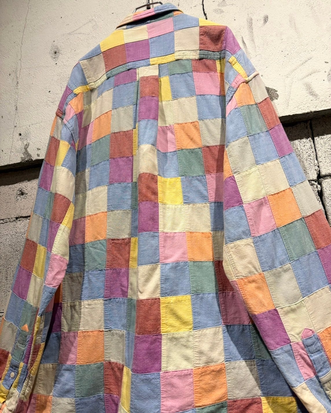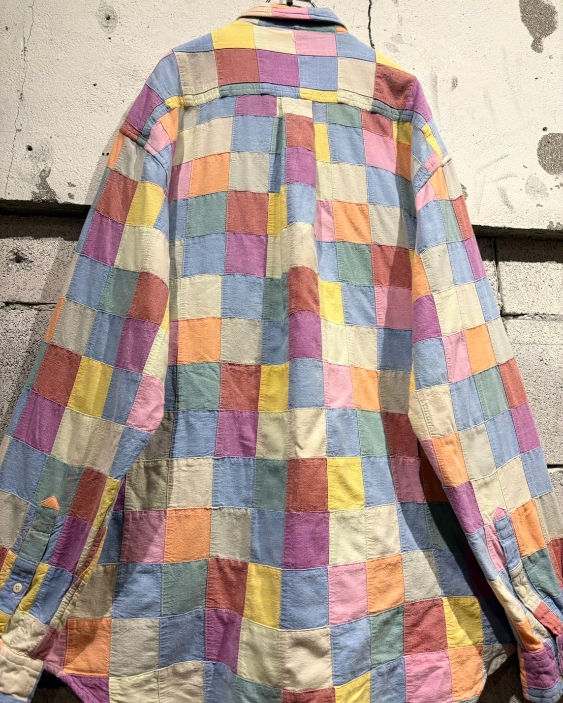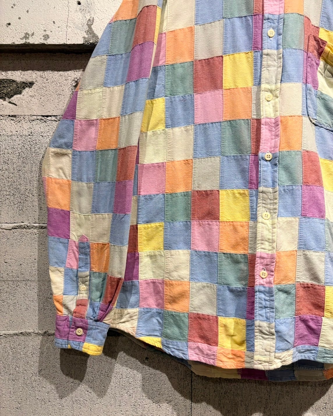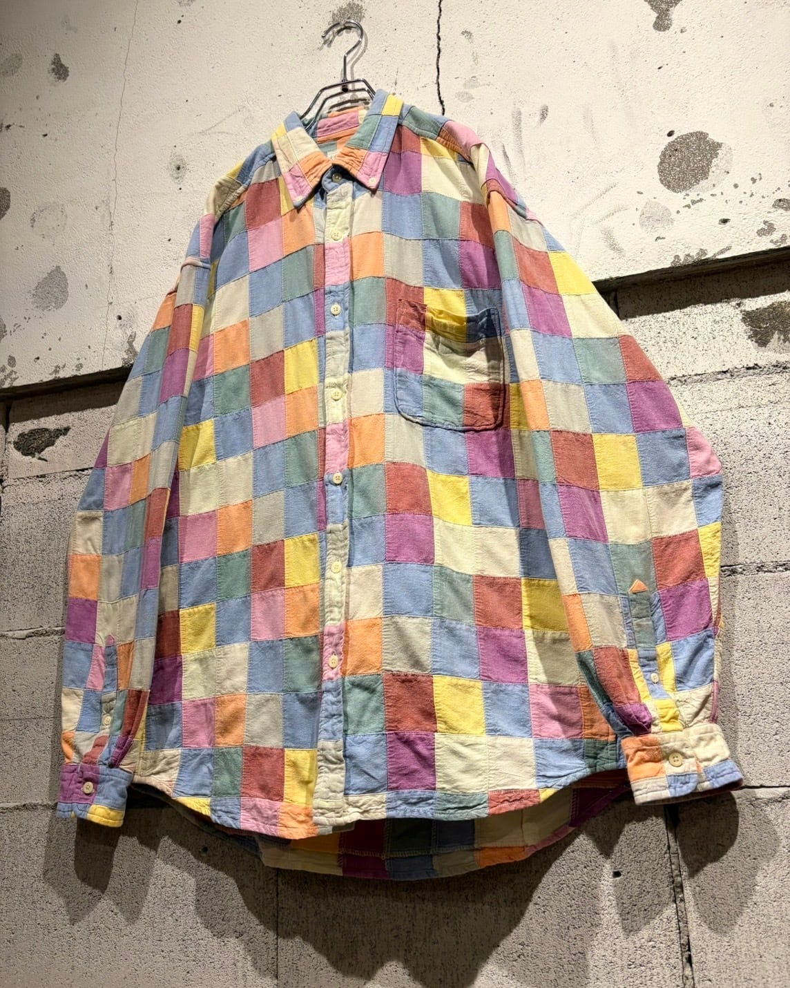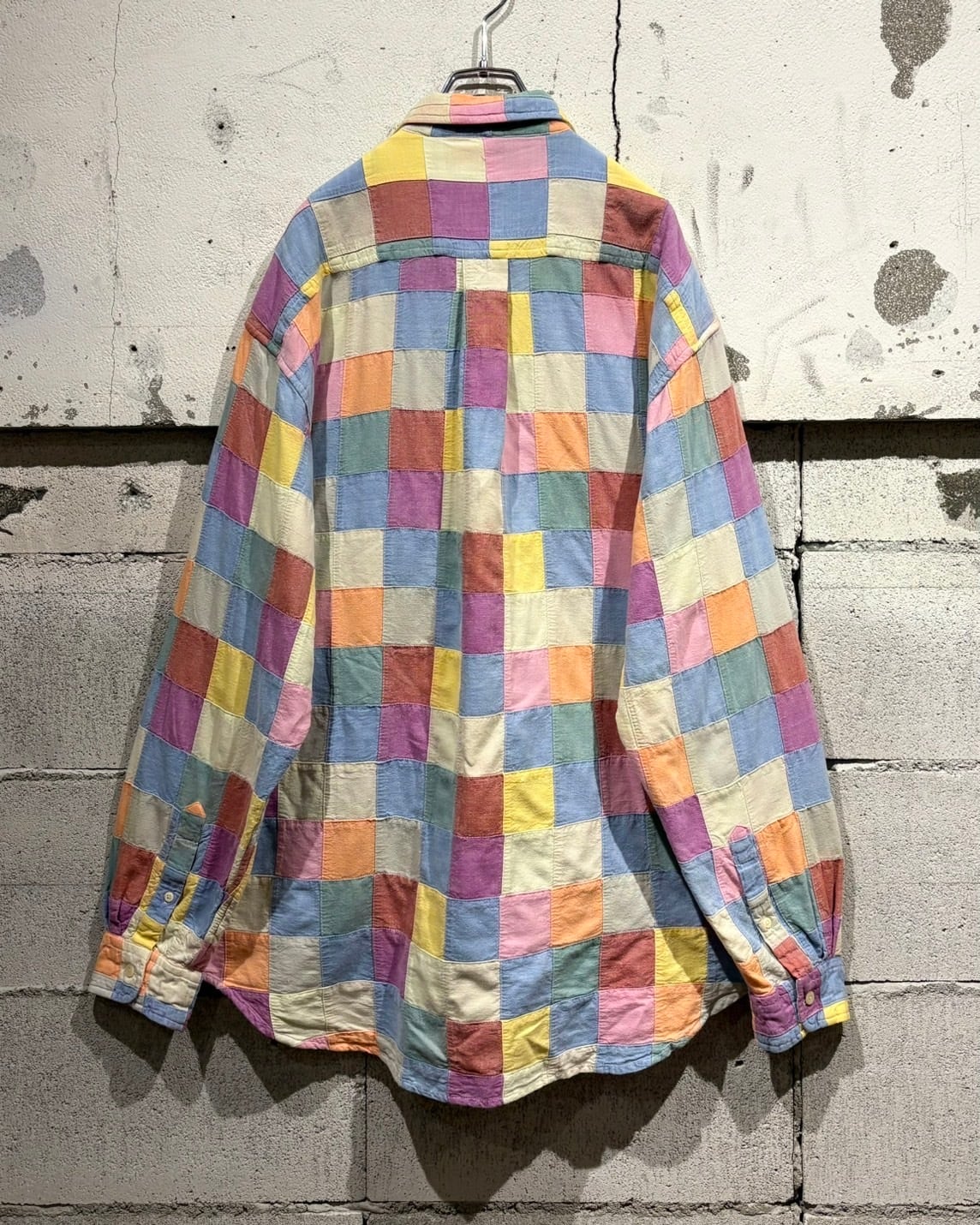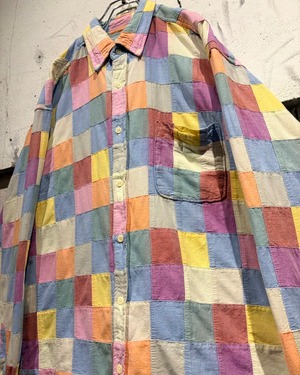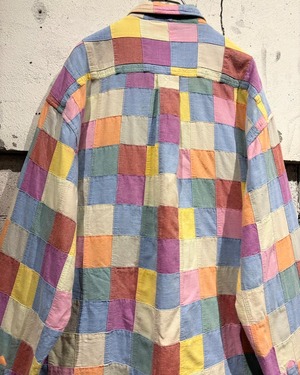 複数のカラーを繋ぎ合わせた、パッチワーク仕様の長袖シャツ。