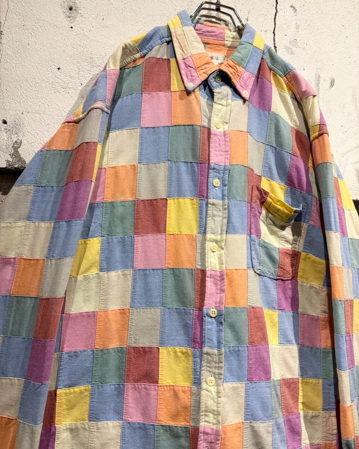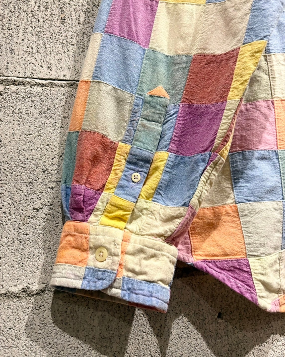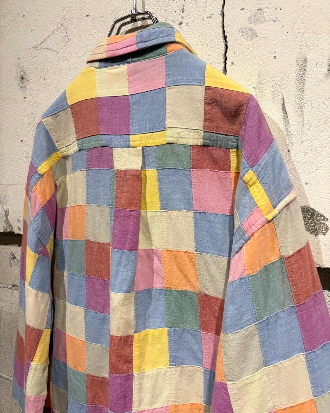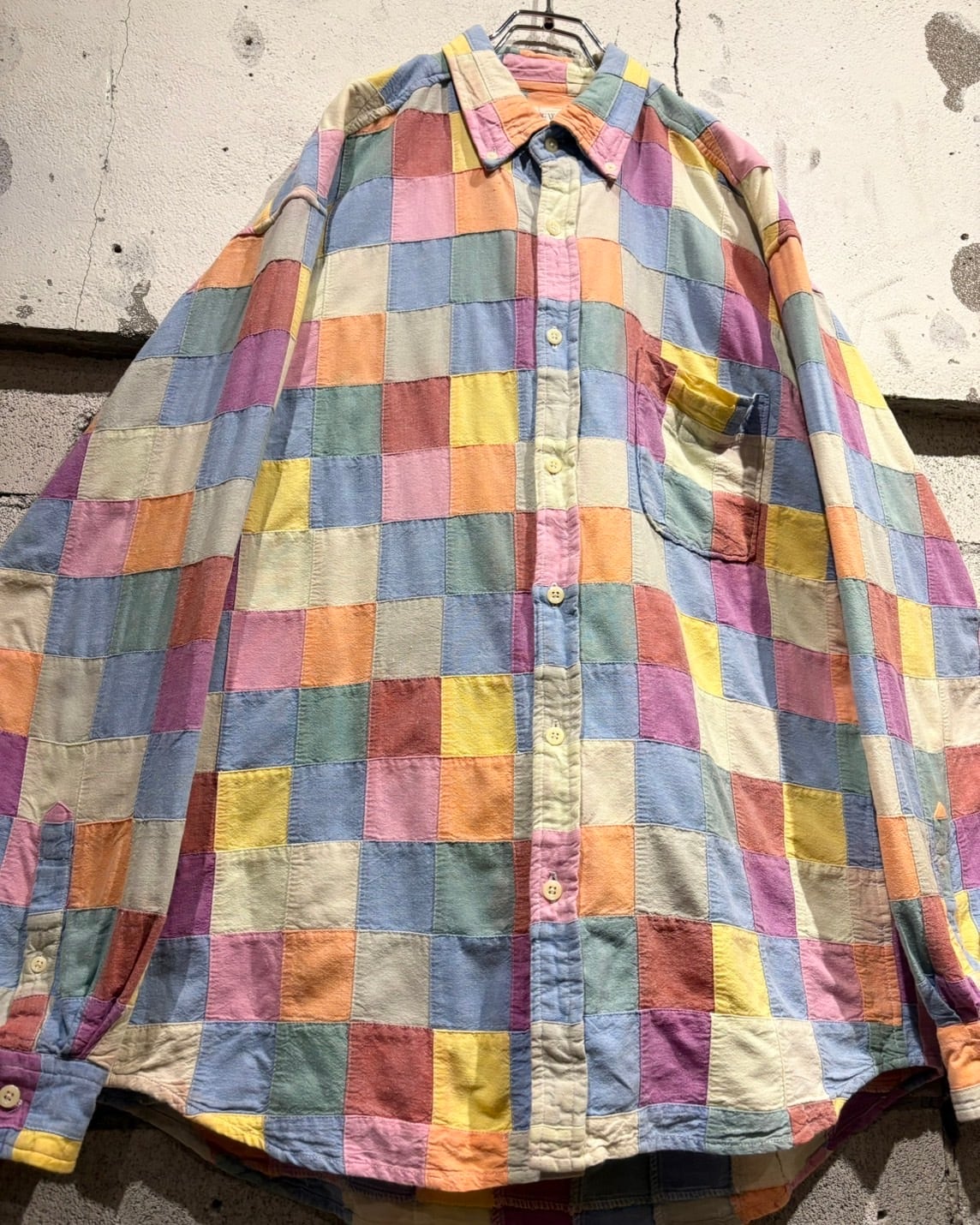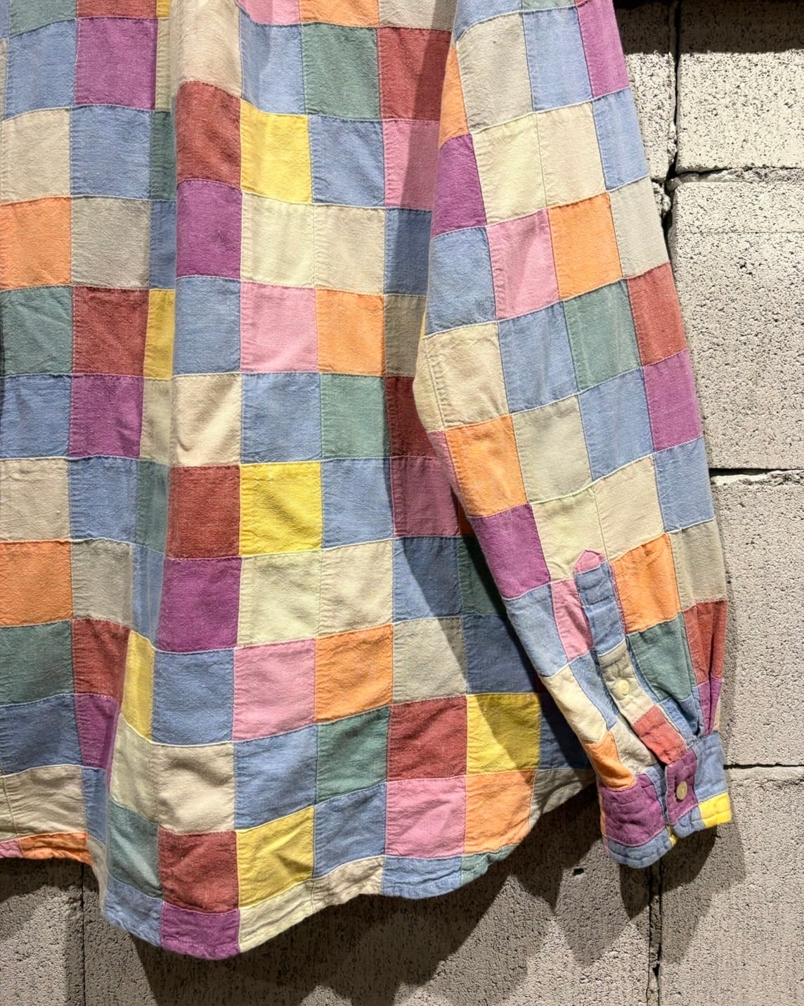 複数のカラーを繋ぎ合わせた、パッチワーク仕様の長袖シャツ。