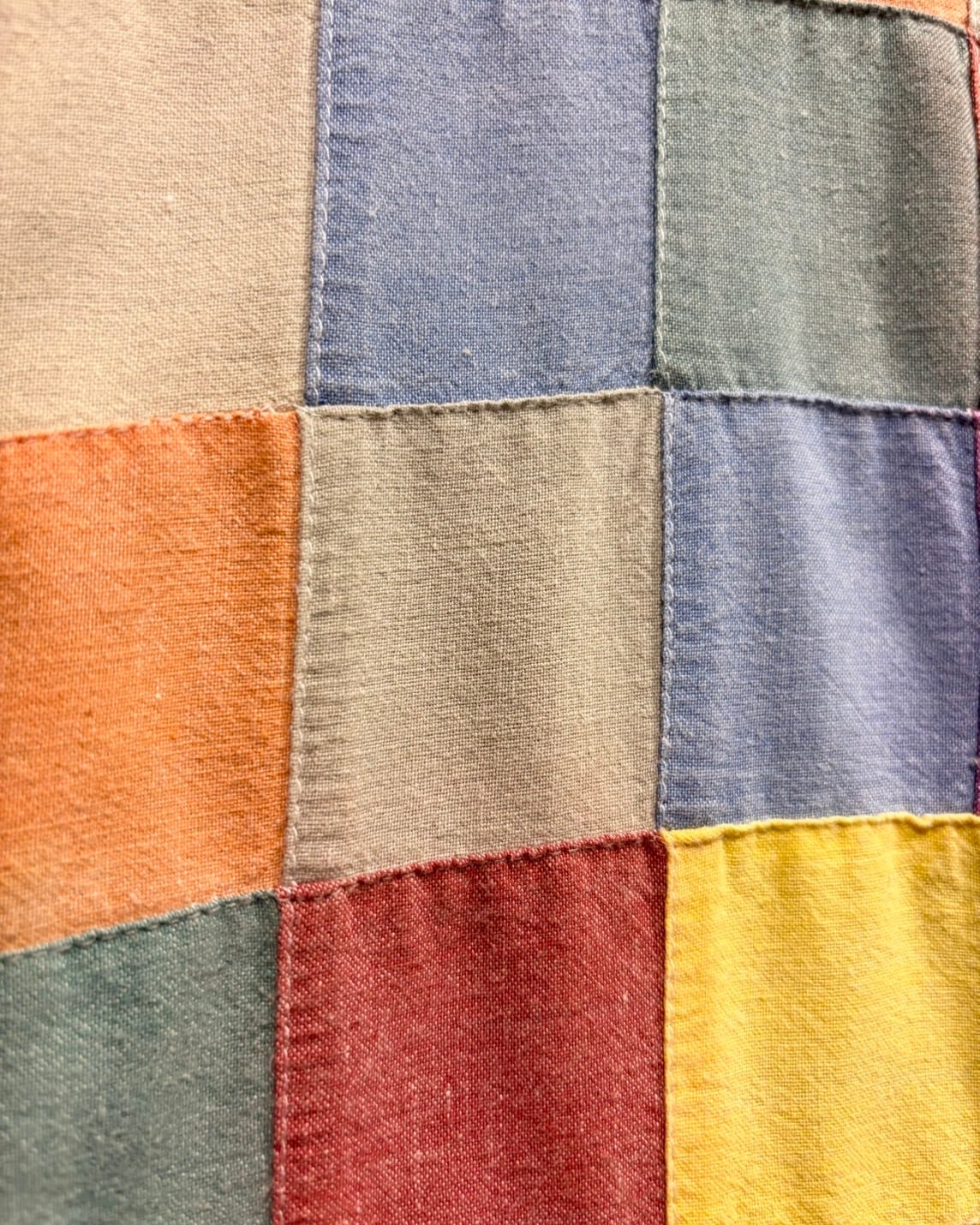 ピンク、イエロー、ブルー、グリーンなどパステル風の柔らかなカラーリングが春らしく、ランダムなパッチワークながらバランスがしっかりと取られています。