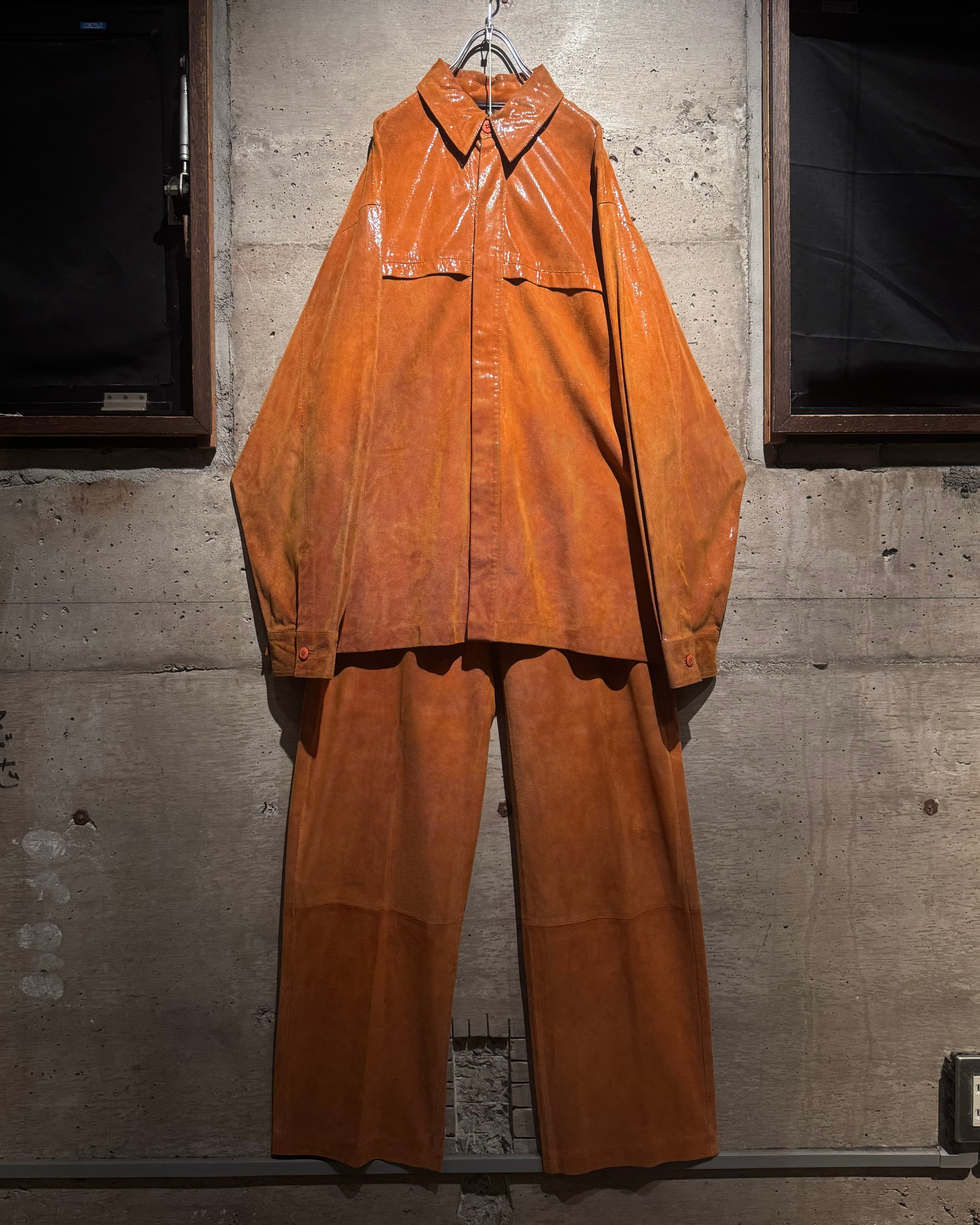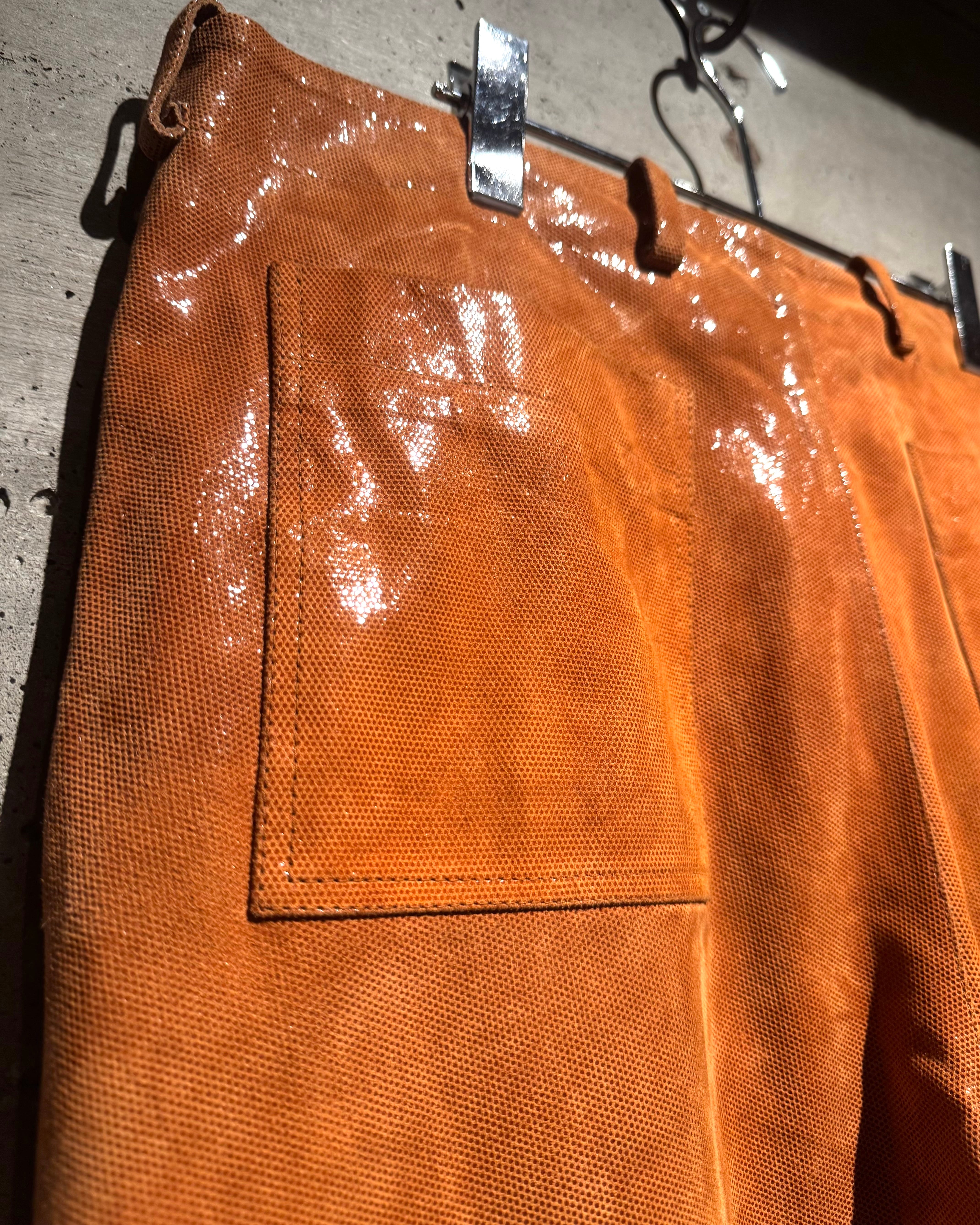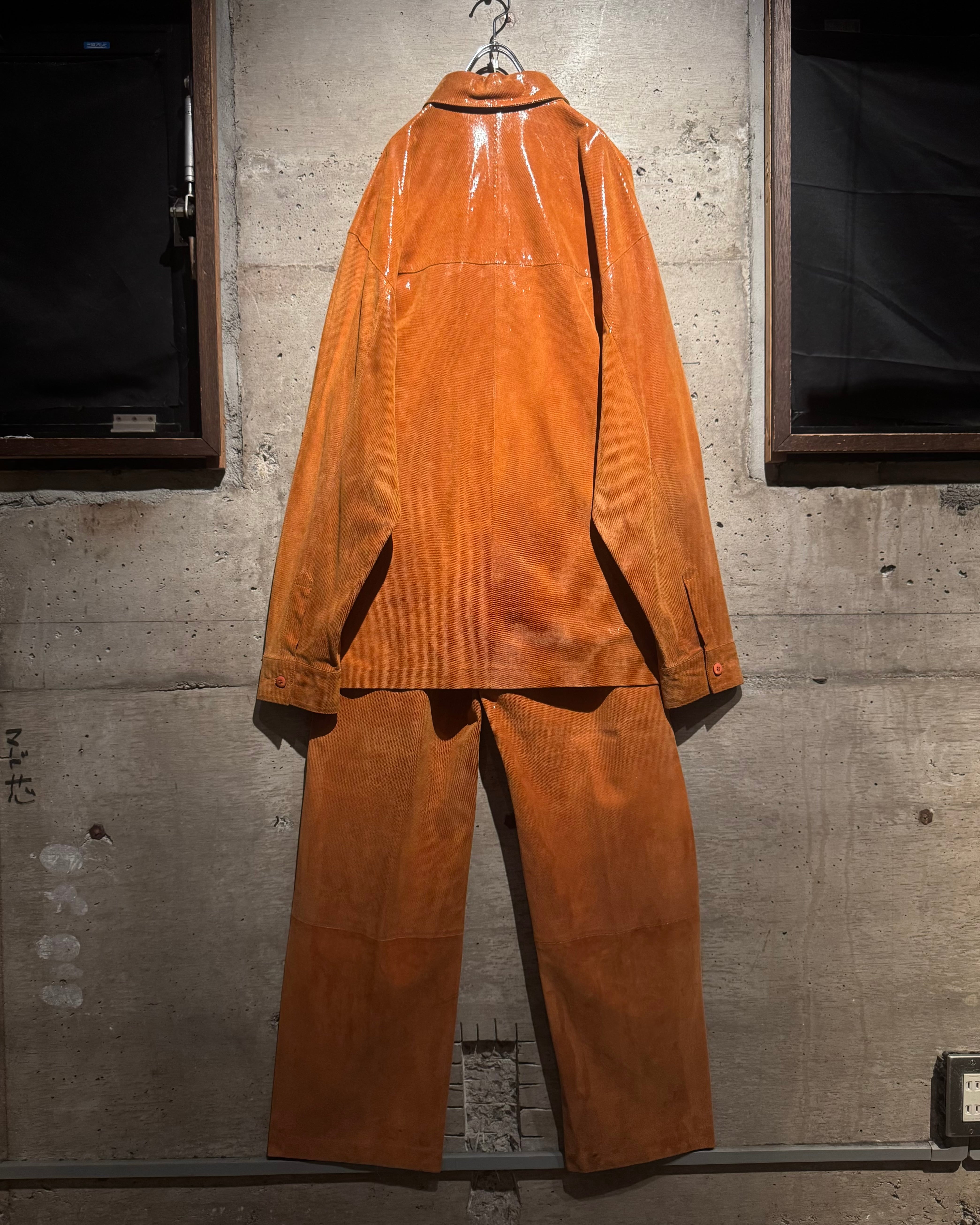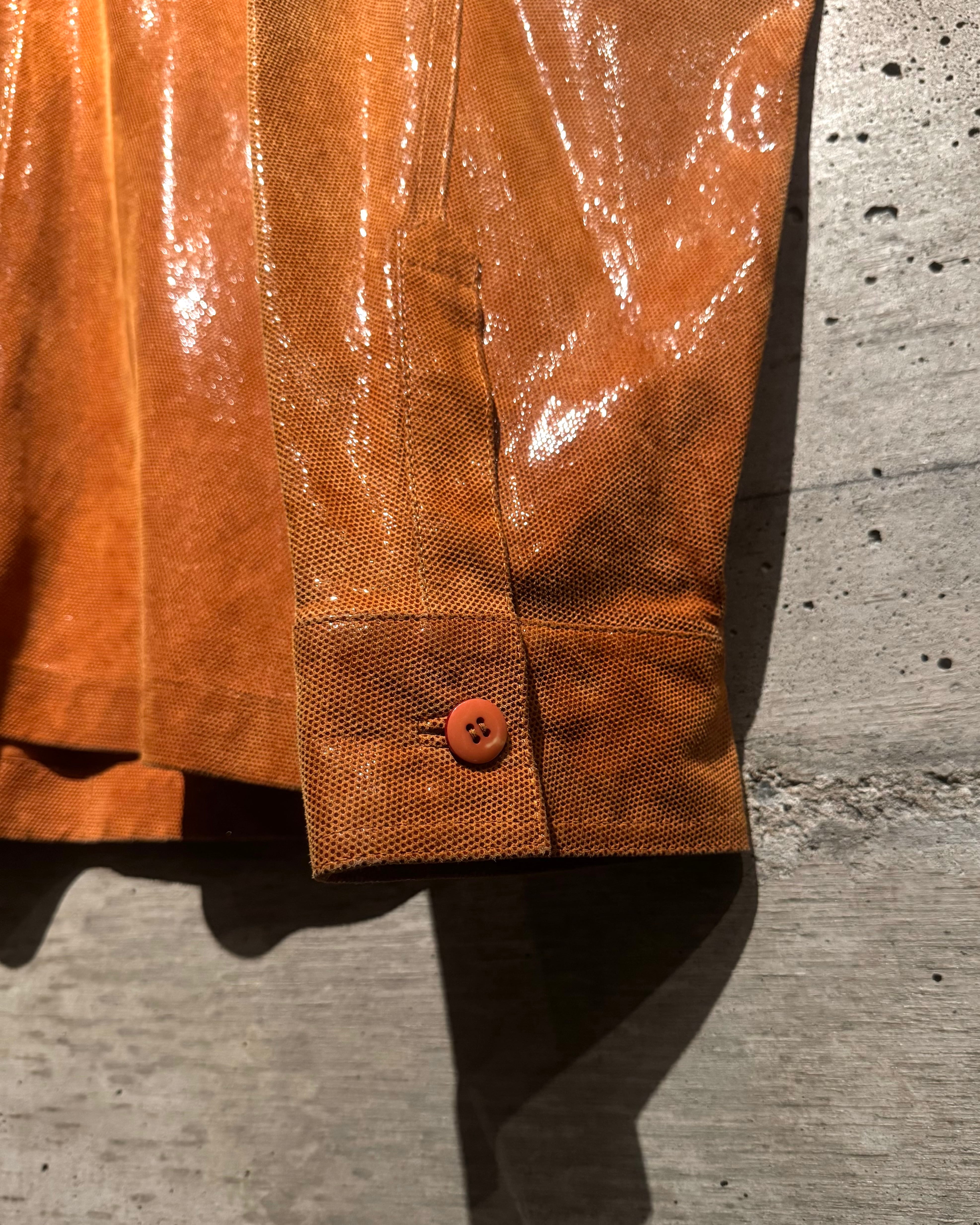 鮮やかなオレンジレザーをベースに、全体へ細かくドット調のエナメル加工を施したレザーセットアップの逸品。