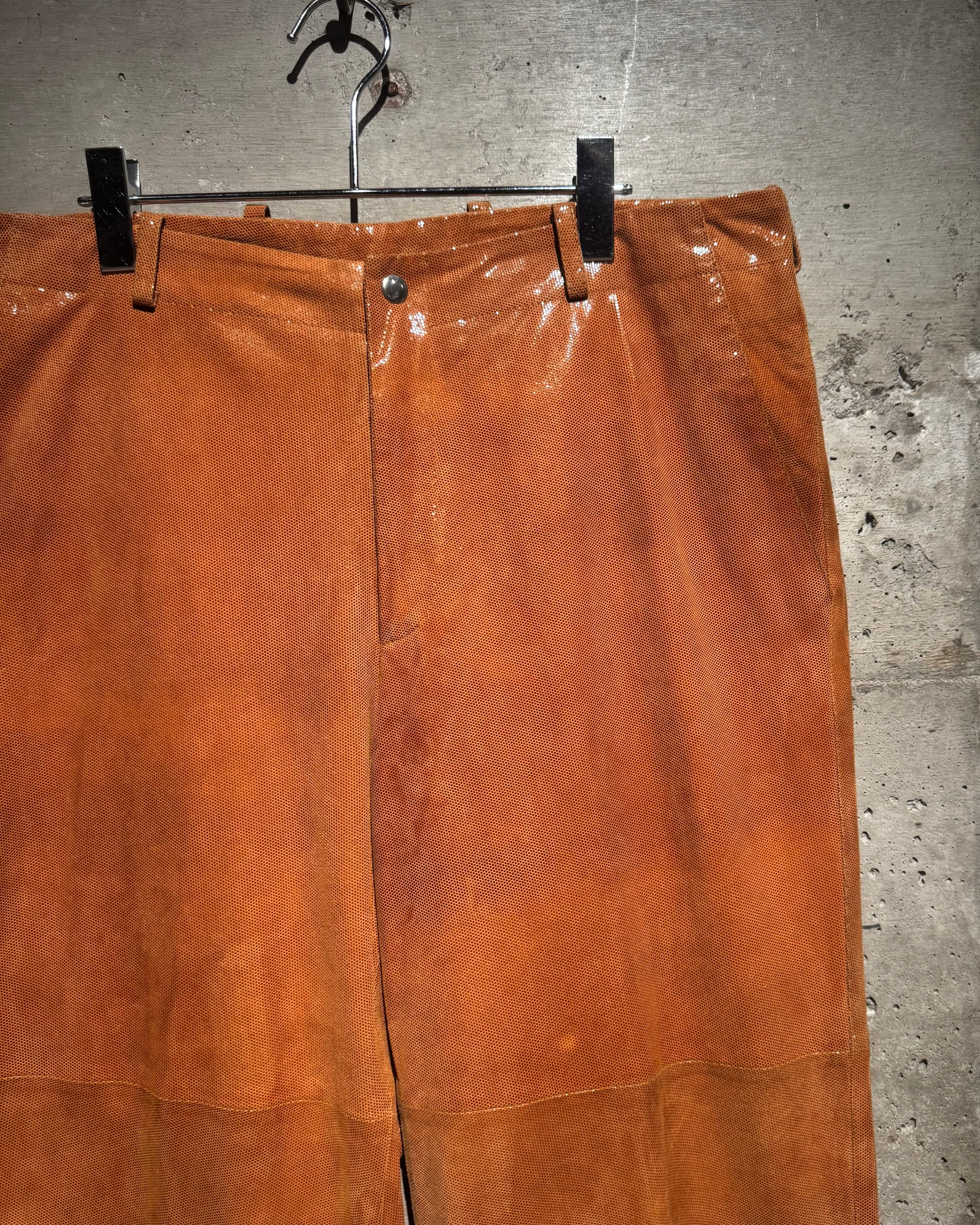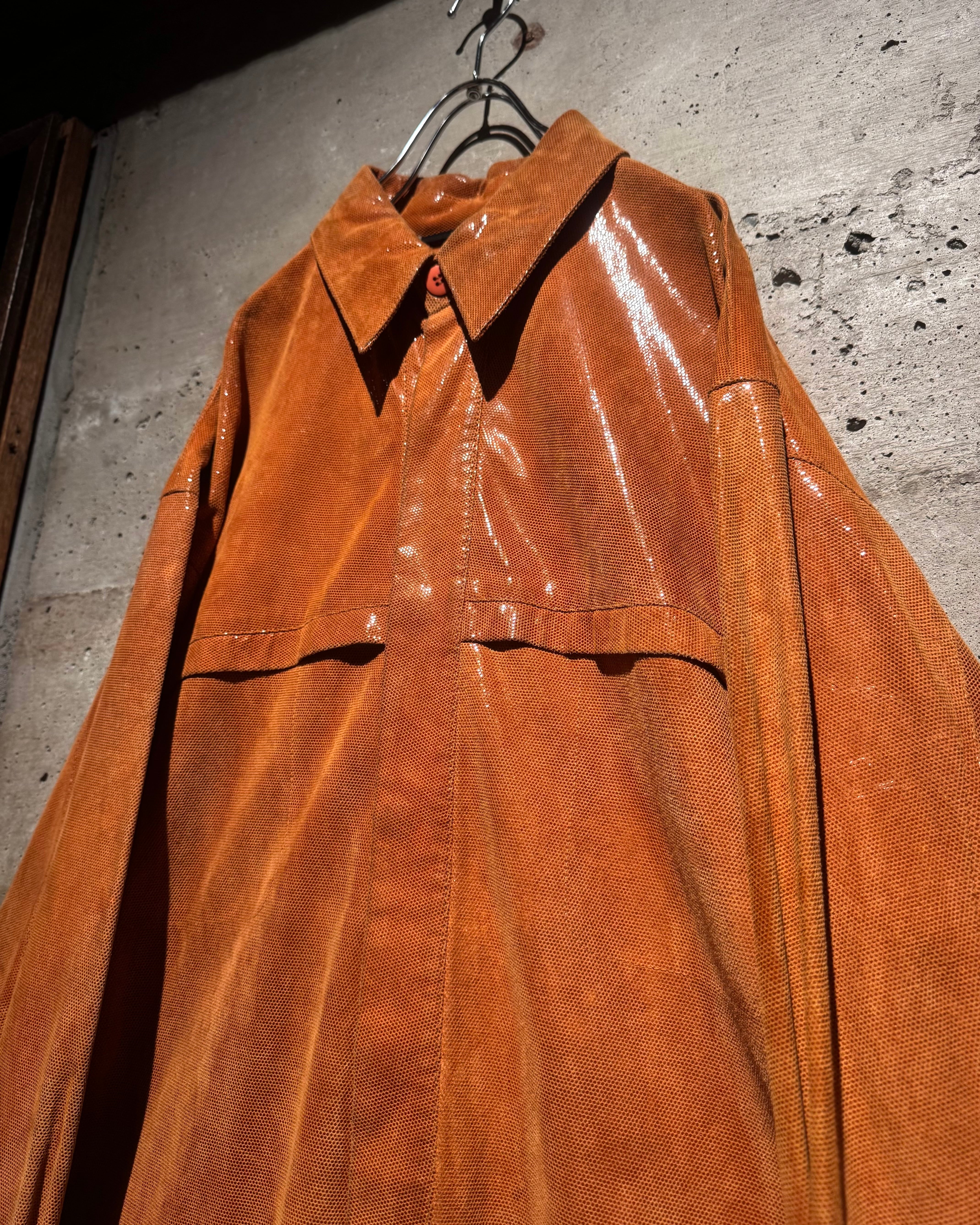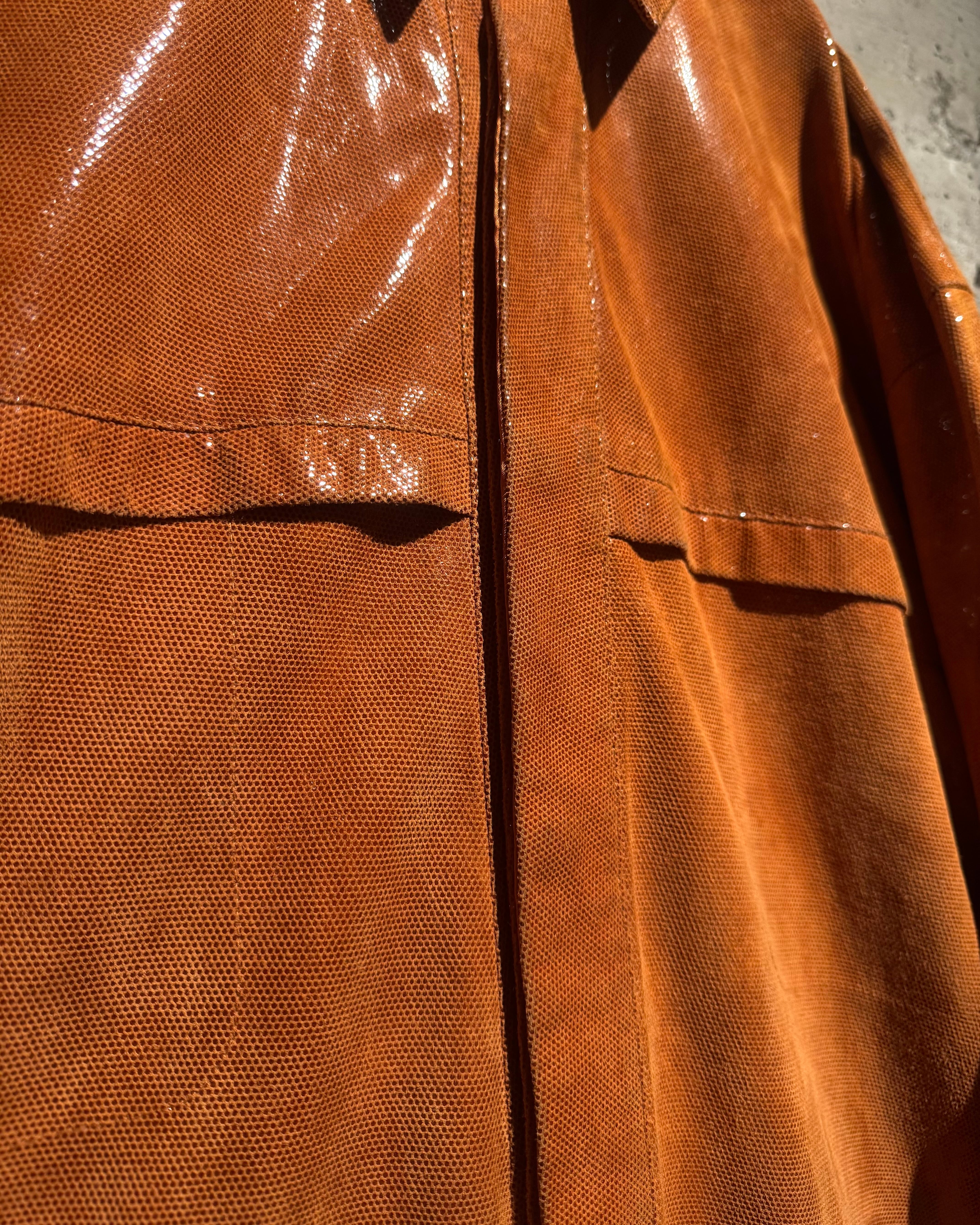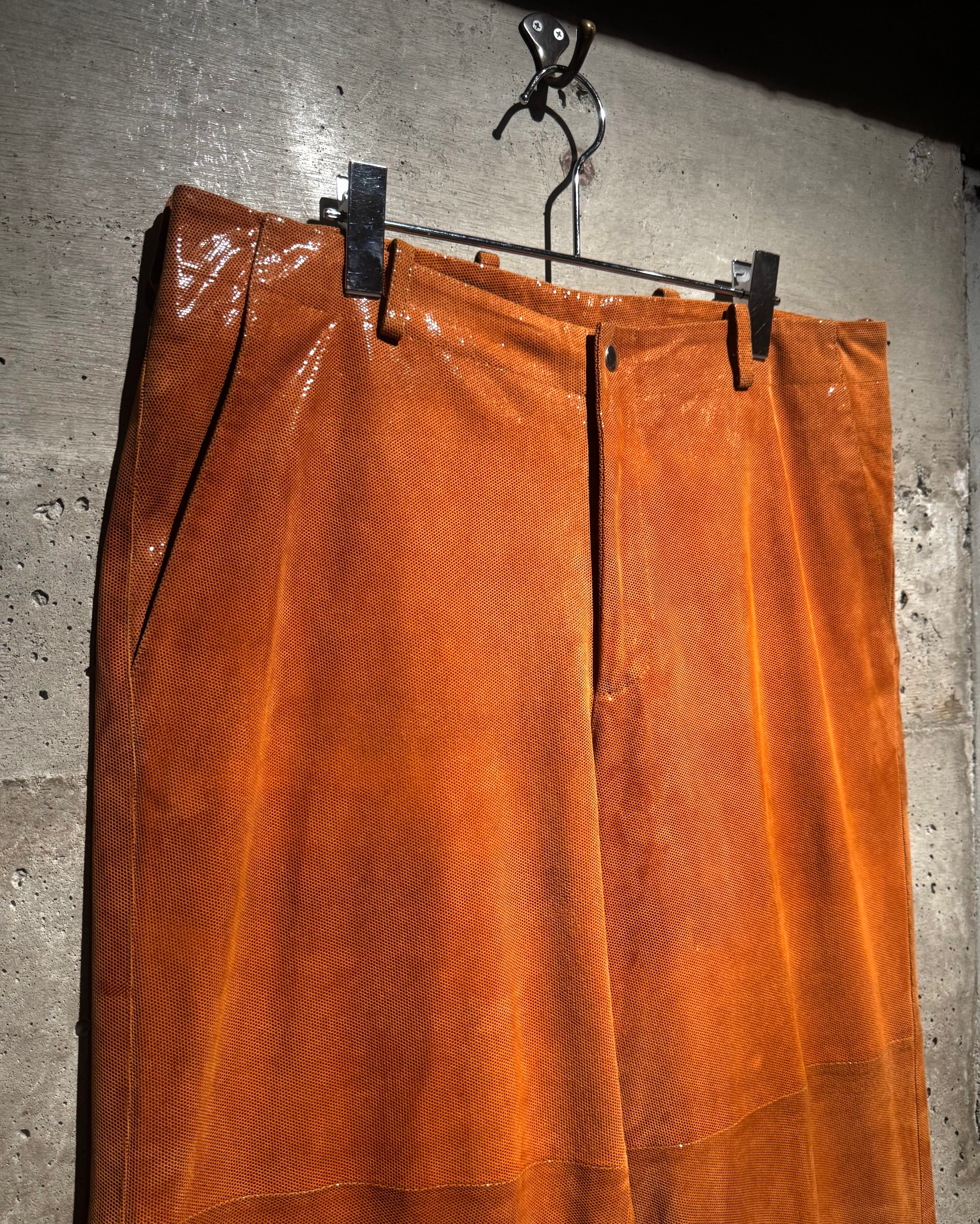 鮮やかなオレンジレザーをベースに、全体へ細かくドット調のエナメル加工を施したレザーセットアップの逸品。