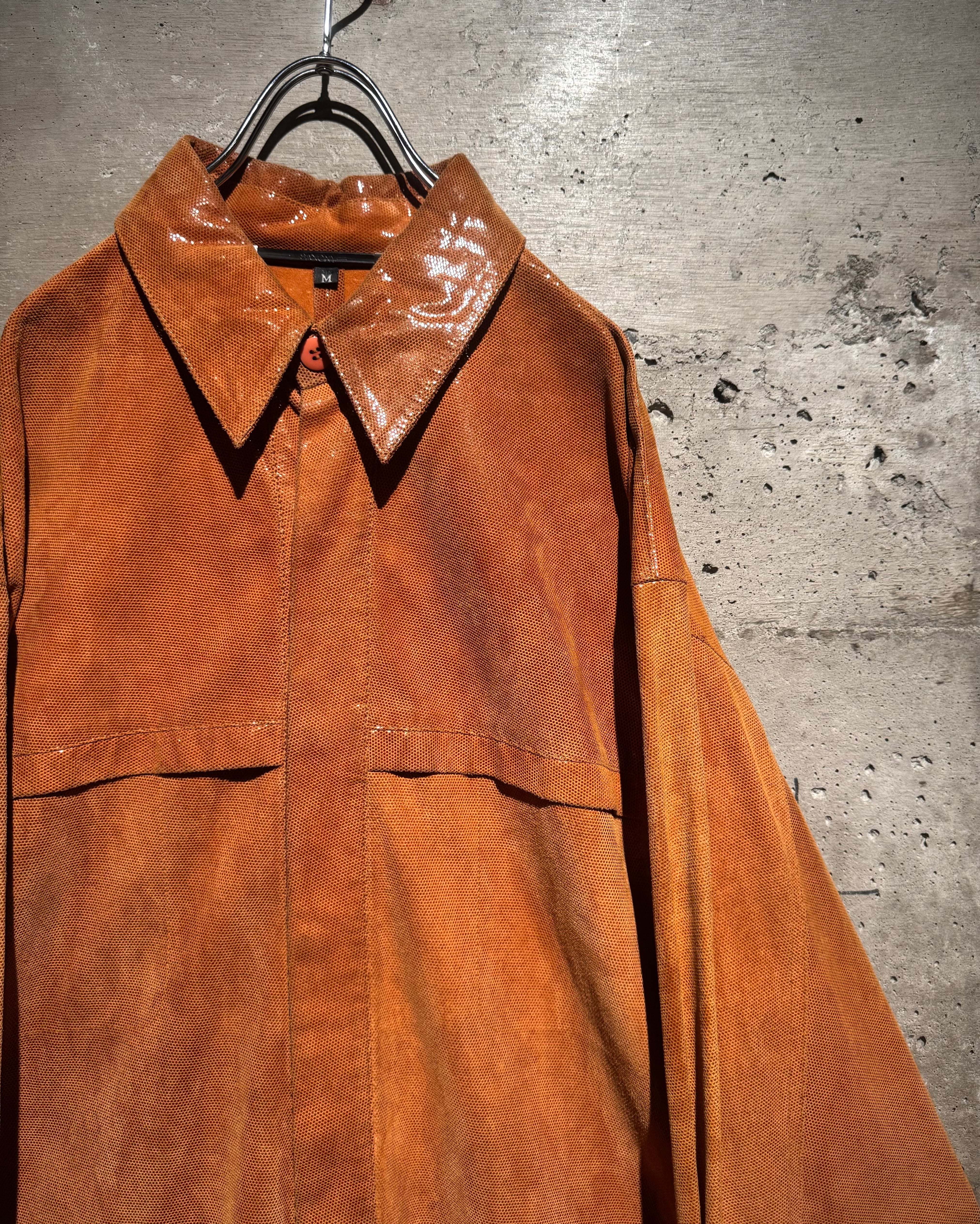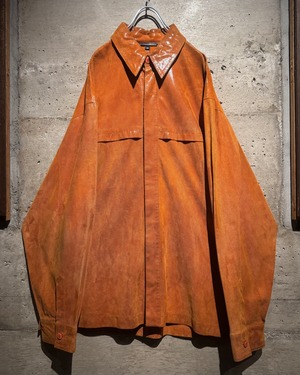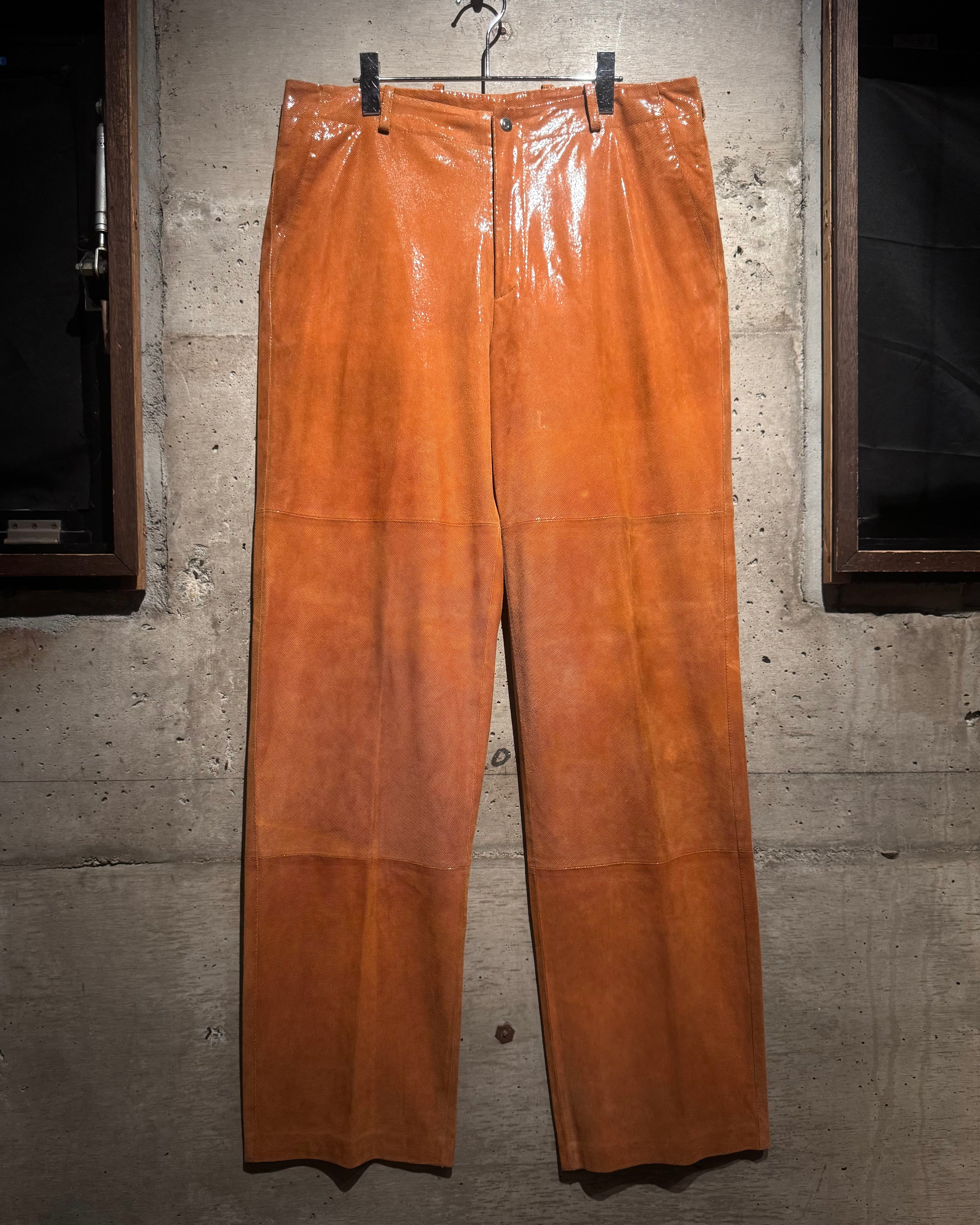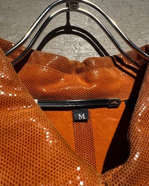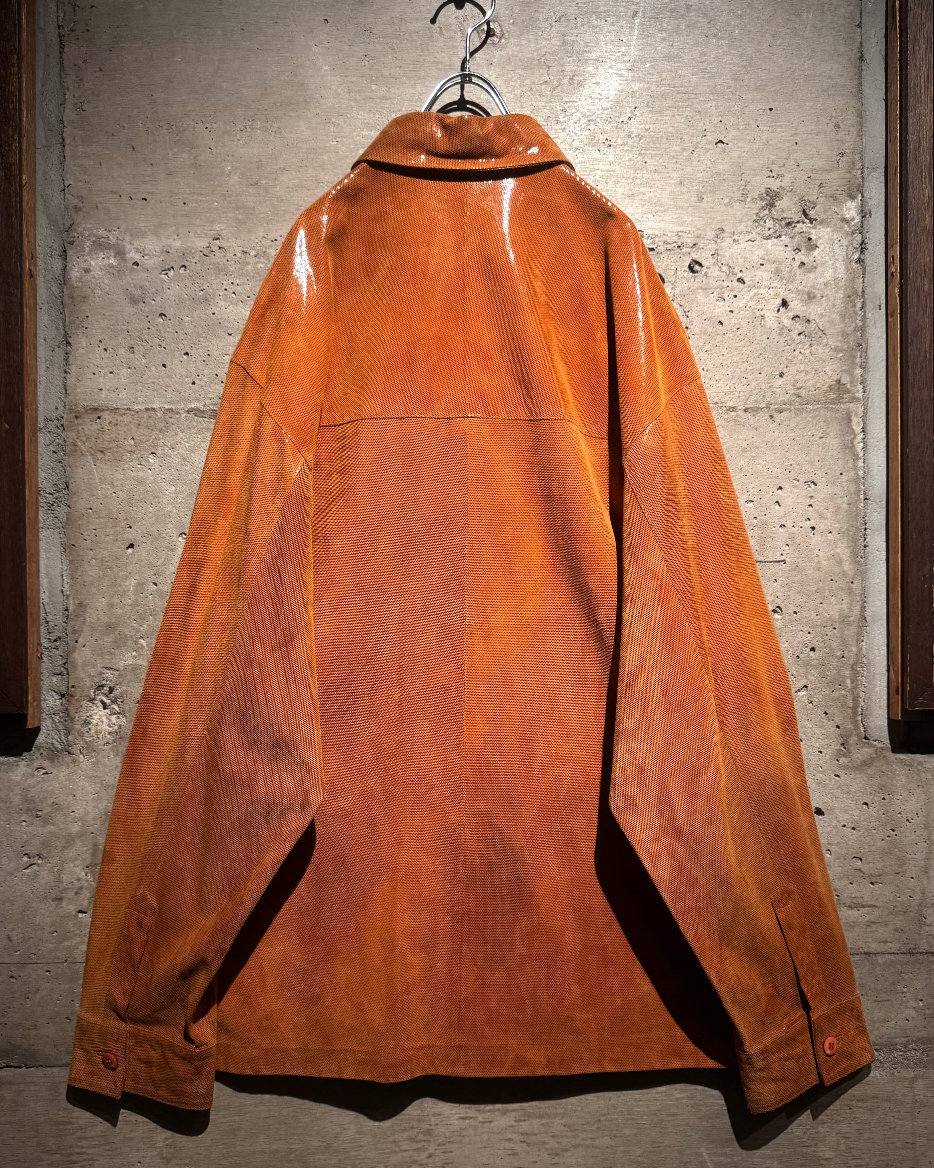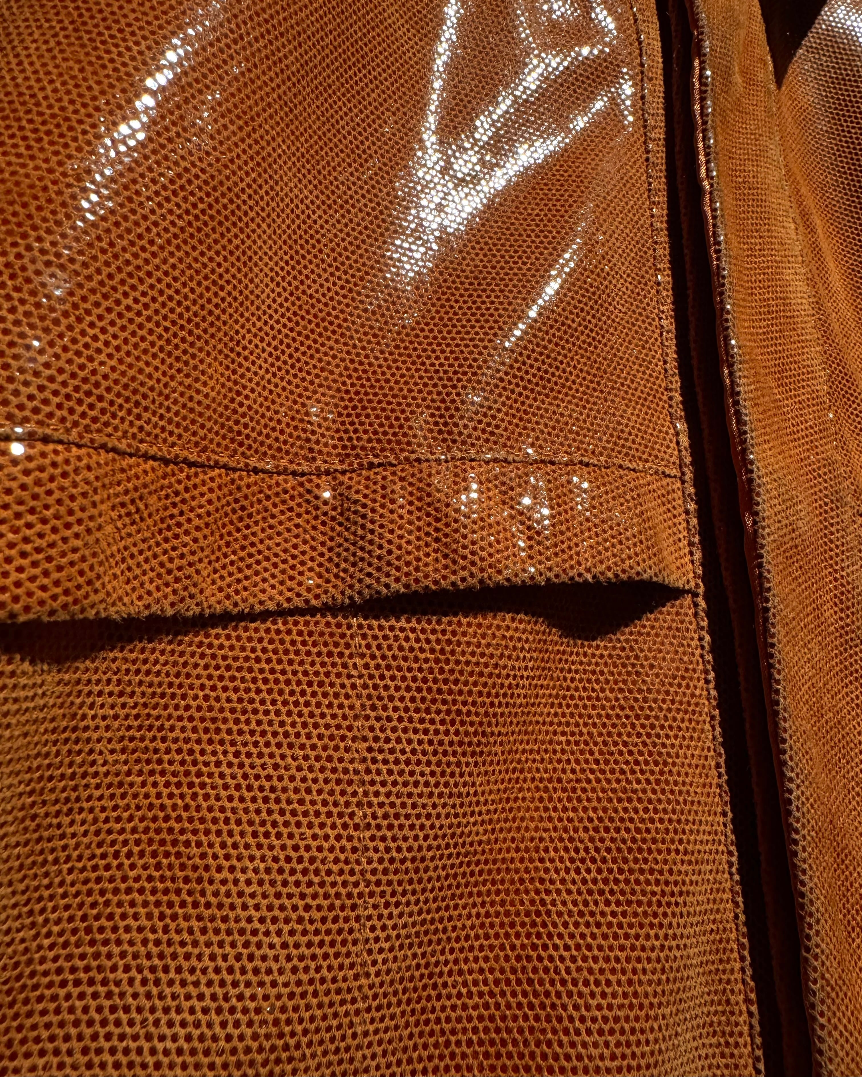 鮮やかなオレンジレザーをベースに、全体へ細かくドット調のエナメル加工を施したレザーセットアップの逸品。