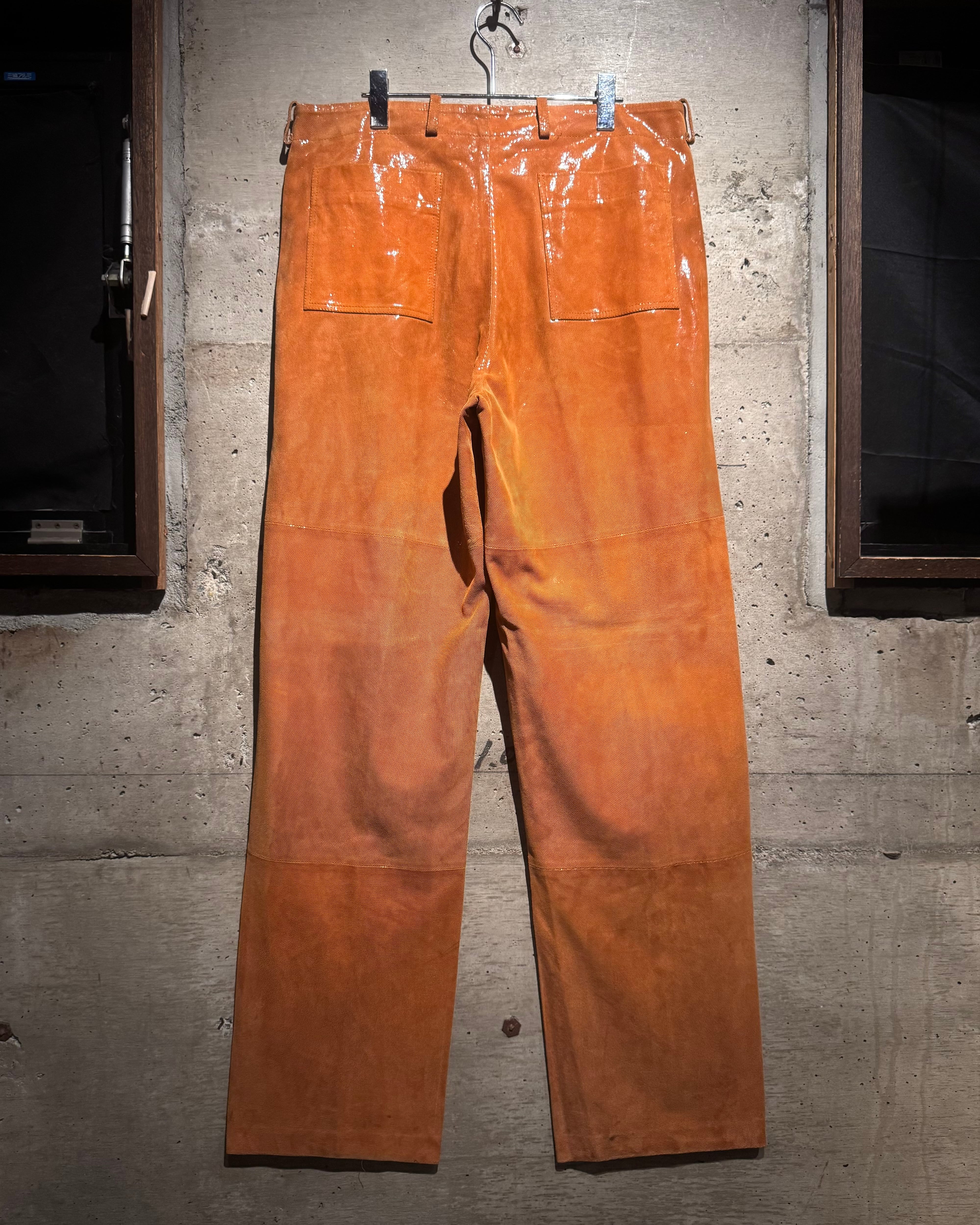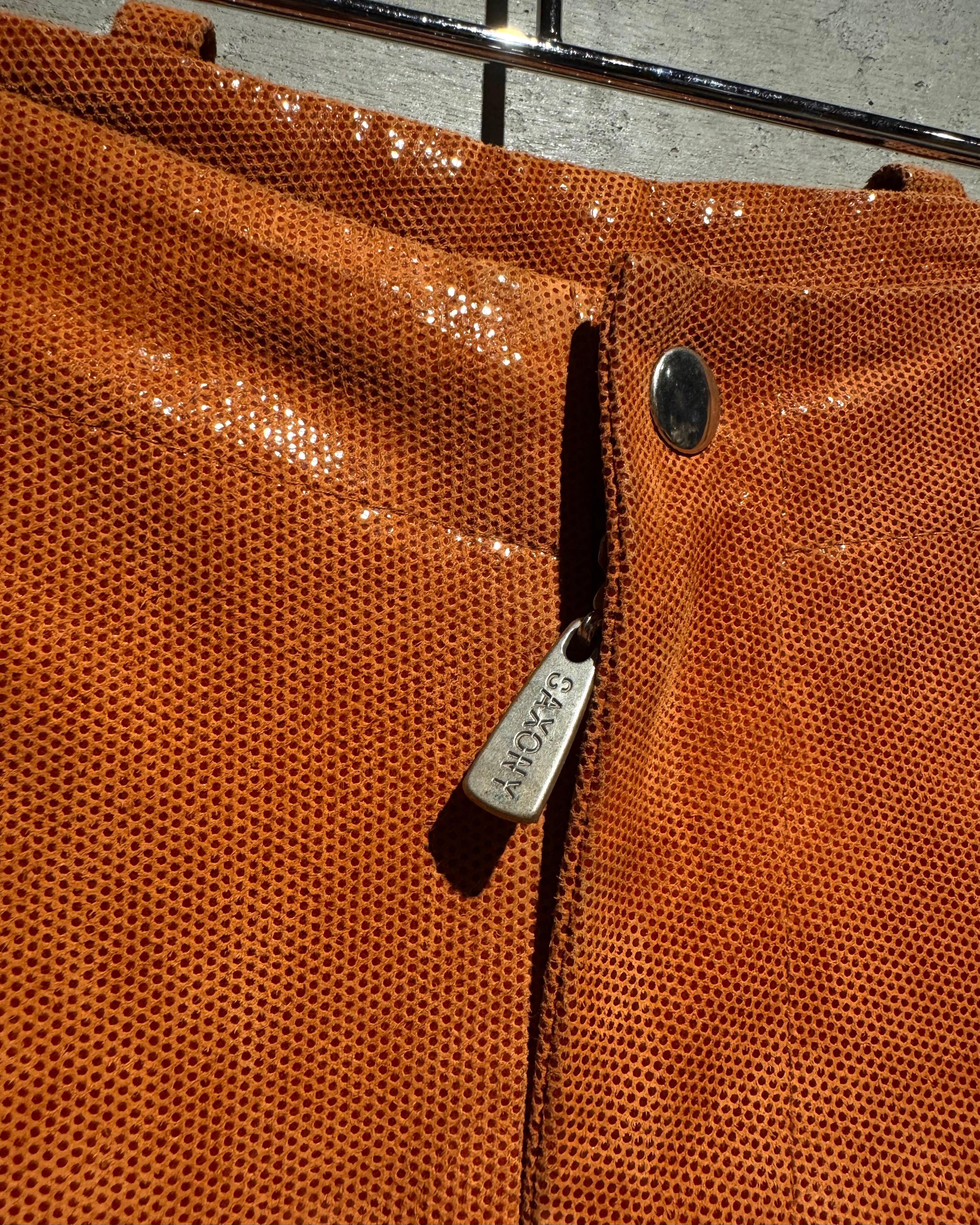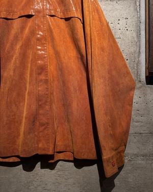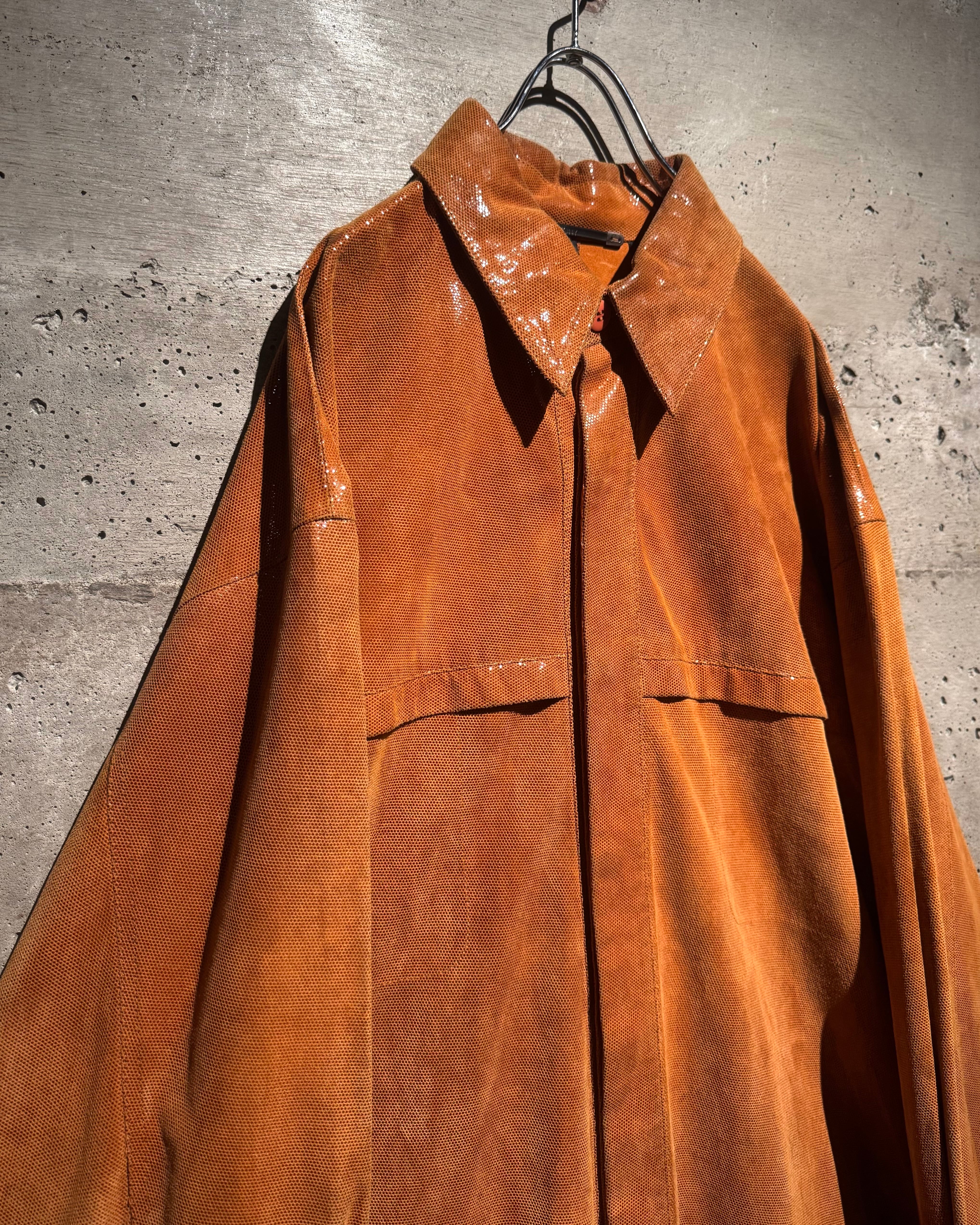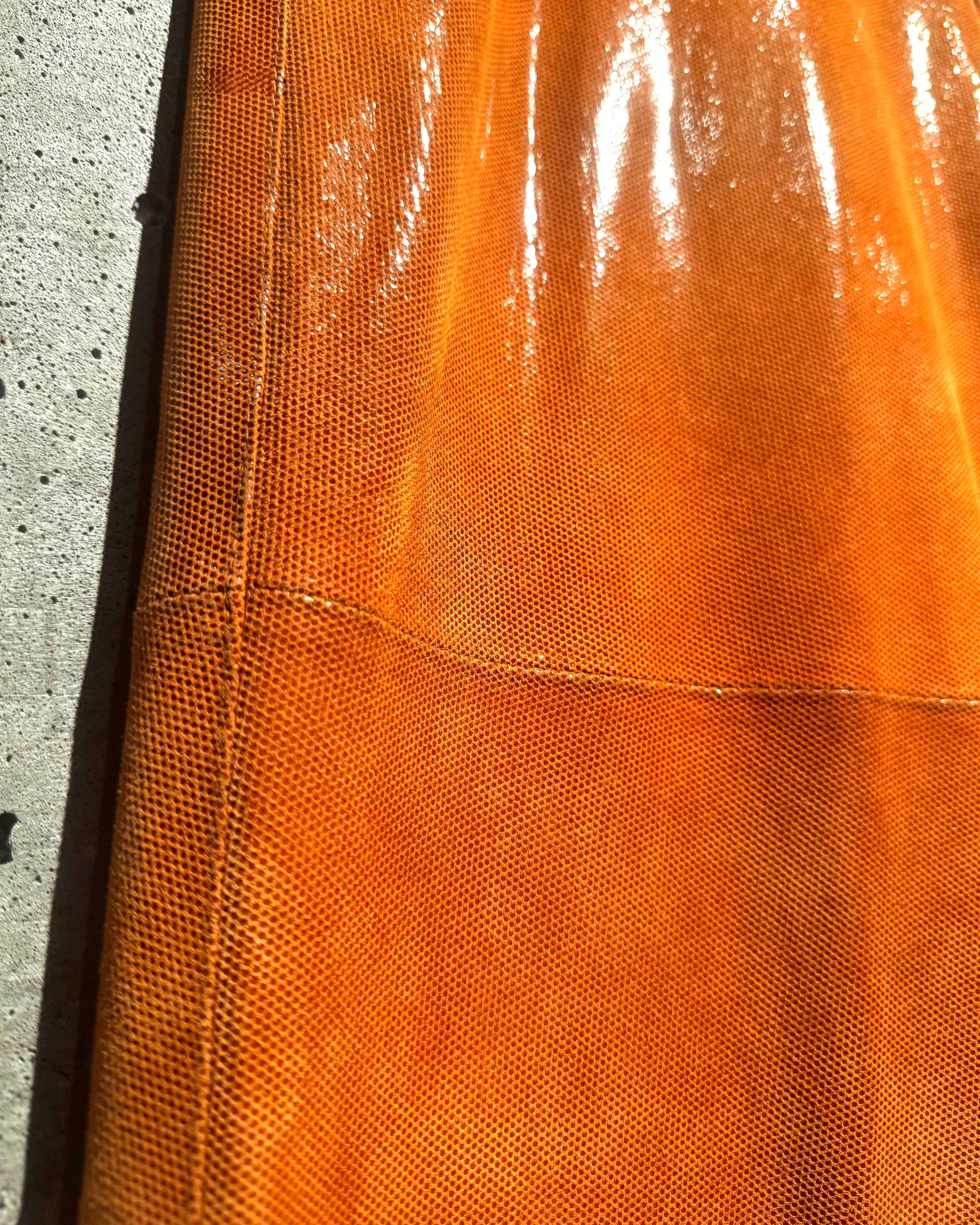 鮮やかなオレンジレザーをベースに、全体へ細かくドット調のエナメル加工を施したレザーセットアップの逸品。