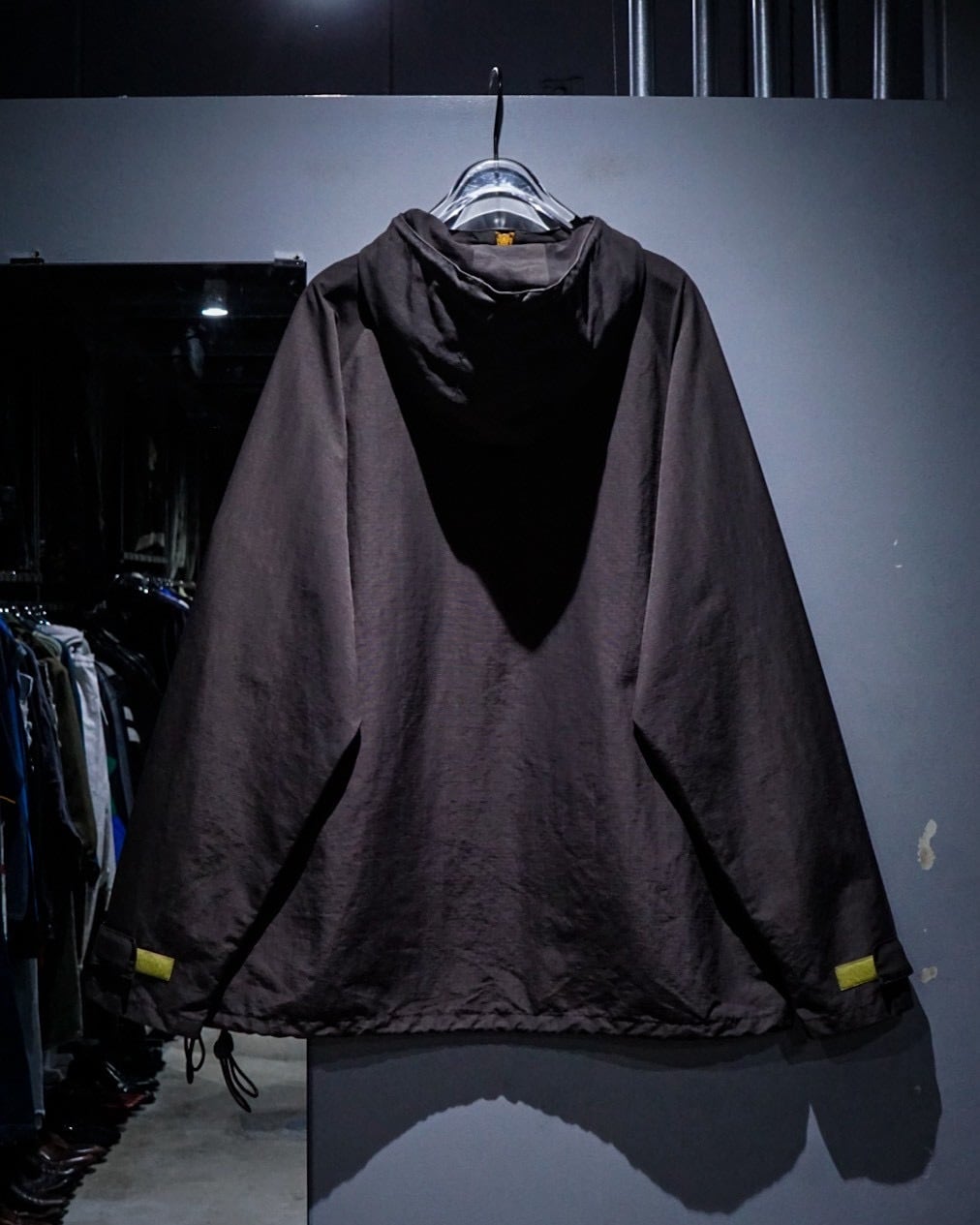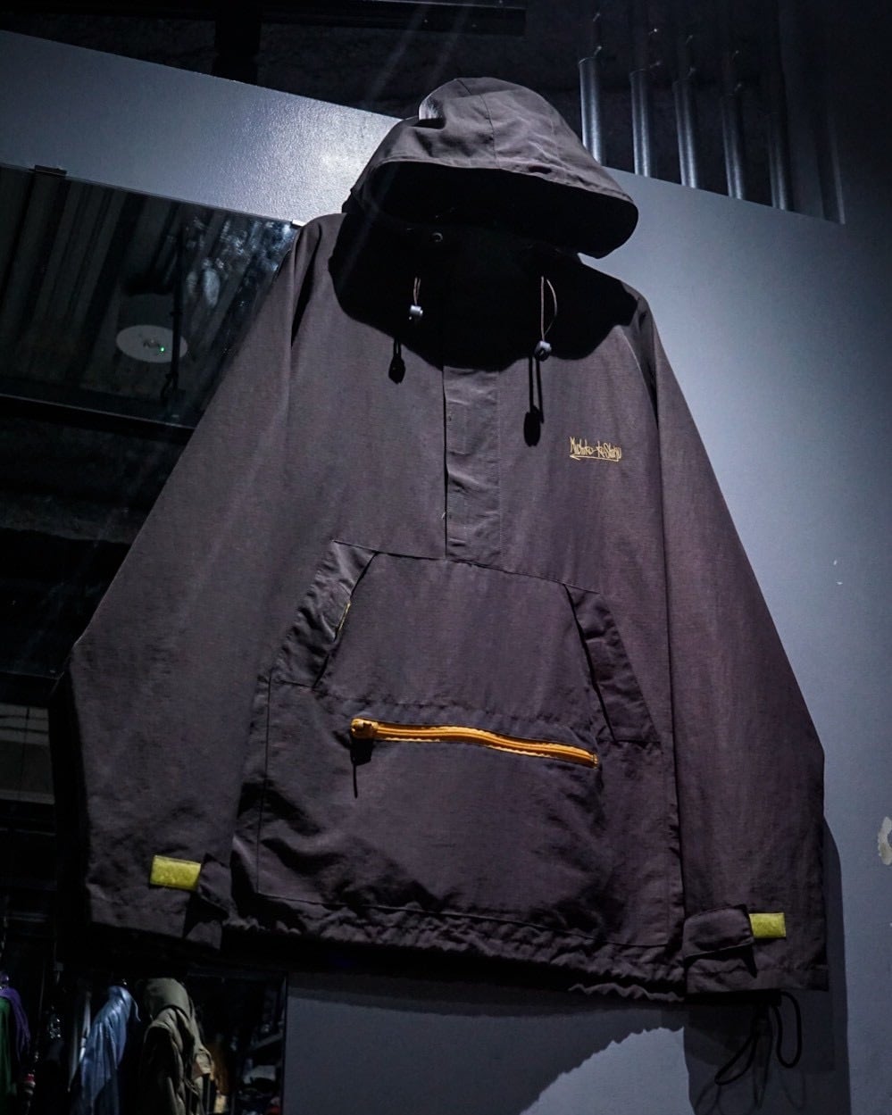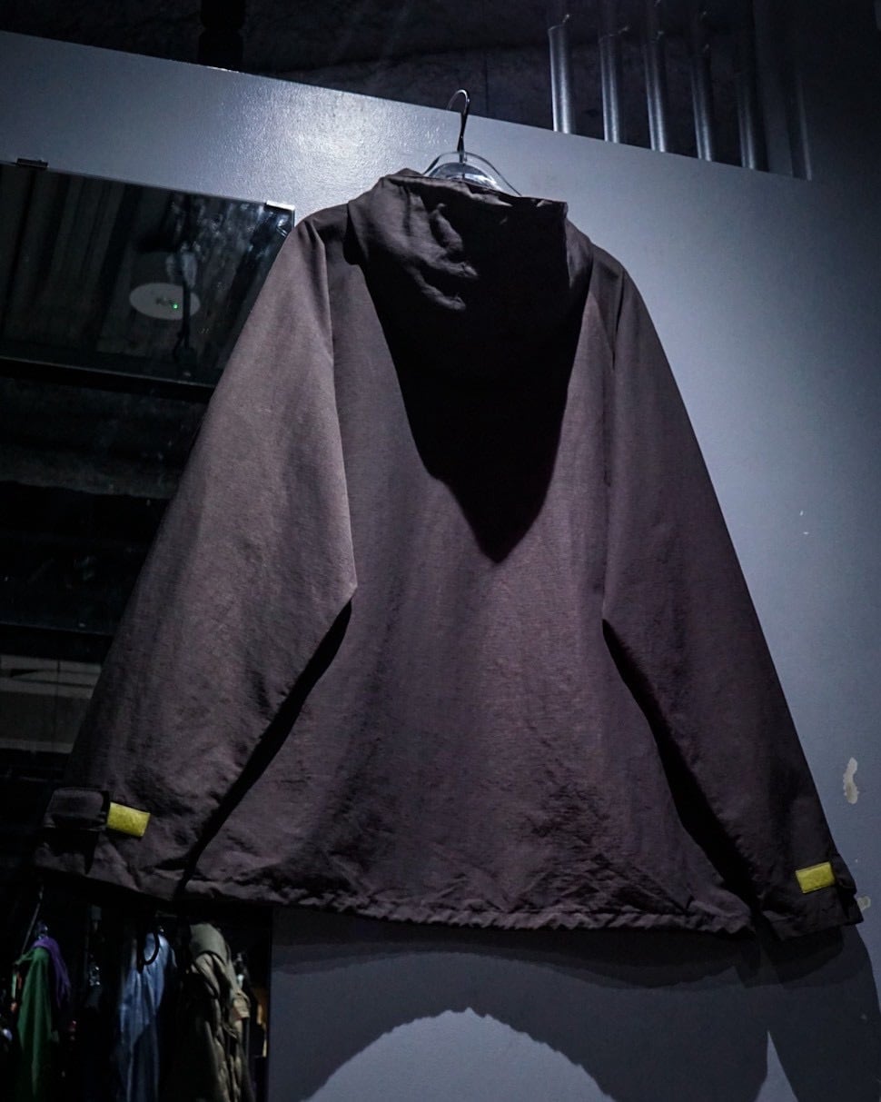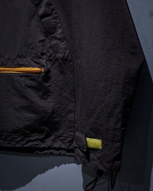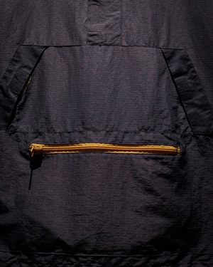フロントにはハーフジップ仕様に加え、存在感のあるカンガルーポケットを配置。さらに袖口のベルクロやドローコードなど、アノラックらしいギミックも抜かりなく備え、デザイン性と実用性を兼ね備えた構造に。胸元にはブランドロゴの刺繍がさりげなく入り、ミニマルな中にしっかりとアイデンティティを感じさせます。