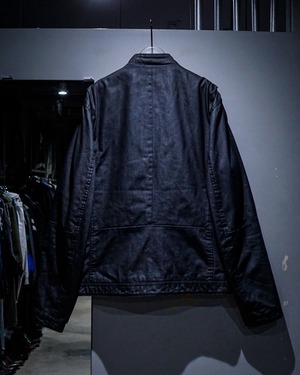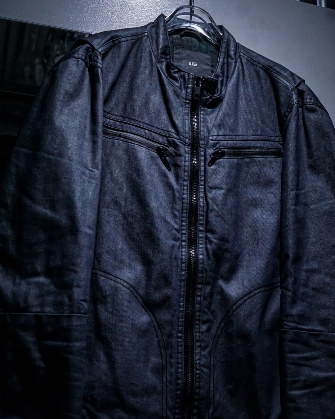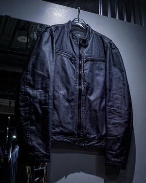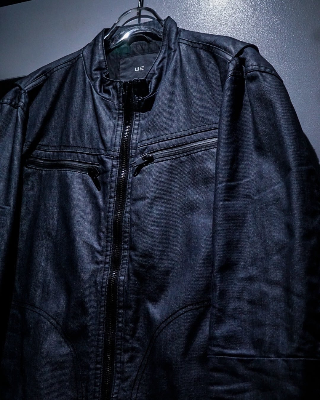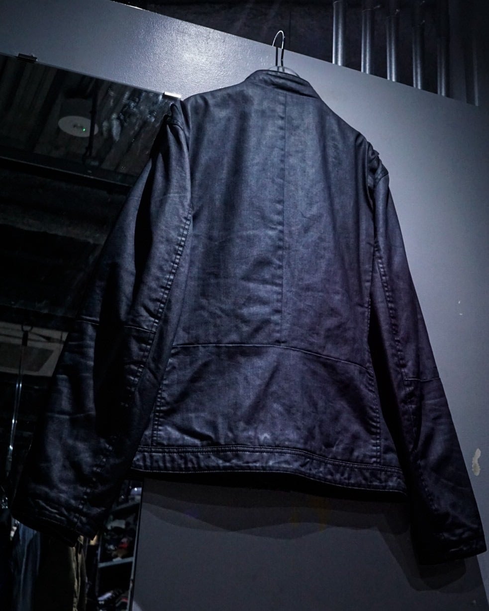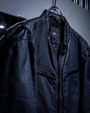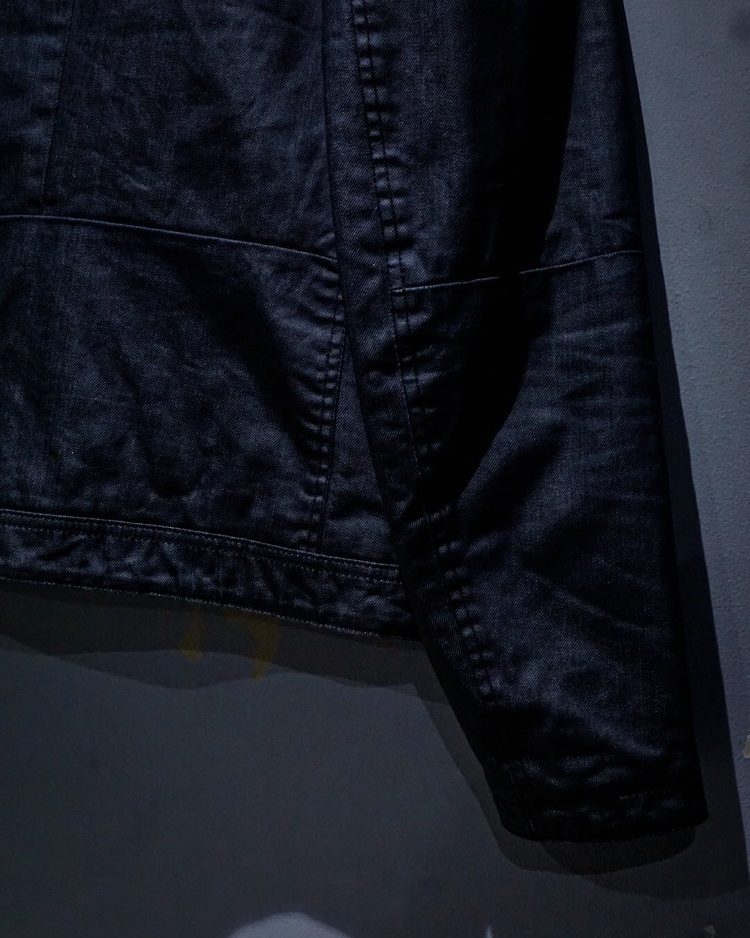 レザーのような独特な光沢を放つコーティングを施し、ギミックを盛り込んだライダースジャケットノリのデニムジャケット。