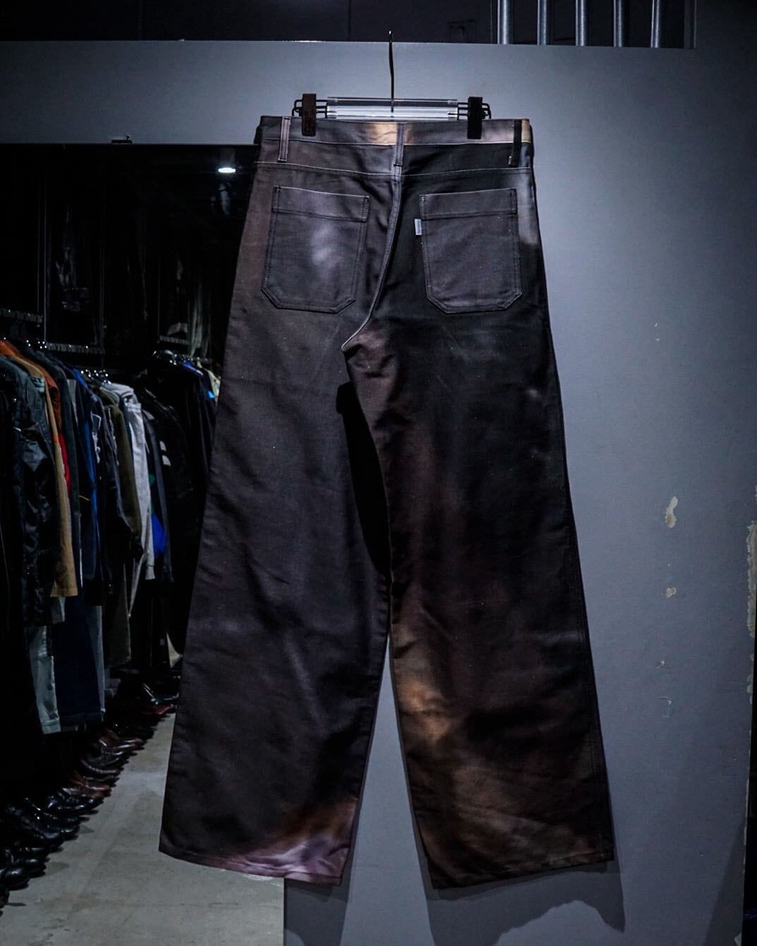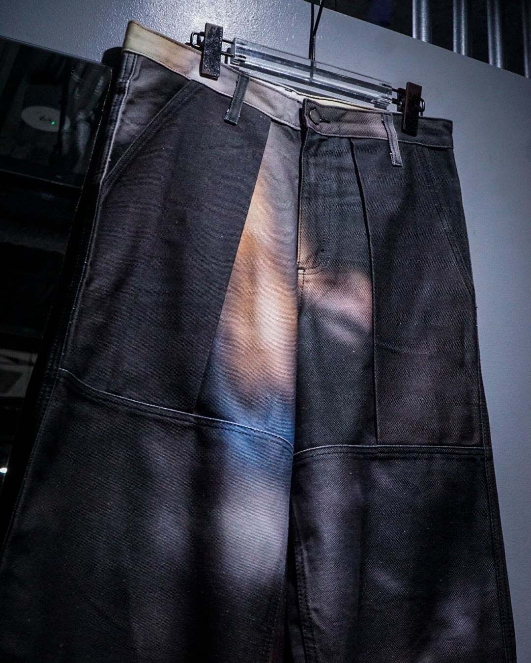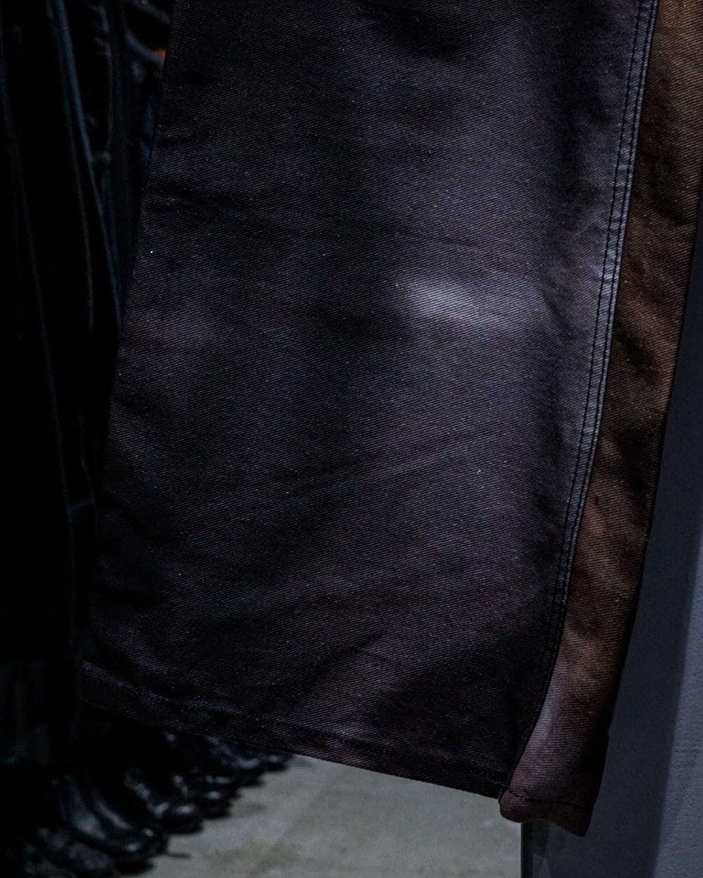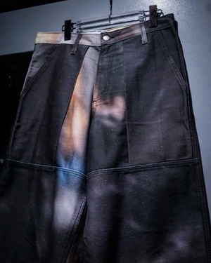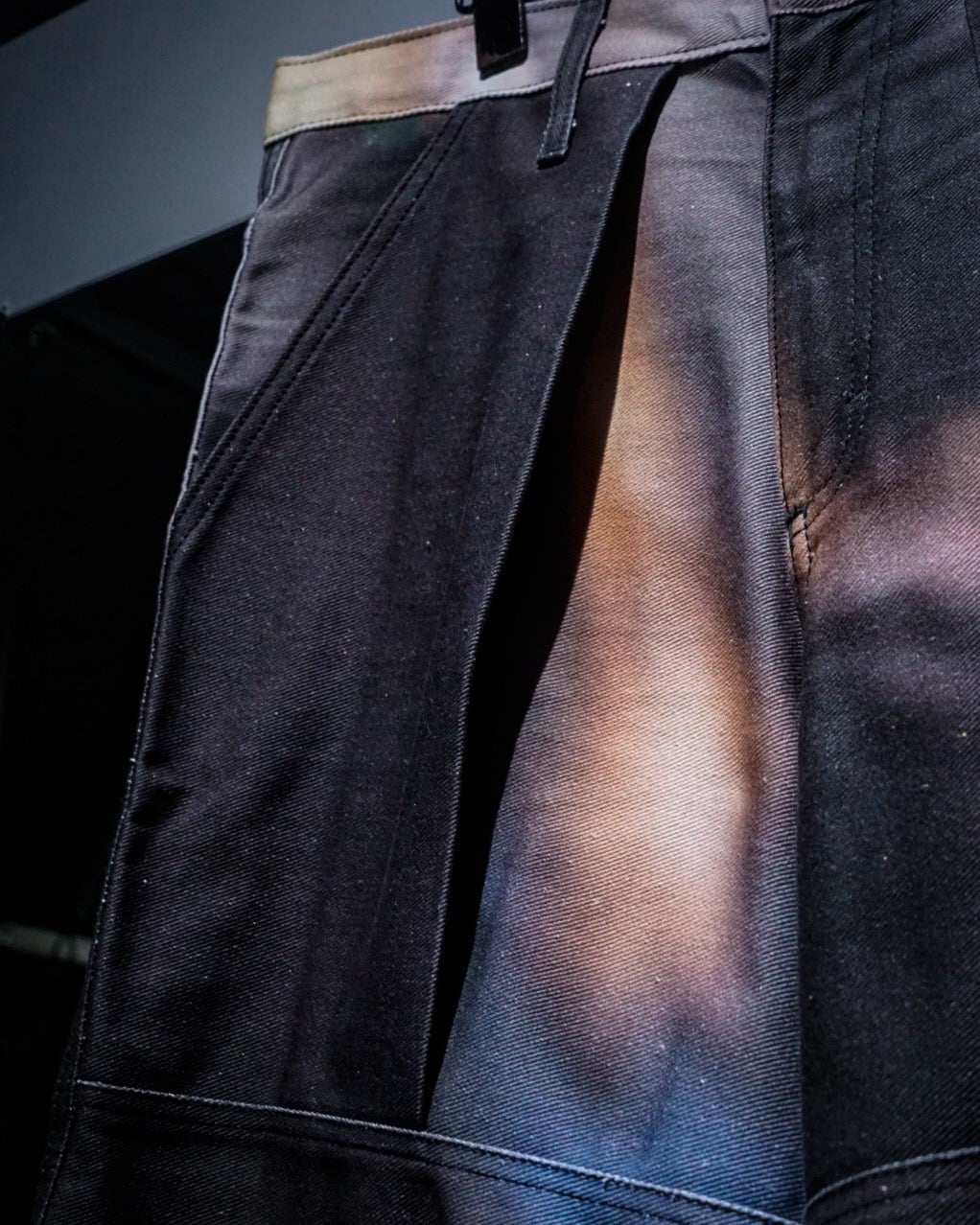 フロントポケットにはプリーツを入れ、立体的な膨らみを持たせた構造に加え、腿部分から切り替えられたダブルニーのようなパネルデザインが存在感を強調。単なるデザインに留まらず、動きに合わせて陰影が生まれる設計は、ブランドらしい実験的なアプローチを感じさせます。