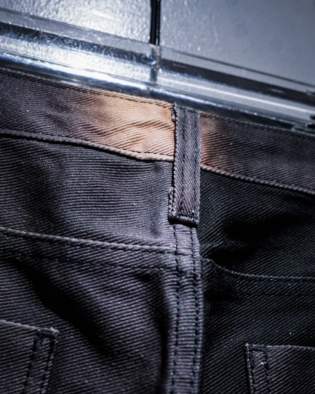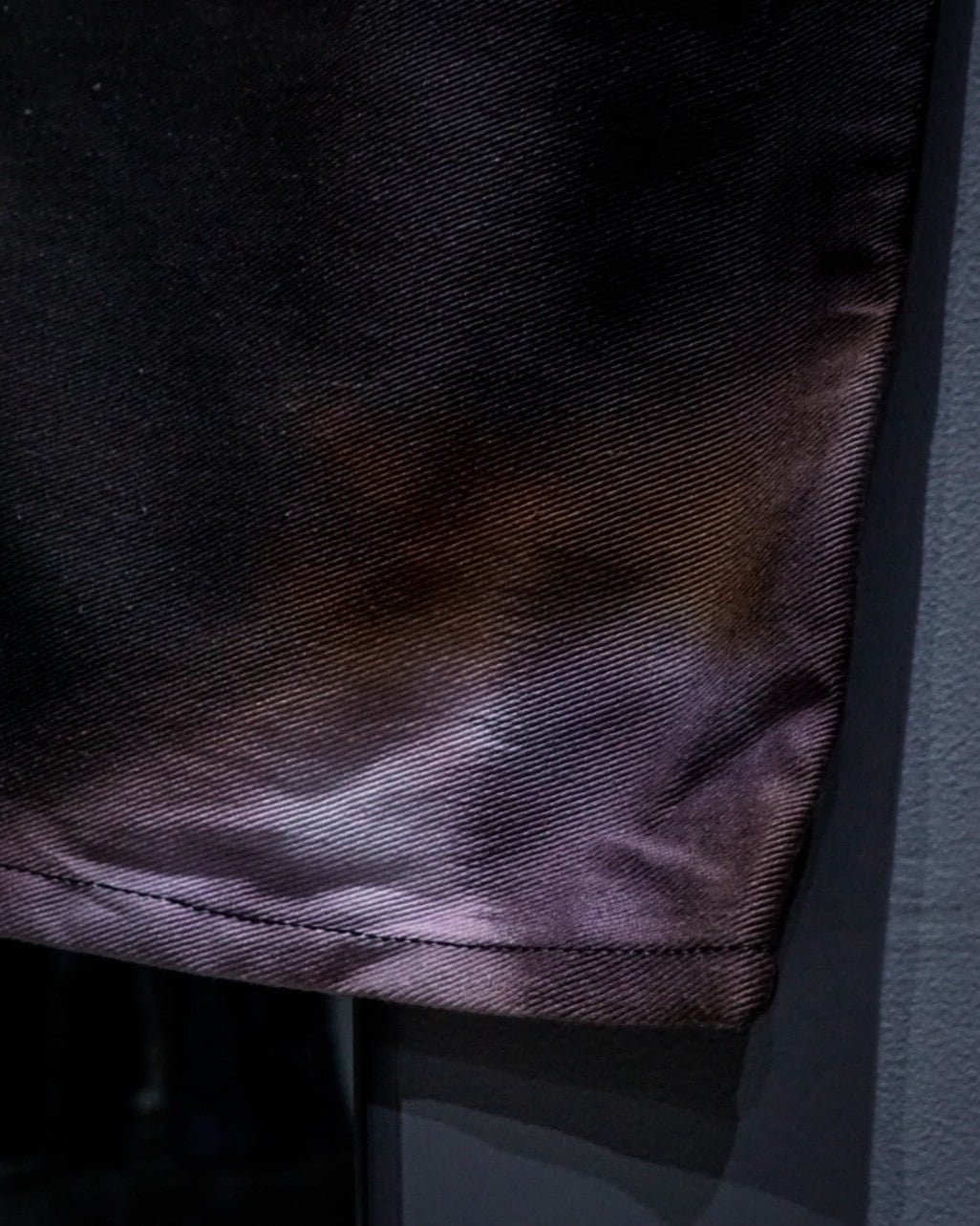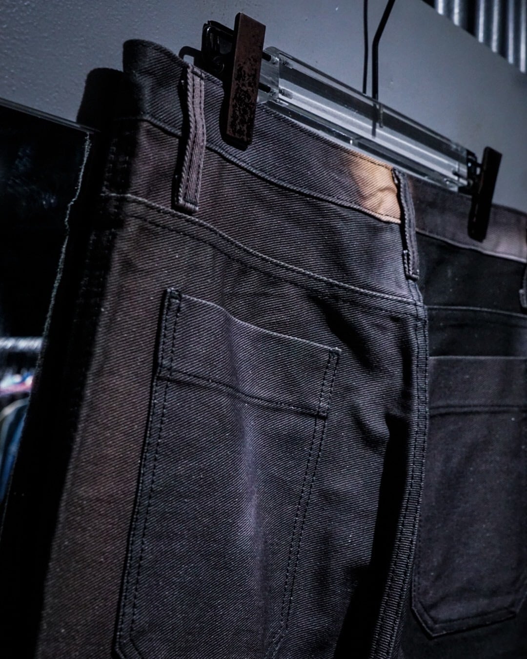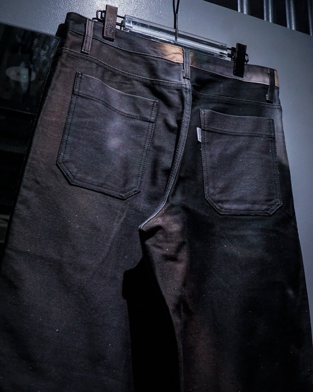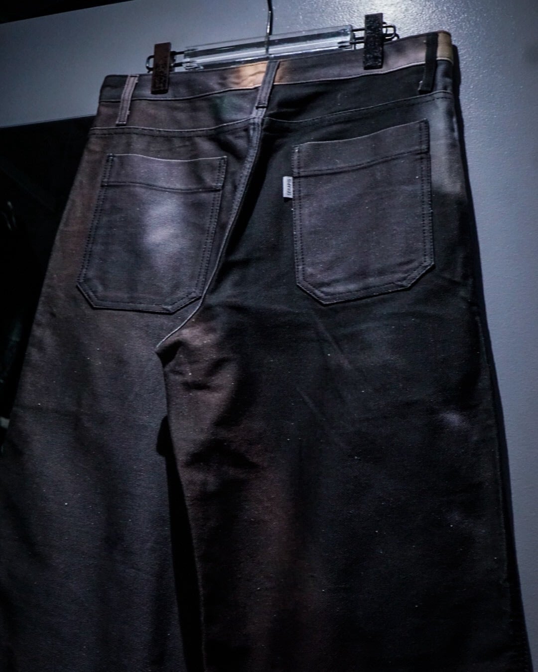 フロントポケットにはプリーツを入れ、立体的な膨らみを持たせた構造に加え、腿部分から切り替えられたダブルニーのようなパネルデザインが存在感を強調。単なるデザインに留まらず、動きに合わせて陰影が生まれる設計は、ブランドらしい実験的なアプローチを感じさせます。