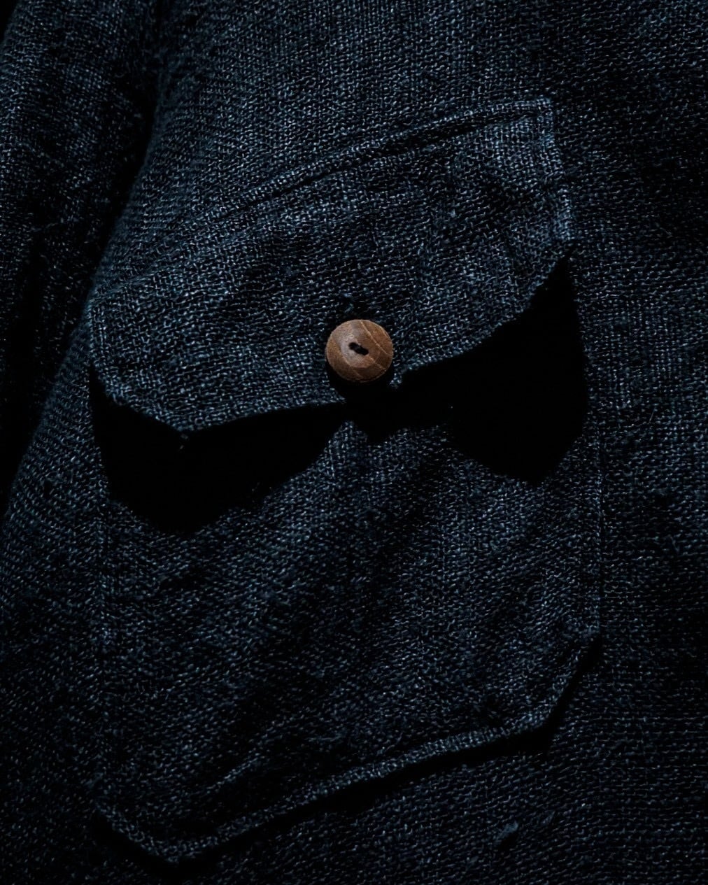 両胸にはフラップ付きポケットを配置し、ワークの文脈を感じさせつつも、全体のバランスはどこかミニマルで洗練された印象に。フロントには大ぶりのウッドボタンを採用し、素材感との相性も抜群です。