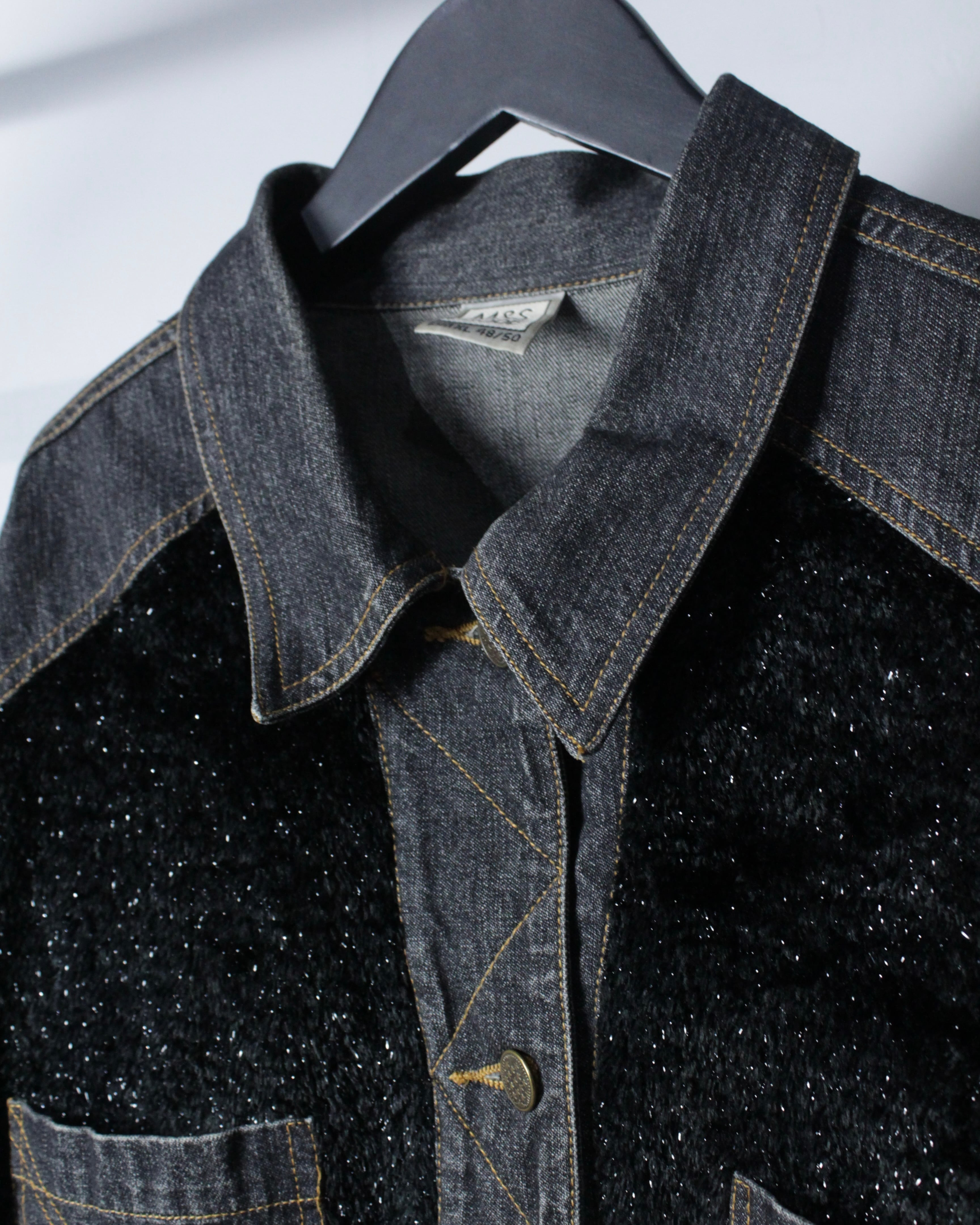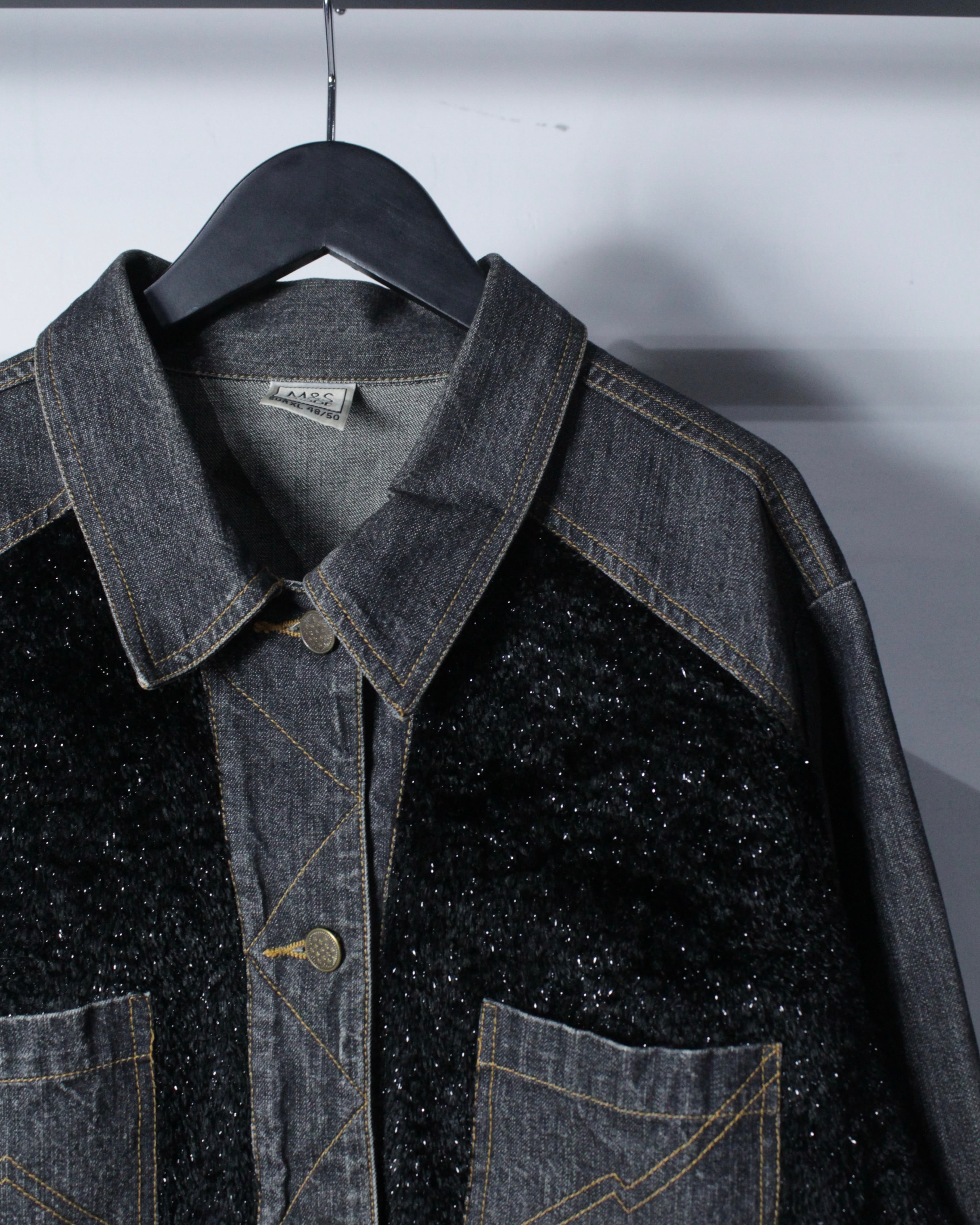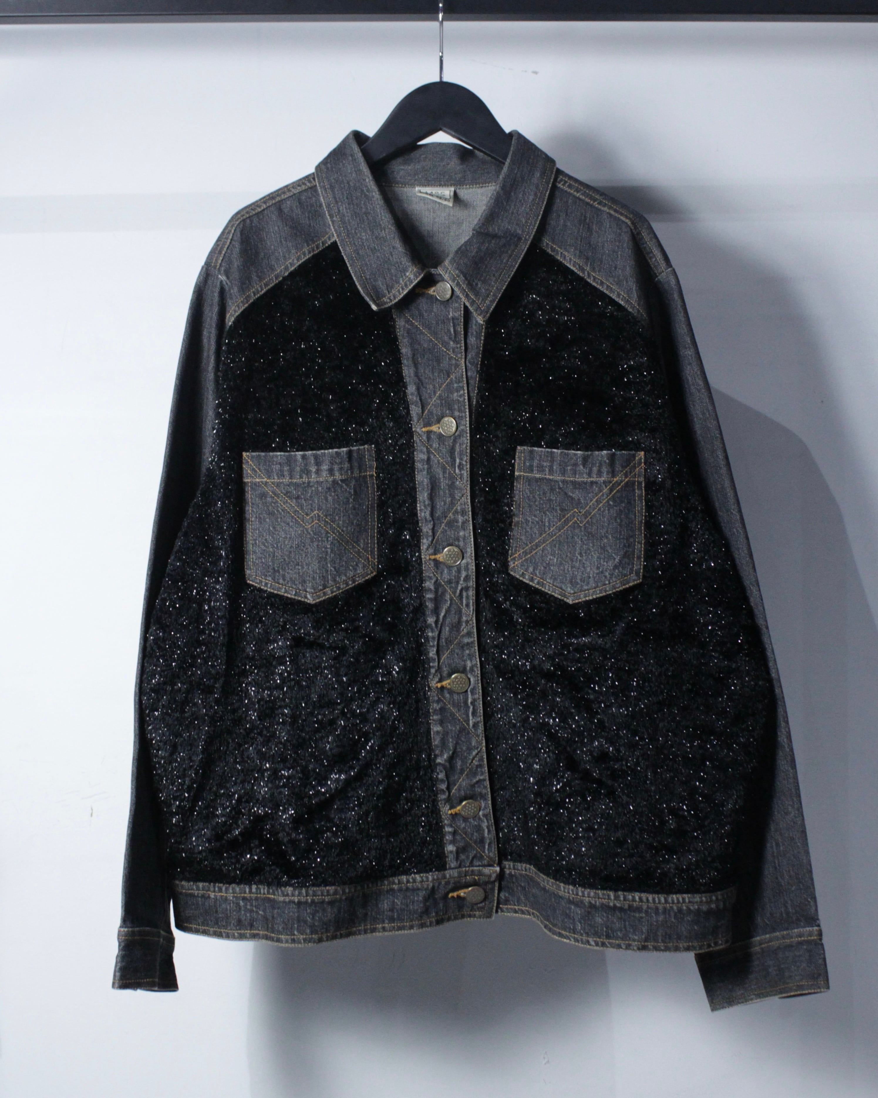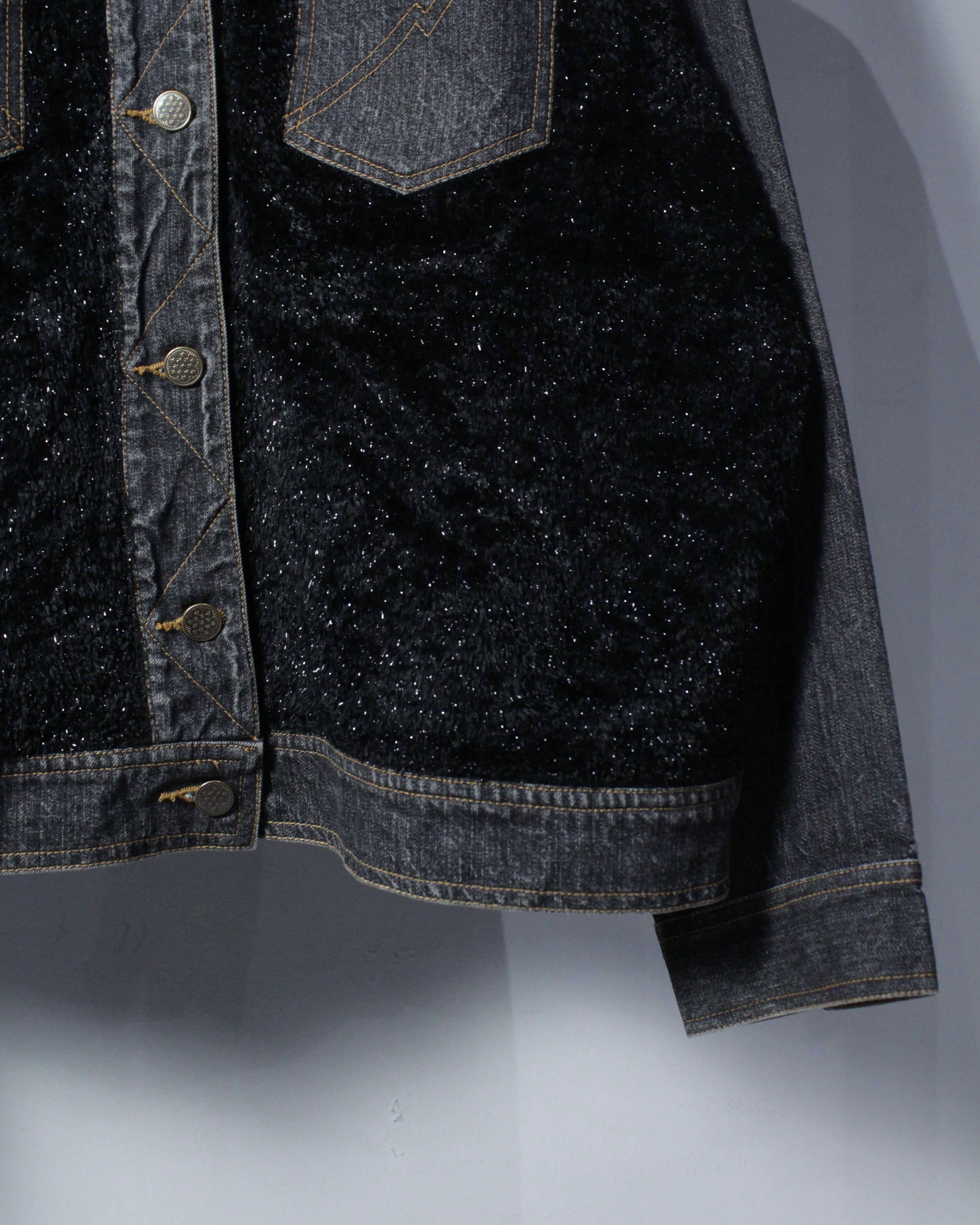 フェードの効いたブラックデニムをボディのベースに、身頃部分をラメ入りのフェイクファーで切り替えた90'sの稀有なデニムジャケット。