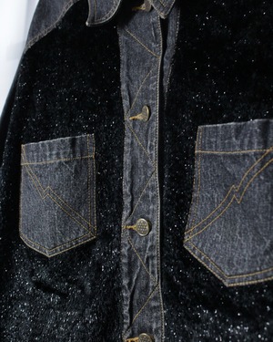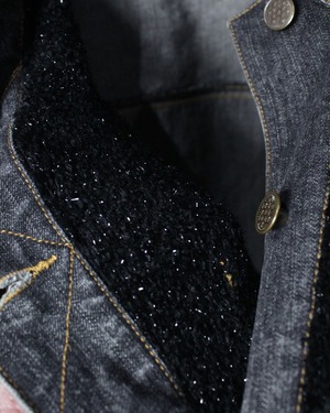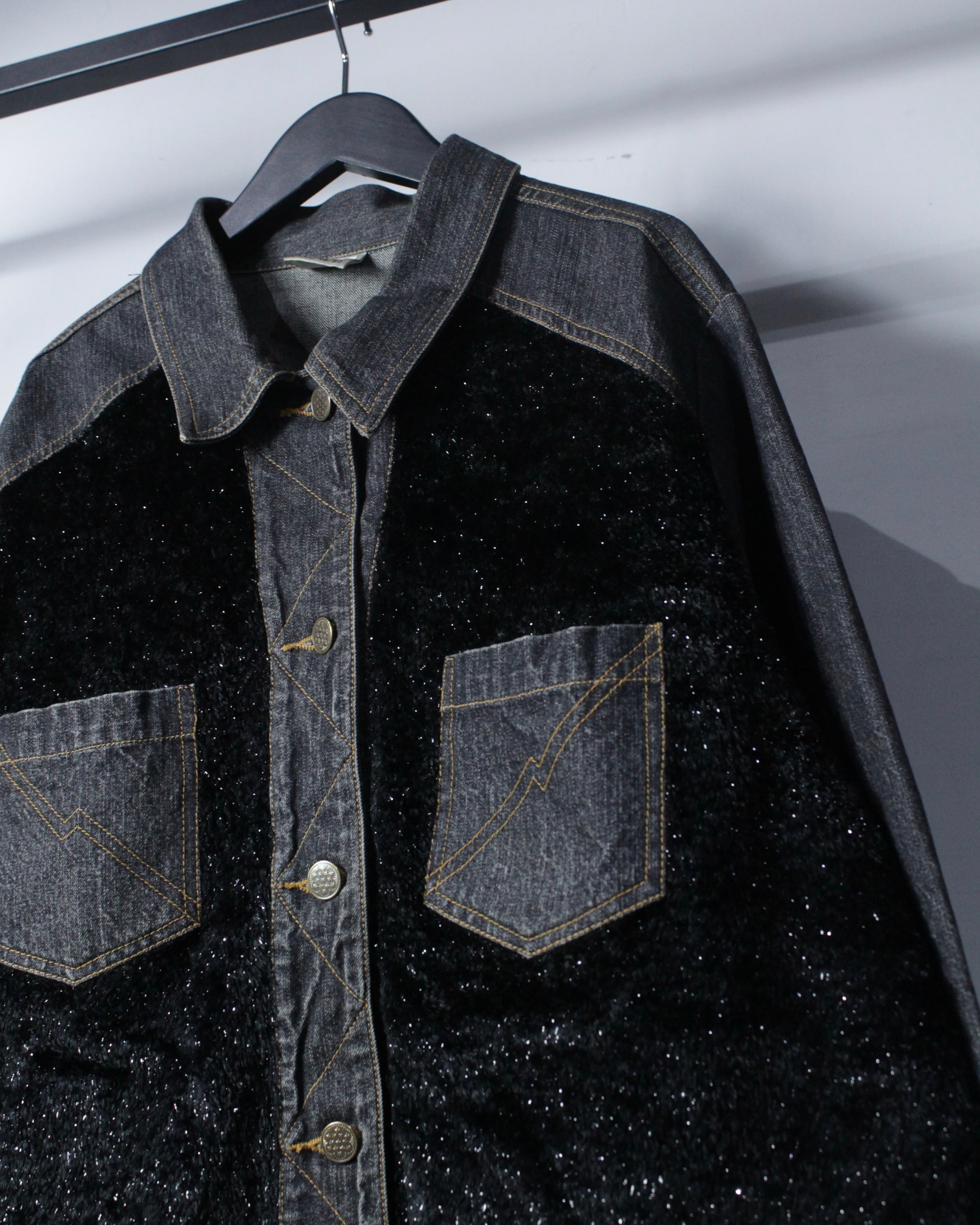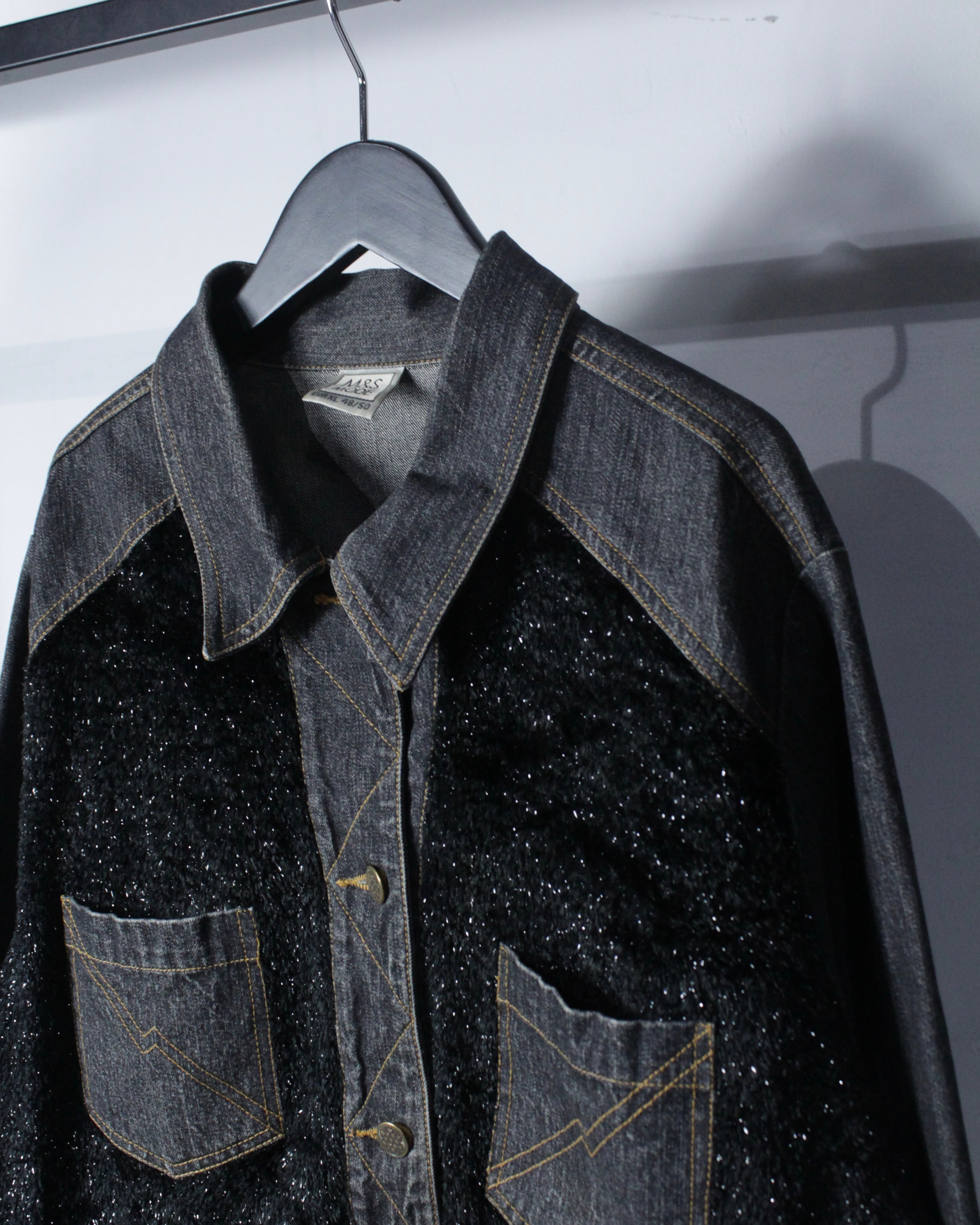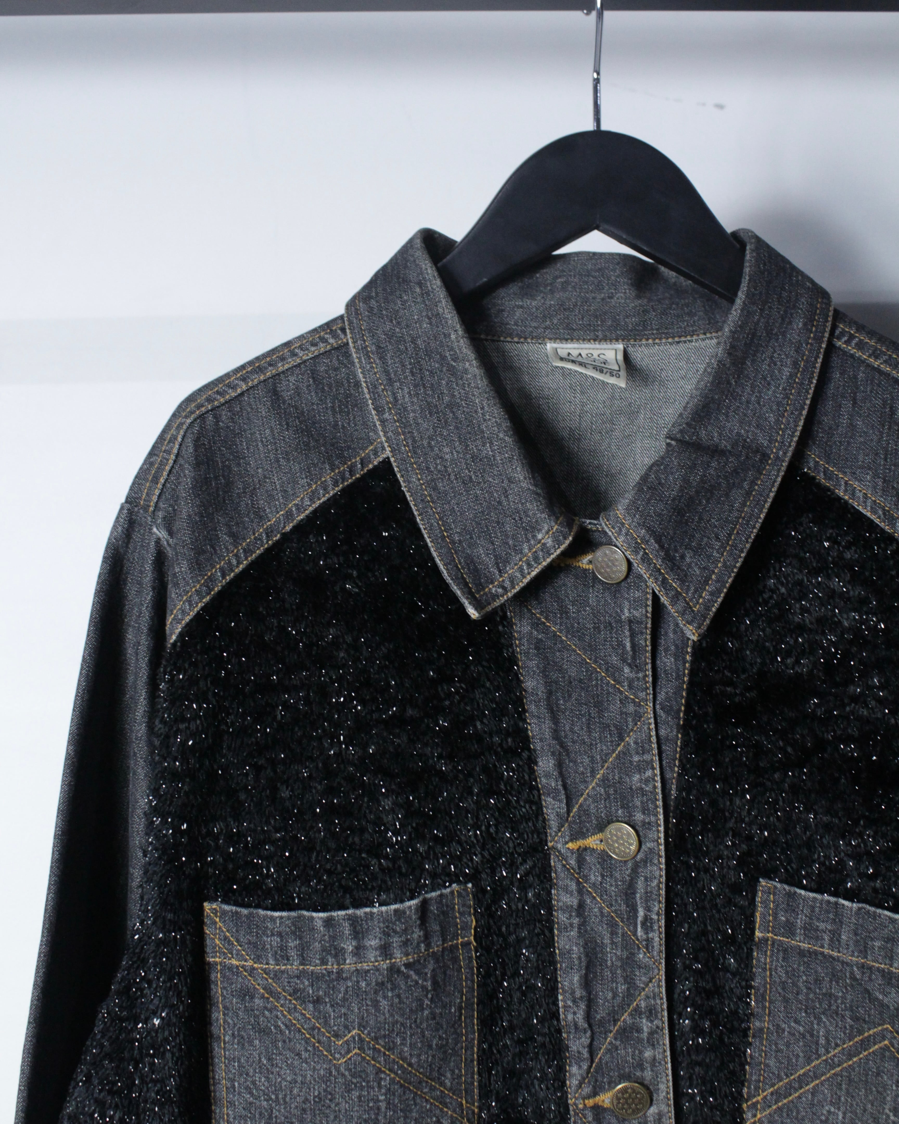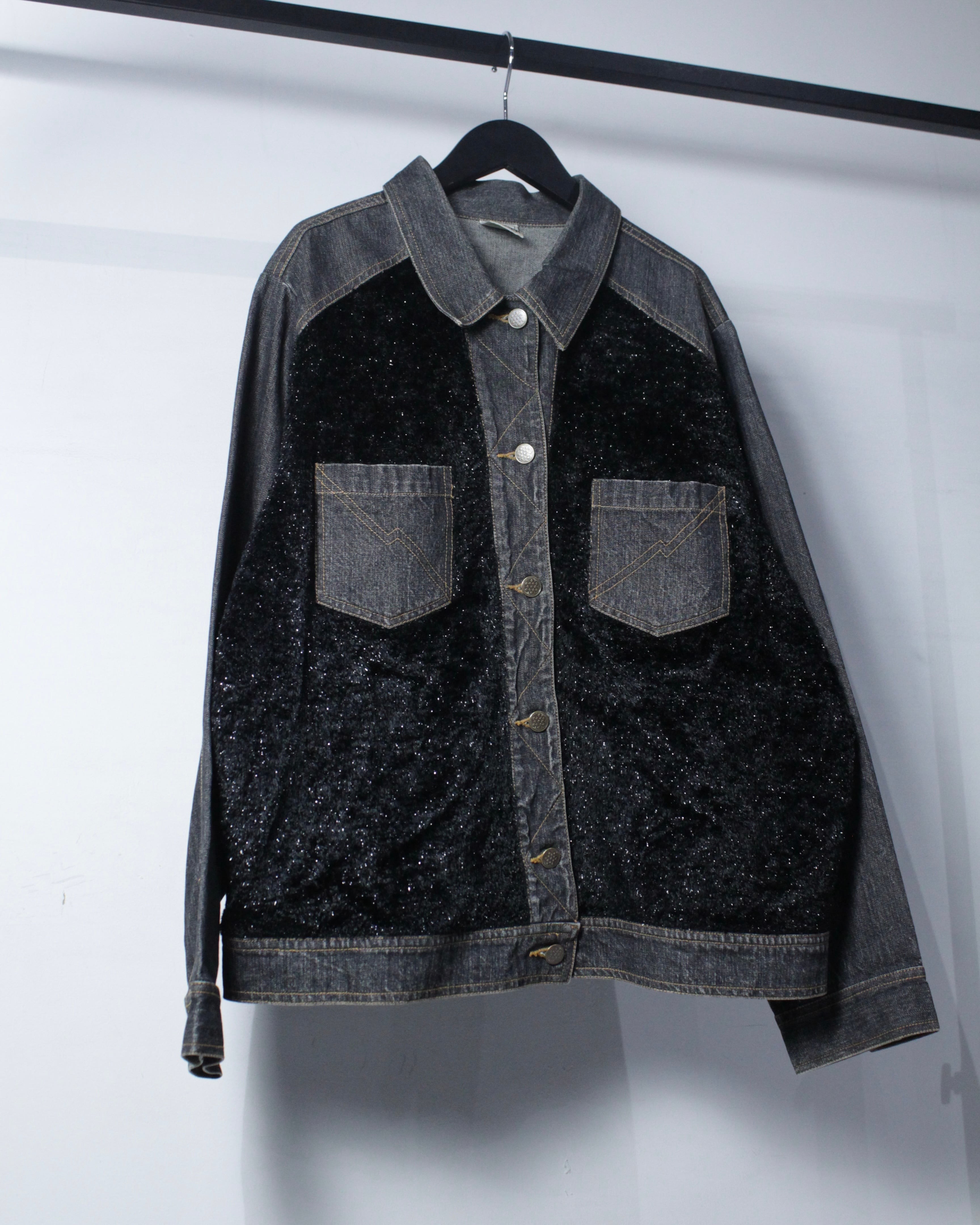 フェードの効いたブラックデニムをボディのベースに、身頃部分をラメ入りのフェイクファーで切り替えた90'sの稀有なデニムジャケット。