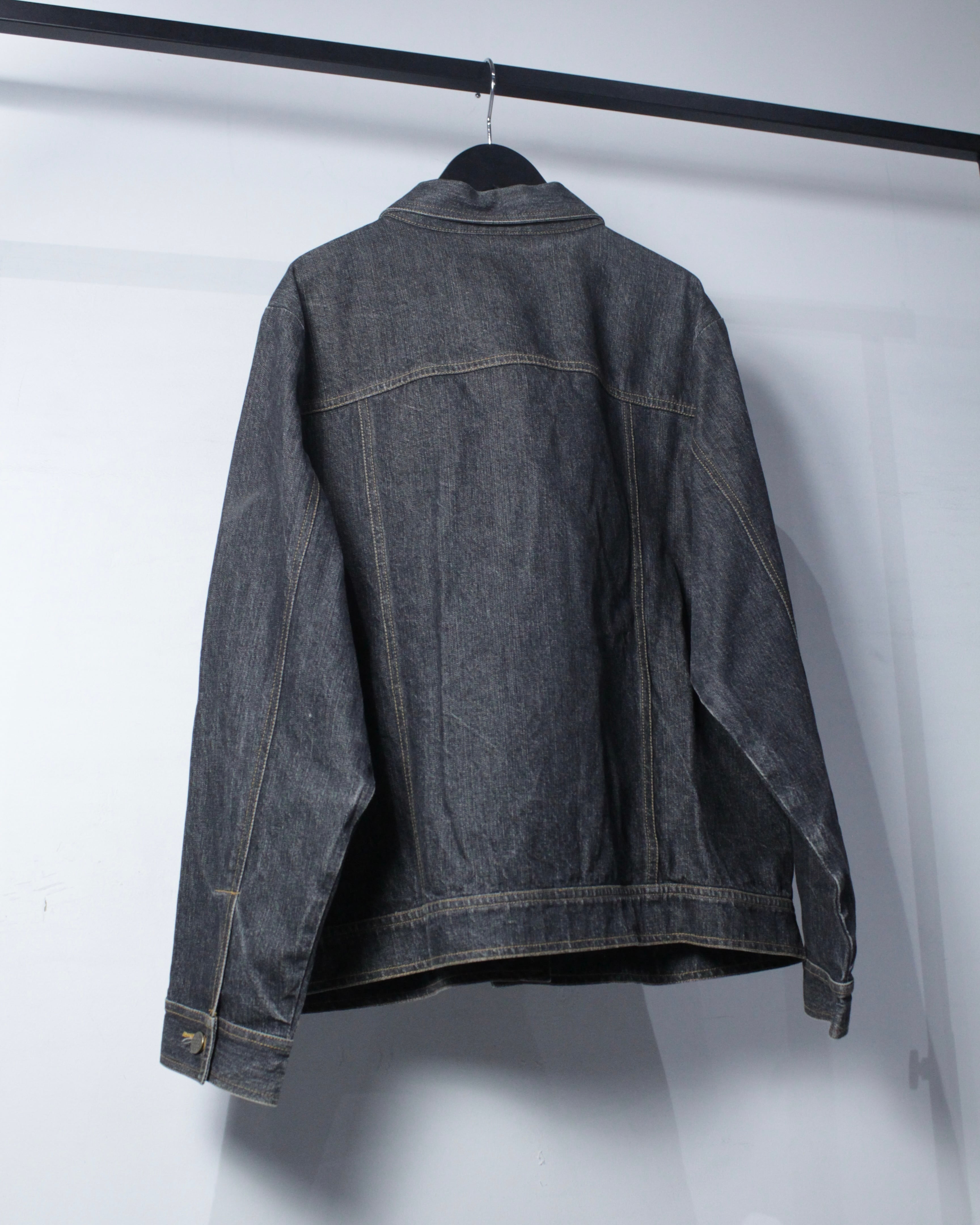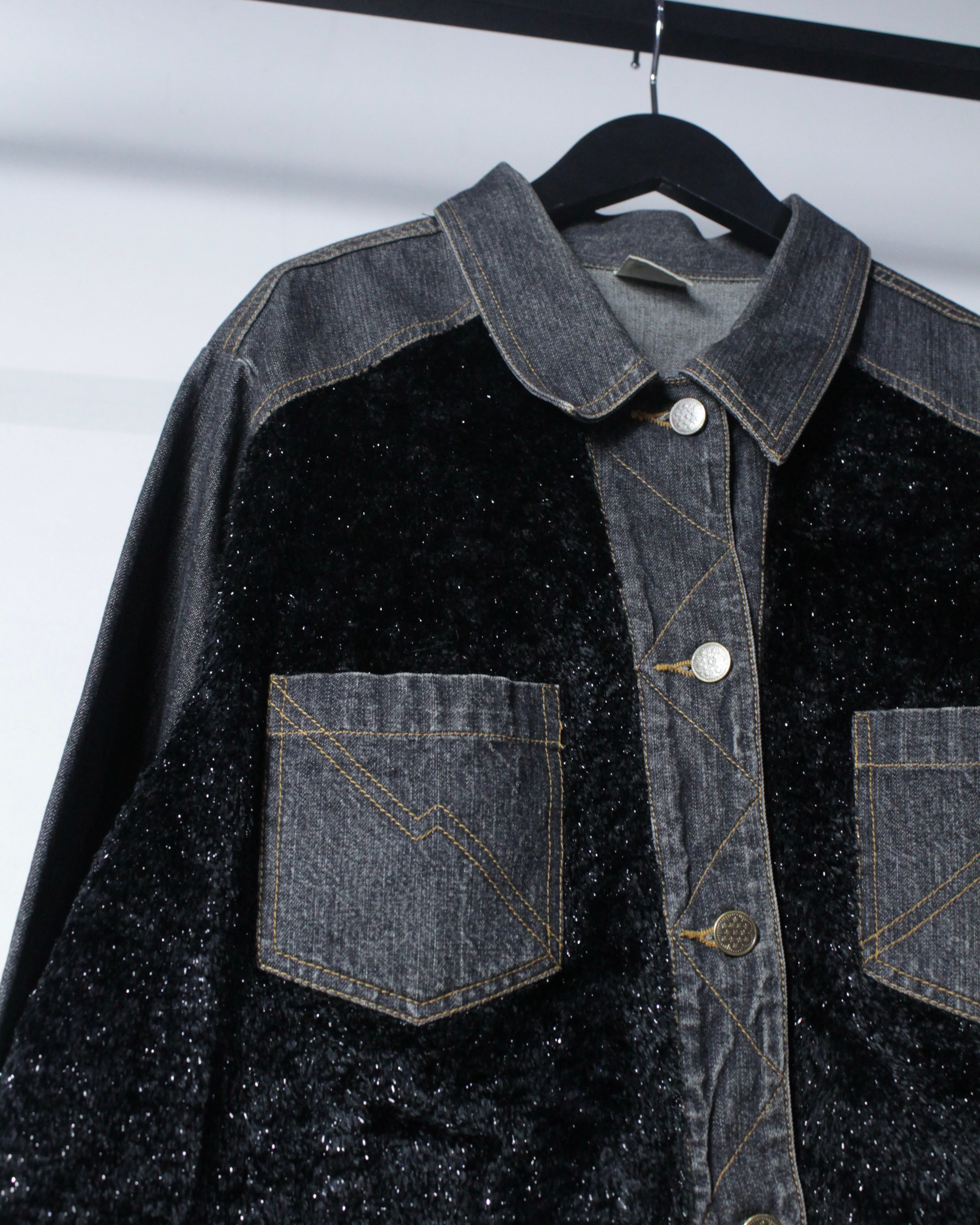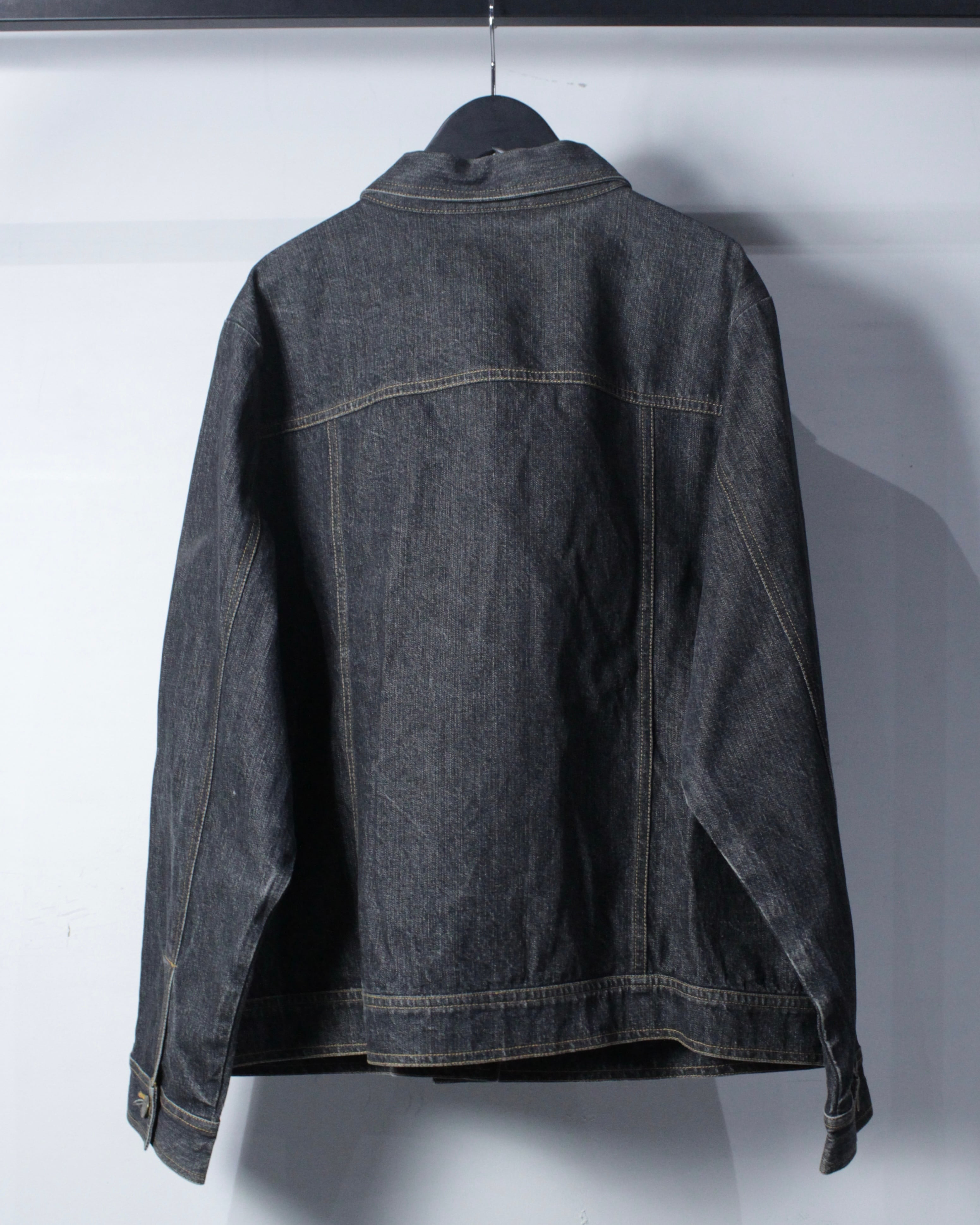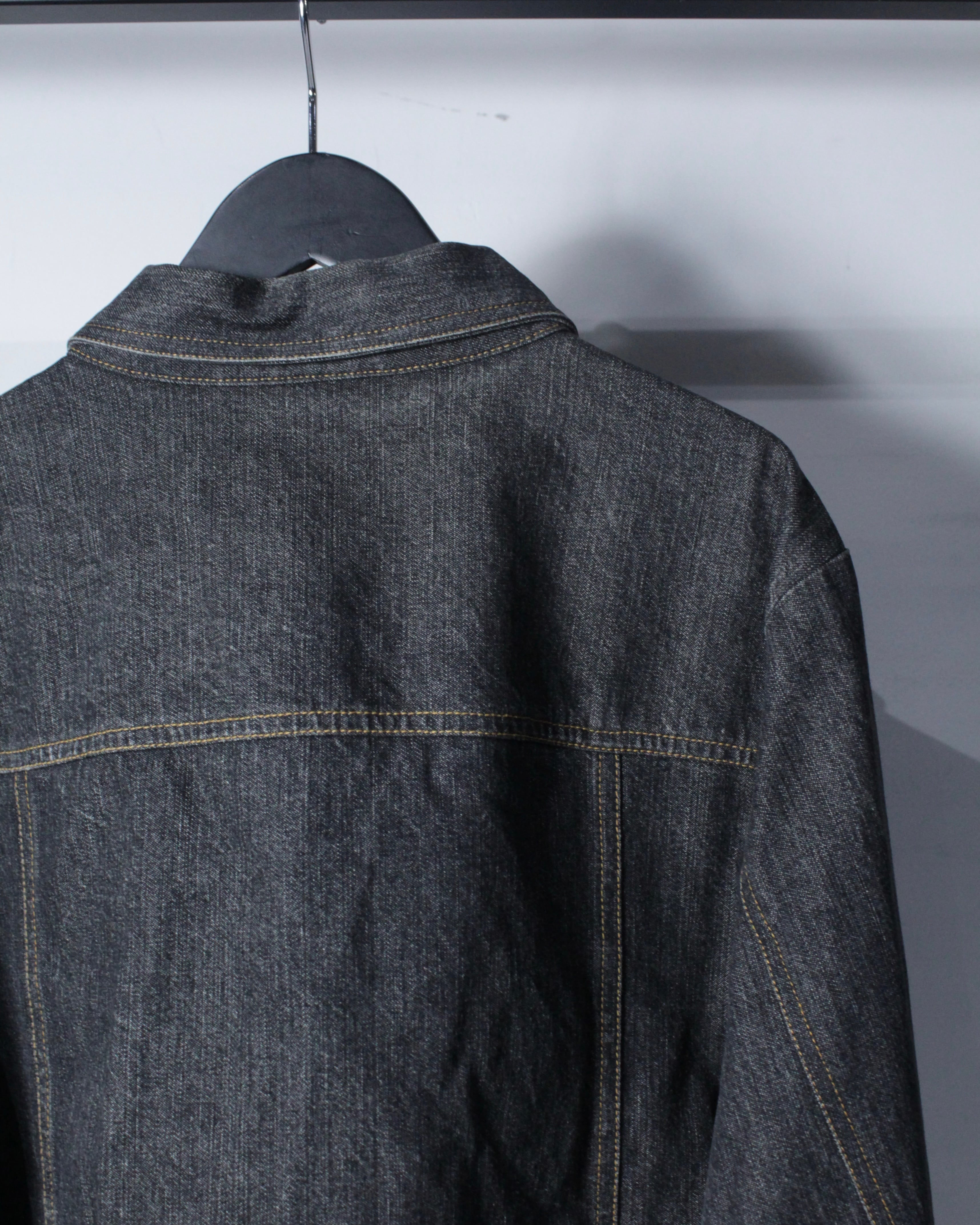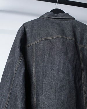 フェードの効いたブラックデニムをボディのベースに、身頃部分をラメ入りのフェイクファーで切り替えた90'sの稀有なデニムジャケット。