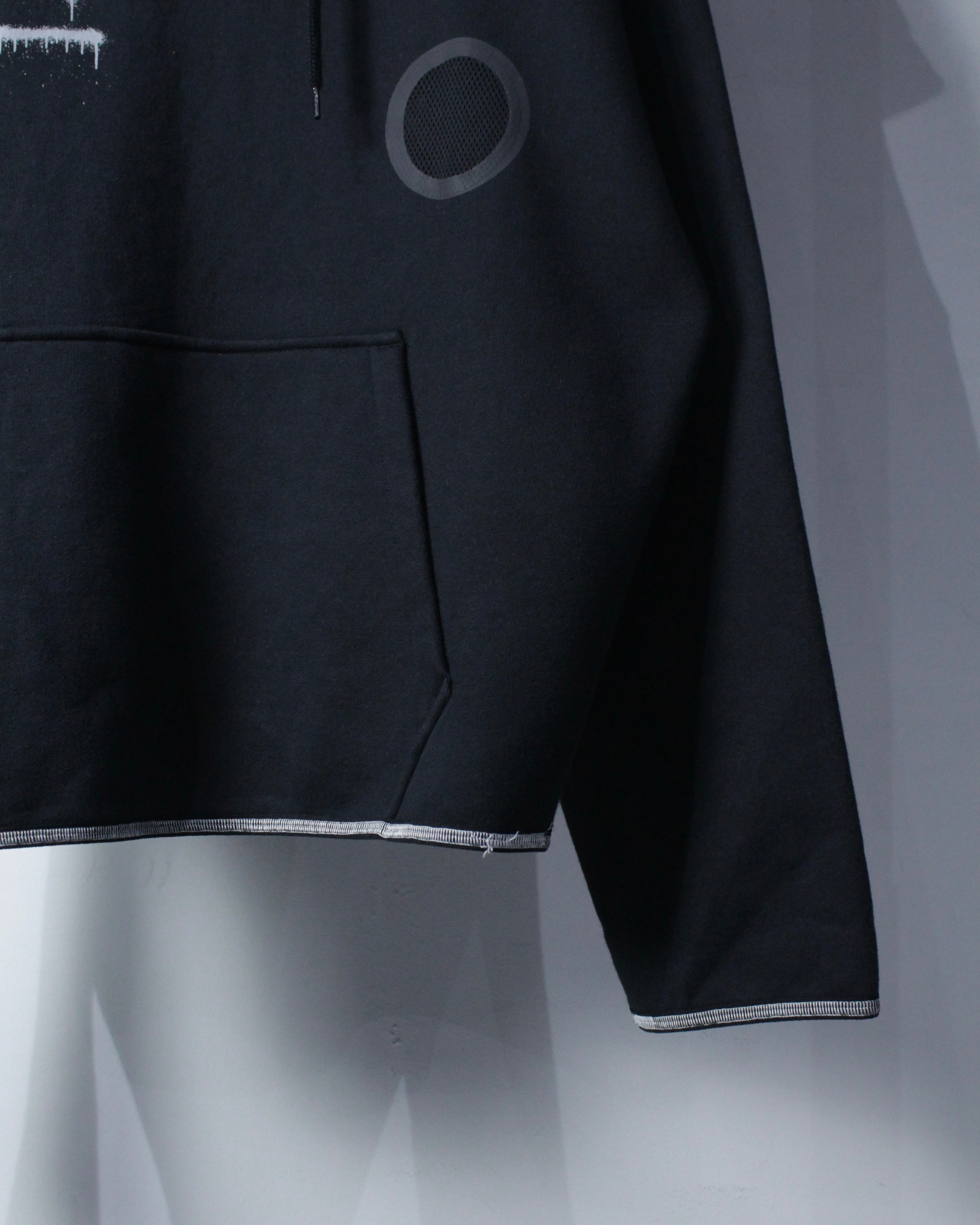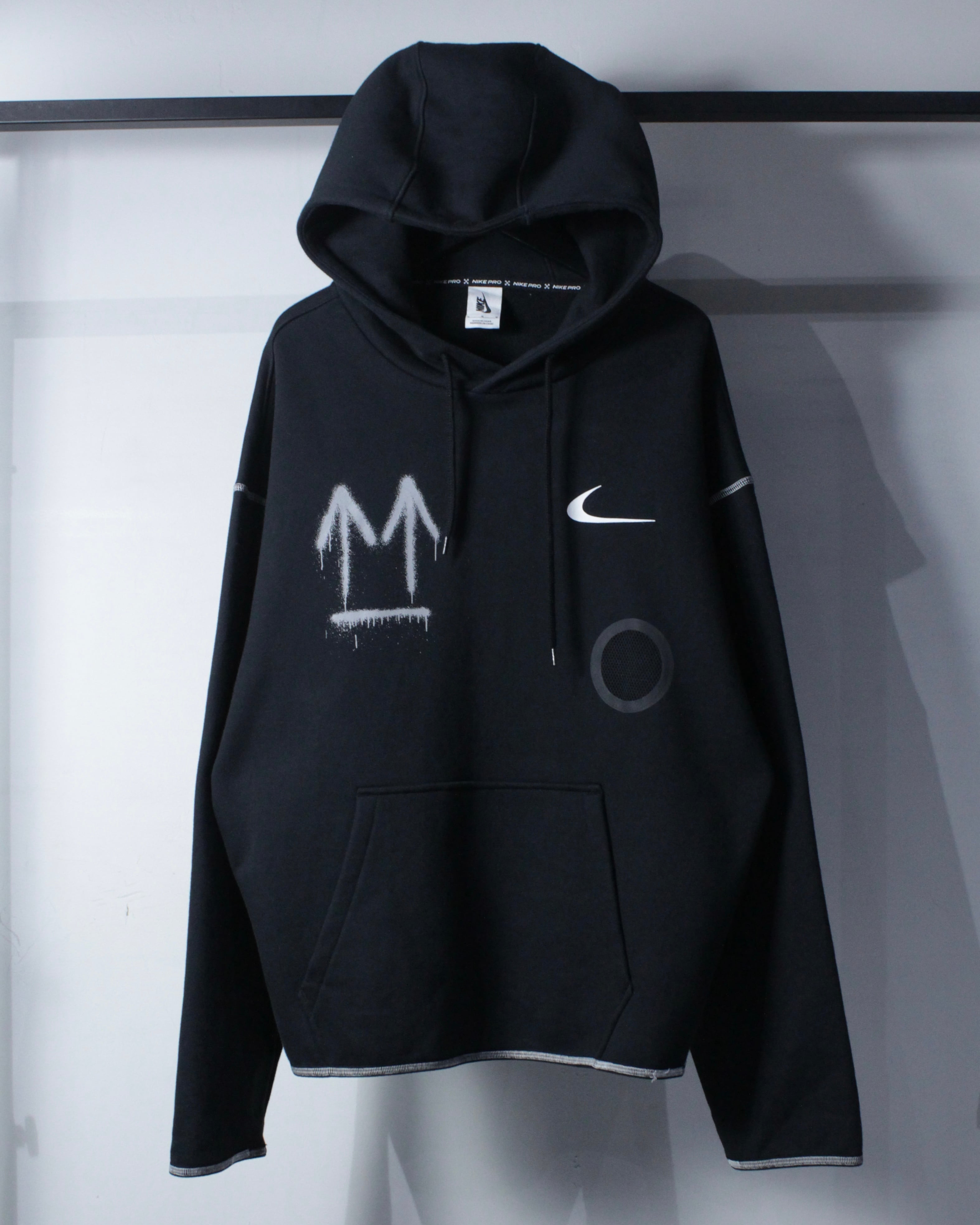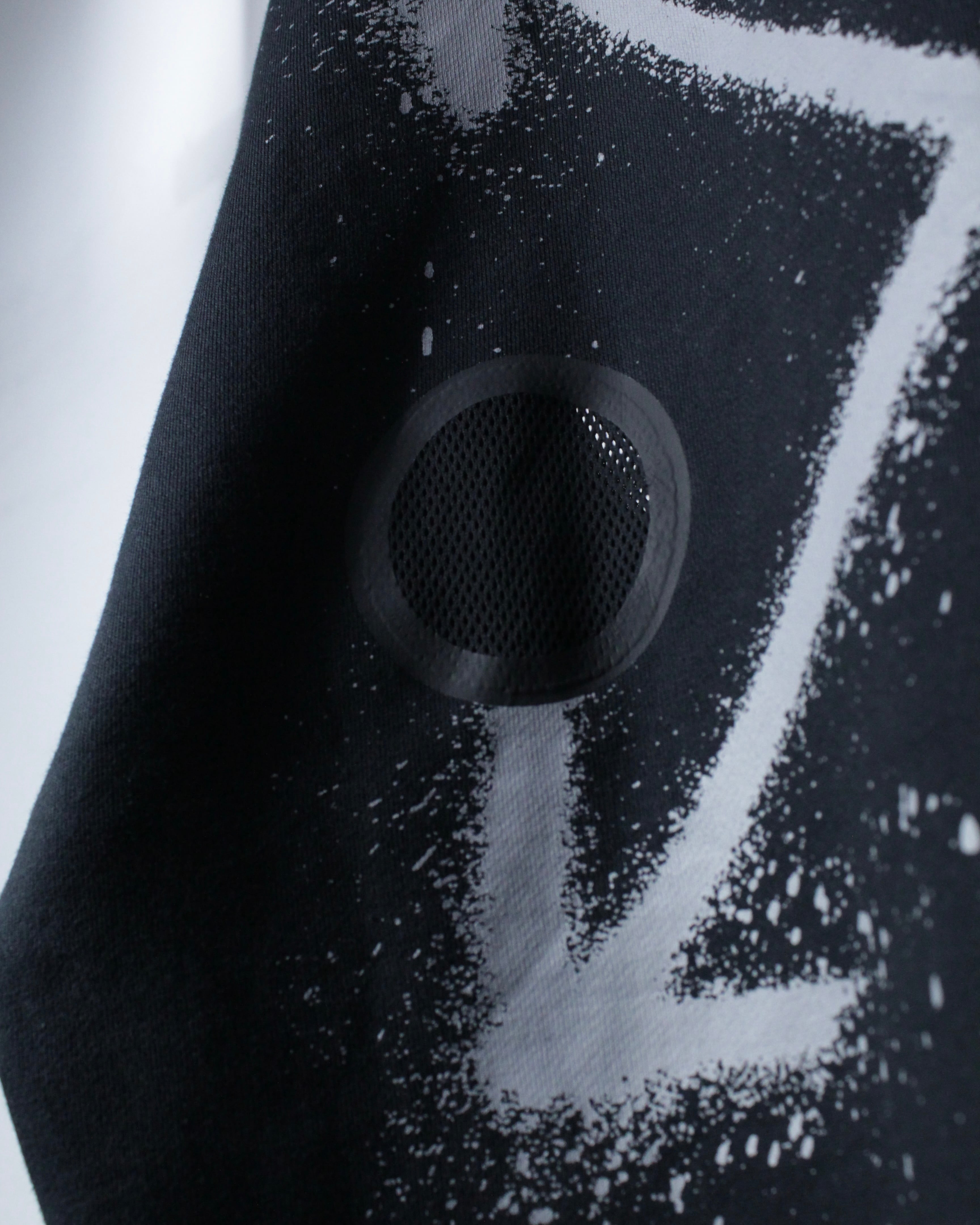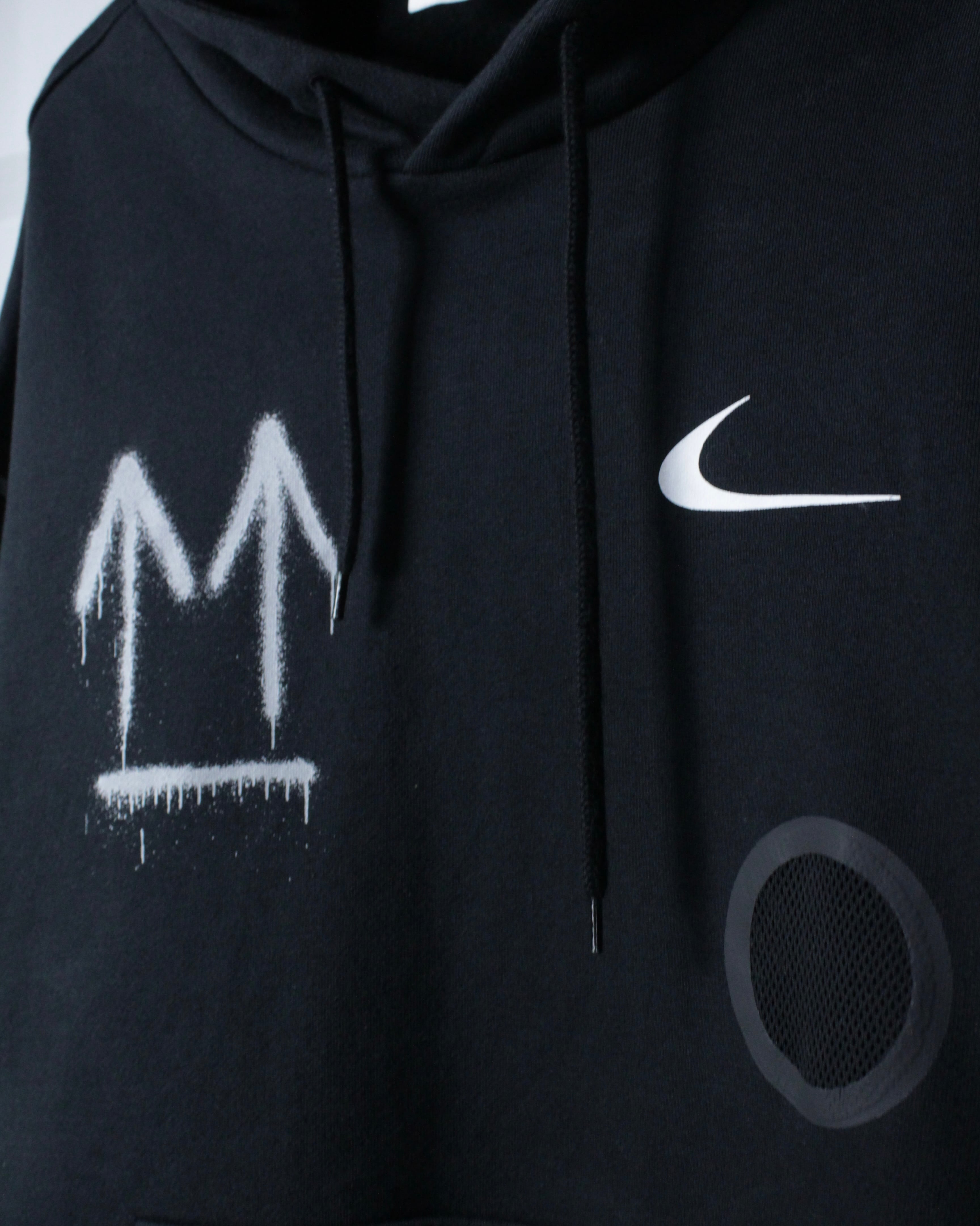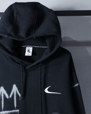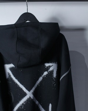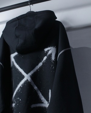 ブラックボディをベースに、フロント右胸にスプレー調の矢印、左胸にスウッシュロゴをON。バックには左胸と同様のスプレー調で描かれたアイコニックなクロスアローを大胆に配置した、ブランドらしいアート性を強く打ち出した一着。