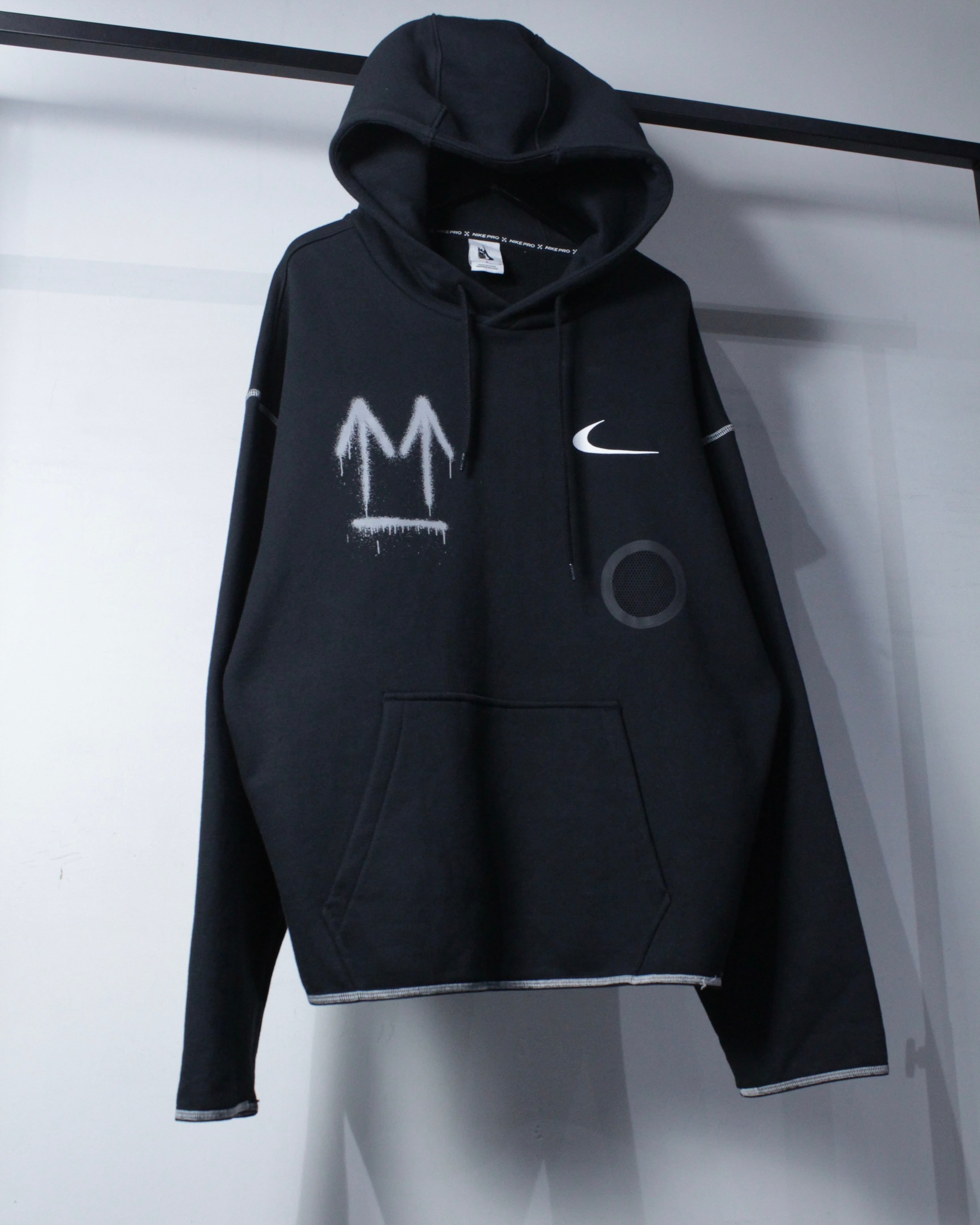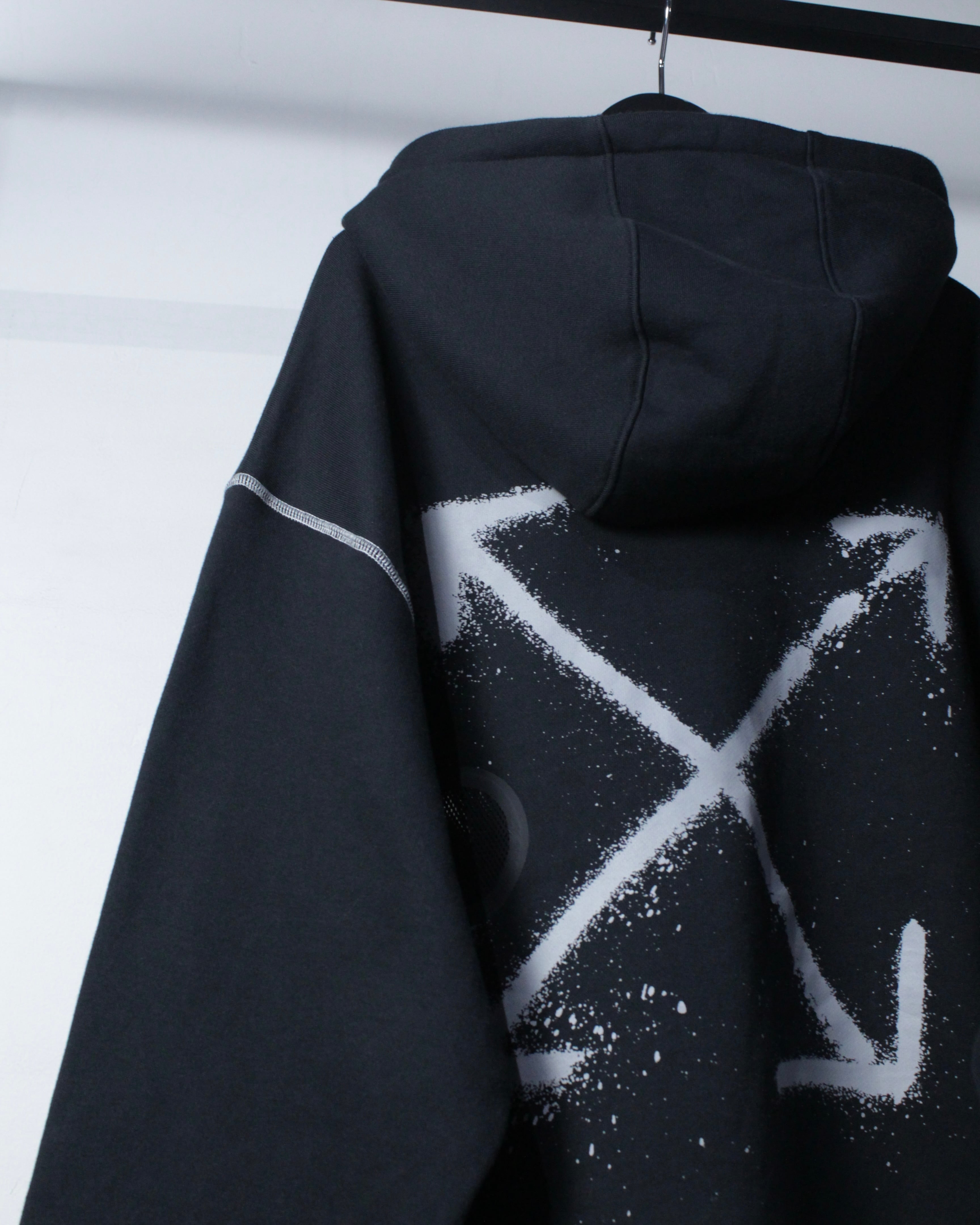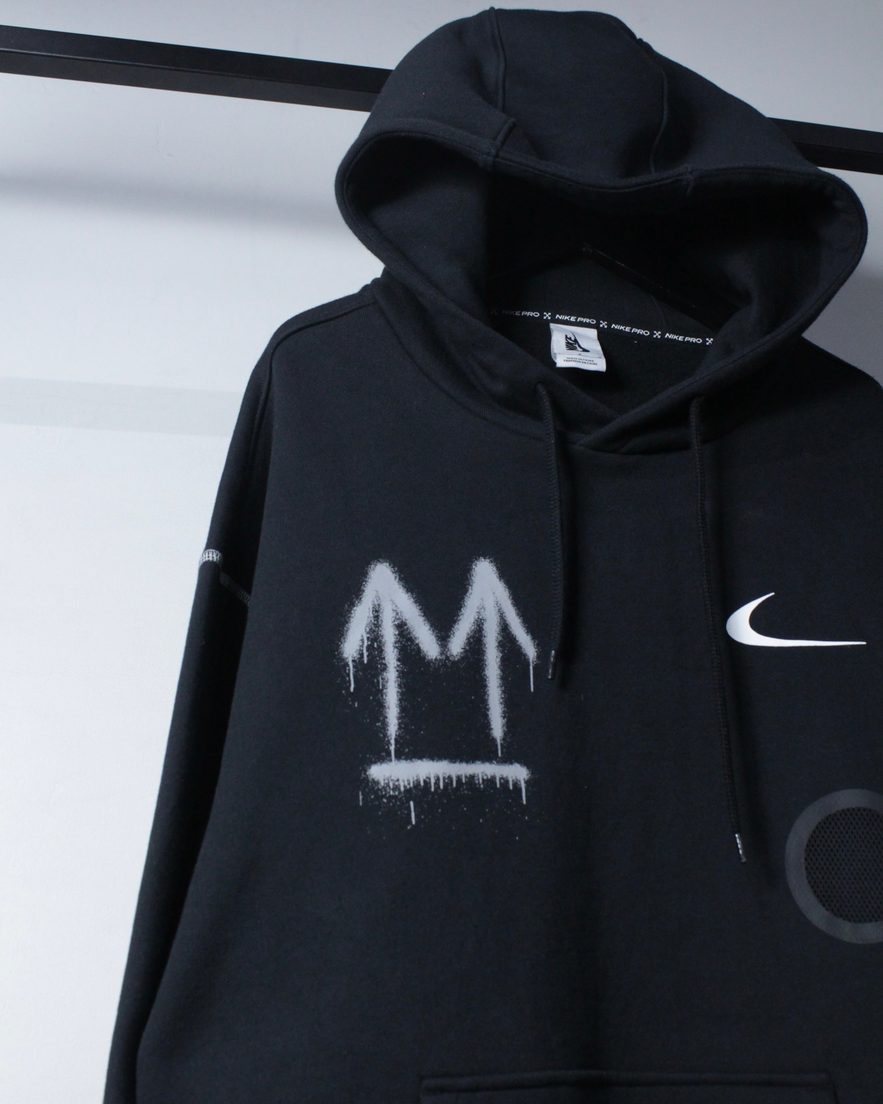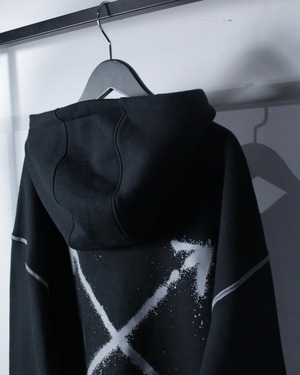 ブラックボディをベースに、フロント右胸にスプレー調の矢印、左胸にスウッシュロゴをON。バックには左胸と同様のスプレー調で描かれたアイコニックなクロスアローを大胆に配置した、ブランドらしいアート性を強く打ち出した一着。