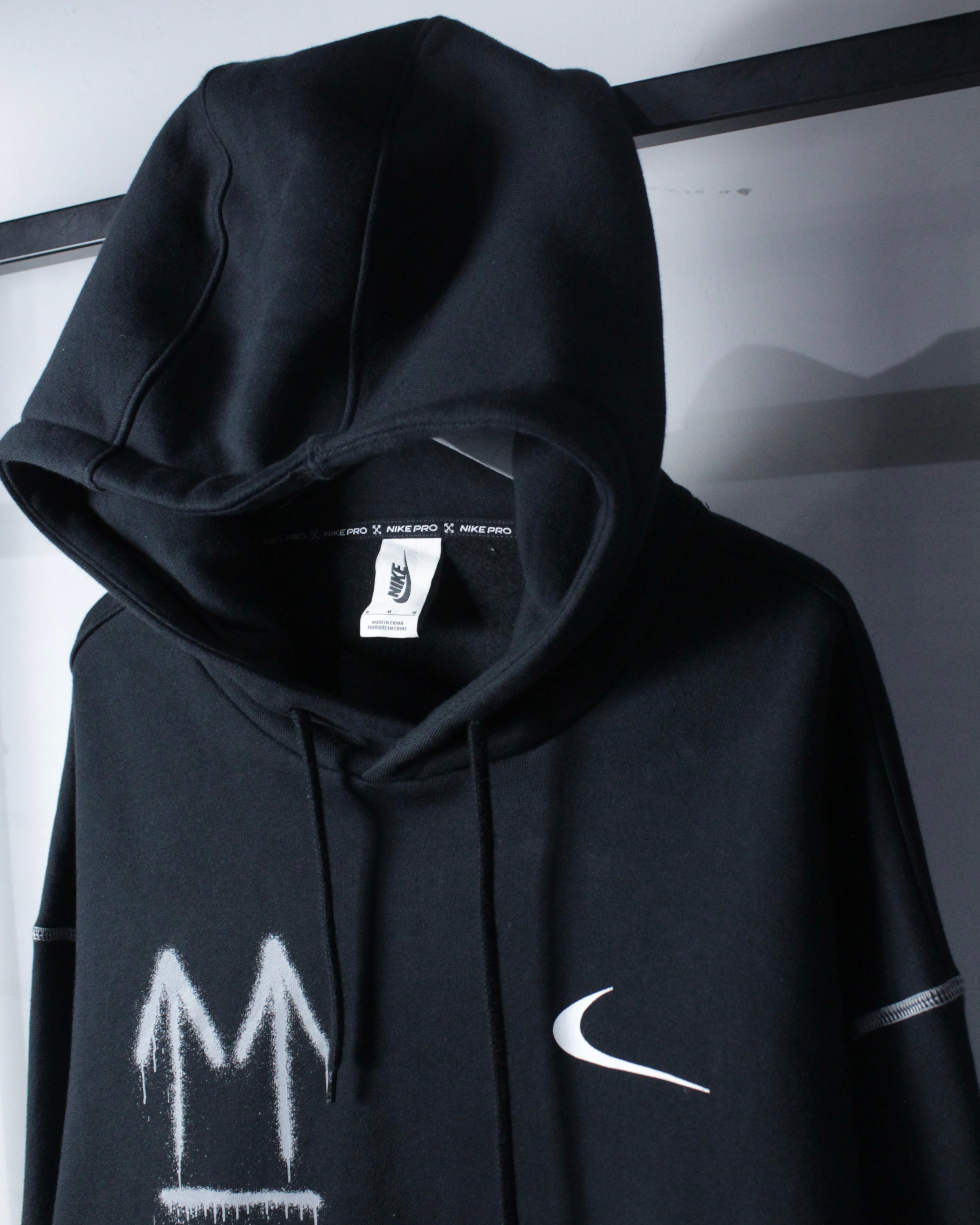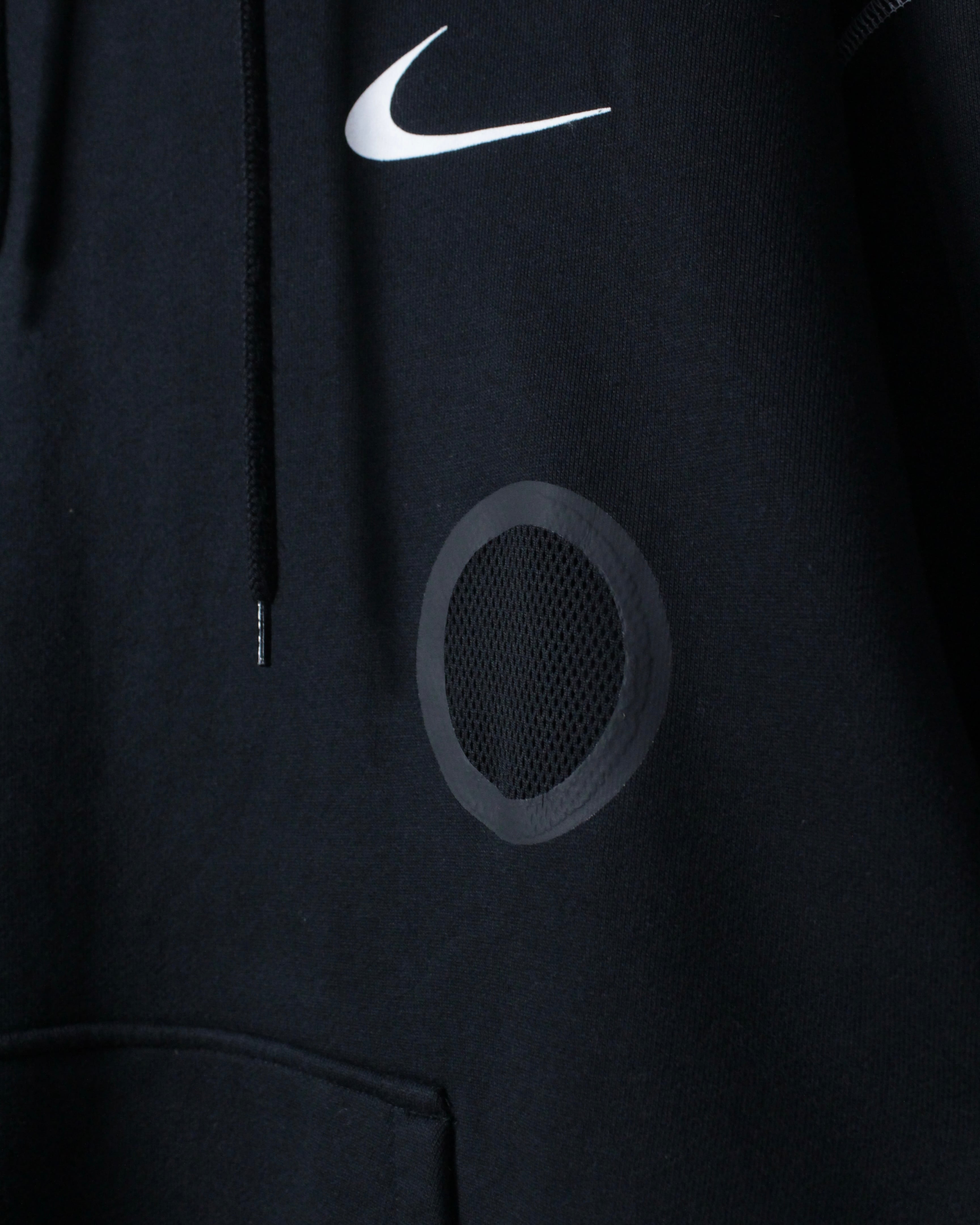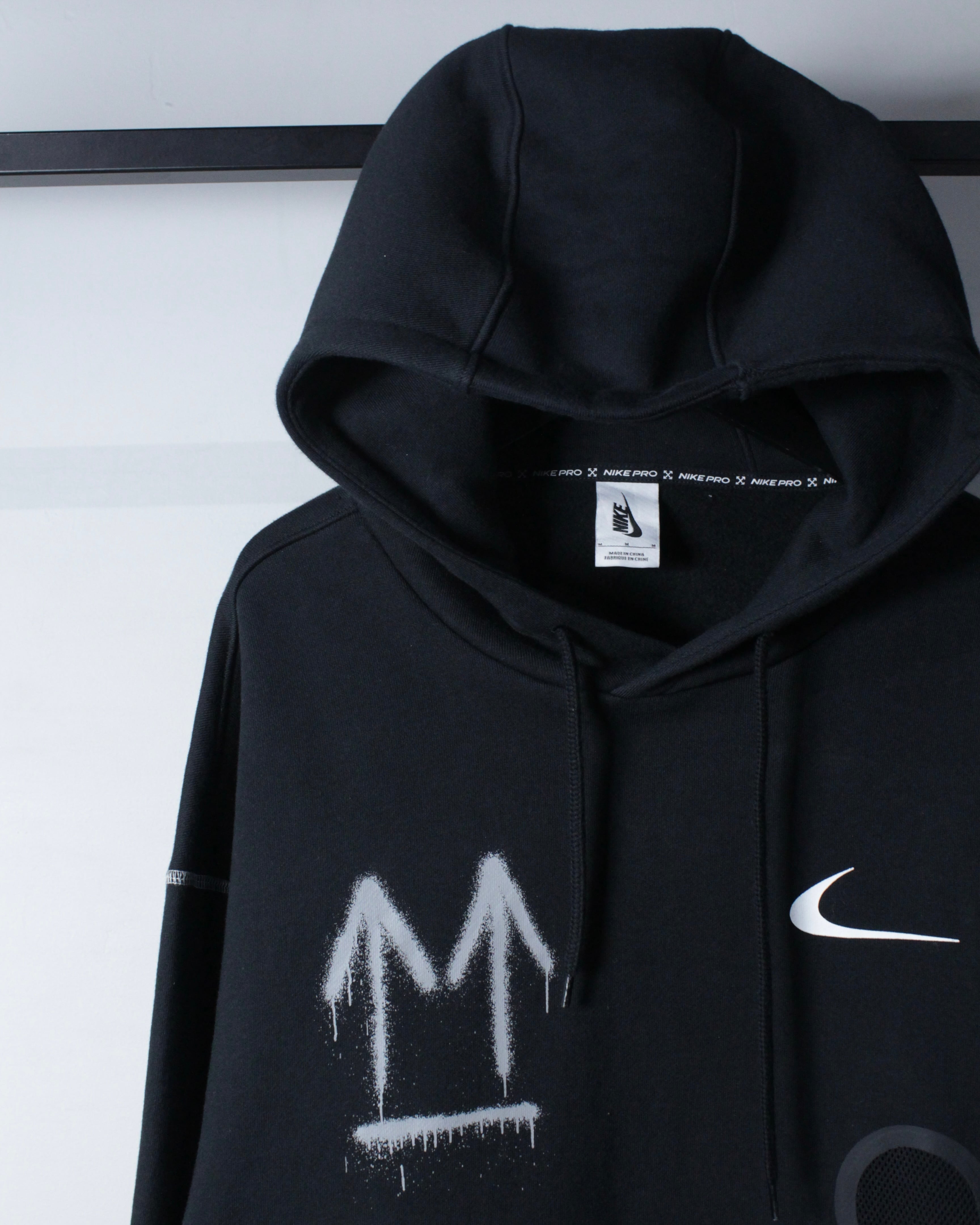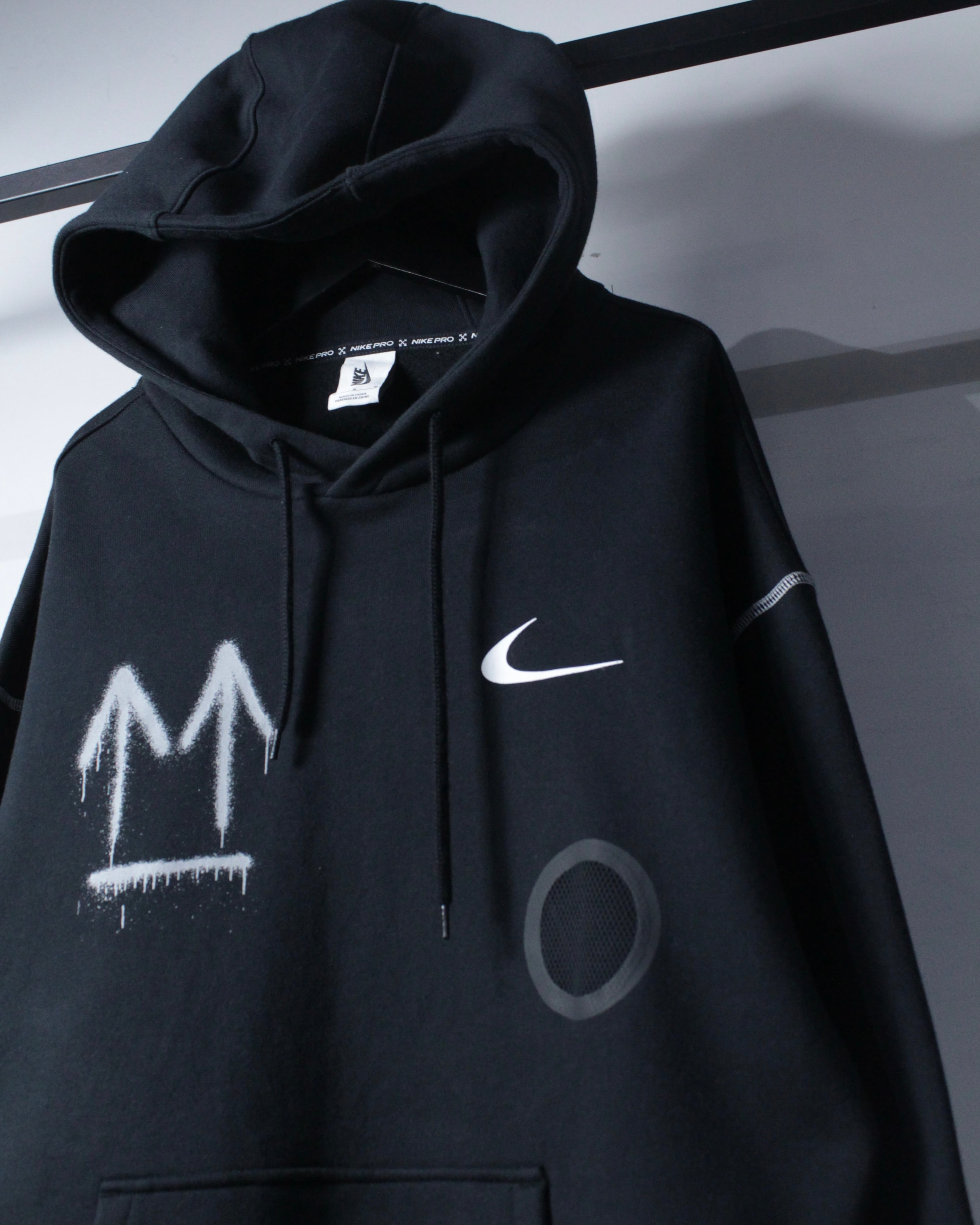 ブラックボディをベースに、フロント右胸にスプレー調の矢印、左胸にスウッシュロゴをON。バックには左胸と同様のスプレー調で描かれたアイコニックなクロスアローを大胆に配置した、ブランドらしいアート性を強く打ち出した一着。