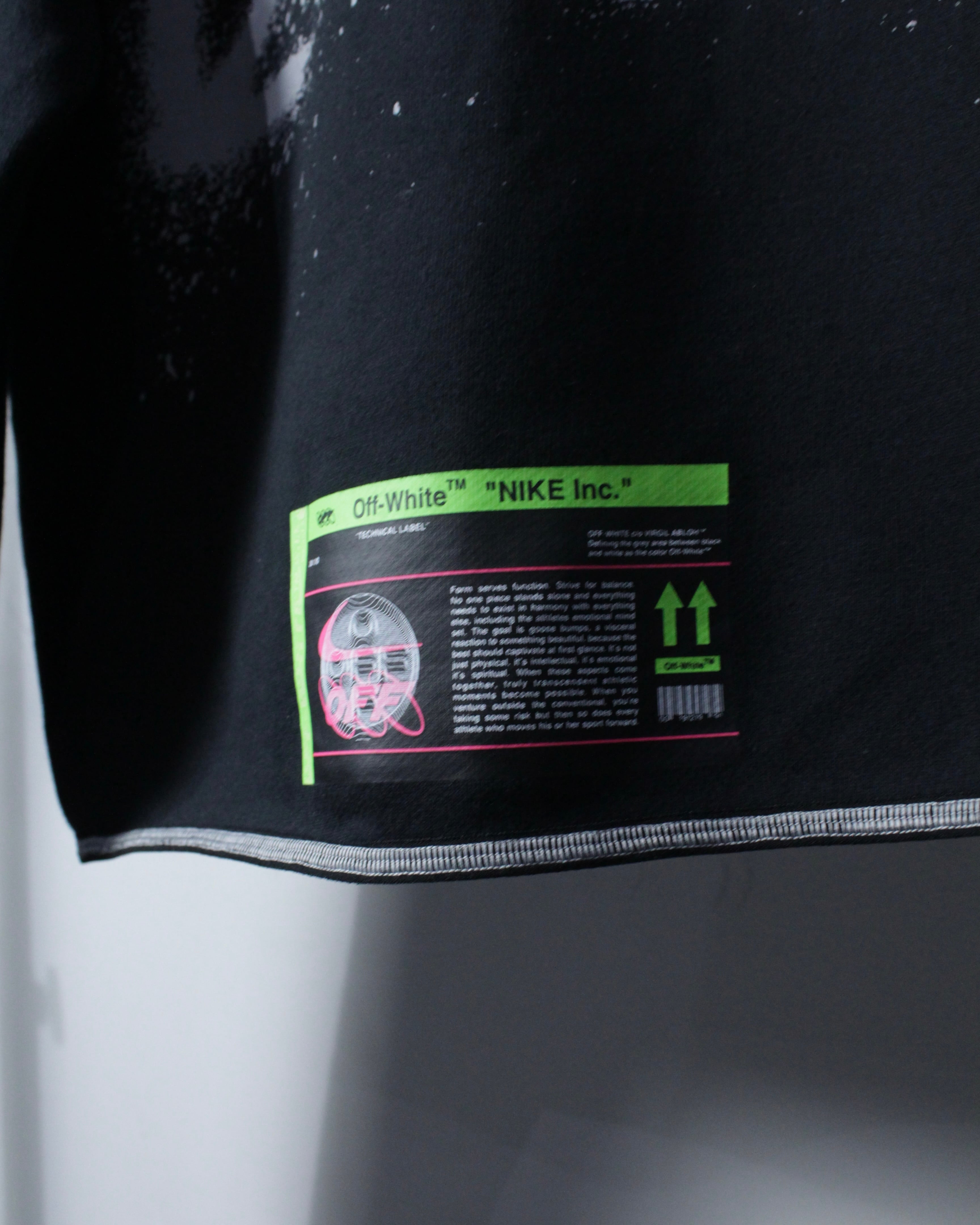 既存のスポーツウェアにストリートアートの文脈を落とし込んだデザインが◎裾にはテクニカルなデザインのラベルを配置し、Off-Whiteらしいインダストリアルな要素が抜かりなく反映されています。