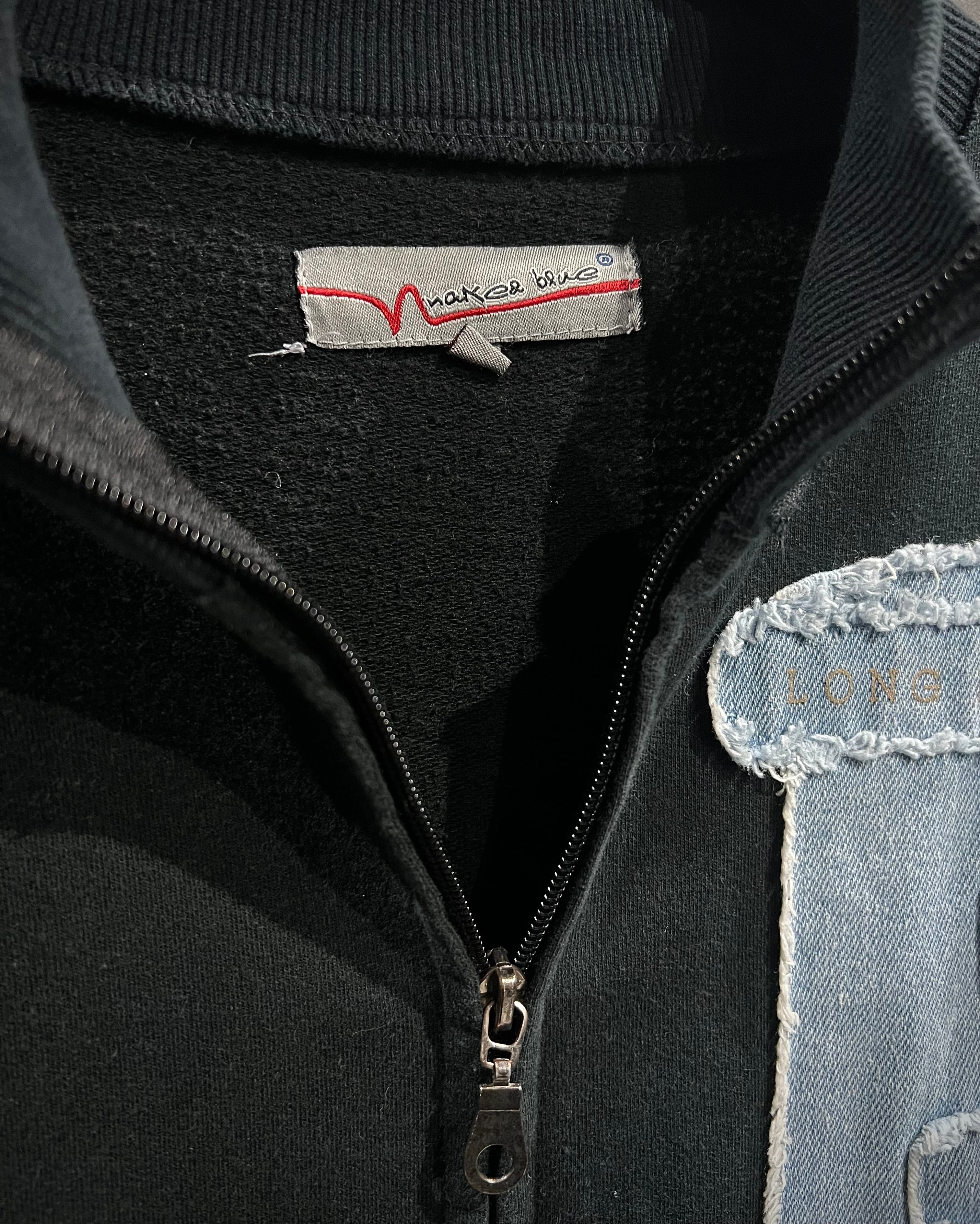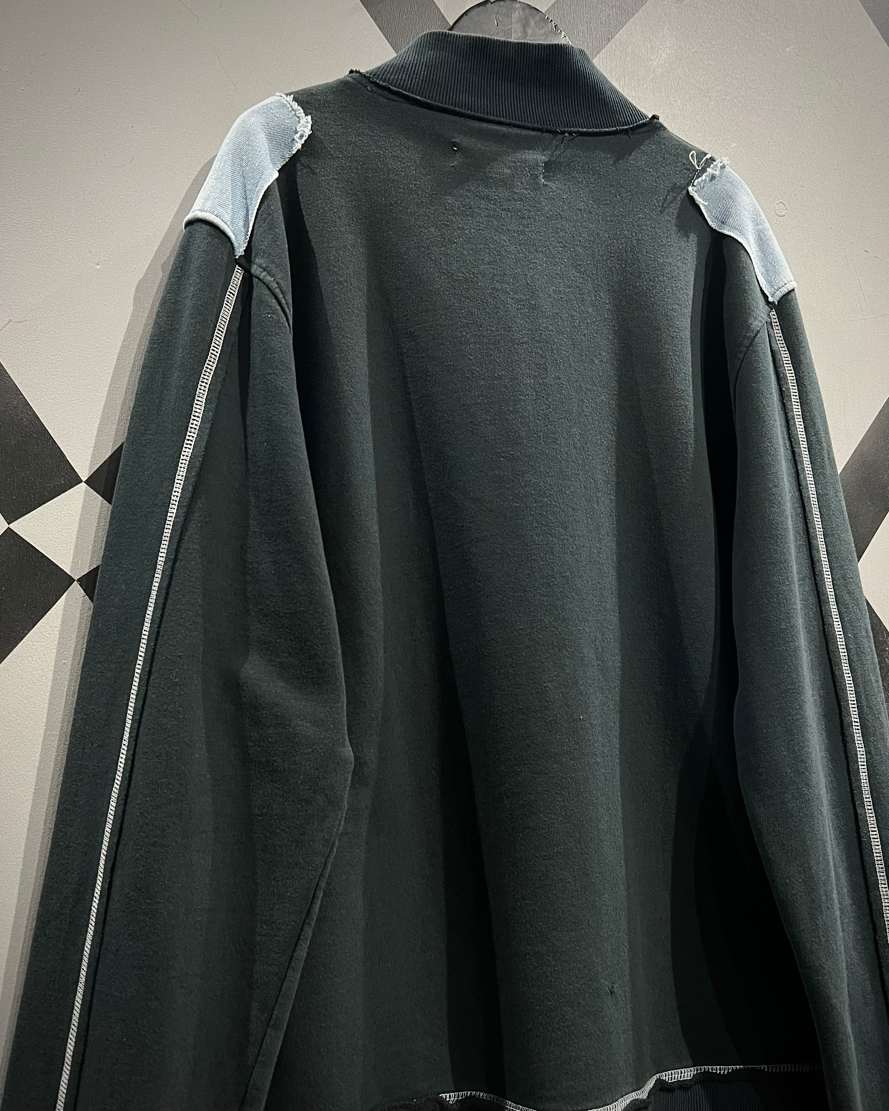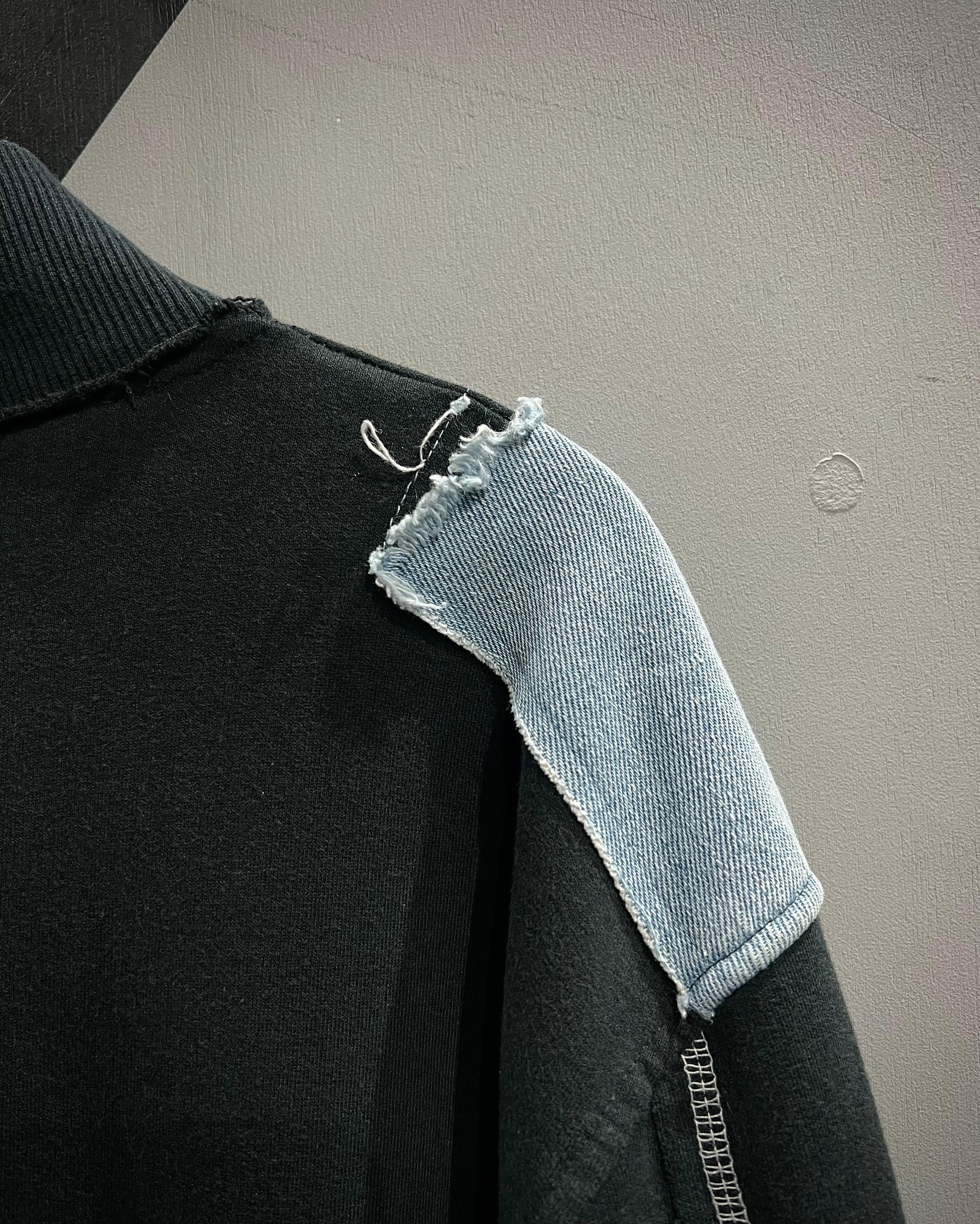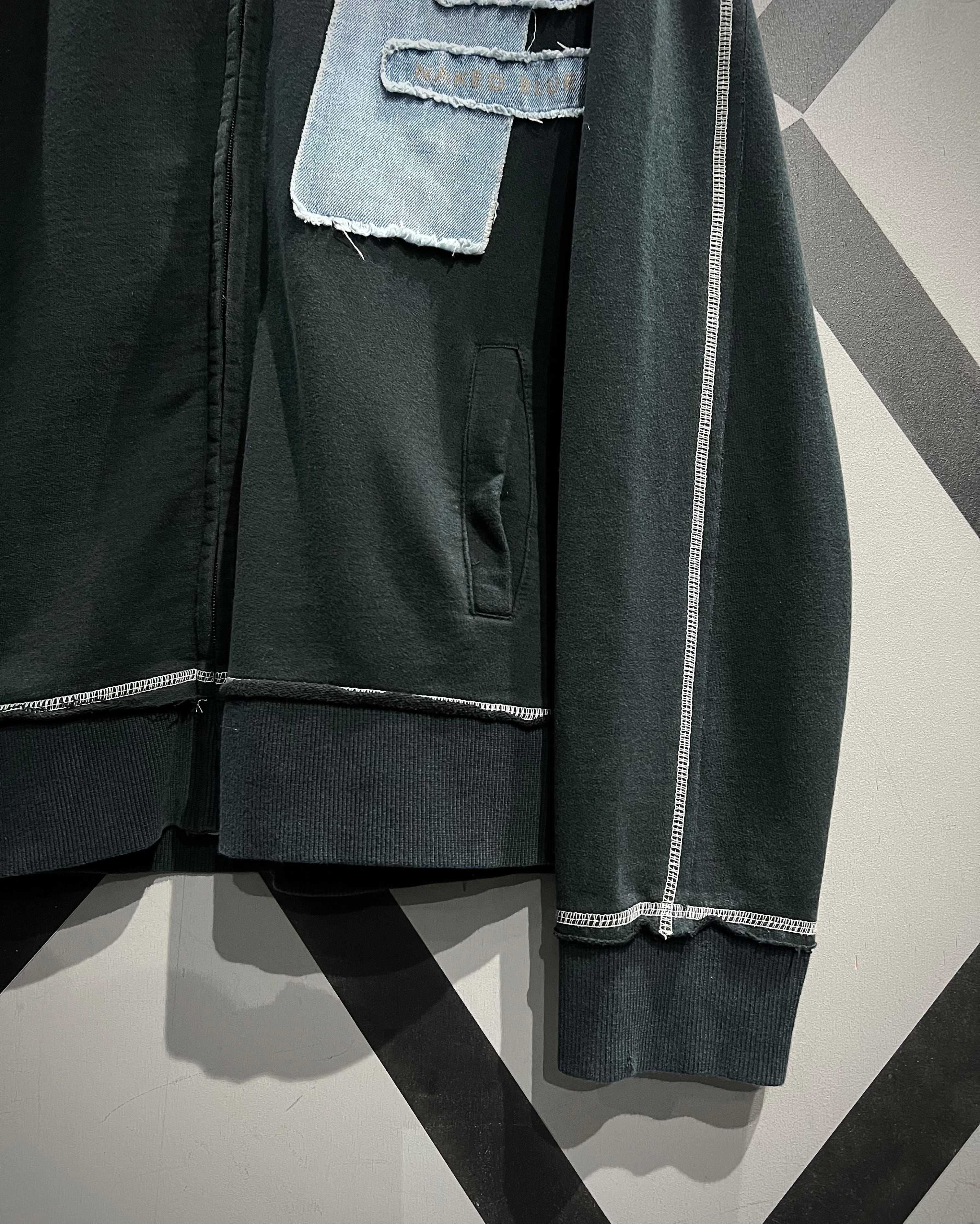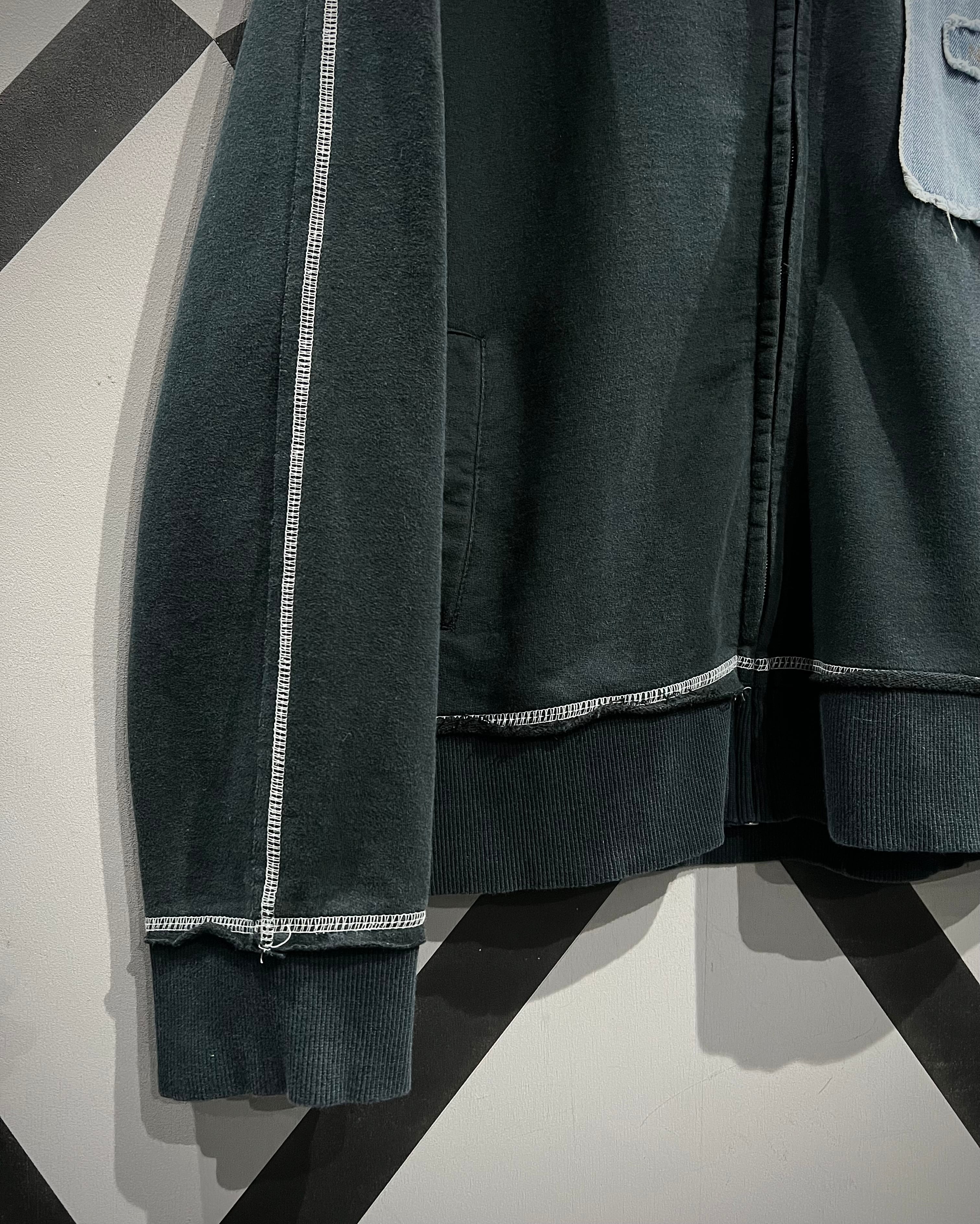 ブラックのスウェットボディをベースに、随所に施されたデニムパッチワークが存在感を放つスウェットジャケット。