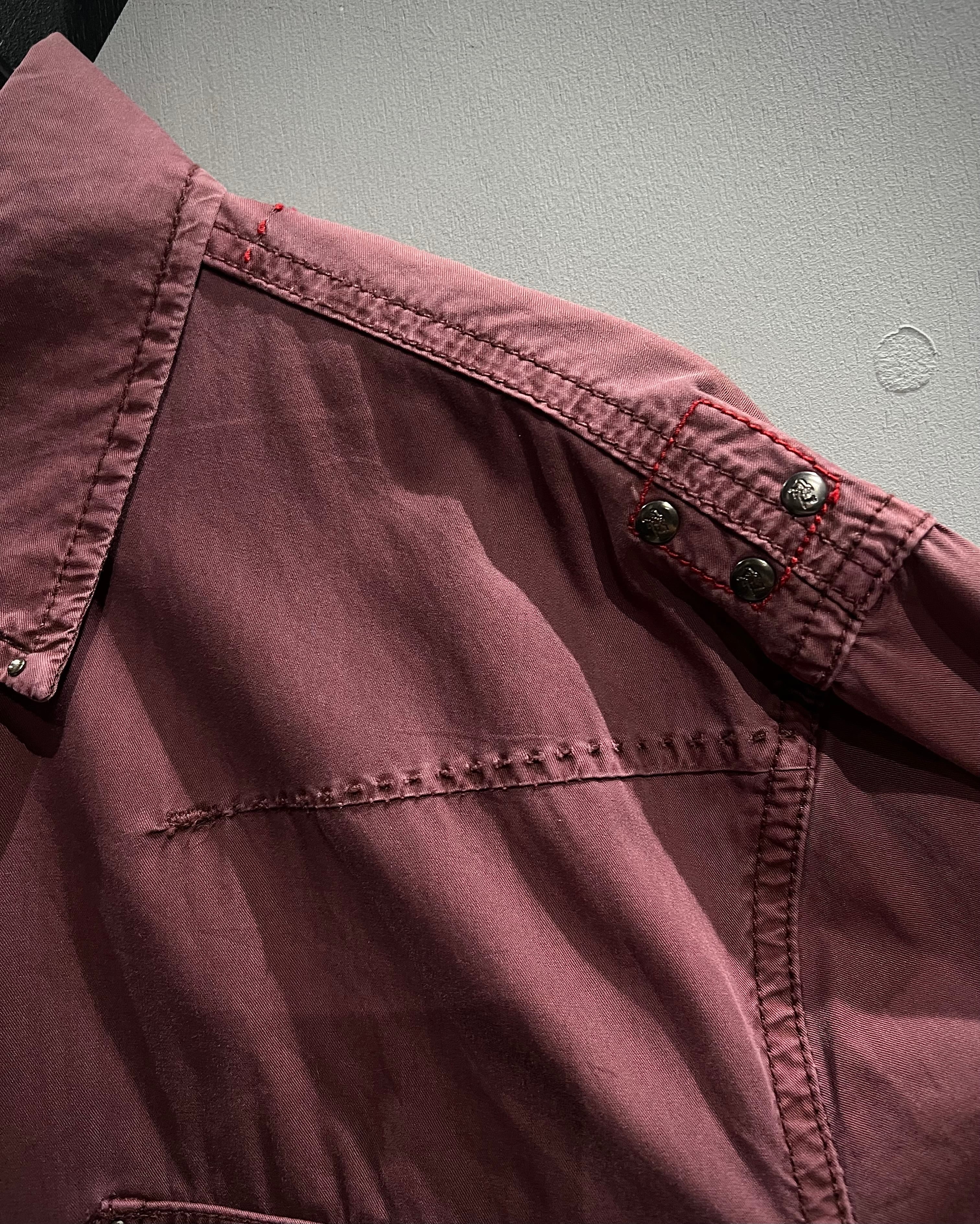 くすみのあるボルドーカラーのボディの右腹部に、同色で緻密な花の刺繍を施した長袖シャツ。