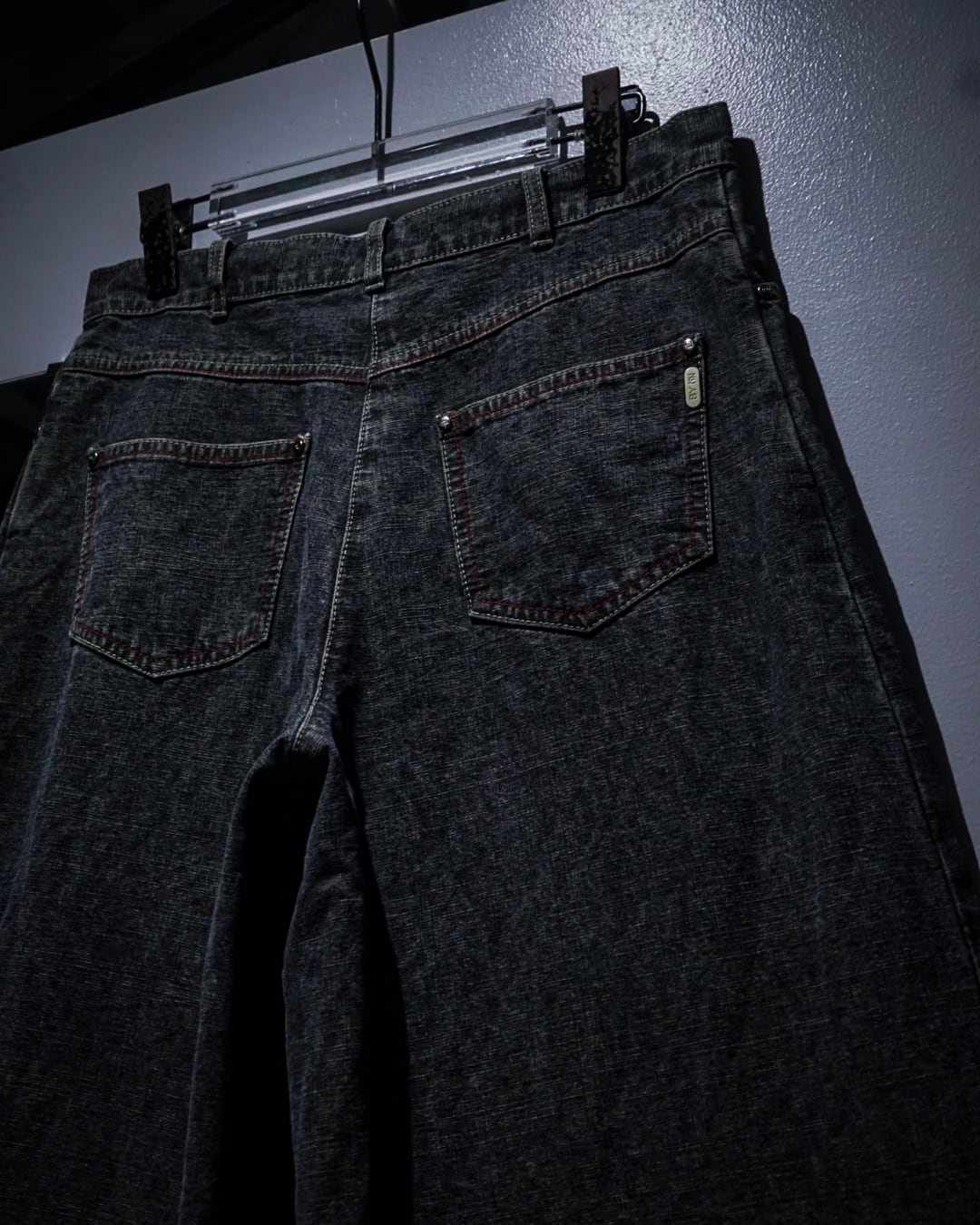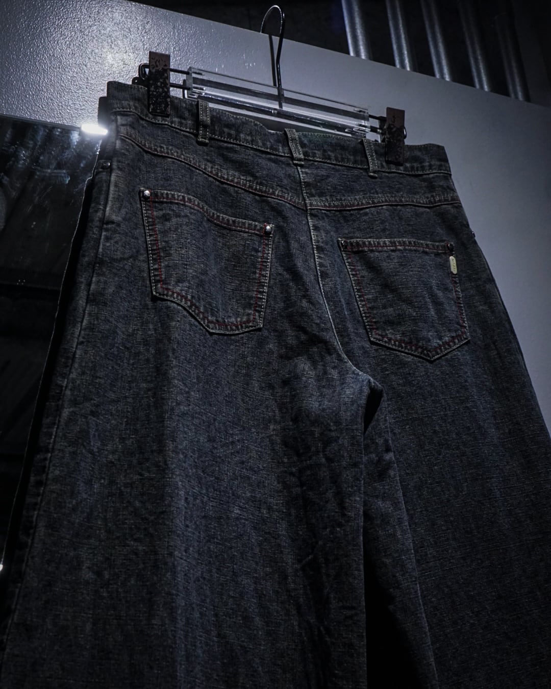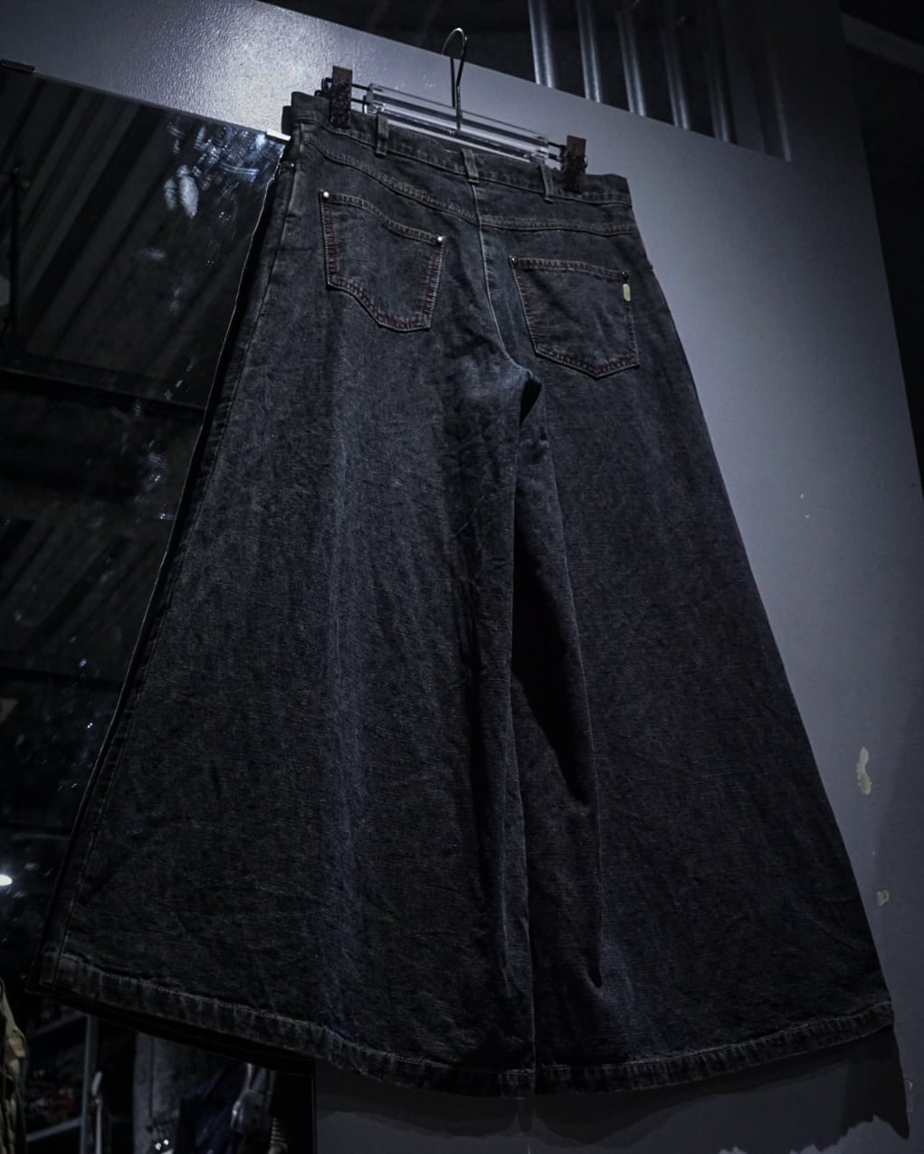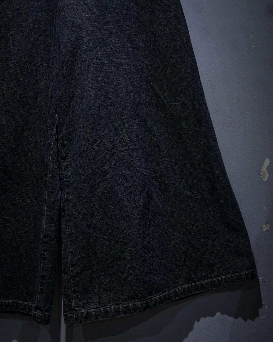 ウエストは細めの設計ながら、裾にかけて大胆に広がるバギーシルエットが最大の特徴。レイヴシーンを連想させるワイドなシルエットは、スタイリングに強いインパクトを与えつつ、トップスを選ばず合わせられる汎用性も兼ね備えています。