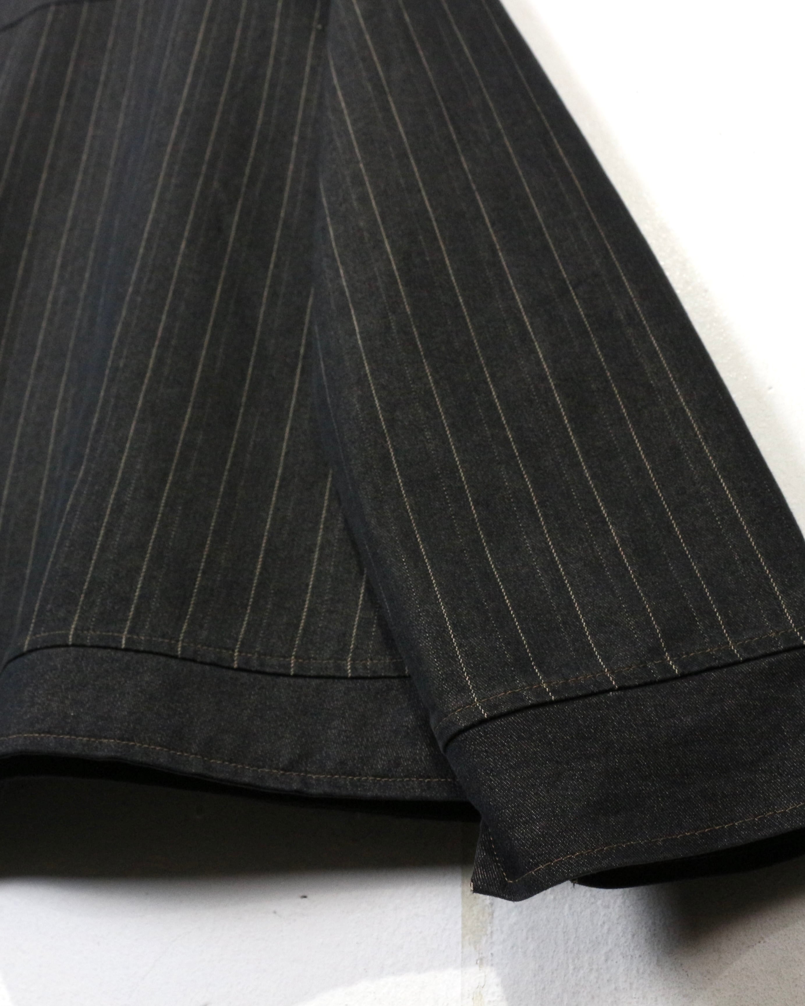程よく肉感のあるデニム生地をベースに、ストライプと無地を切り替えたデザインが特徴。カジュアルなイメージのデニムですが、ストライプを切り替えたことで、上品さも感じられます。