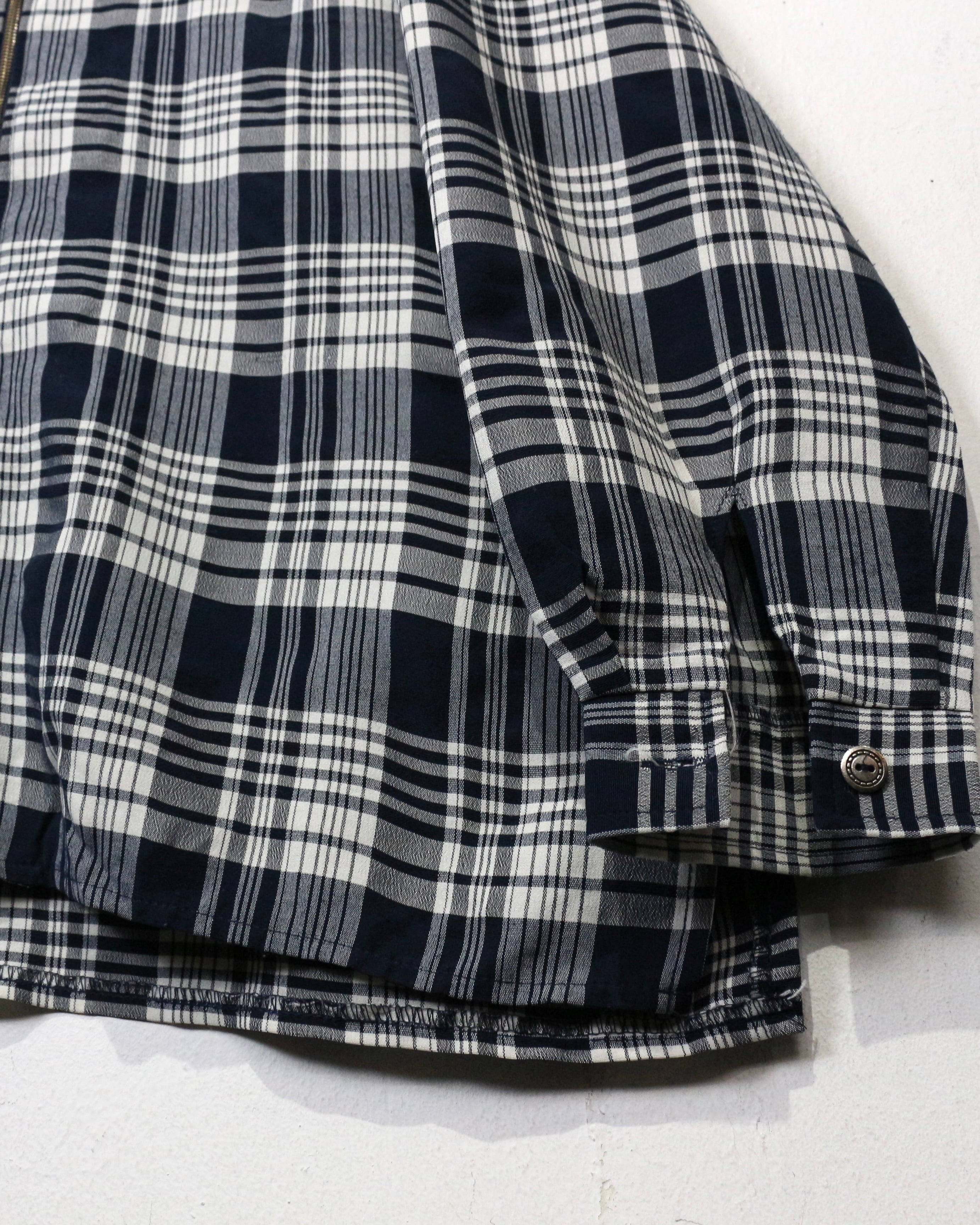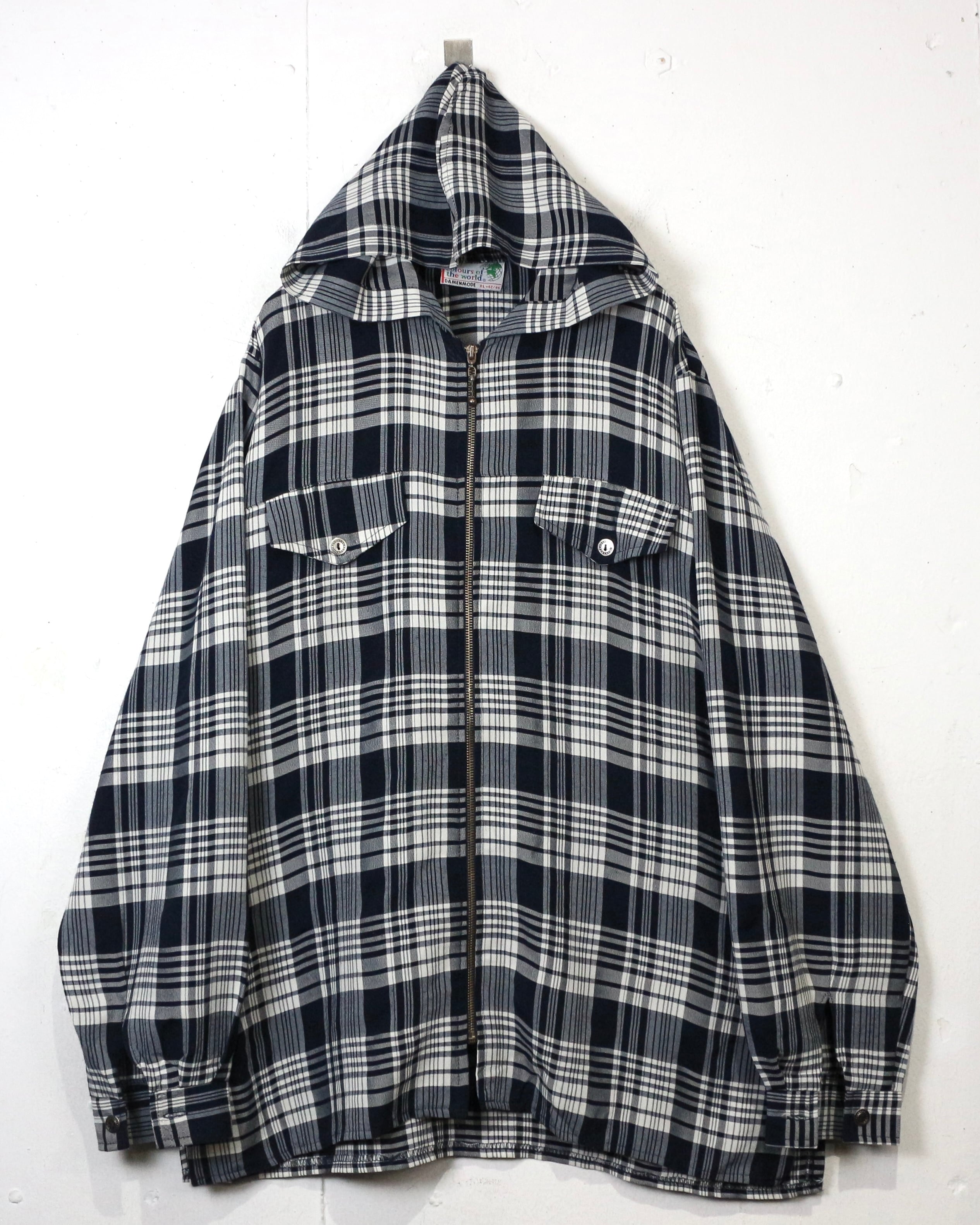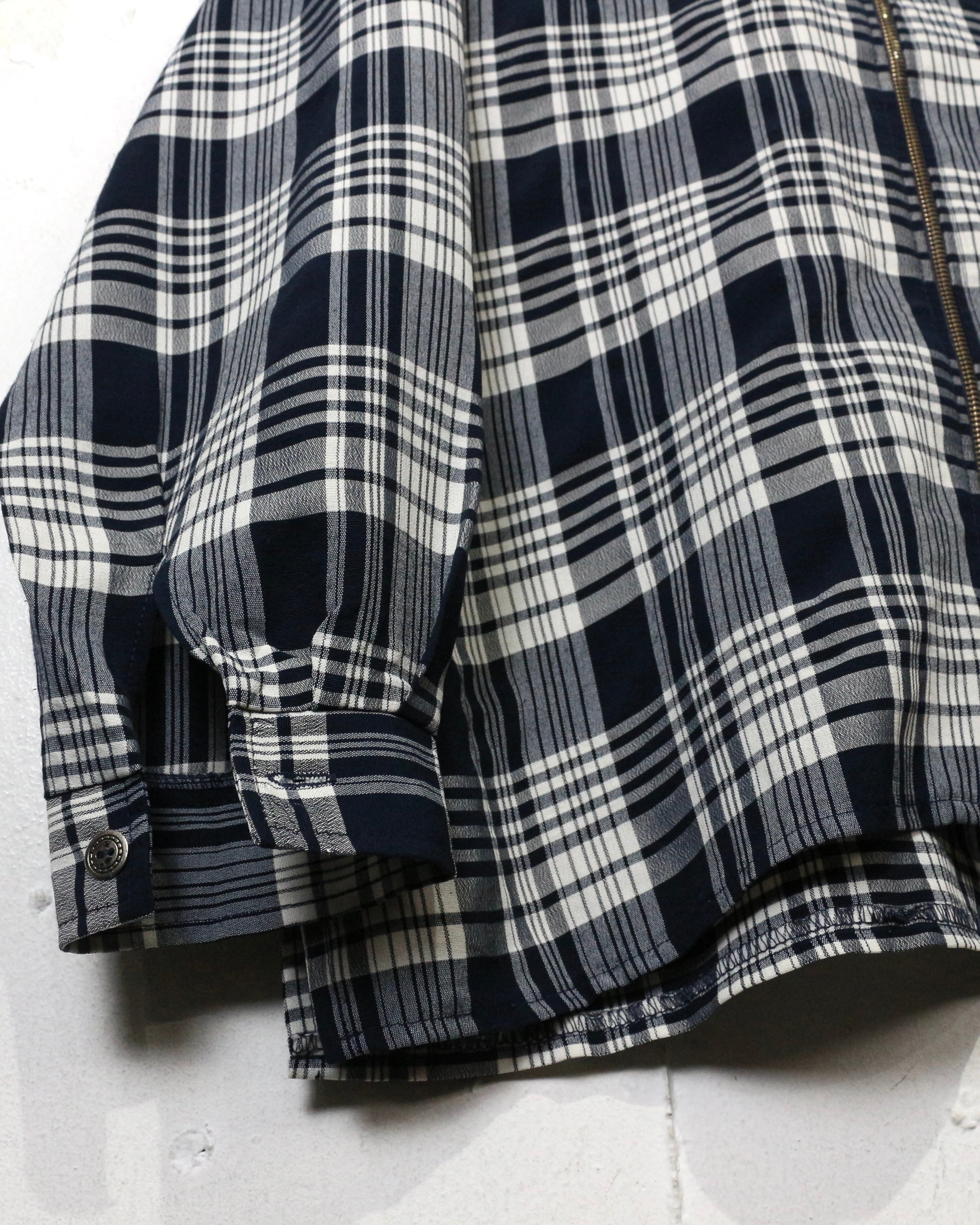 ブラック×ホワイトの落ち着いた配色のチェックパターンをベースにしつつ、フーディ仕様×フロントジップというディテールで現代的に昇華されたデザインが魅力です。