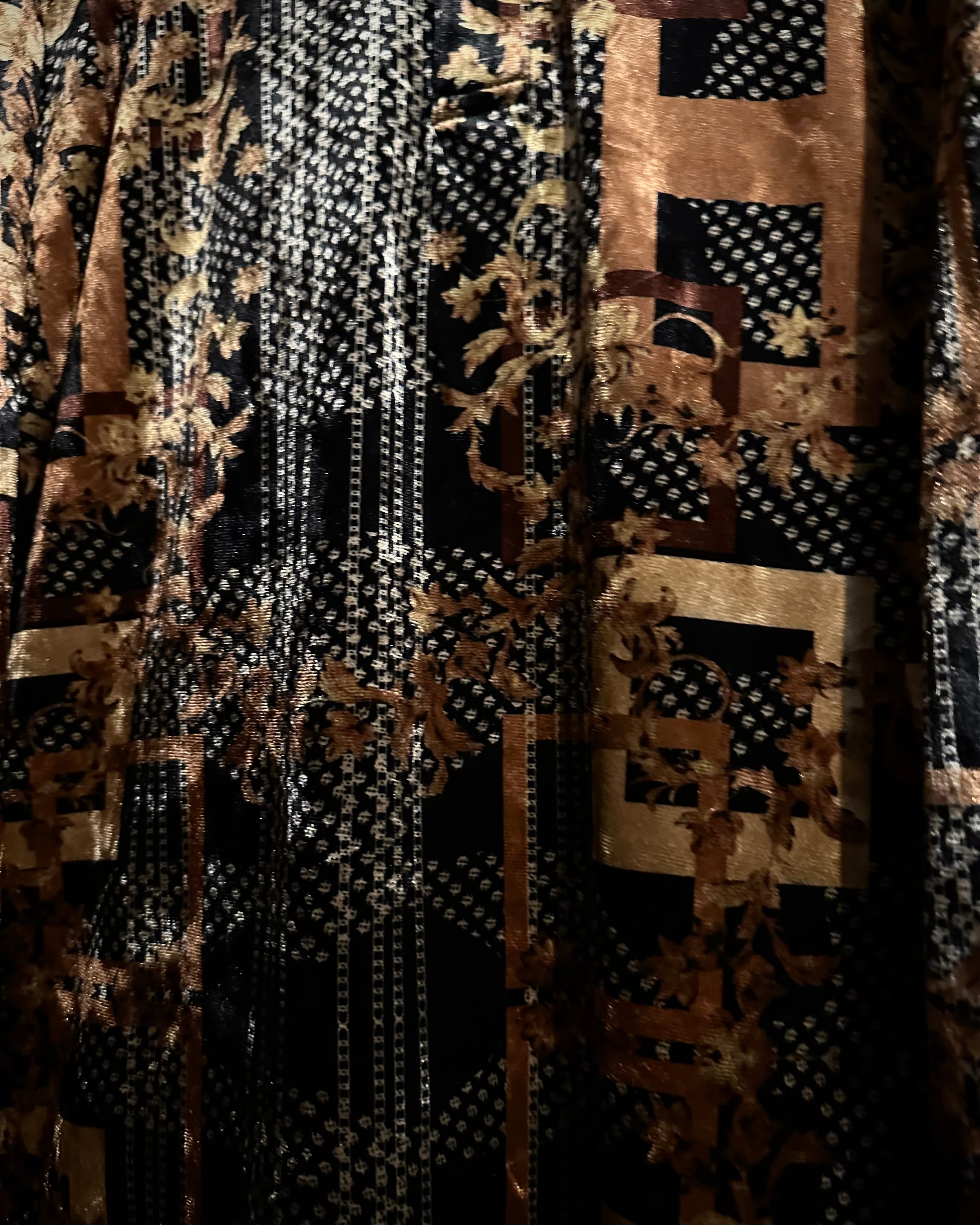 しっとりとした光沢と滑らかなタッチが特徴のベロアファブリックに、幾何学模様とボタニカルを掛け合わせた様な複雑なパターンを全面に配置。ブラックベースにゴールドやブラウンが絡み合うことで、奥行きのあるラグジュアリーな表情を見せる1着。